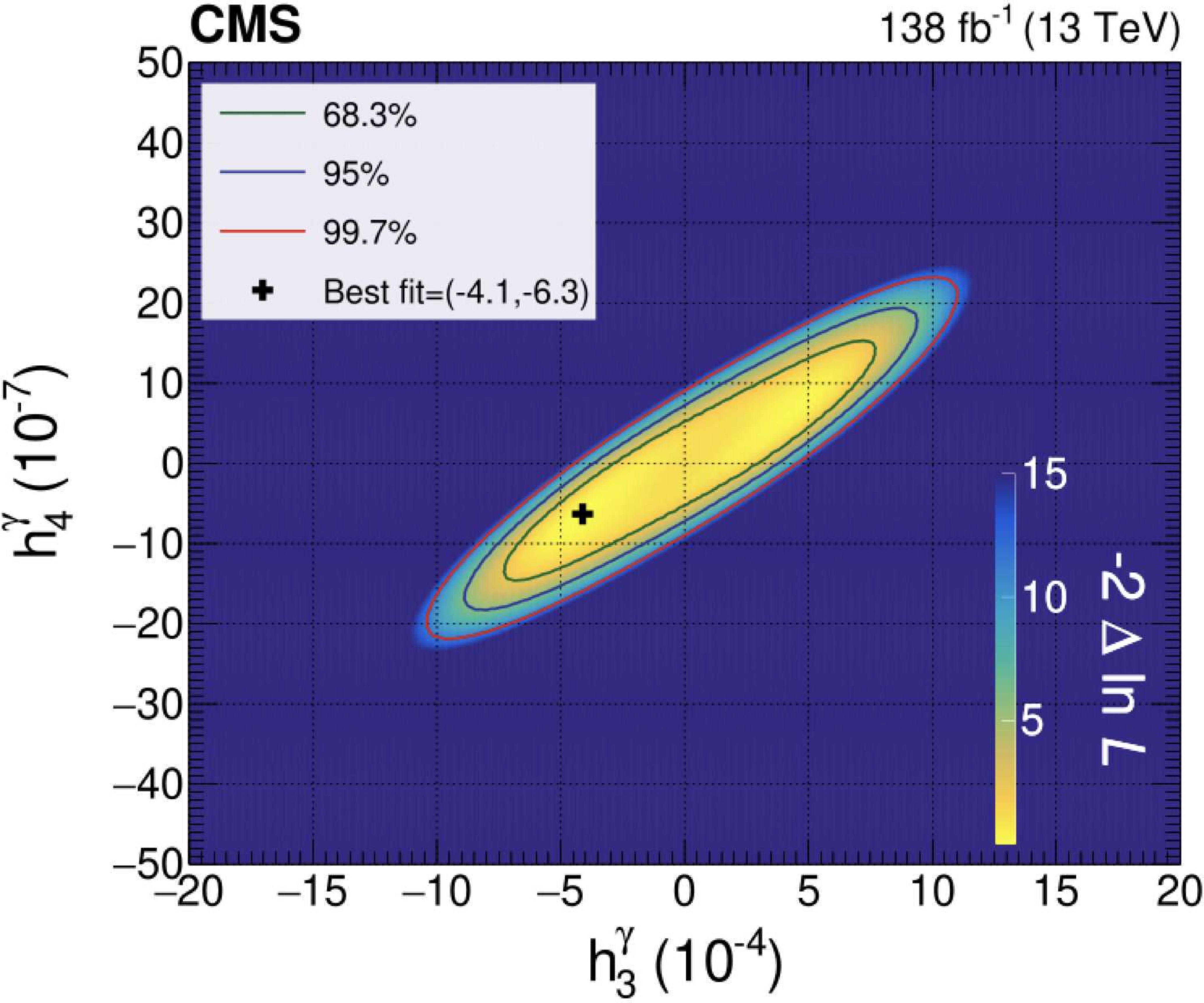 Confidence contours of the aNTGC parameters $ h_3^\gamma, h_4^\gamma $ (left) and $ h_3^\mathrm{Z}, h_4^\mathrm{Z} $ (right) with the best fit points, which are the local minima of the negative log likelihood. |