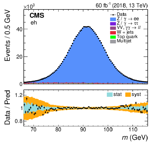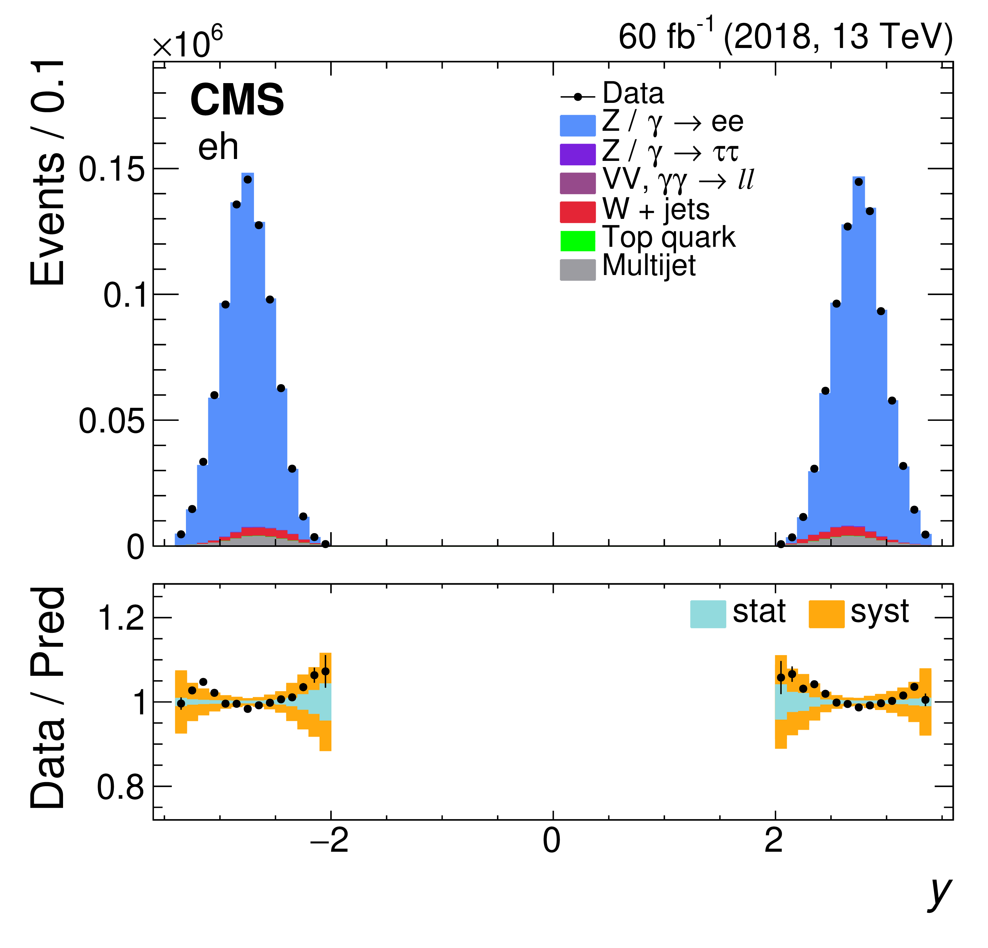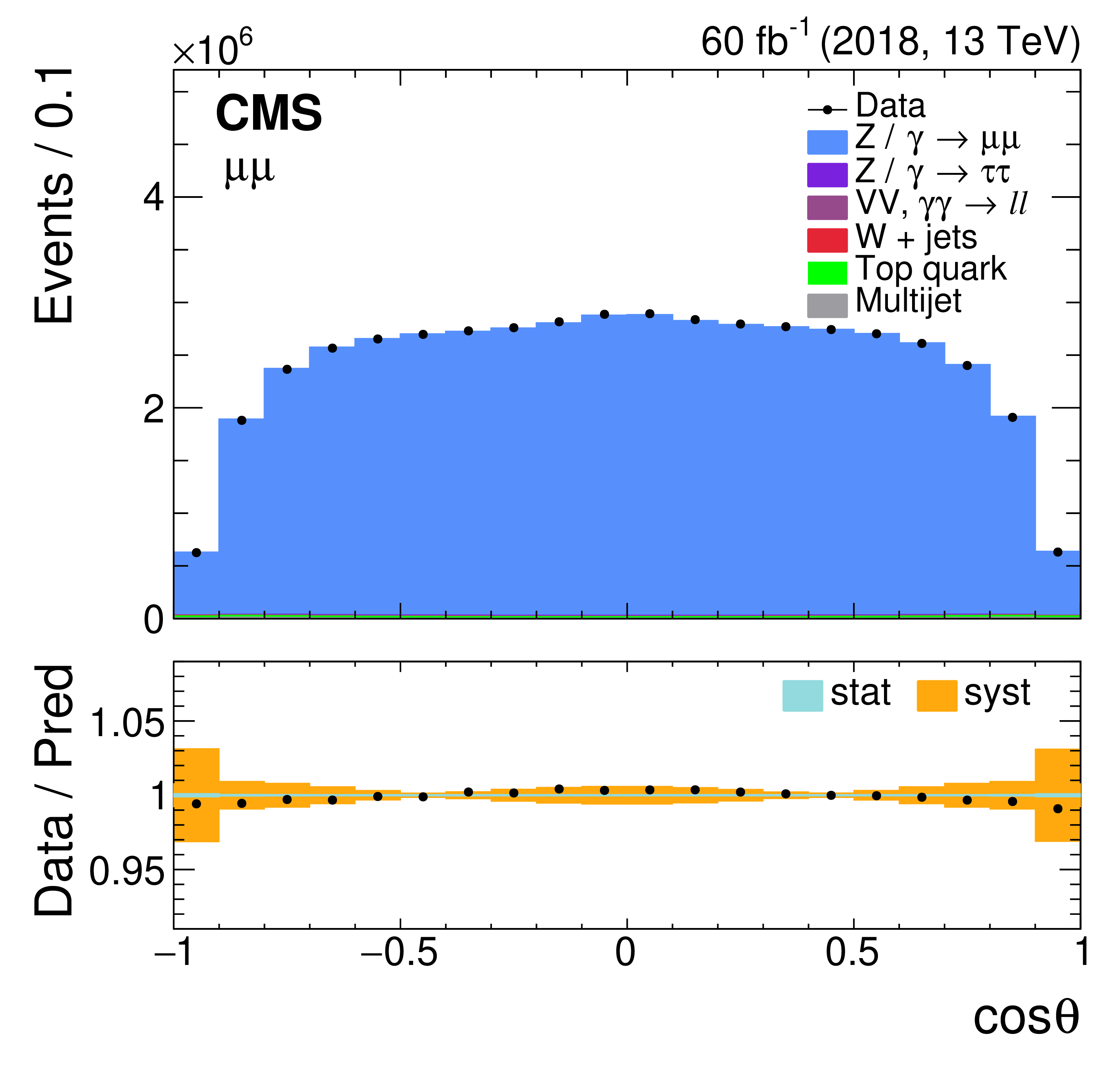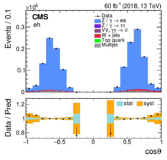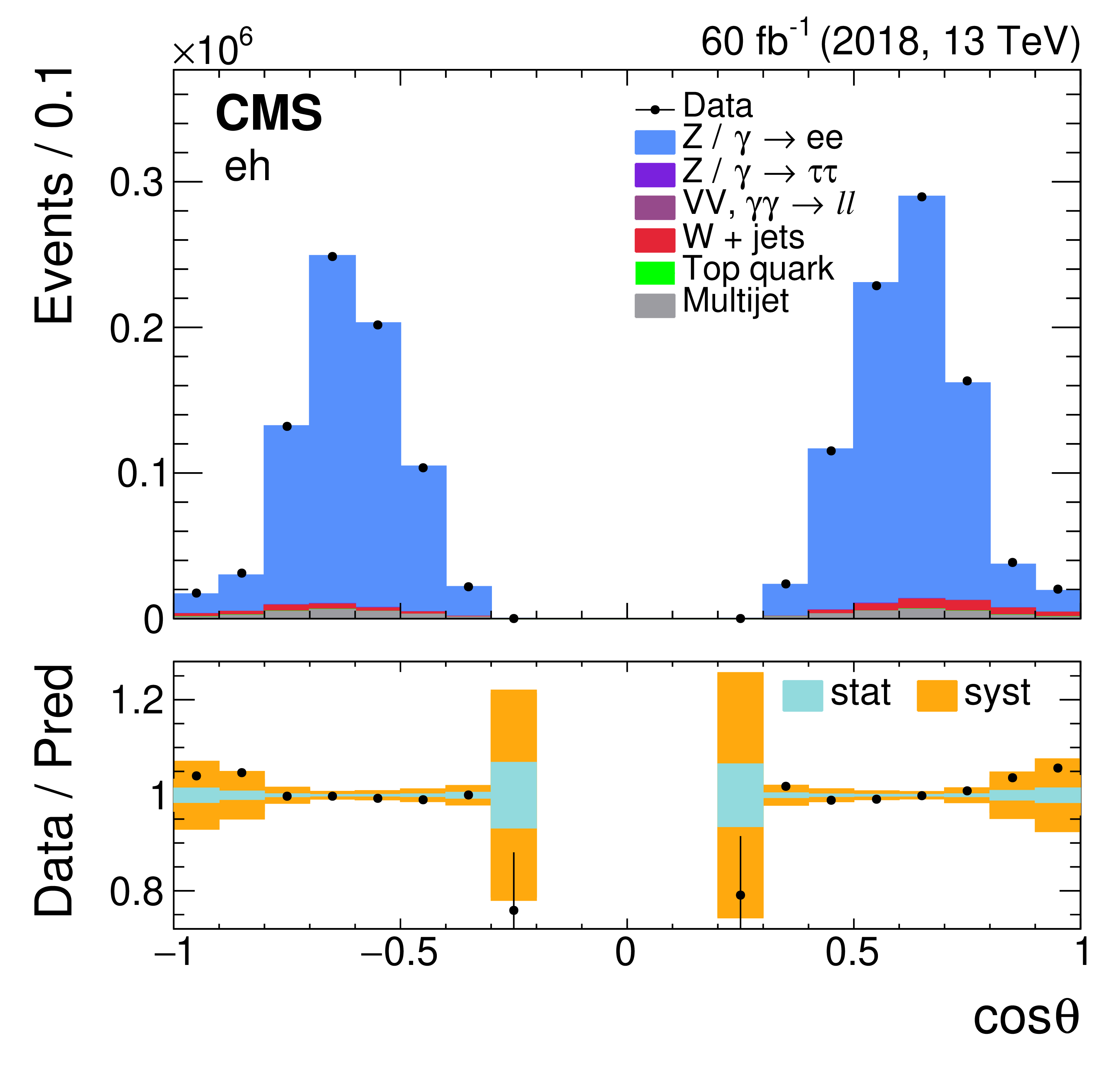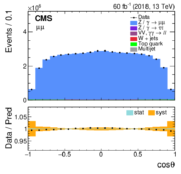 Lepton $ \cos\theta_\mathrm{CS} $ distribution in $ \mu\mathrm{h} $ events in 2018. The multijet and $ \mathrm{W}\!+\!\text{jets} $ backgrounds are scaled to the data as described in the text. The error bars include statistical and background systematic uncertainties (described in Section 5). |