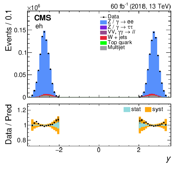 Dilepton mass (left), rapidity (middle), and $ \cos\theta_\mathrm{CS} $ (right) distributions, for the $ \mu\mu $ (upper) and $ \mathrm{e}\mathrm{h} $ (lower) channels in the 2018 sample, after applying all the corrections. The signal is scaled to match the total number of events in the data. |