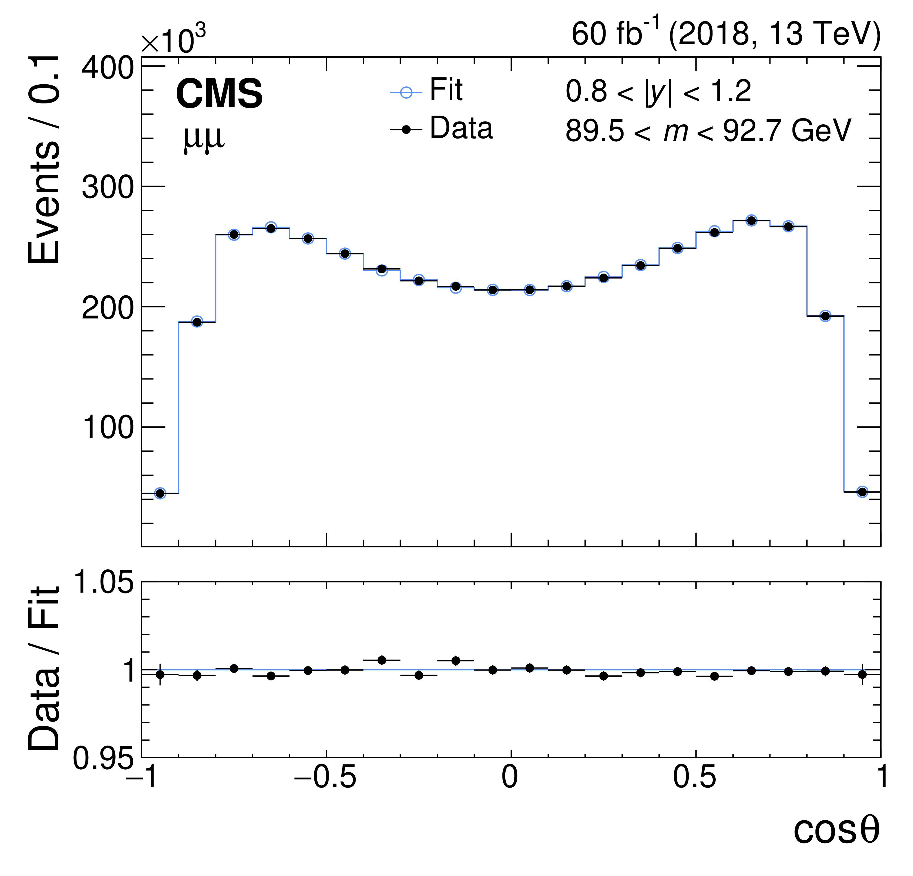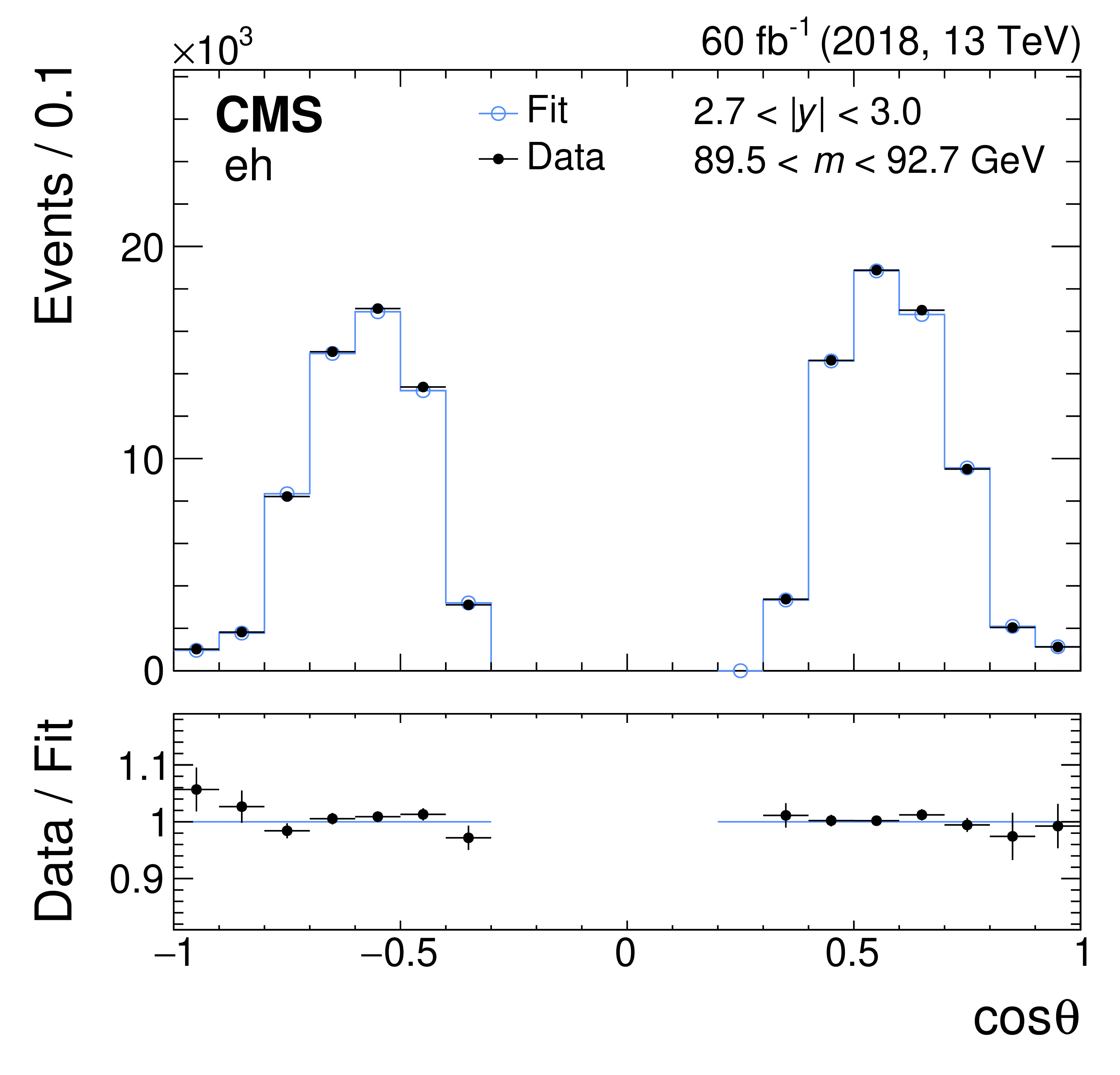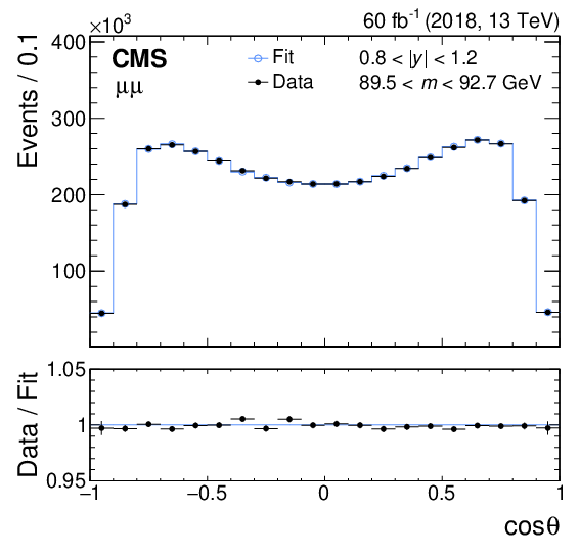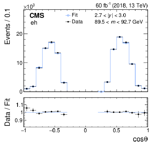 Measured and best fit $ \mu\mu $ (left) and $ \mathrm{e}\mathrm{h} $ (right) $ \cos\theta_\mathrm{CS} $ distributions for 2018, for the Z boson peak and two rapidity bins. The error bars represent the statistical uncertainties. |