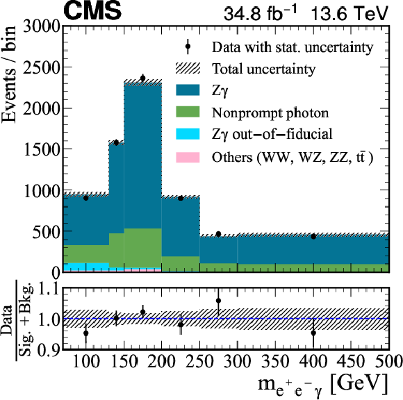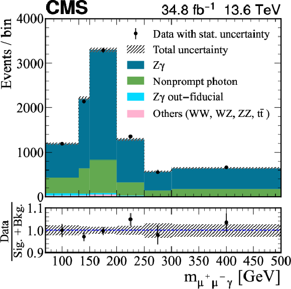 | In summary, a measurement of Z$ \gamma $ production using leptonic final states in proton-proton collisions at a center-of-mass energy of 13.6 TeV has been presented. The data set used corresponds to an integrated luminosity of 34.8 fb$ ^{-1} $, collected by the CMS experiment at the LHC during 2022. Events with a pair of oppositely charged muons or electrons together with an isolated photon are selected. The measured fiducial cross section for the combined electron and muon channels is 1.896 $ \pm $ 0.033 (stat) $ \pm $ 0.054 (syst) $ \pm $ 0.006 (theo) pb, in agreement with the standard model prediction of 1.922 $ \pm $ 0.094 pb. The $ m_{\ell\ell\gamma} $ distribution is used to set 95% confidence level limits on neutral triple gauge couplings. These limits are derived, for the first time, in the context of a recently proposed framework of the effective field theory based on dimension-8 operators, which maintains $ \mathrm{SU}(2)_\mathrm{L}\otimes\mathrm{U}(1)_{\mathrm{Y}} $ gauge symmetry [16]. |