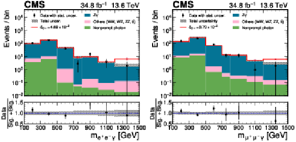 Post-fit distributions of $ m_{\ell\ell\gamma} $ in the electron (left) and muon channel (right). The experimental data are shown as points with associated statistical uncertainties, while the hatched bands represent the total uncertainties. Uneven bin sizes GeV are used to ensure sufficient statistical precision in each bin. The last bins include overflow events. |