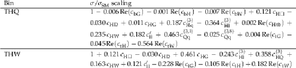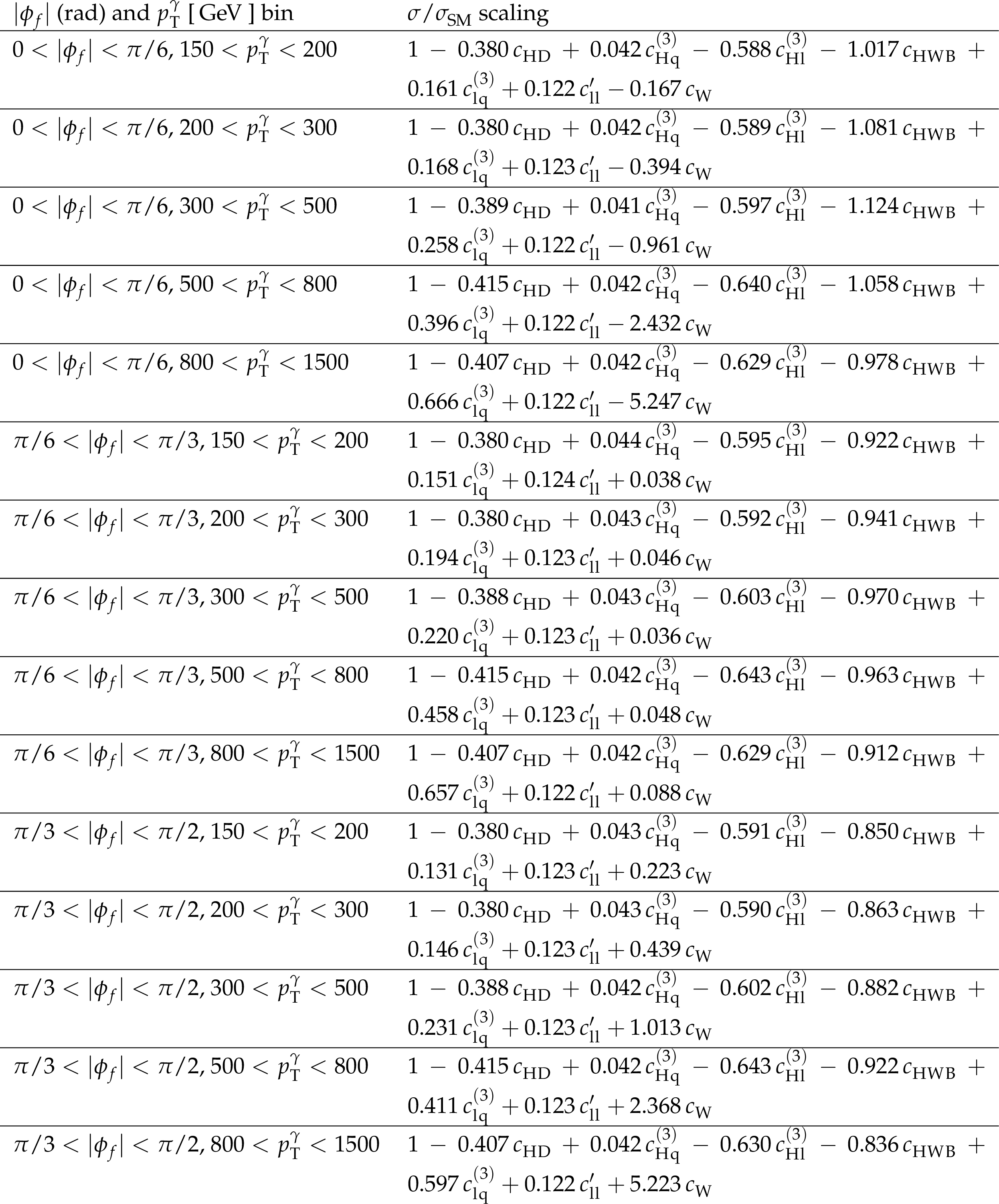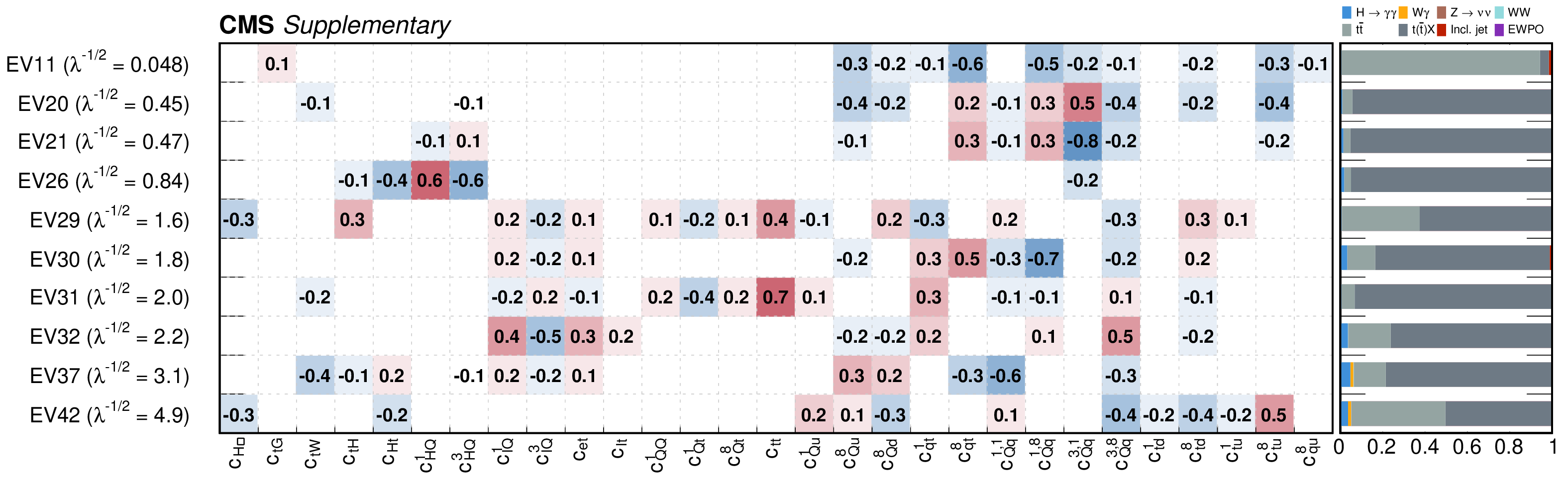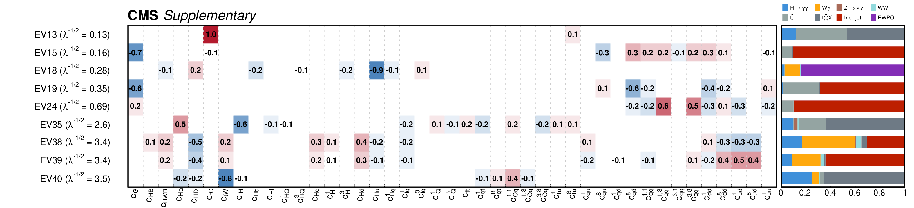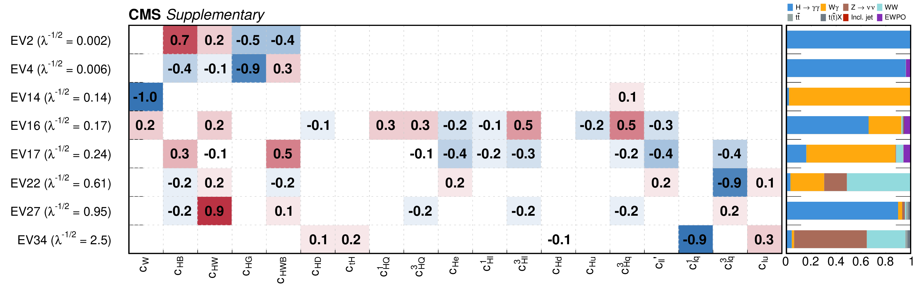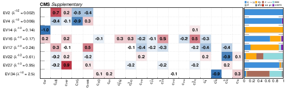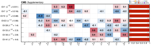 Eigenvectors constrained mostly by the $ \mathrm{H}\to\gamma\gamma $, $ \mathrm{W}\gamma $, WW, and $ \mathrm{Z}\to\nu\nu $ measurements. Part of the rotation matrix obtained by performing the PCA on the Hessian matrix of the full set of measurements, including the $ \mathrm{t}(\overline{\mathrm{t}})\mathrm{X} $ analysis. |