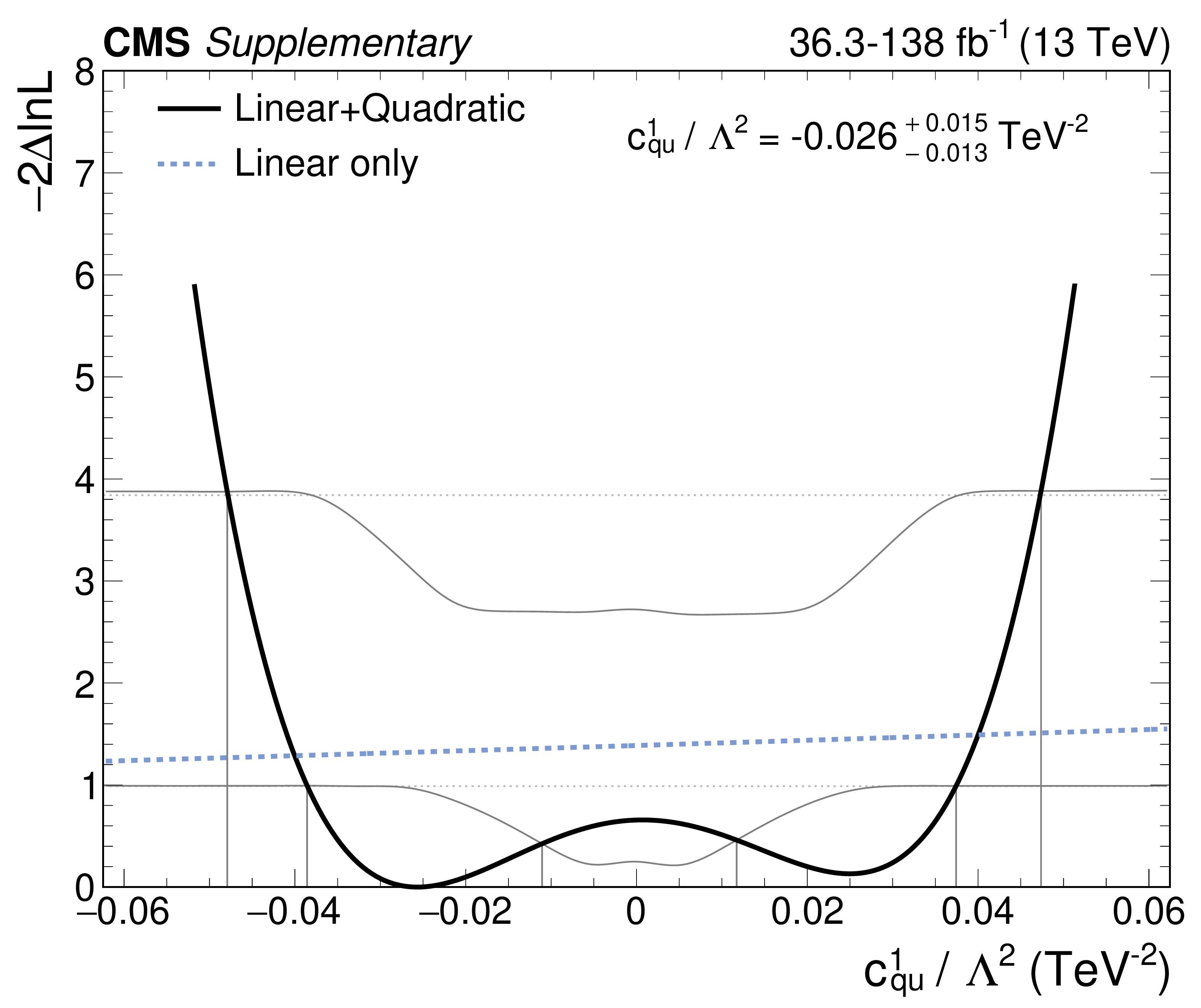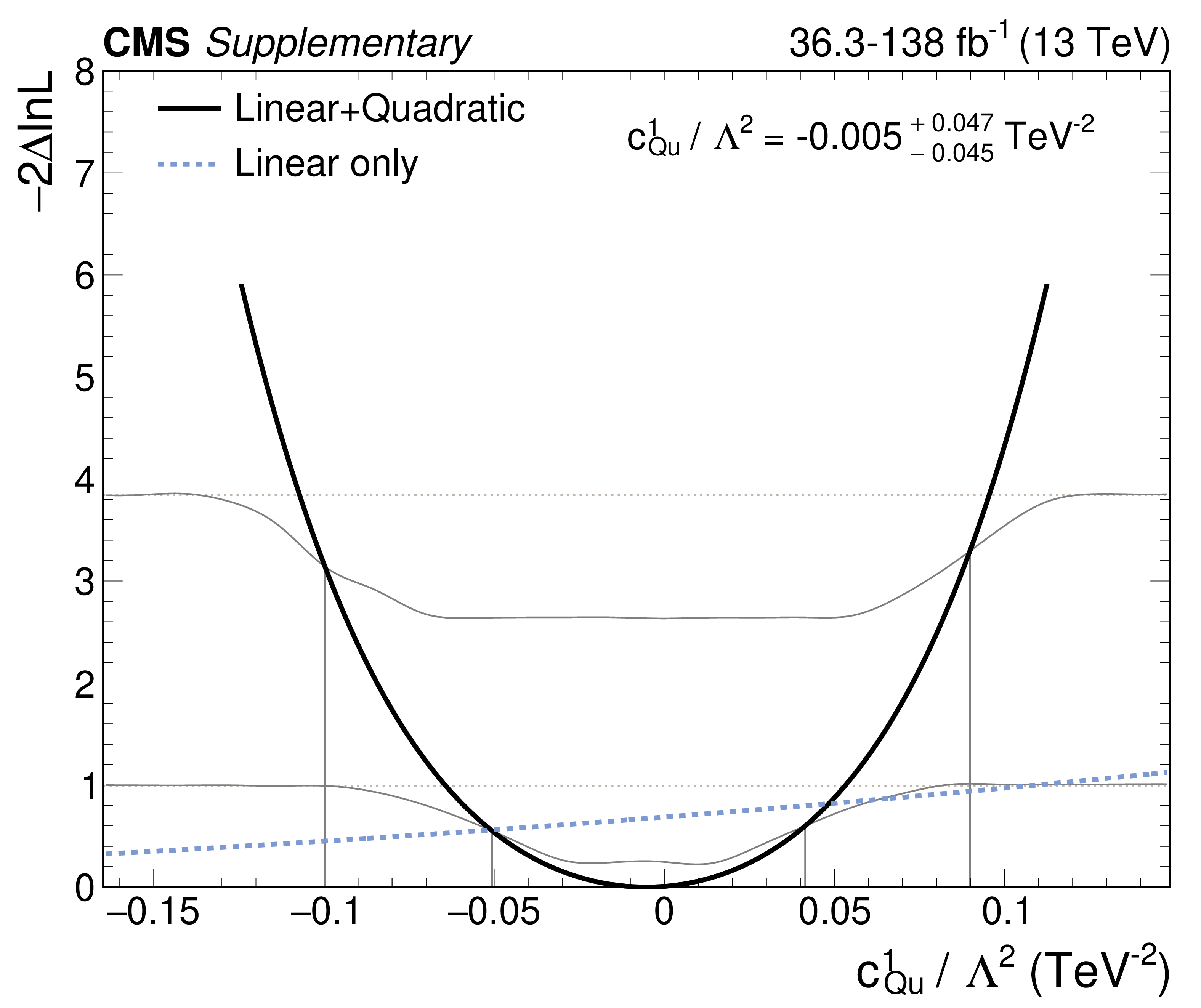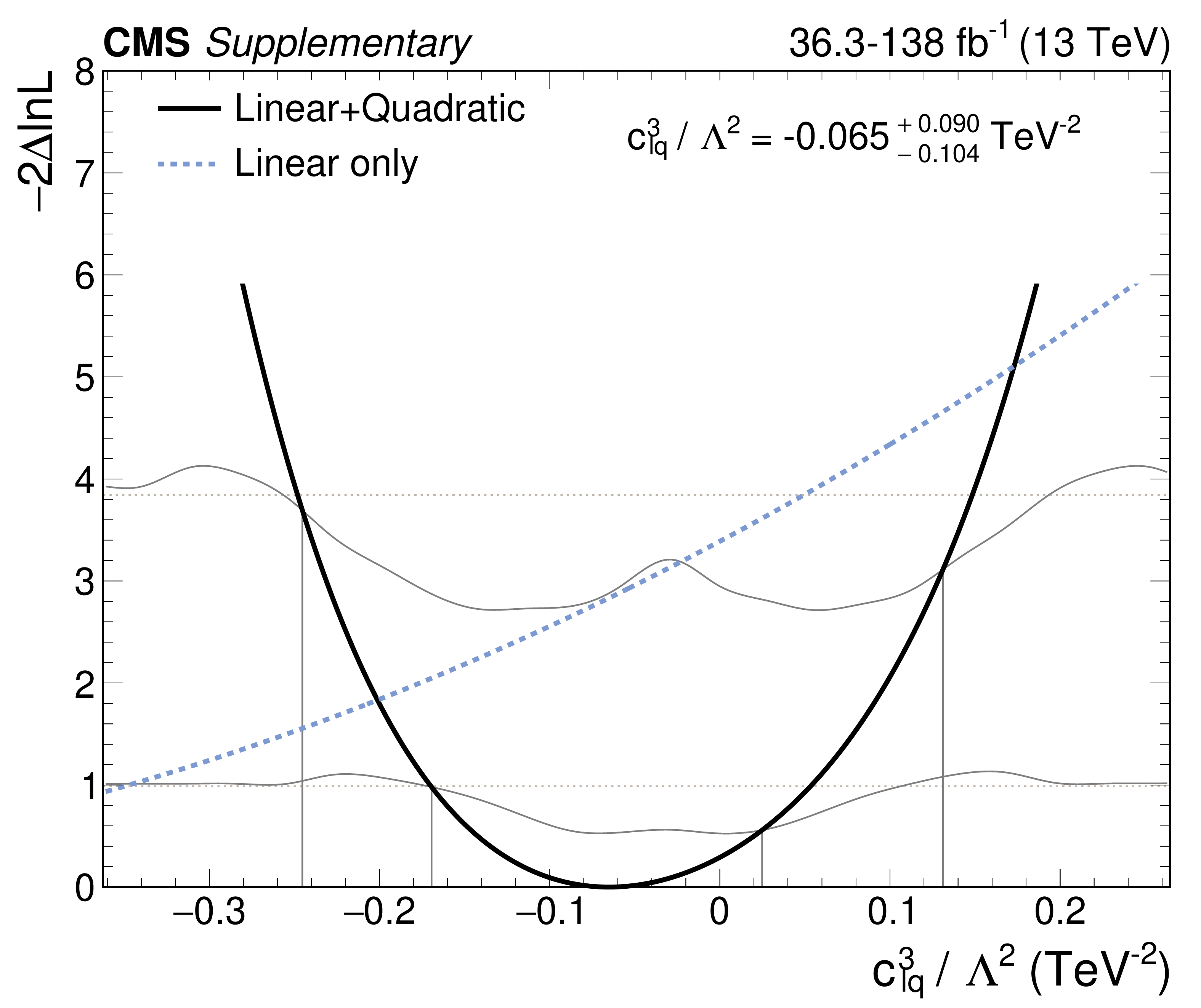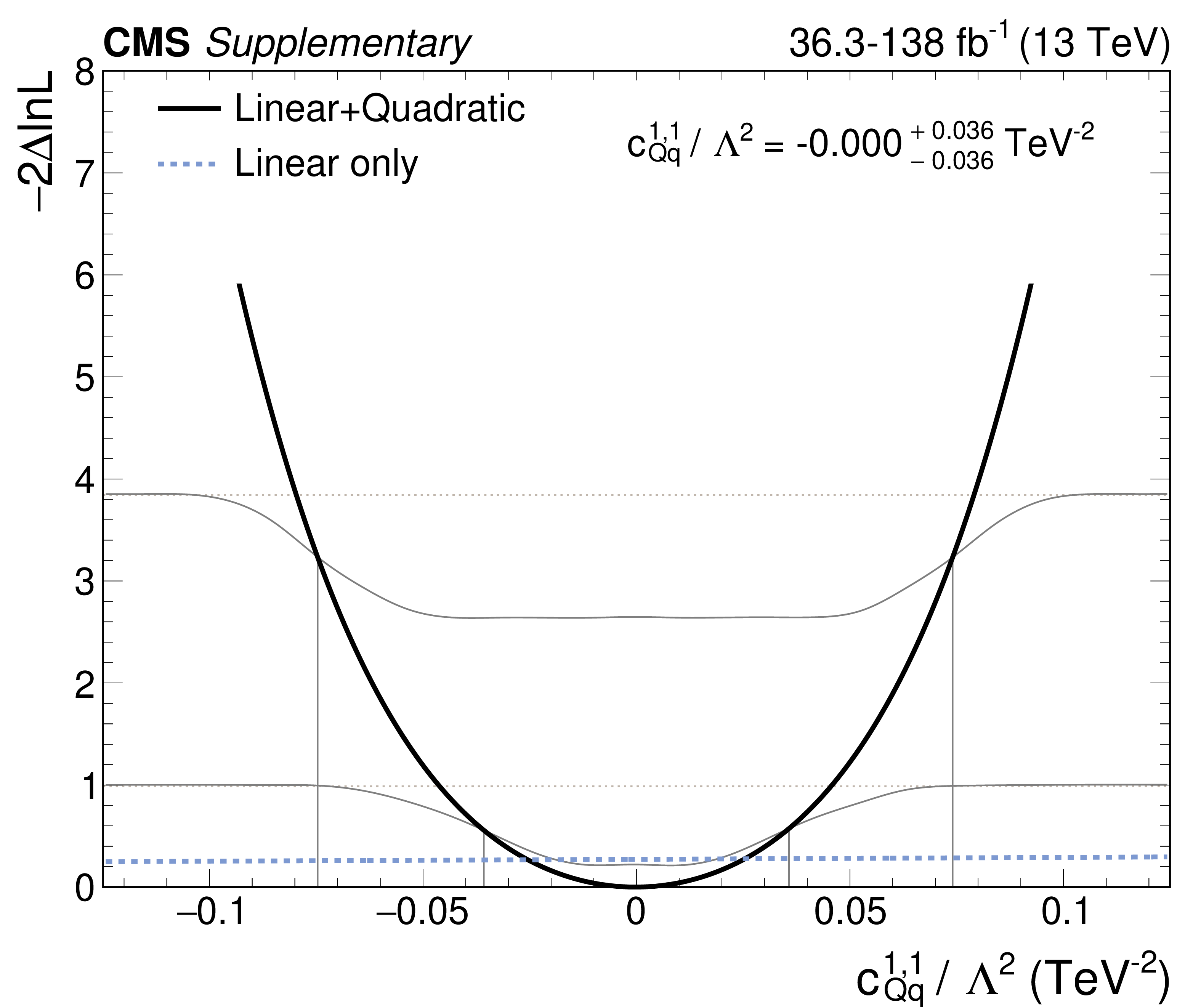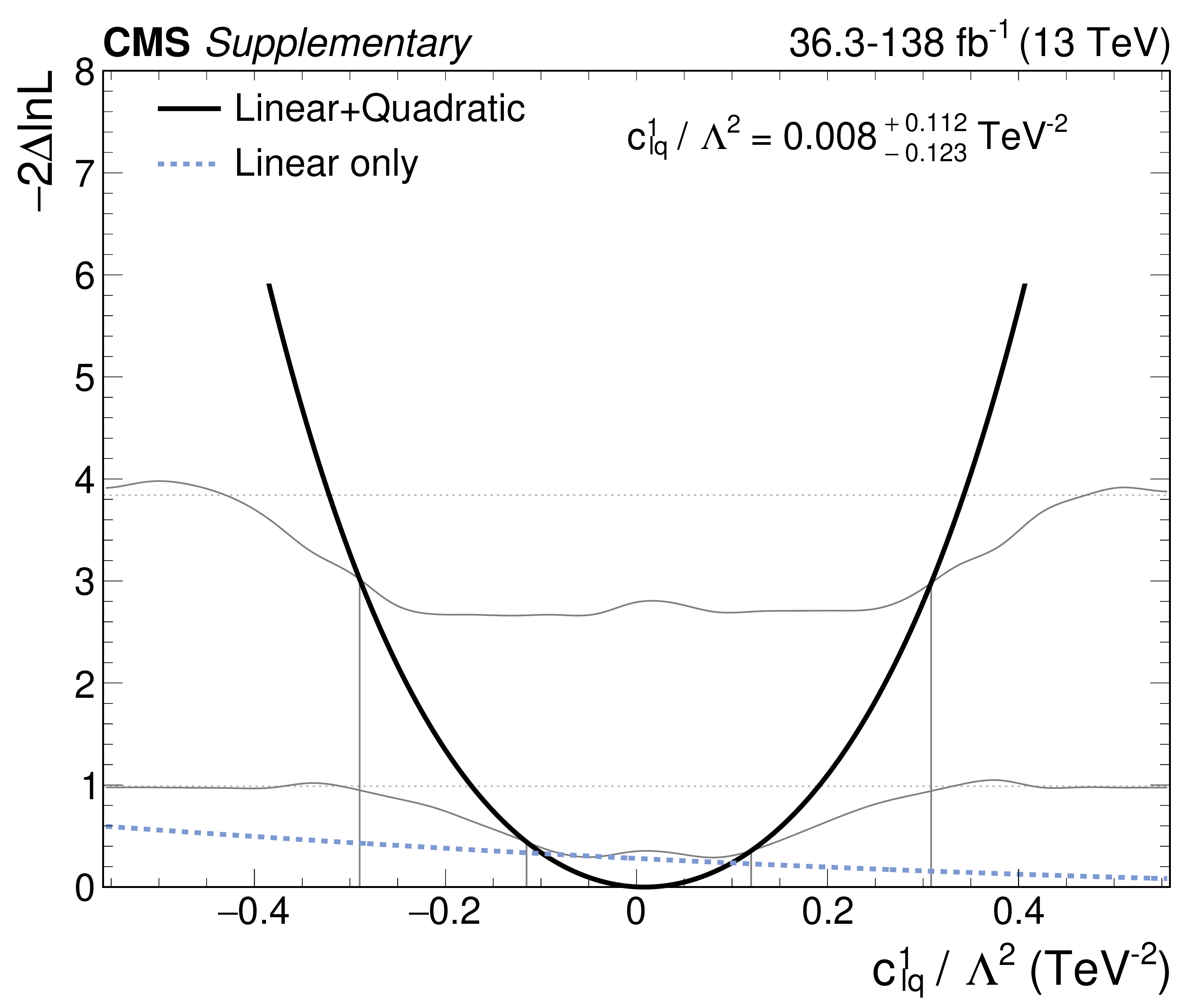 Observed likelihood scans for $ c^{(3)}_{\mathrm{HQ}} $, where linear terms dominate (upper left); $ c_{\mathrm{l}\mathrm{u}} $, where quadratic terms dominate (upper right); and $ c_{\mathrm{W}} $, where quadratic and linear terms both contribute (lower). The results with quadratic terms included in the parameterization (solid black line) and with linear terms only (dashed blue line) are shown. The solid grey lines indicate the sets of points $ q^{68\%} $ (lower line) and $ q^{95\%} $ (upper line), whereas the dashed grey lines denote the test statistic values used to determine the 68% and 95% confidence intervals in the asymptotic approximation. The confidence intervals shown on the figures are the 68% confidence intervals extracted from the intersection of the linear-plus-quadratic curve with the $ q^{68\%} $ line. |