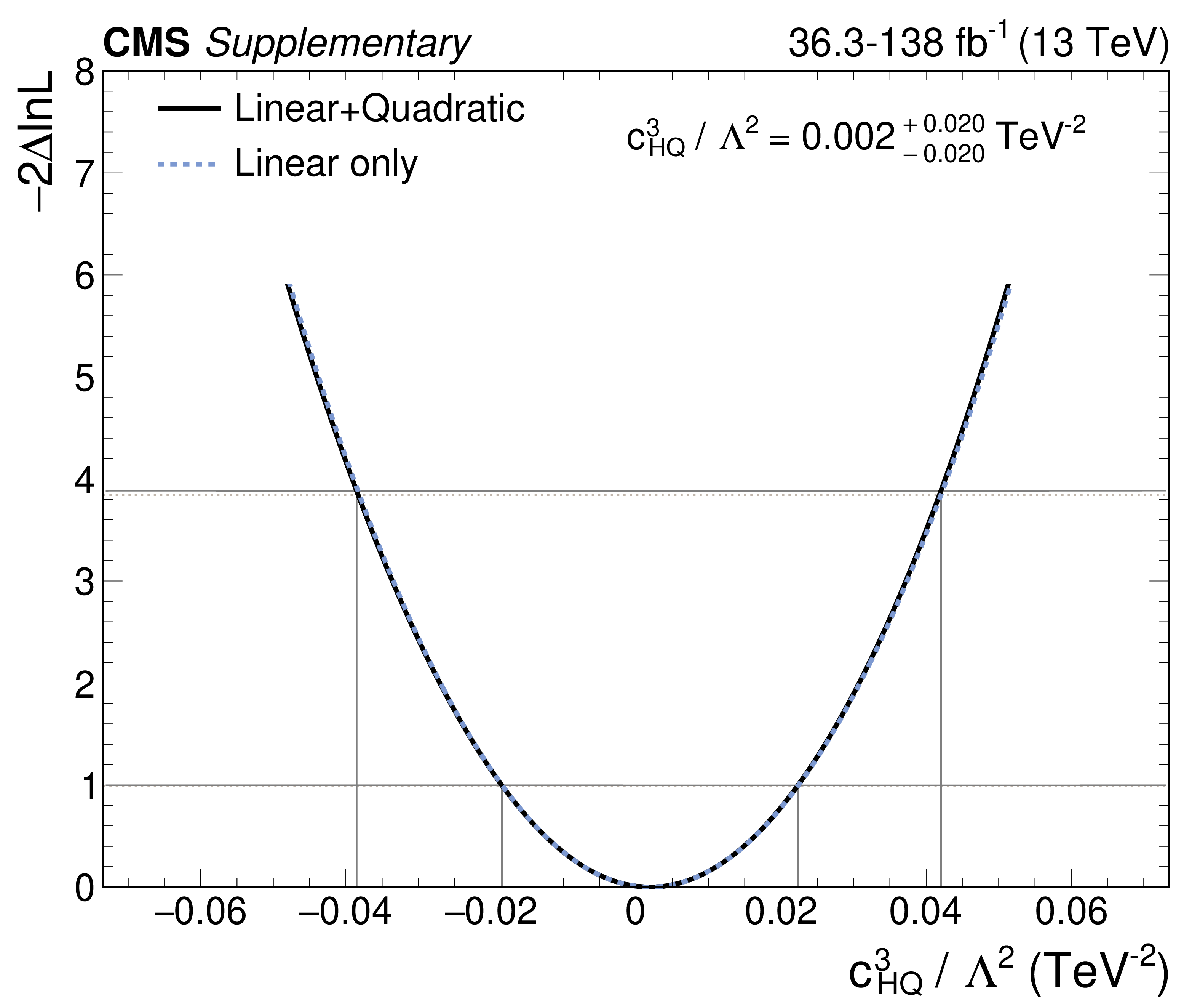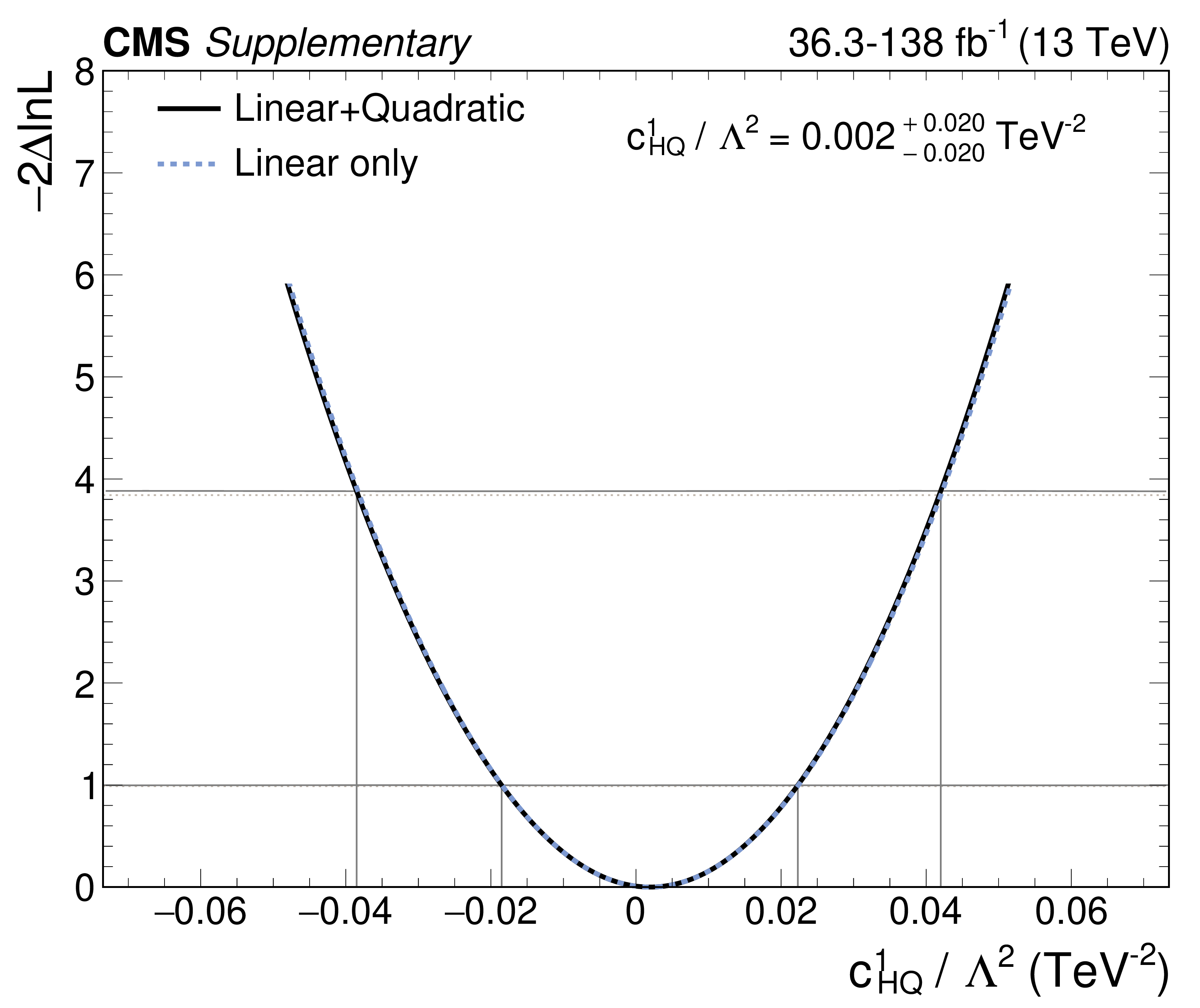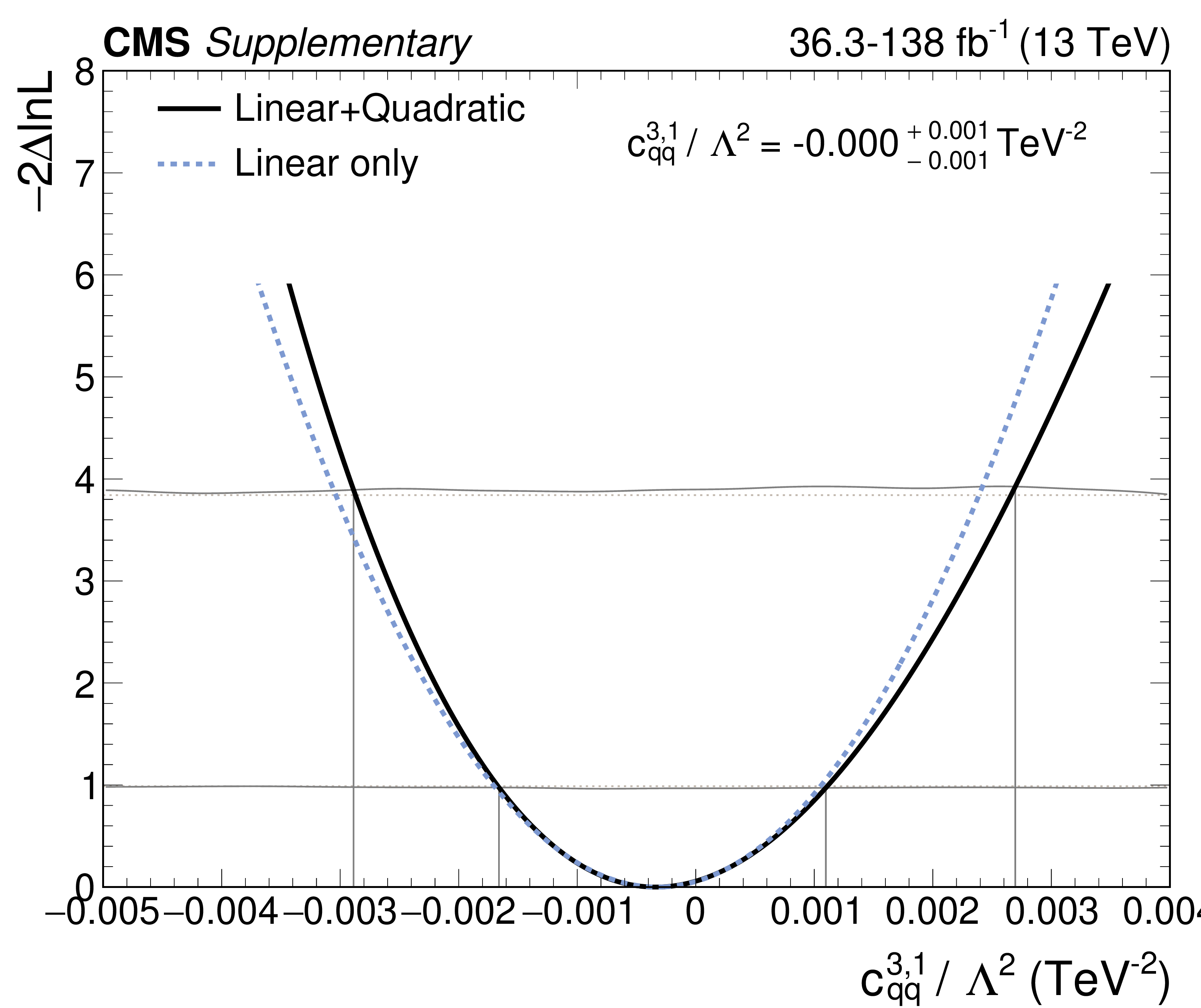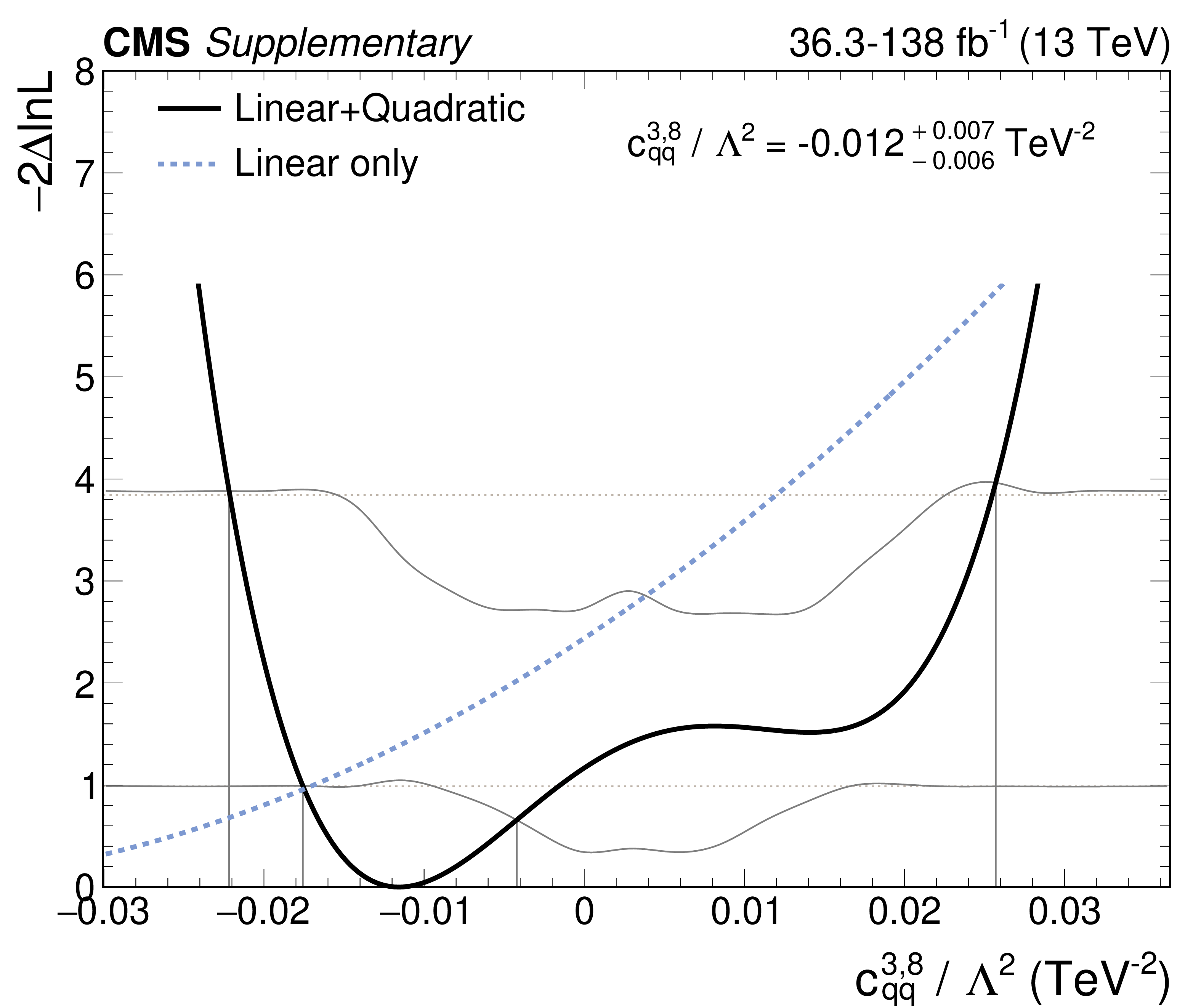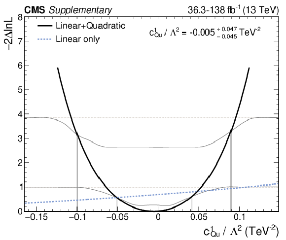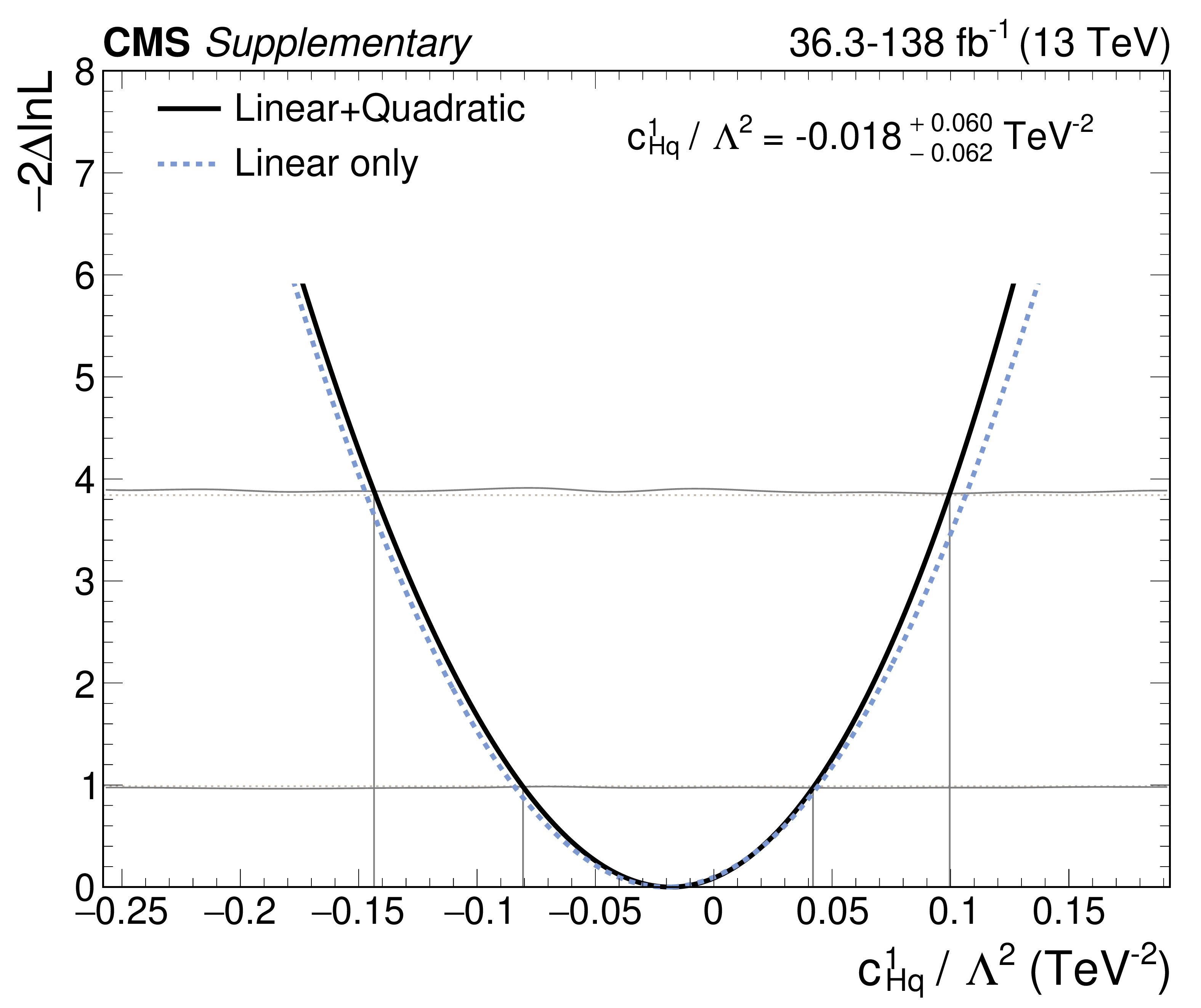 Observed likelihood scans for $ c^{(3)}_{\mathrm{HQ}} $, where linear terms dominate (upper left); $ c_{\mathrm{l}\mathrm{u}} $, where quadratic terms dominate (upper right); and $ c_{\mathrm{W}} $, where quadratic and linear terms both contribute (lower). The results with quadratic terms included in the parameterization (solid black line) and with linear terms only (dashed blue line) are shown. The solid grey lines indicate the sets of points $ q^{68\%} $ (lower line) and $ q^{95\%} $ (upper line), whereas the dashed grey lines denote the test statistic values used to determine the 68% and 95% confidence intervals in the asymptotic approximation. The confidence intervals shown on the figures are the 68% confidence intervals extracted from the intersection of the linear-plus-quadratic curve with the $ q^{68\%} $ line. |