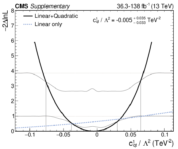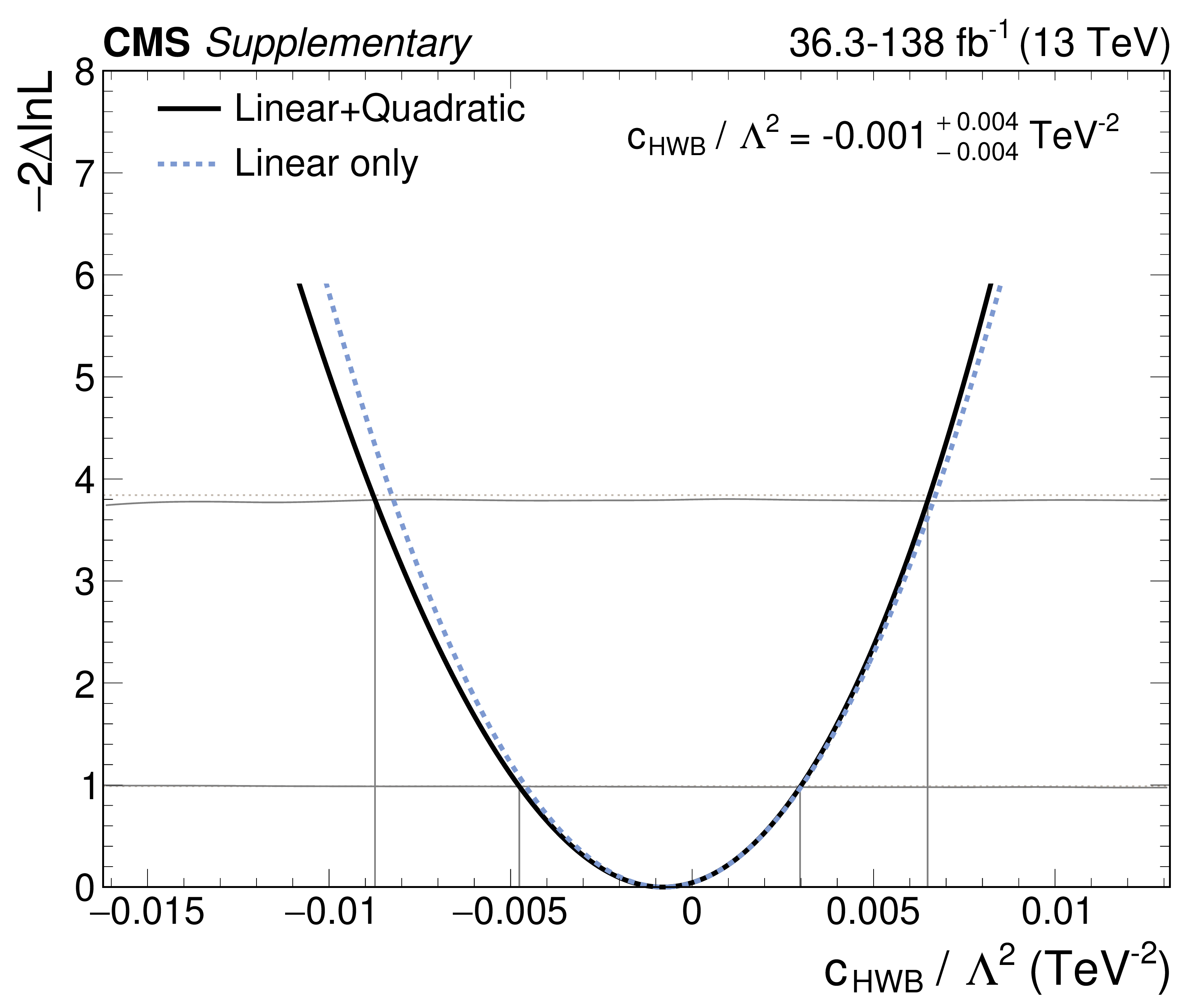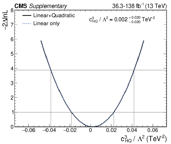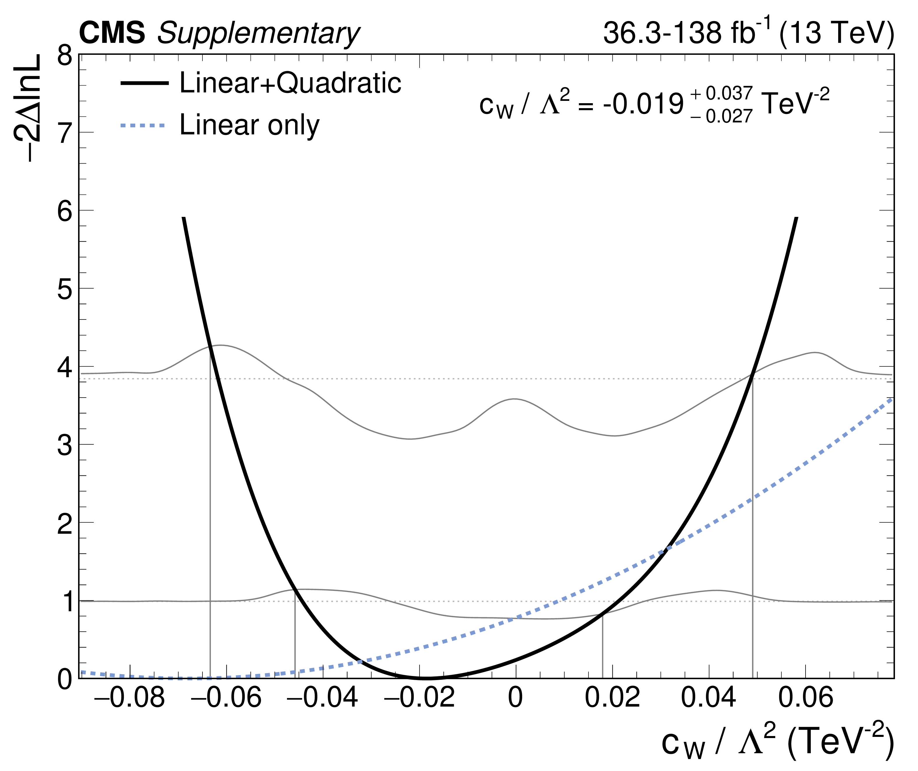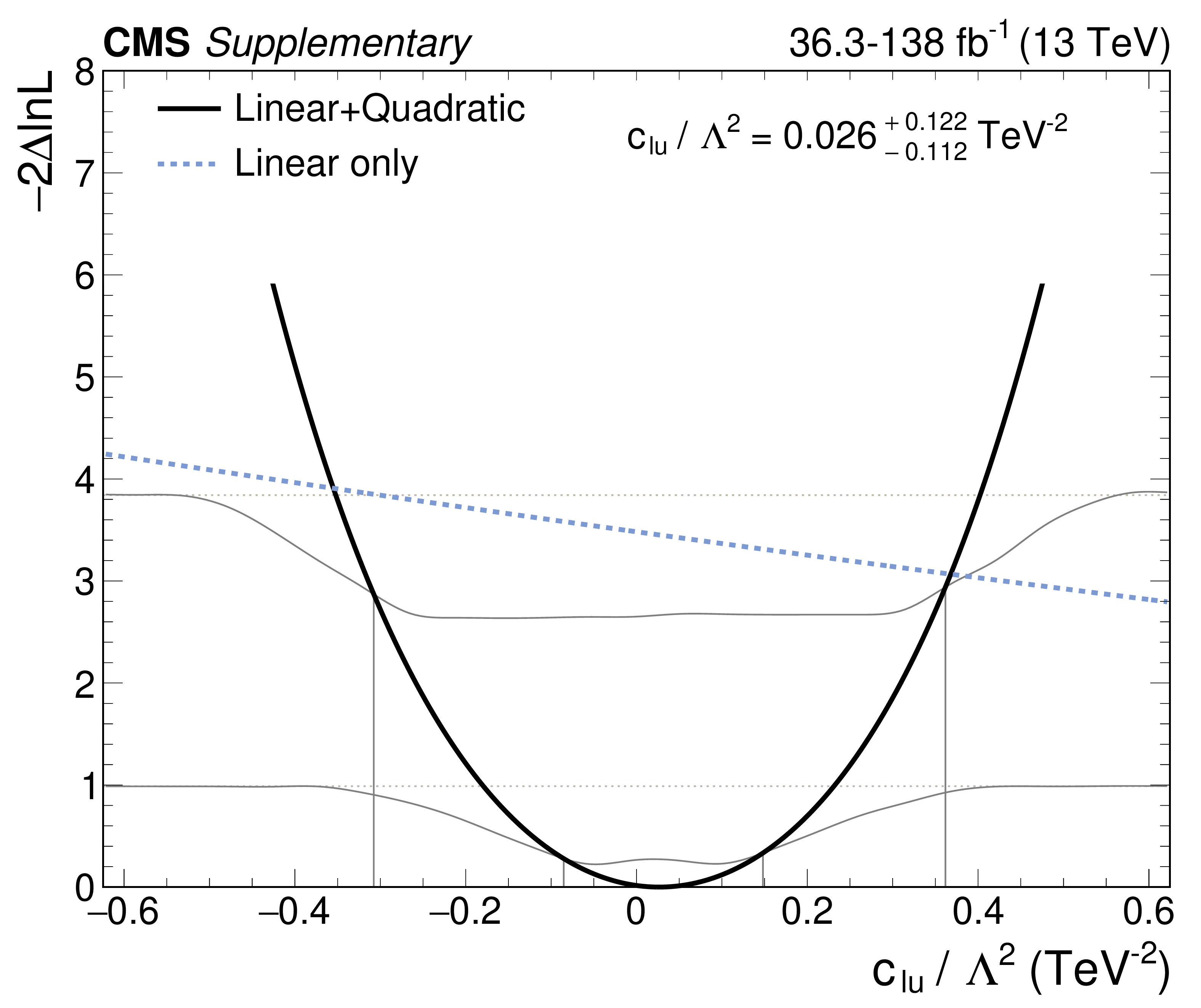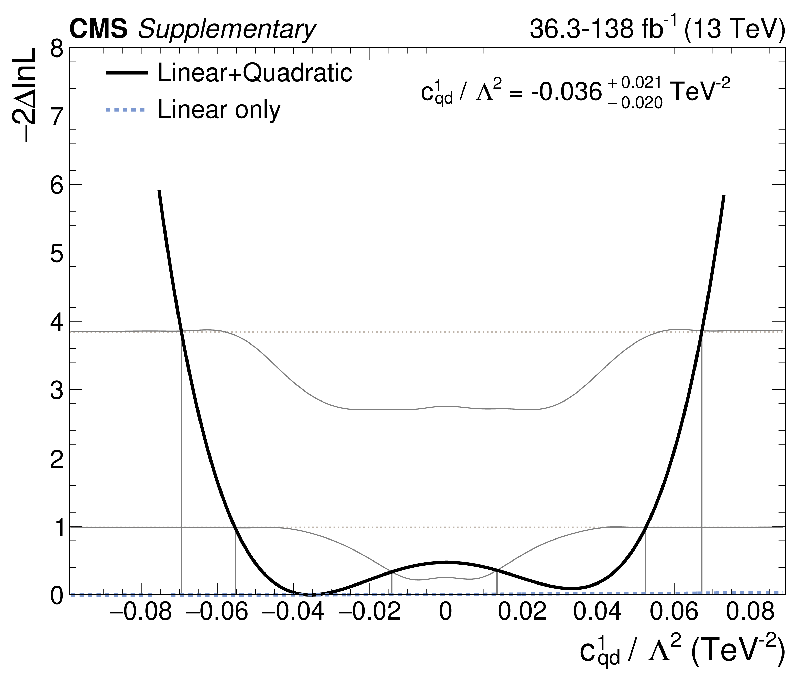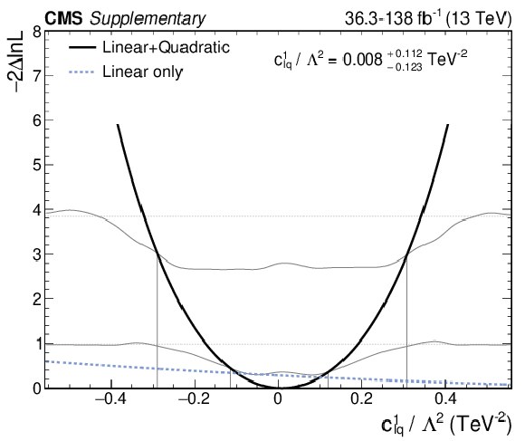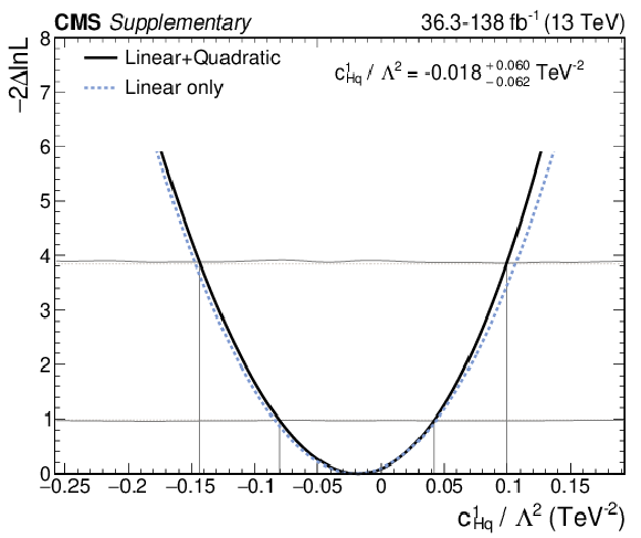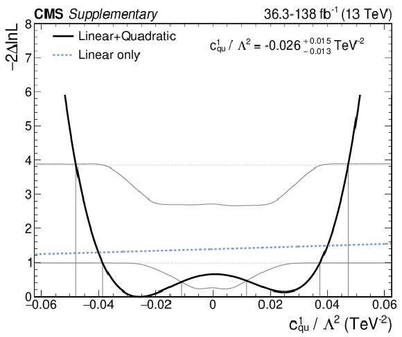 Observed likelihood scans for $ c^{(3)}_{\mathrm{HQ}} $, where linear terms dominate (upper left); $ c_{\mathrm{l}\mathrm{u}} $, where quadratic terms dominate (upper right); and $ c_{\mathrm{W}} $, where quadratic and linear terms both contribute (lower). The results with quadratic terms included in the parameterization (solid black line) and with linear terms only (dashed blue line) are shown. The solid grey lines indicate the sets of points $ q^{68\%} $ (lower line) and $ q^{95\%} $ (upper line), whereas the dashed grey lines denote the test statistic values used to determine the 68% and 95% confidence intervals in the asymptotic approximation. The confidence intervals shown on the figures are the 68% confidence intervals extracted from the intersection of the linear-plus-quadratic curve with the $ q^{68\%} $ line. |