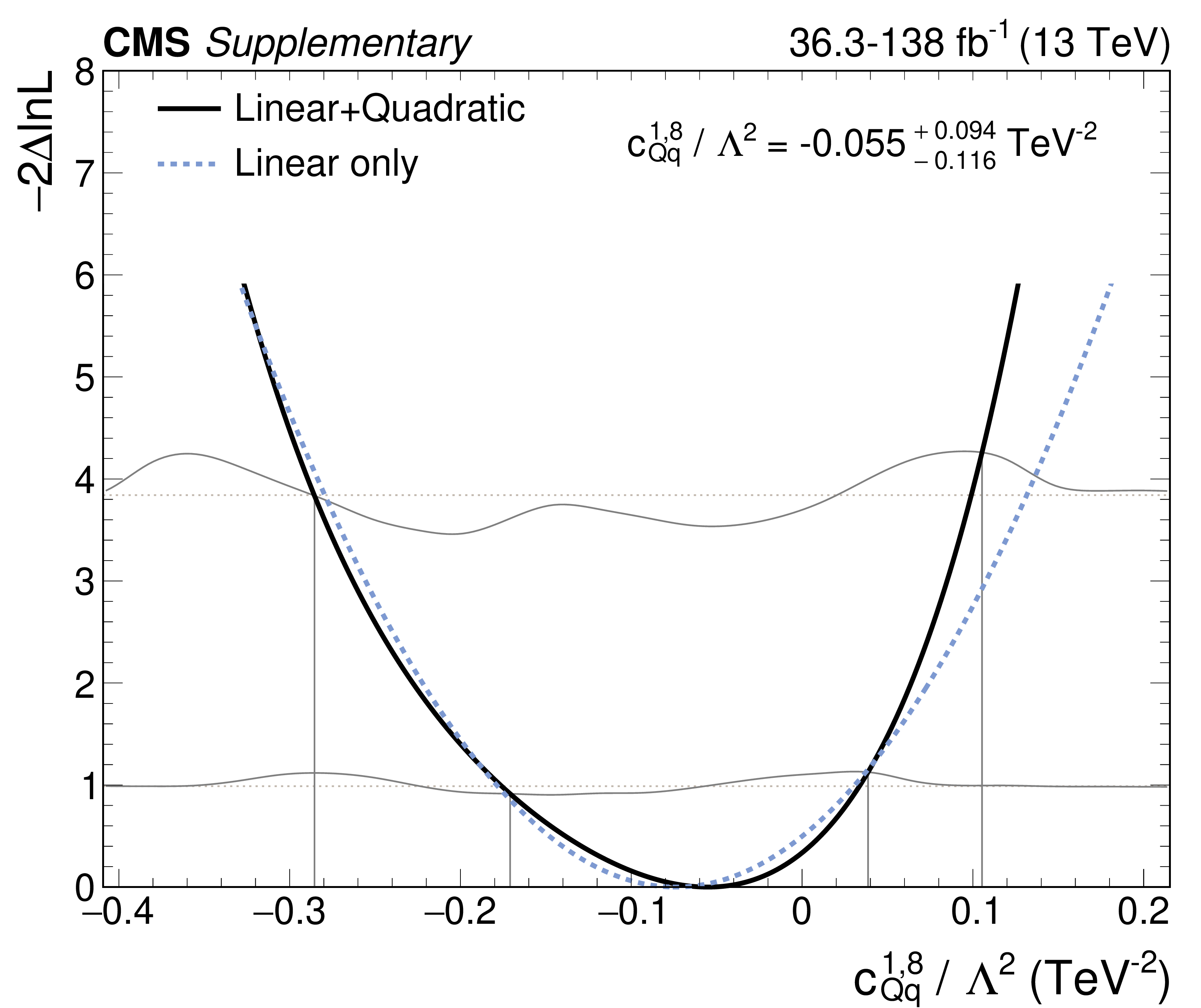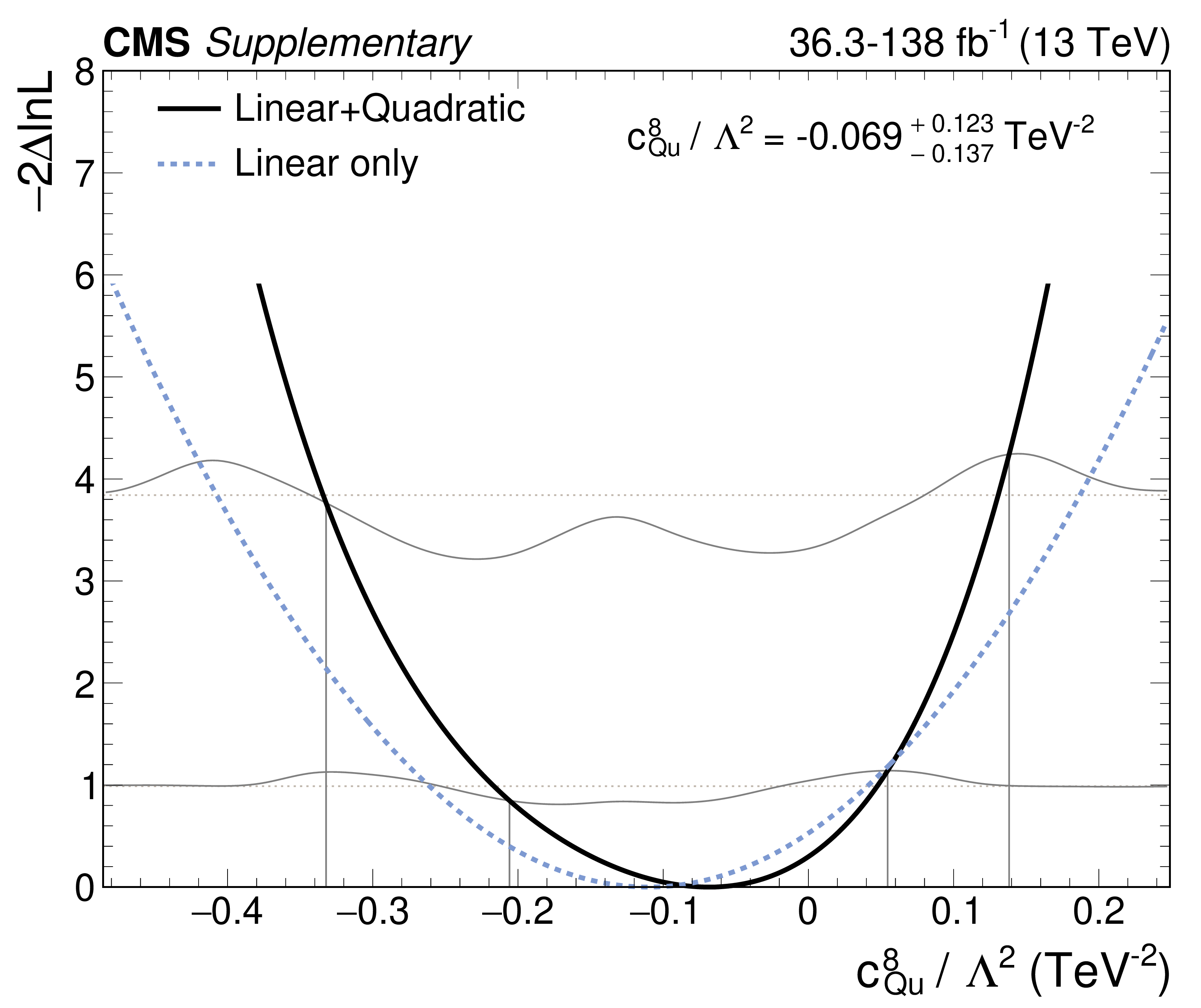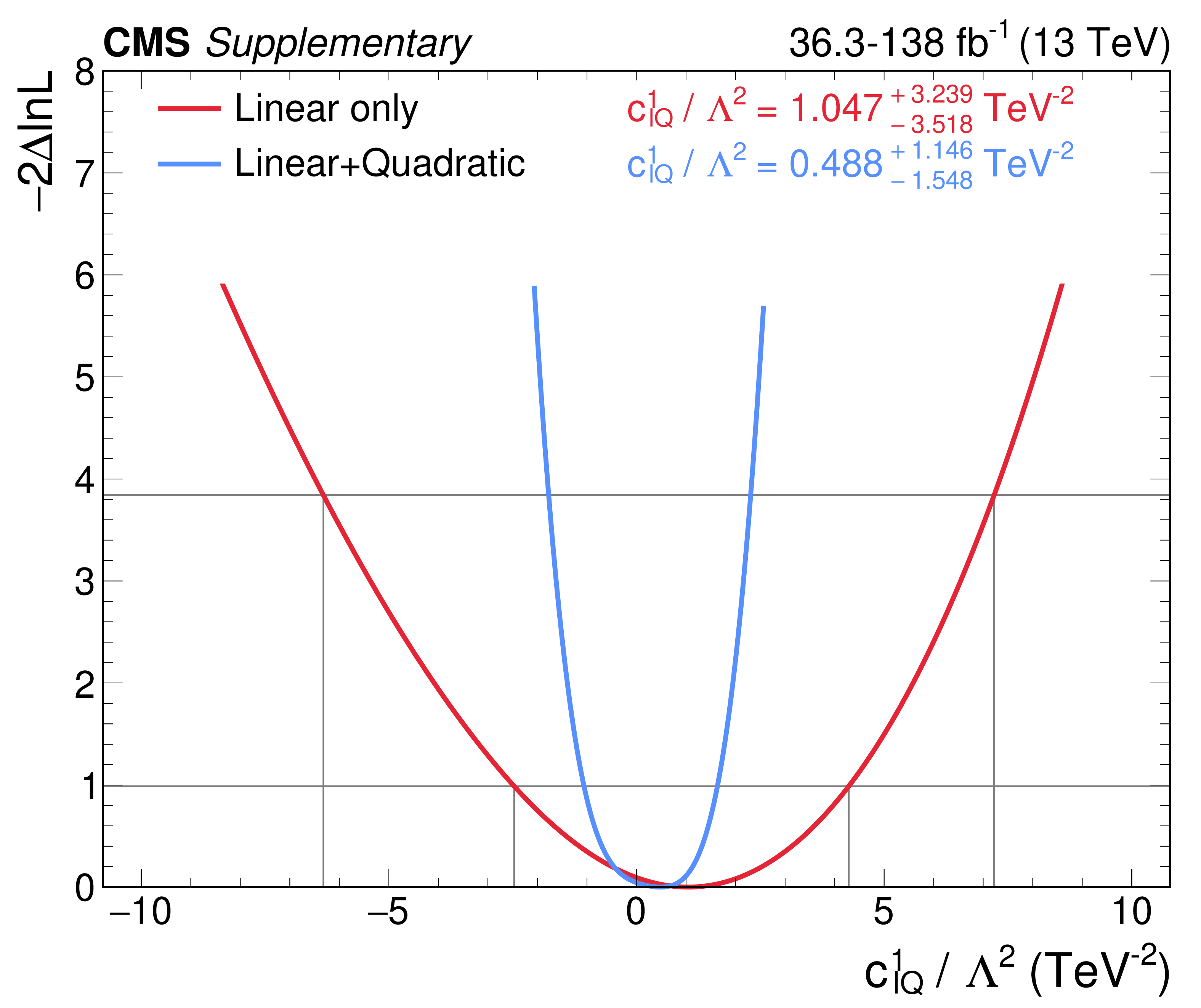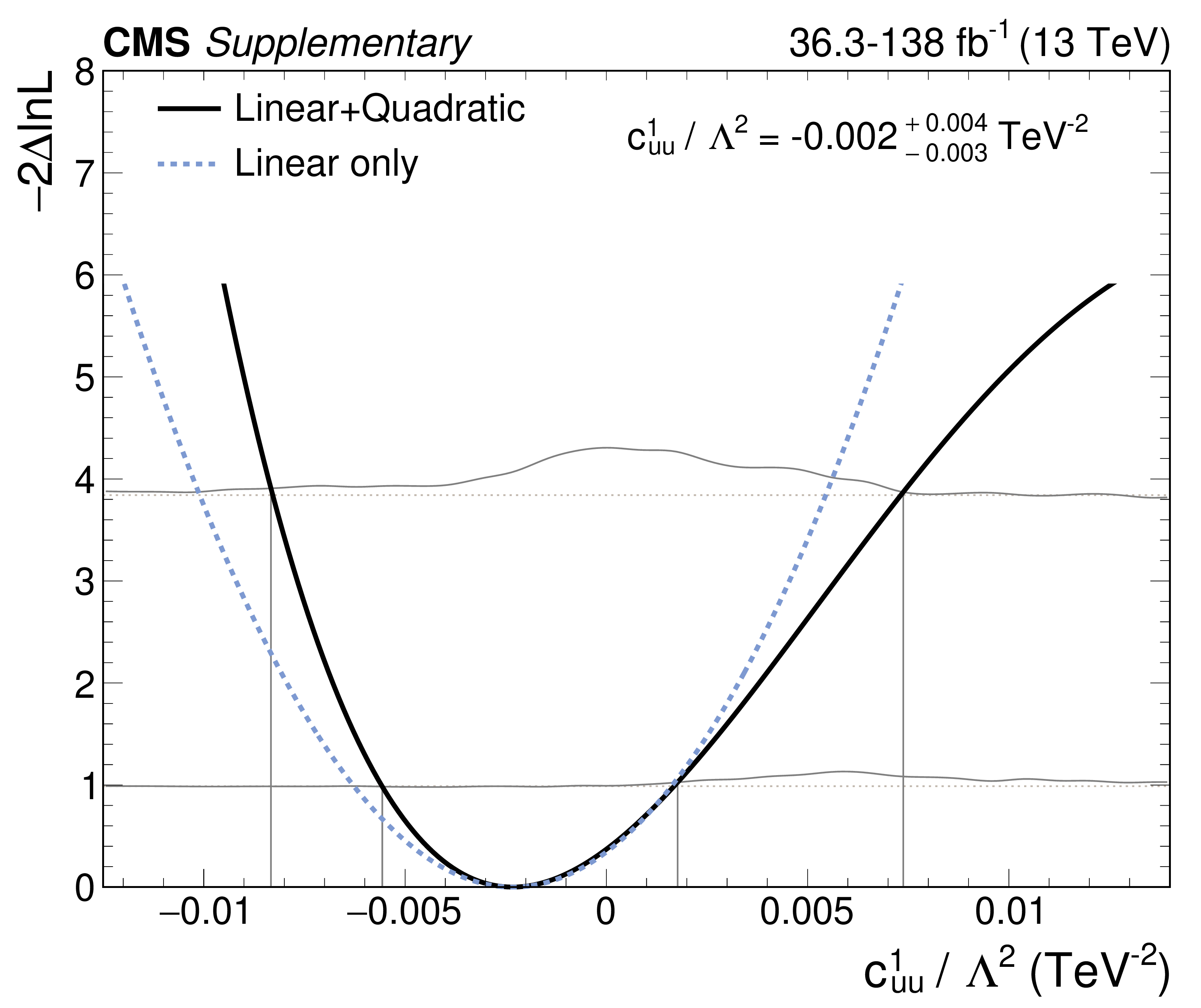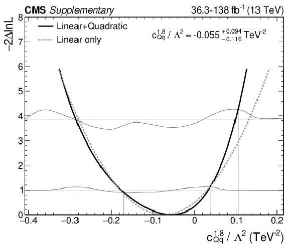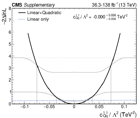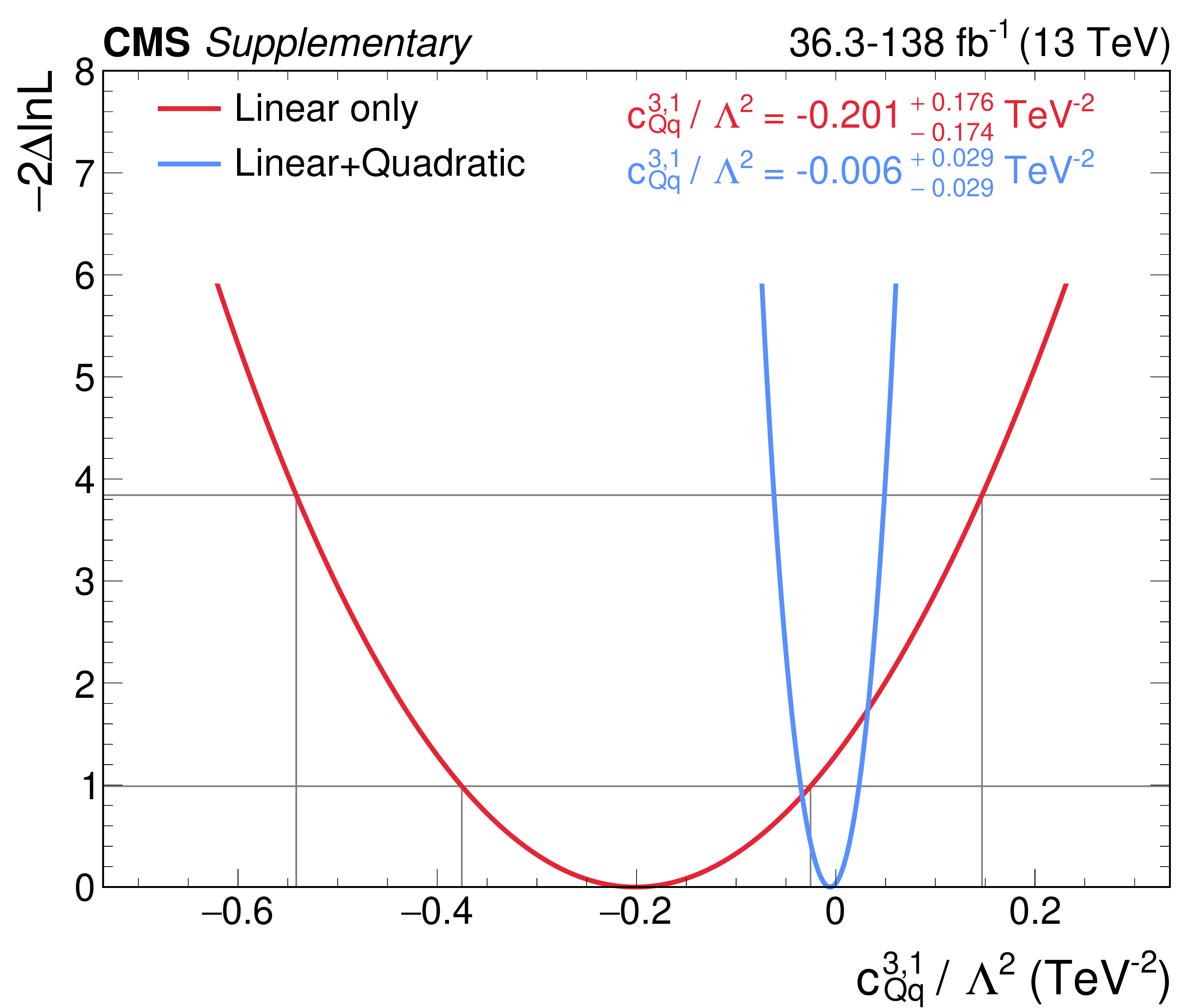 Observed likelihood scans for $ c^{(3)}_{\mathrm{HQ}} $, where linear terms dominate (upper left); $ c_{\mathrm{l}\mathrm{u}} $, where quadratic terms dominate (upper right); and $ c_{\mathrm{W}} $, where quadratic and linear terms both contribute (lower). The results with quadratic terms included in the parameterization (solid black line) and with linear terms only (dashed blue line) are shown. The solid grey lines indicate the sets of points $ q^{68\%} $ (lower line) and $ q^{95\%} $ (upper line), whereas the dashed grey lines denote the test statistic values used to determine the 68% and 95% confidence intervals in the asymptotic approximation. The confidence intervals shown on the figures are the 68% confidence intervals extracted from the intersection of the linear-plus-quadratic curve with the $ q^{68\%} $ line. |