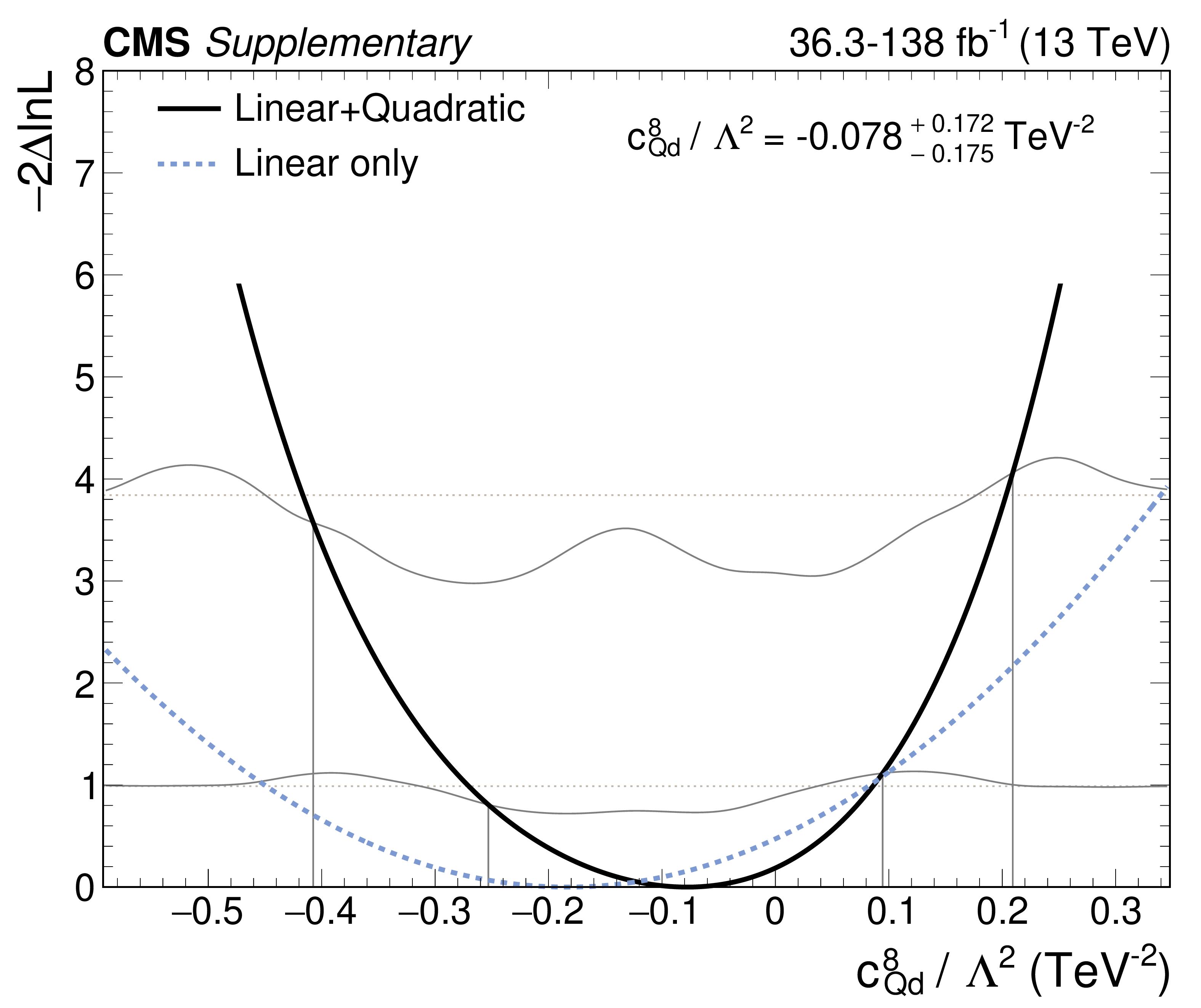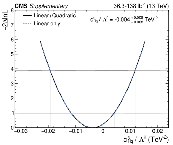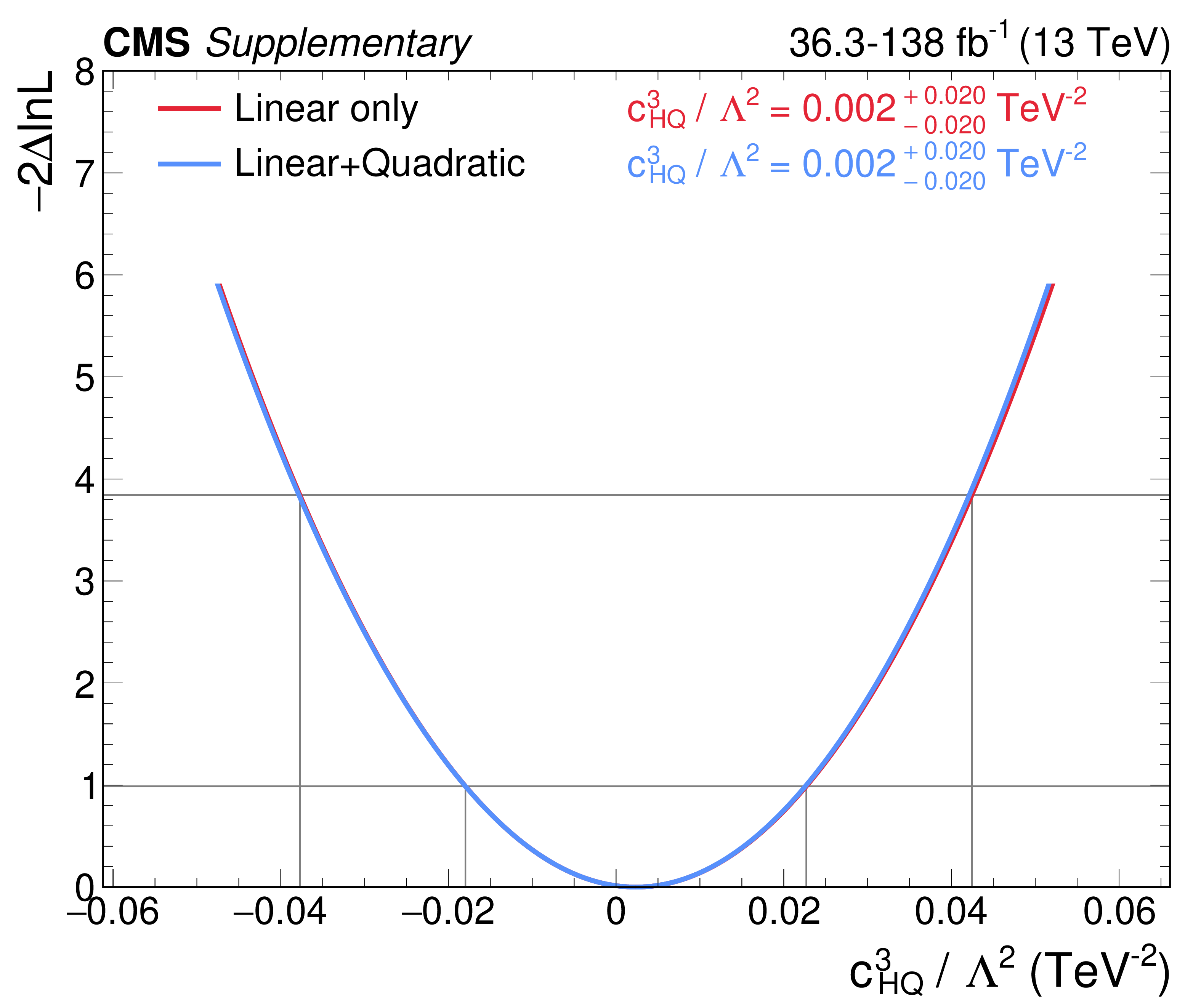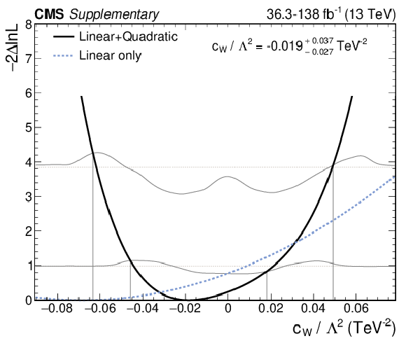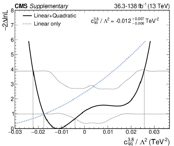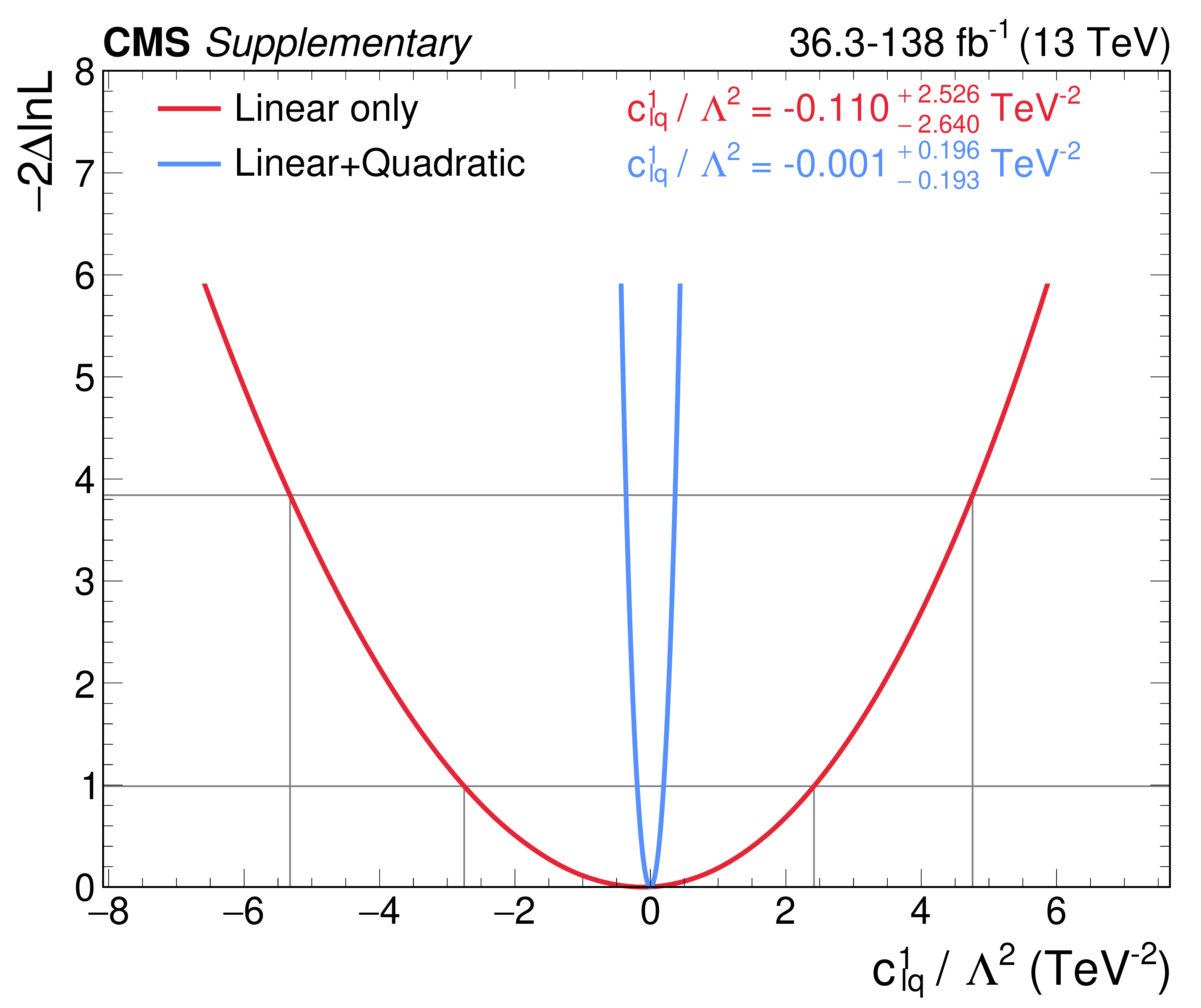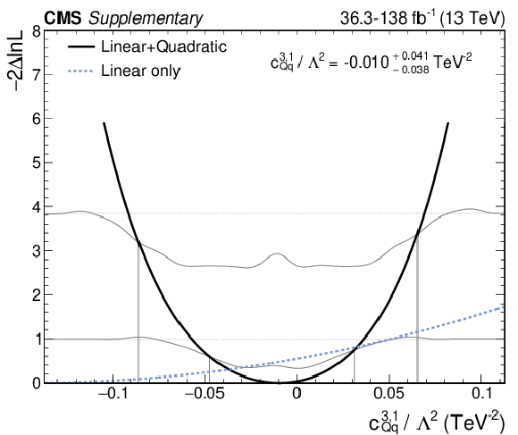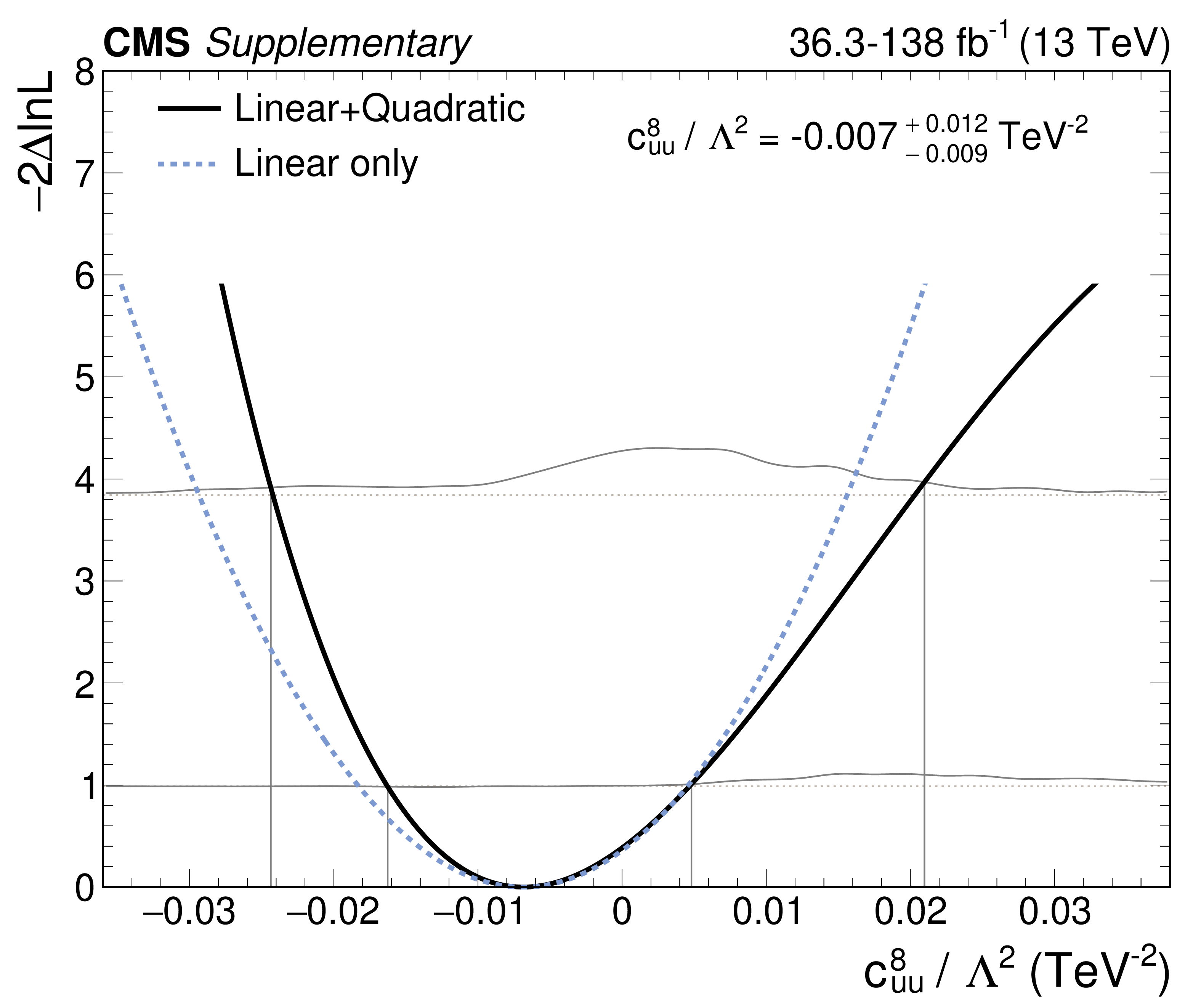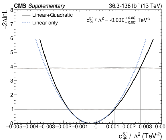 Observed likelihood scans for $ c^{(3)}_{\mathrm{HQ}} $, where linear terms dominate (upper left); $ c_{\mathrm{l}\mathrm{u}} $, where quadratic terms dominate (upper right); and $ c_{\mathrm{W}} $, where quadratic and linear terms both contribute (lower). The results with quadratic terms included in the parameterization (solid black line) and with linear terms only (dashed blue line) are shown. The solid grey lines indicate the sets of points $ q^{68\%} $ (lower line) and $ q^{95\%} $ (upper line), whereas the dashed grey lines denote the test statistic values used to determine the 68% and 95% confidence intervals in the asymptotic approximation. The confidence intervals shown on the figures are the 68% confidence intervals extracted from the intersection of the linear-plus-quadratic curve with the $ q^{68\%} $ line. |