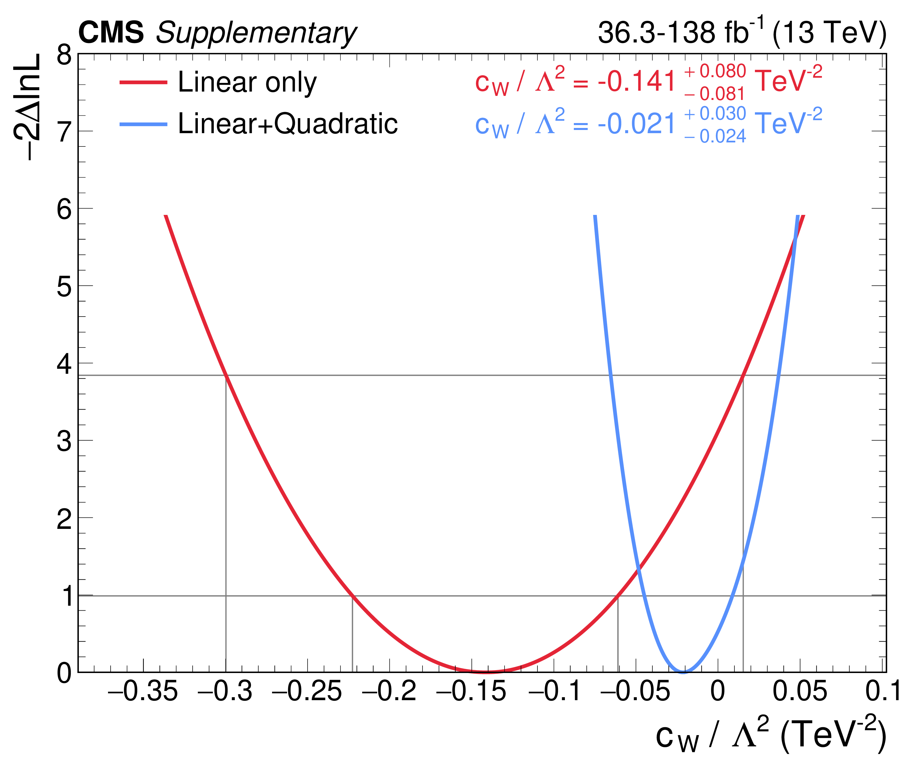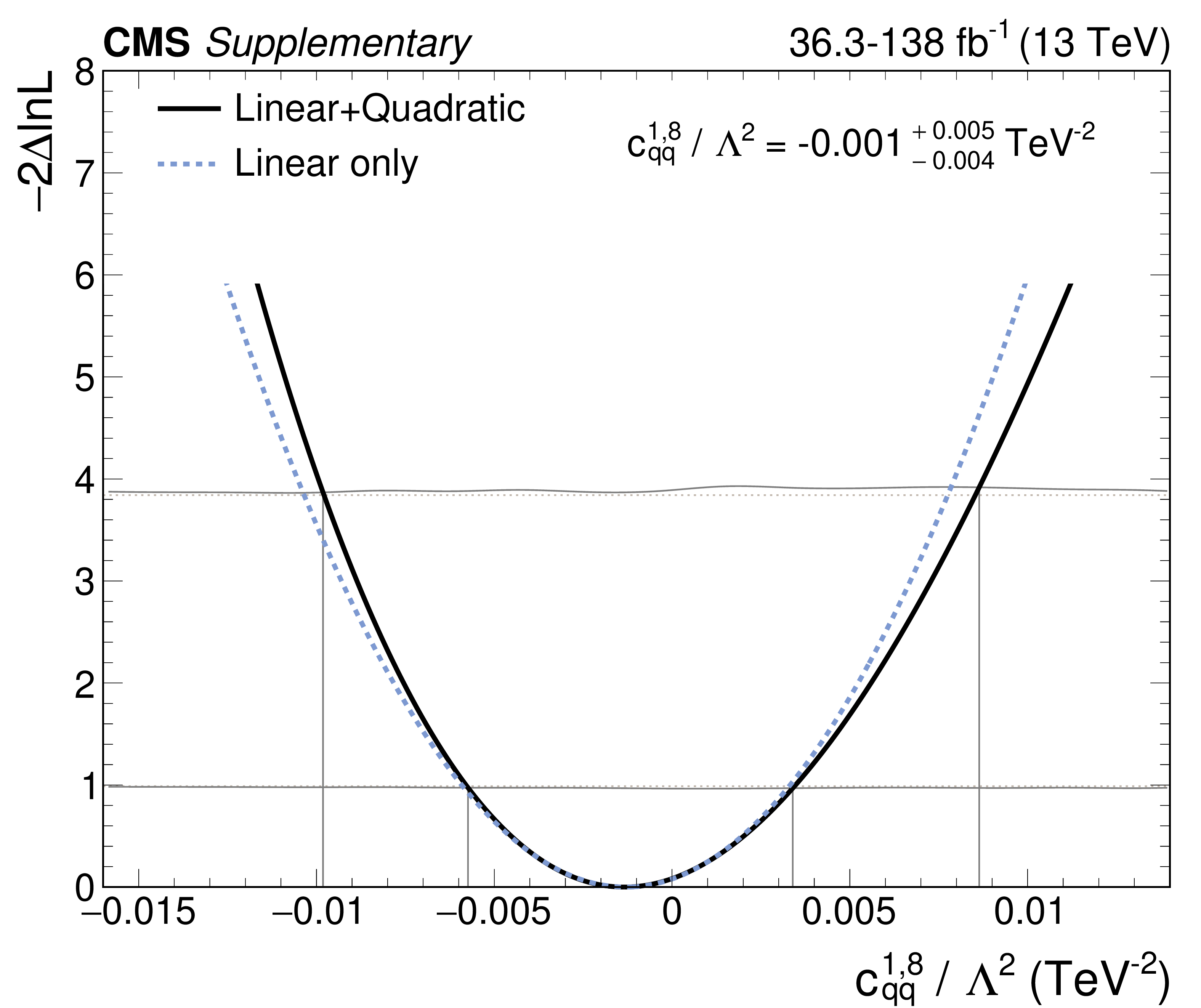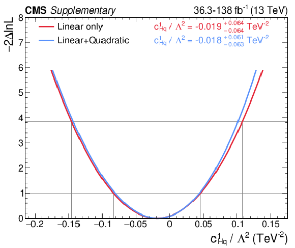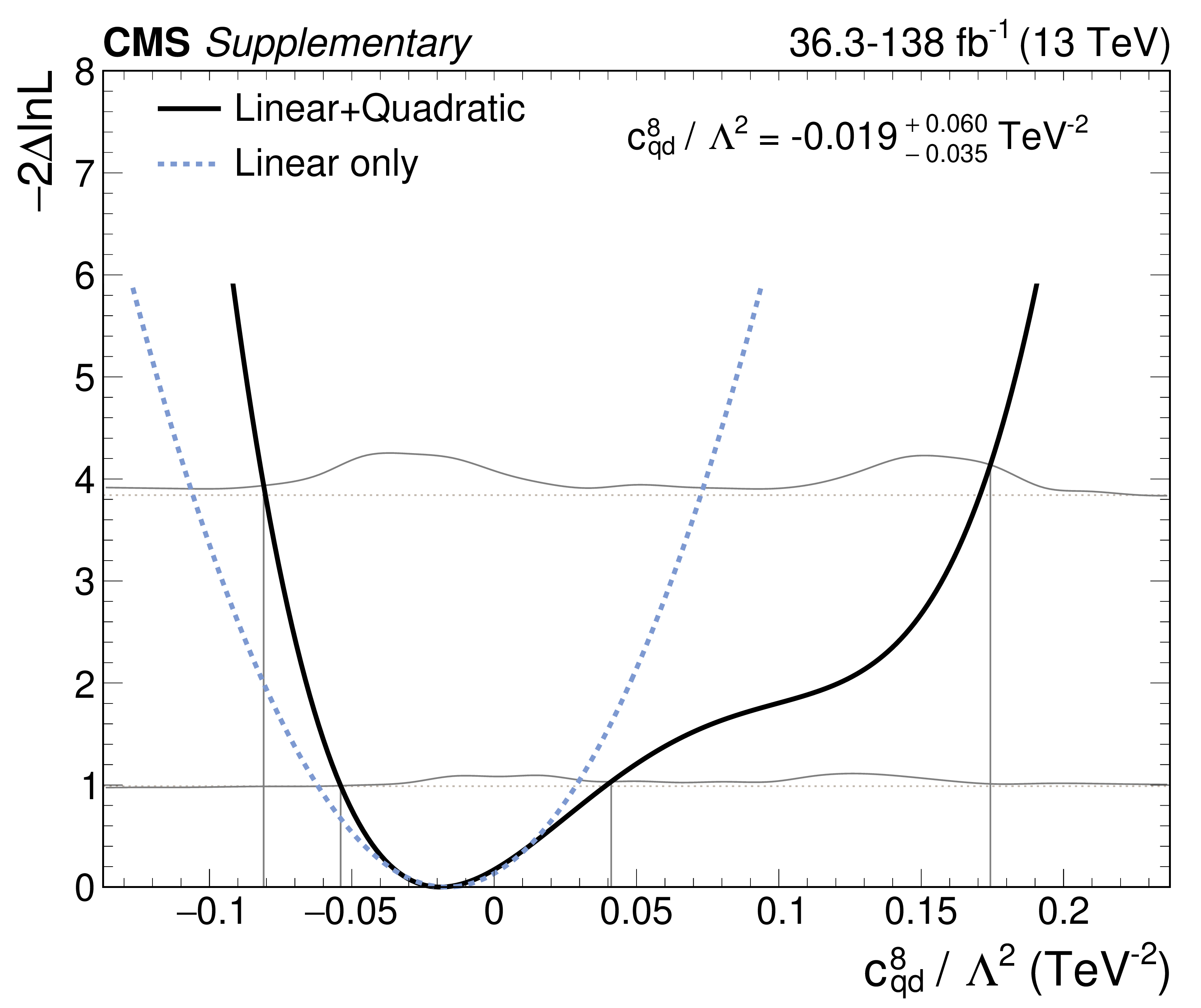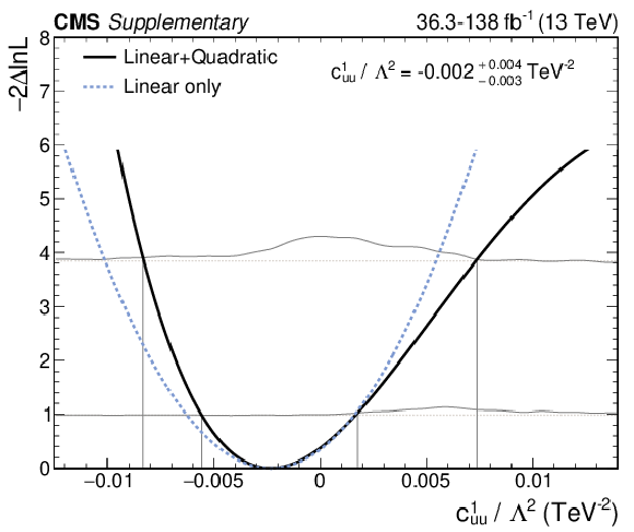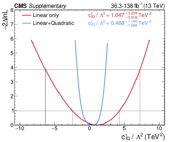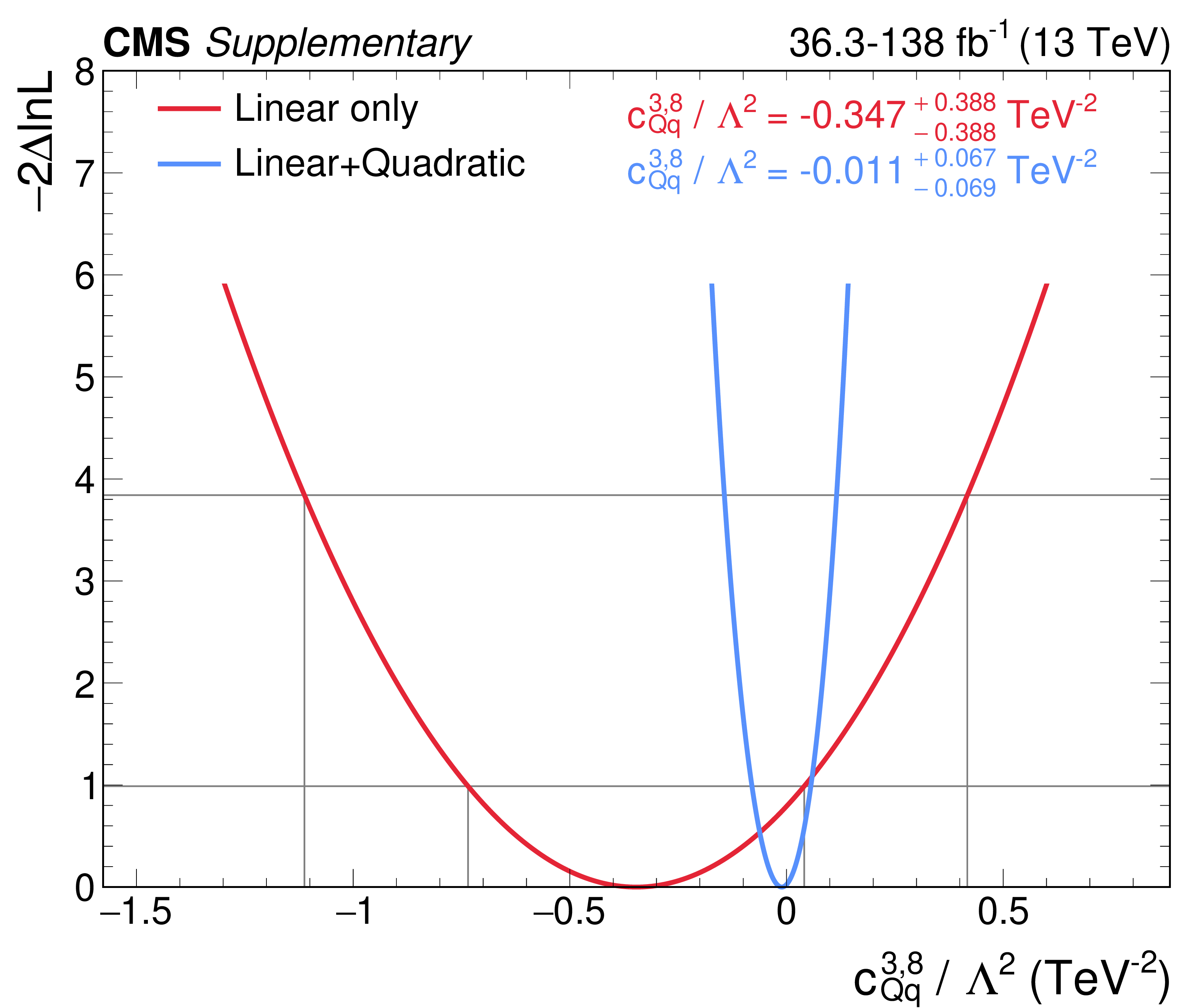 Observed likelihood scans for $ c^{(3)}_{\mathrm{HQ}} $, where linear terms dominate (upper left); $ c_{\mathrm{l}\mathrm{u}} $, where quadratic terms dominate (upper right); and $ c_{\mathrm{W}} $, where quadratic and linear terms both contribute (lower). The results with quadratic terms included in the parameterization (solid black line) and with linear terms only (dashed blue line) are shown. The solid grey lines indicate the sets of points $ q^{68\%} $ (lower line) and $ q^{95\%} $ (upper line), whereas the dashed grey lines denote the test statistic values used to determine the 68% and 95% confidence intervals in the asymptotic approximation. The confidence intervals shown on the figures are the 68% confidence intervals extracted from the intersection of the linear-plus-quadratic curve with the $ q^{68\%} $ line. |