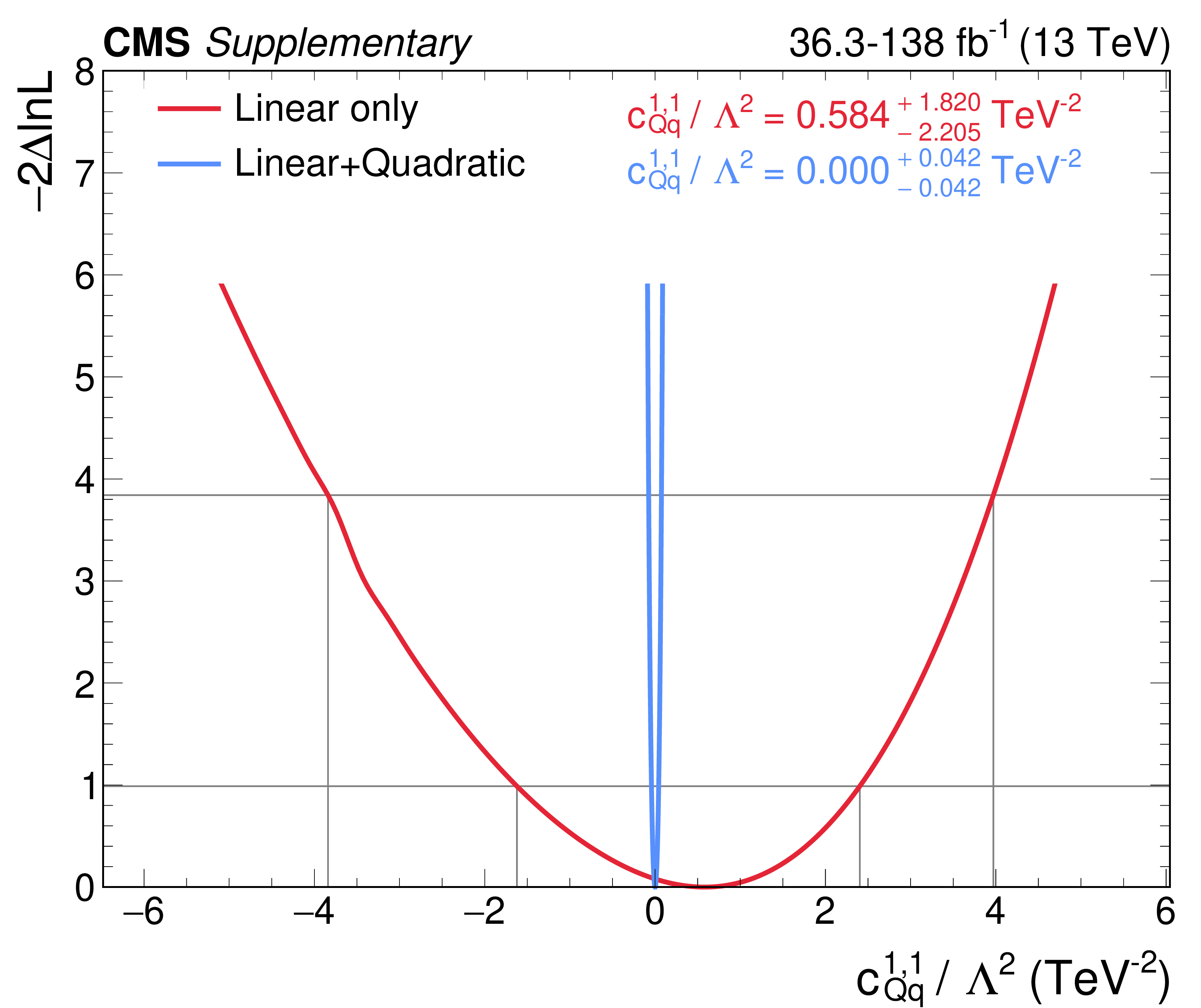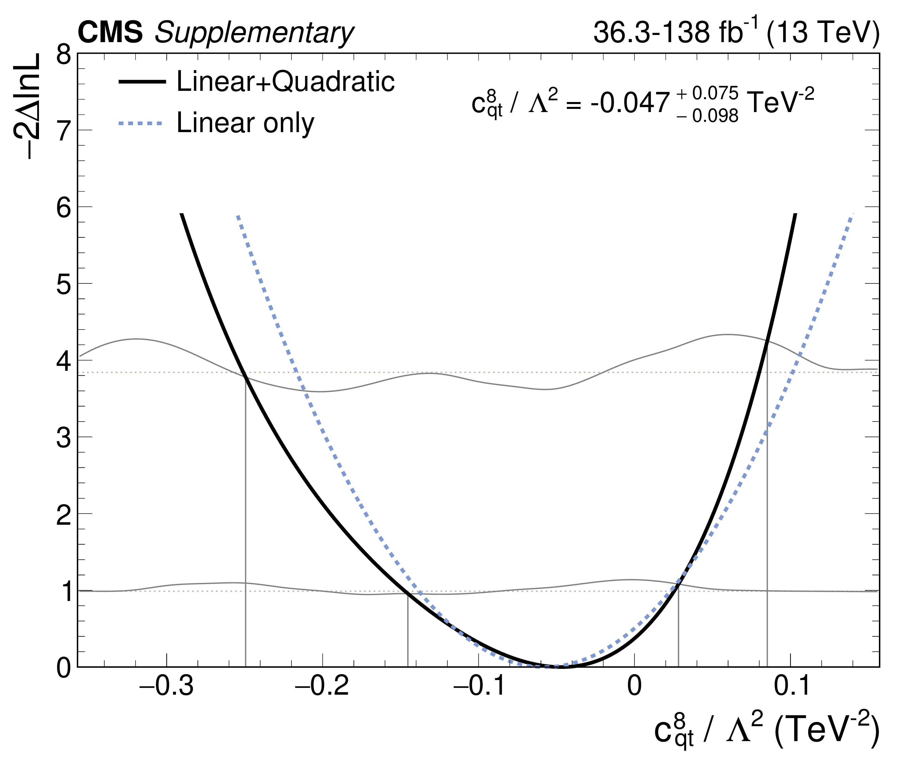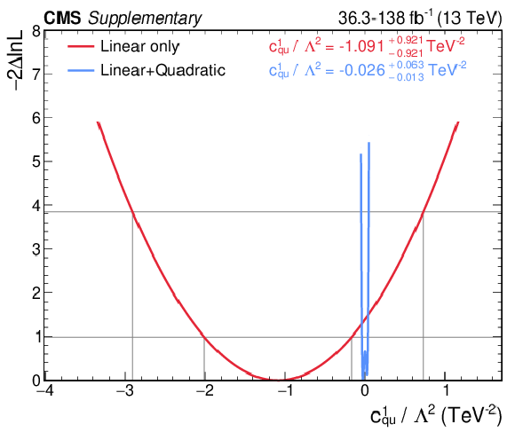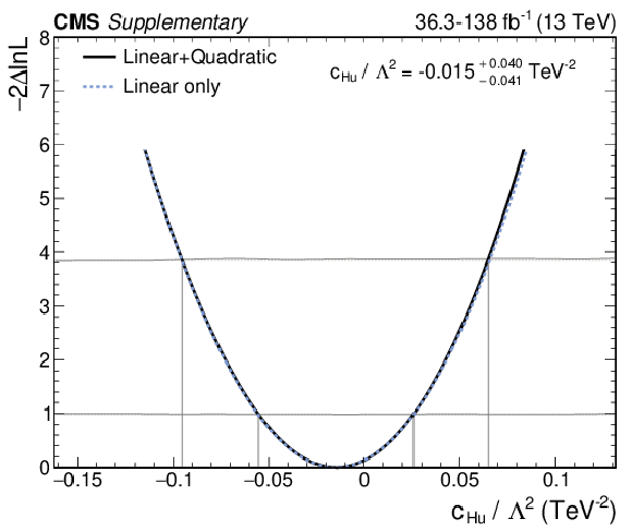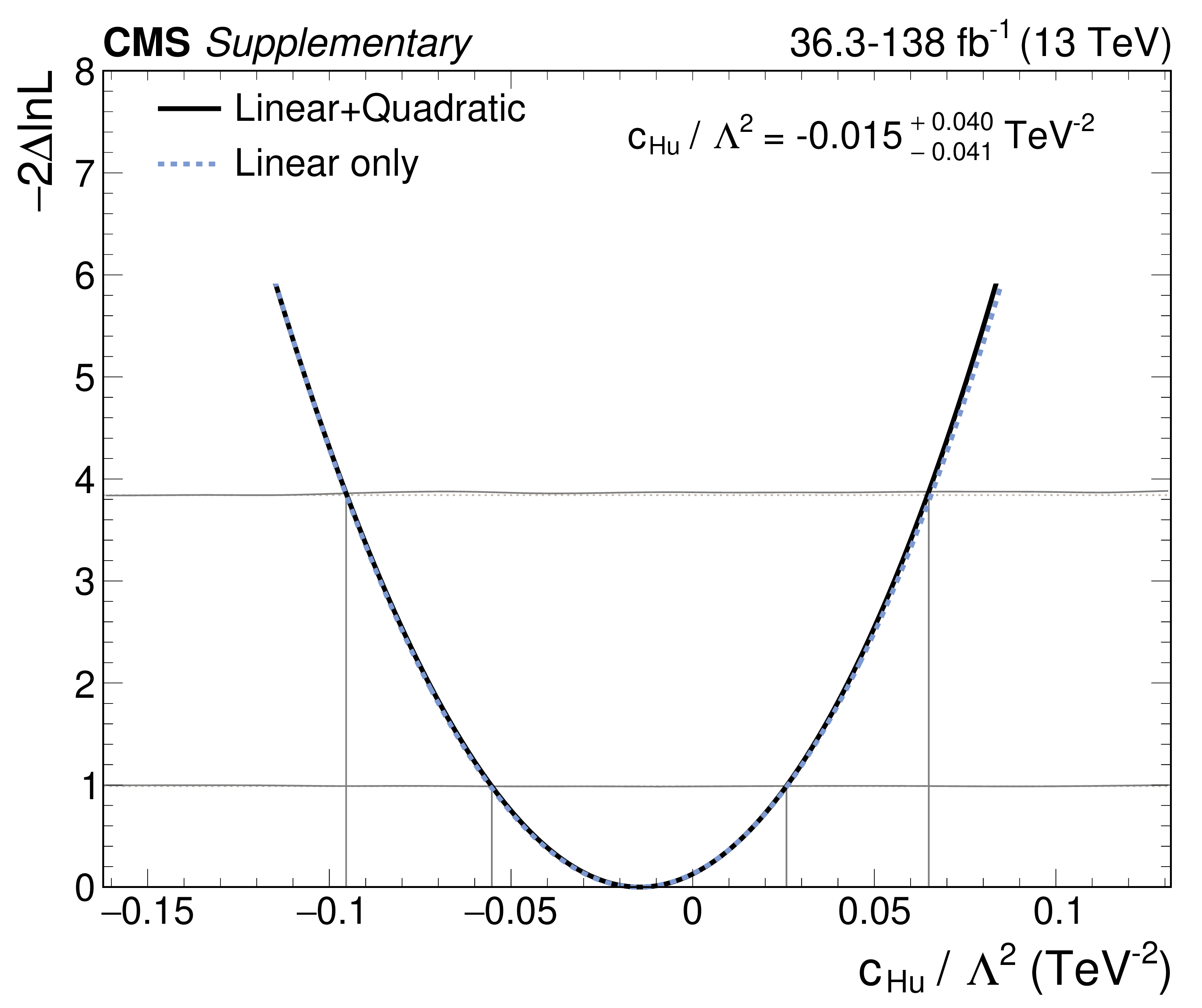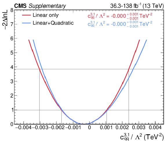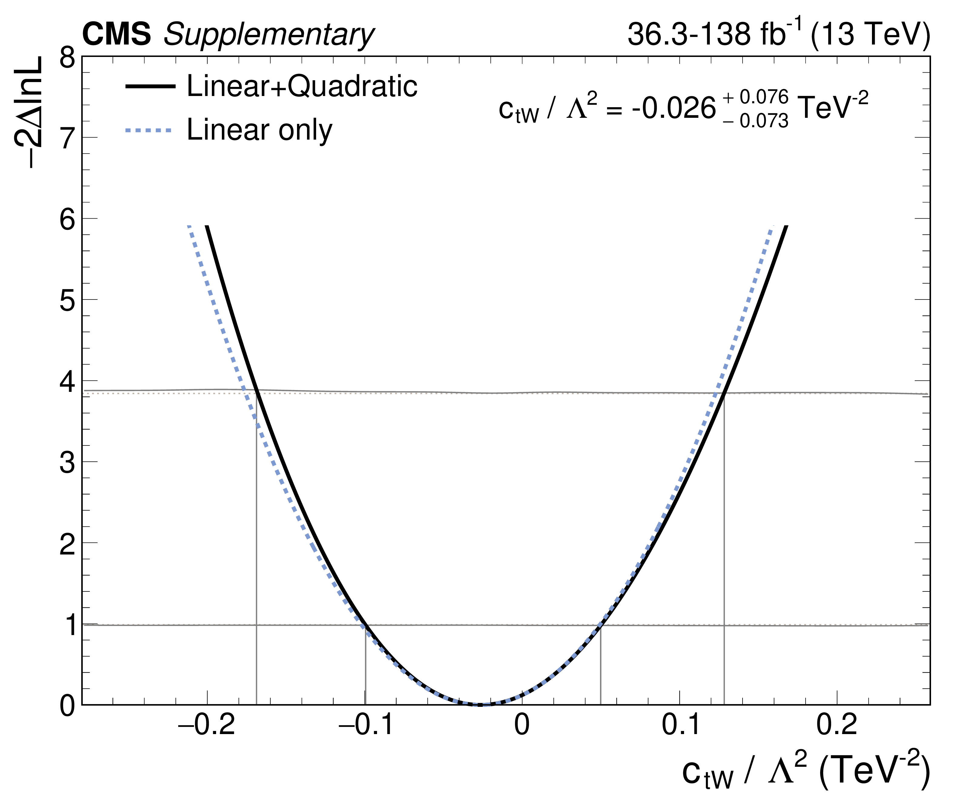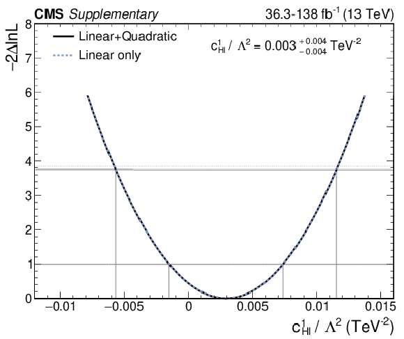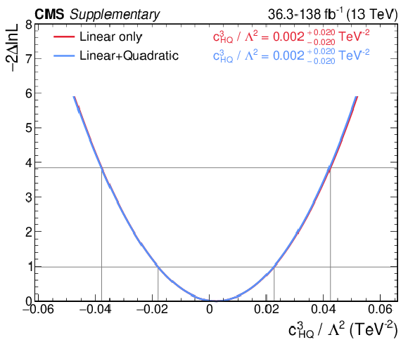 Observed likelihood scans for $ c^{(3)}_{\mathrm{HQ}} $, where linear terms dominate (upper left); $ c_{\mathrm{l}\mathrm{u}} $, where quadratic terms dominate (upper right); and $ c_{\mathrm{W}} $, where quadratic and linear terms both contribute (lower). The results with quadratic terms included in the parameterization (solid black line) and with linear terms only (dashed blue line) are shown. The solid grey lines indicate the sets of points $ q^{68\%} $ (lower line) and $ q^{95\%} $ (upper line), whereas the dashed grey lines denote the test statistic values used to determine the 68% and 95% confidence intervals in the asymptotic approximation. The confidence intervals shown on the figures are the 68% confidence intervals extracted from the intersection of the linear-plus-quadratic curve with the $ q^{68\%} $ line. |