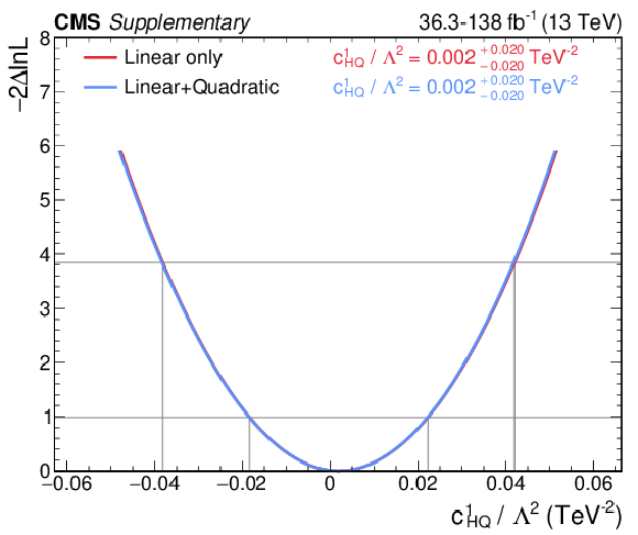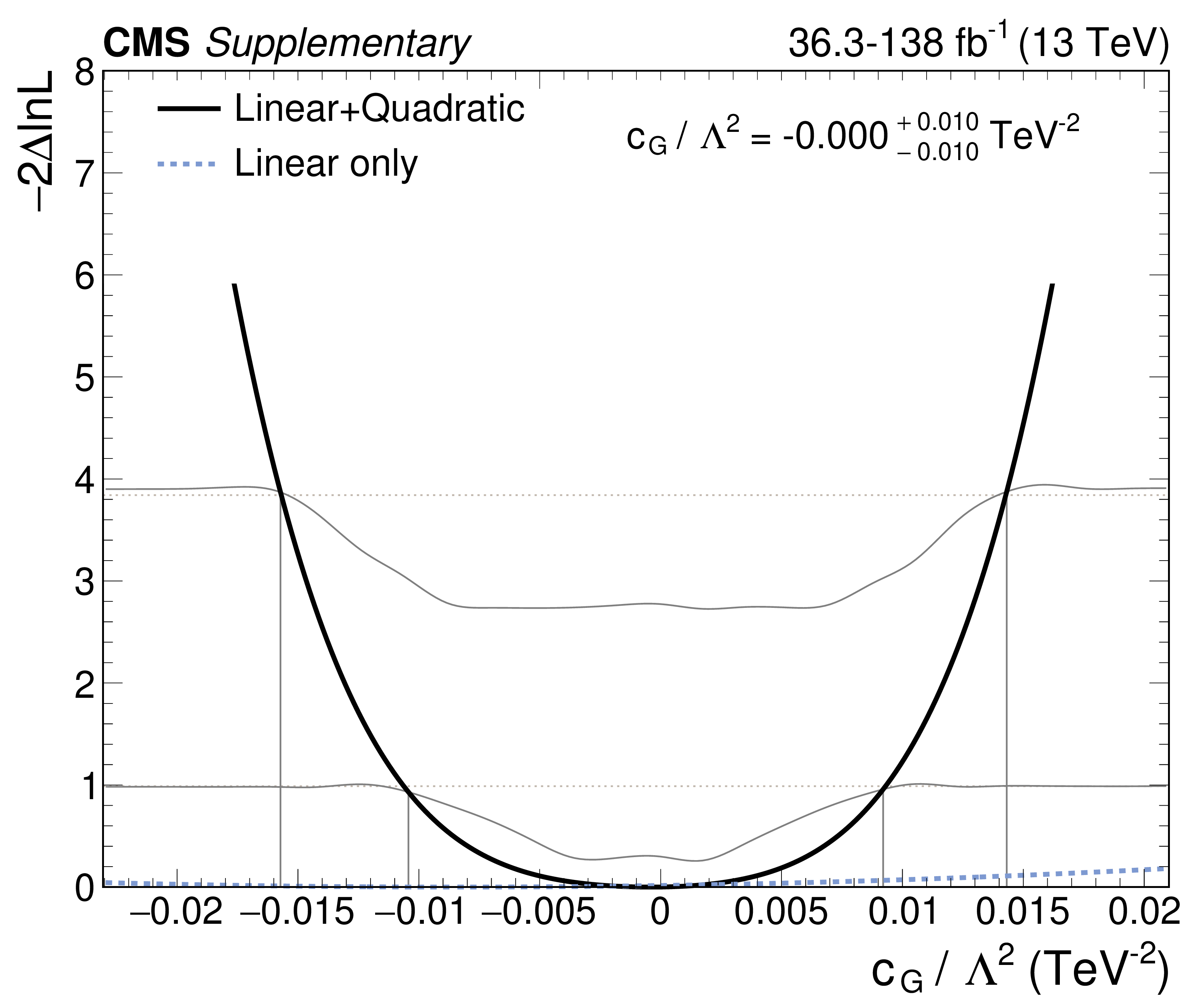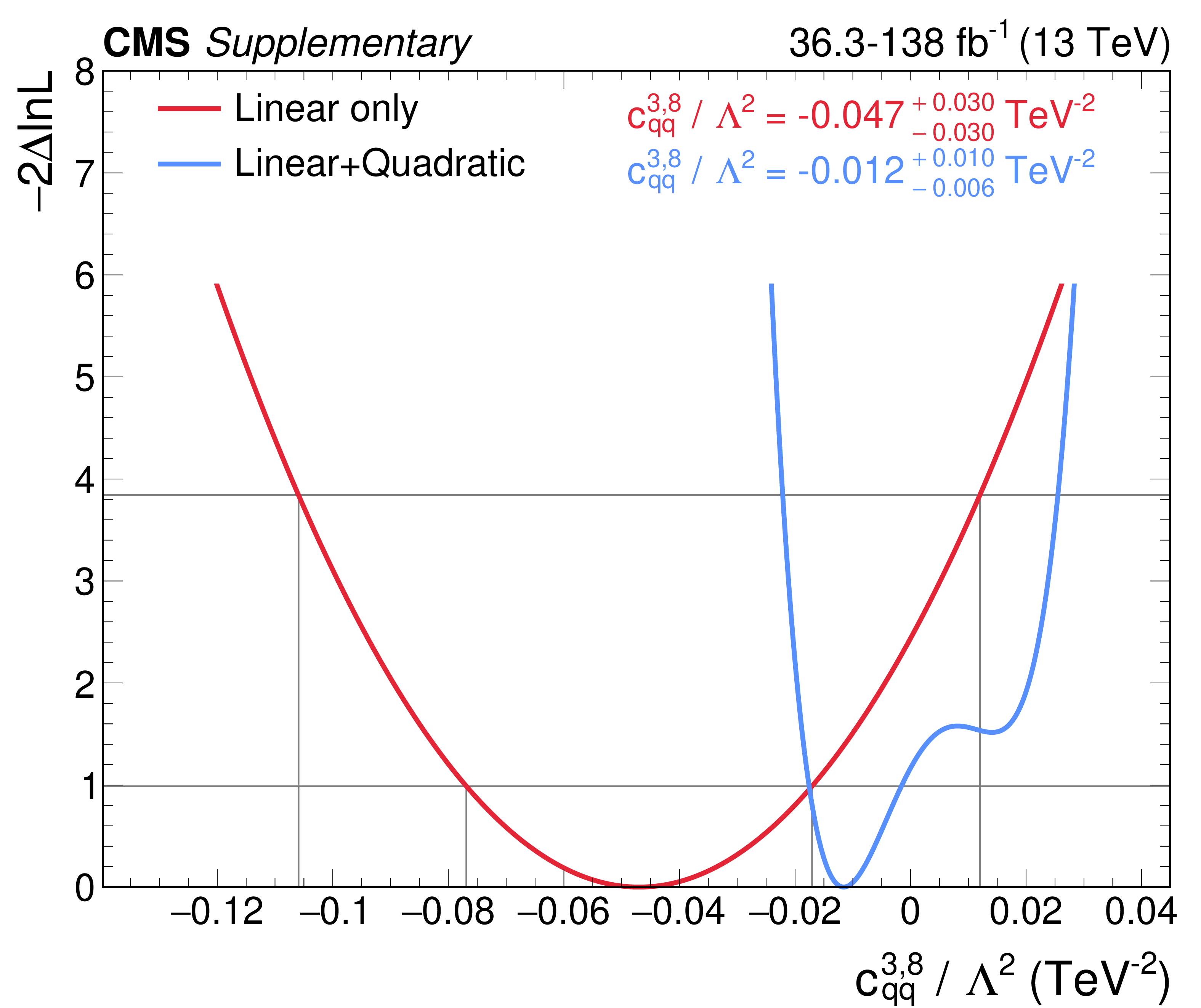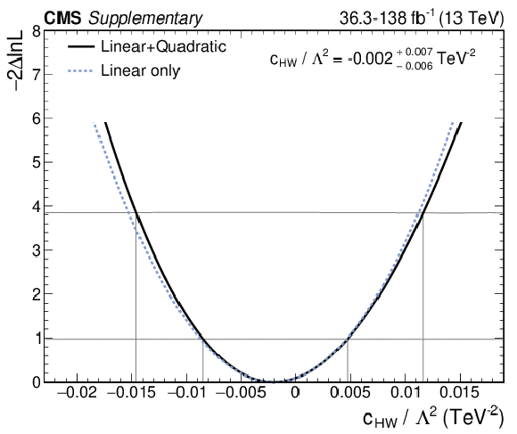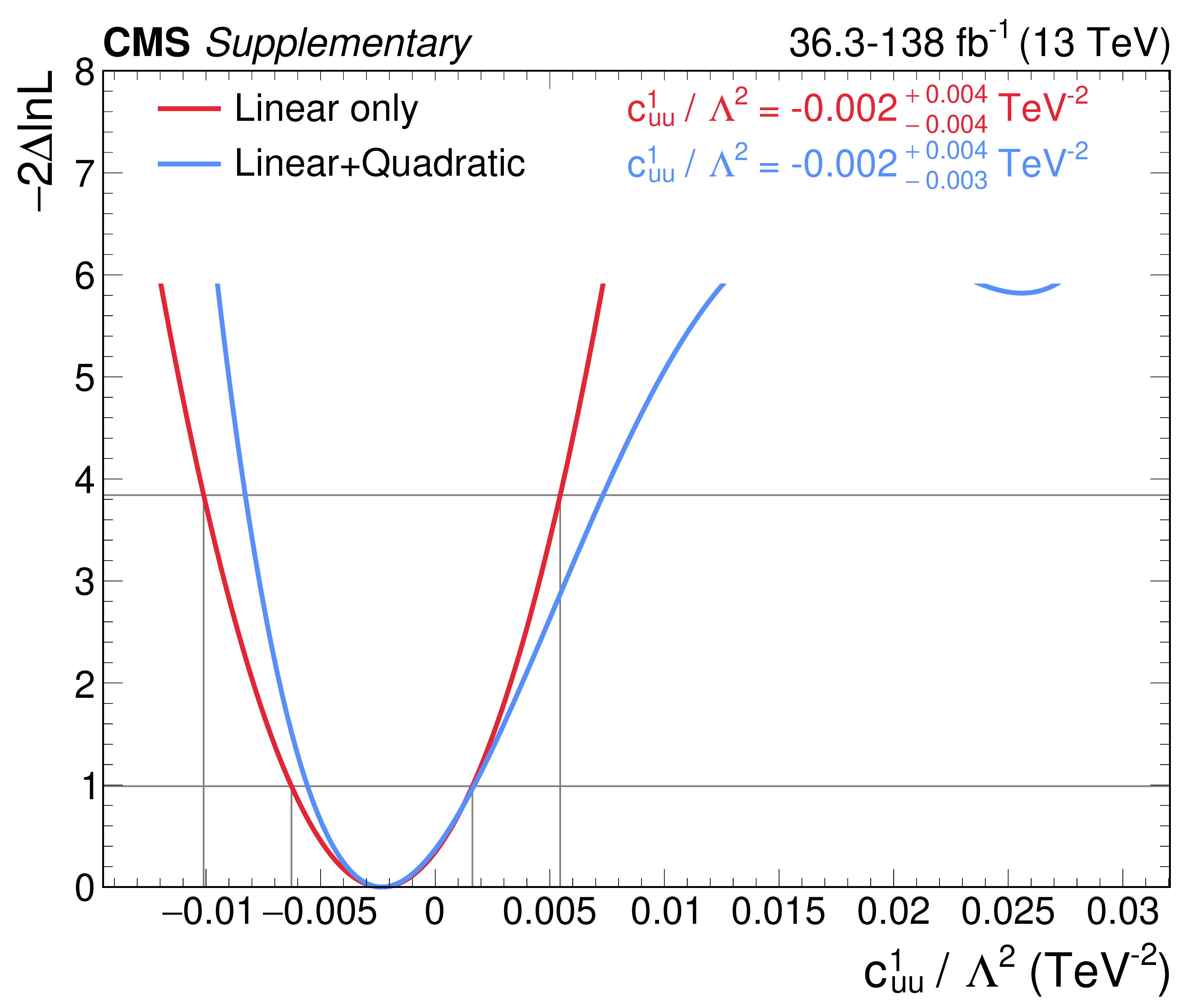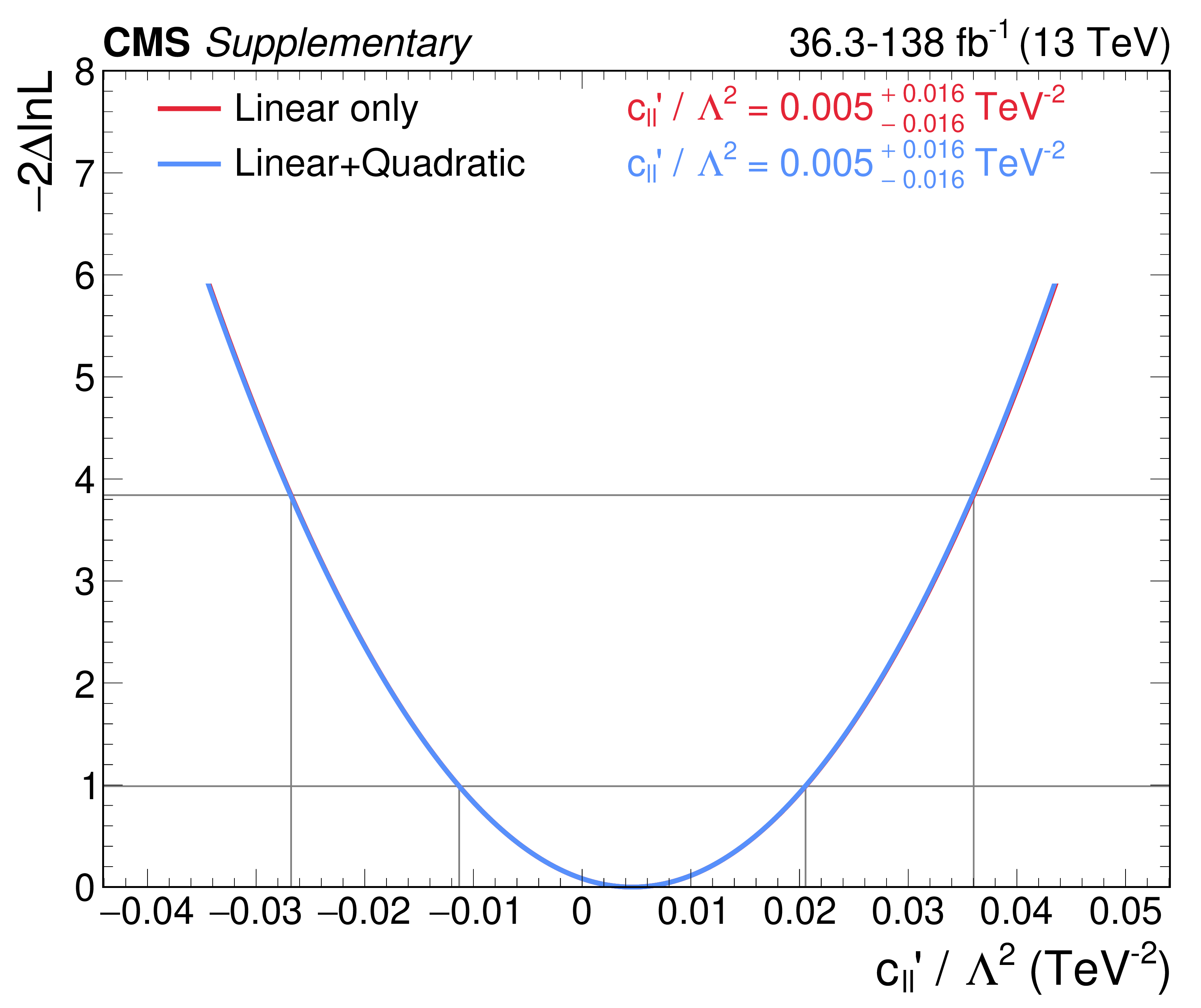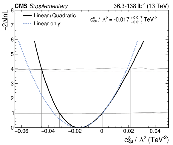 Observed likelihood scans for $ c^{(3)}_{\mathrm{HQ}} $, where linear terms dominate (upper left); $ c_{\mathrm{l}\mathrm{u}} $, where quadratic terms dominate (upper right); and $ c_{\mathrm{W}} $, where quadratic and linear terms both contribute (lower). The results with quadratic terms included in the parameterization (solid black line) and with linear terms only (dashed blue line) are shown. The solid grey lines indicate the sets of points $ q^{68\%} $ (lower line) and $ q^{95\%} $ (upper line), whereas the dashed grey lines denote the test statistic values used to determine the 68% and 95% confidence intervals in the asymptotic approximation. The confidence intervals shown on the figures are the 68% confidence intervals extracted from the intersection of the linear-plus-quadratic curve with the $ q^{68\%} $ line. |