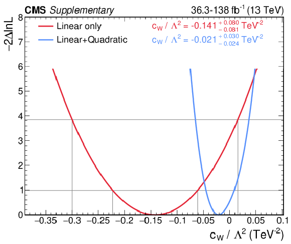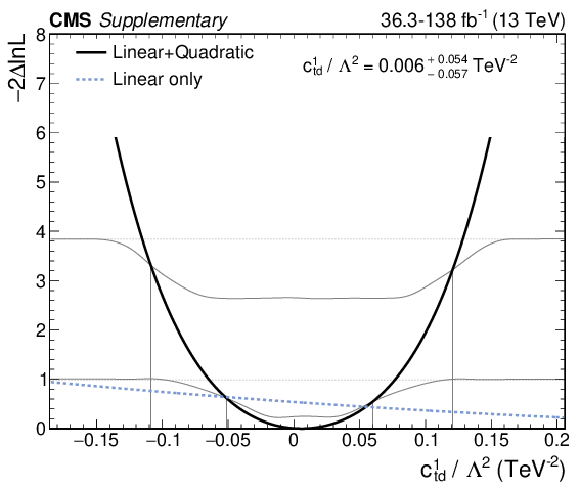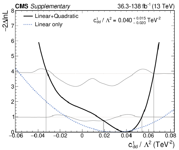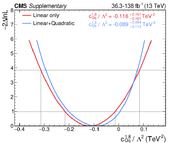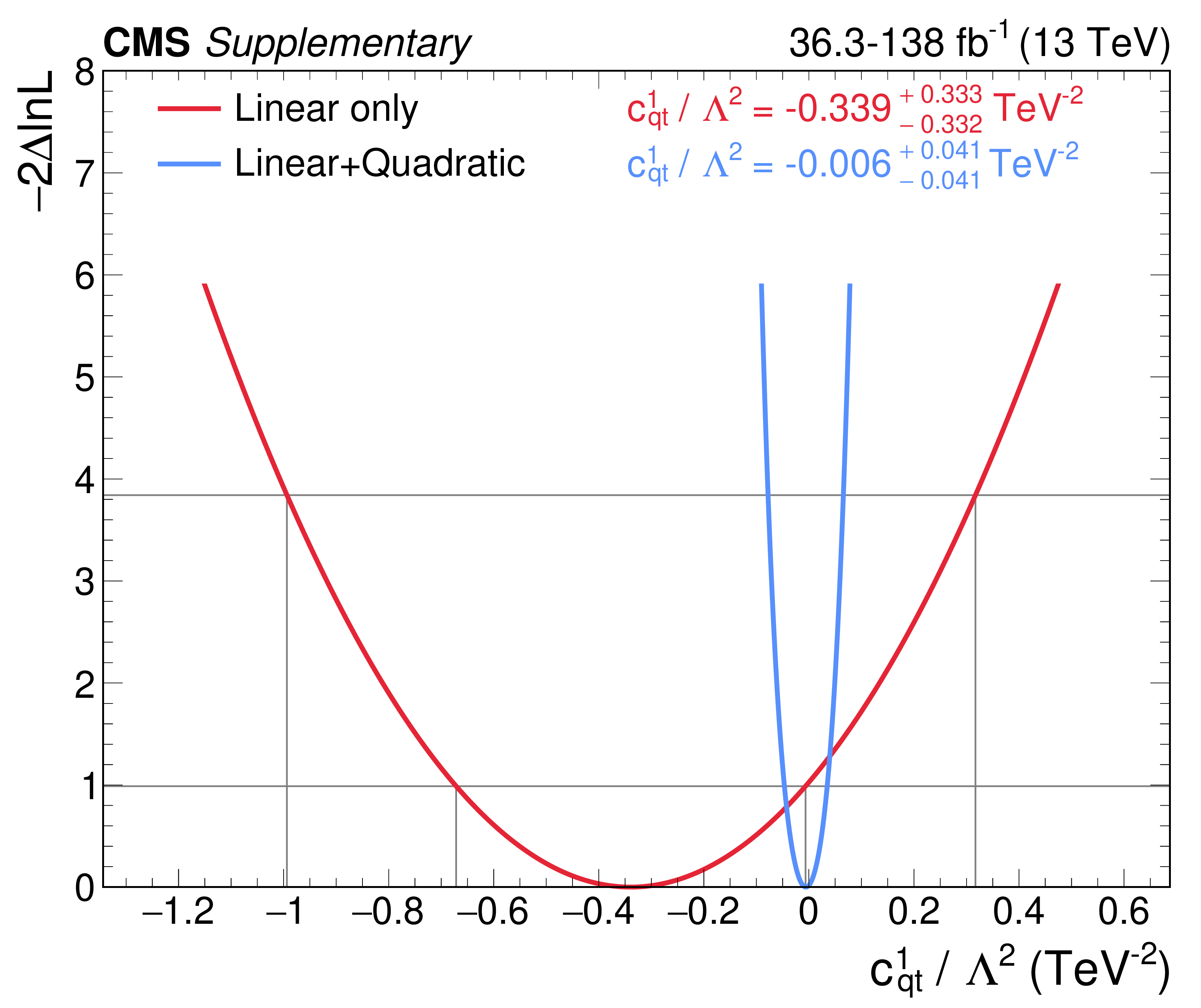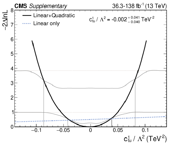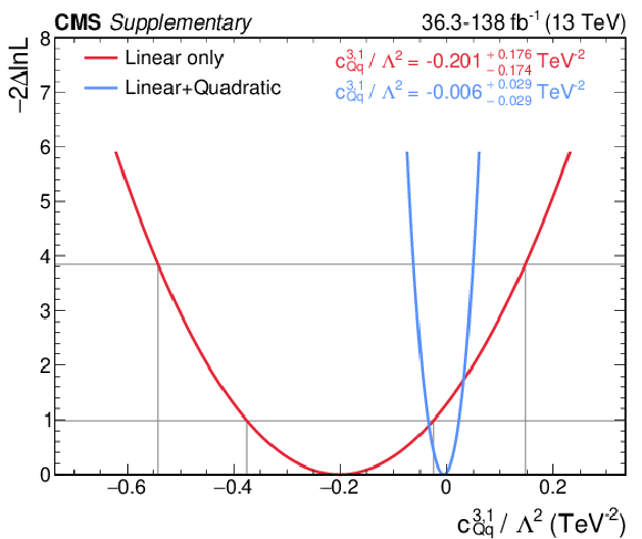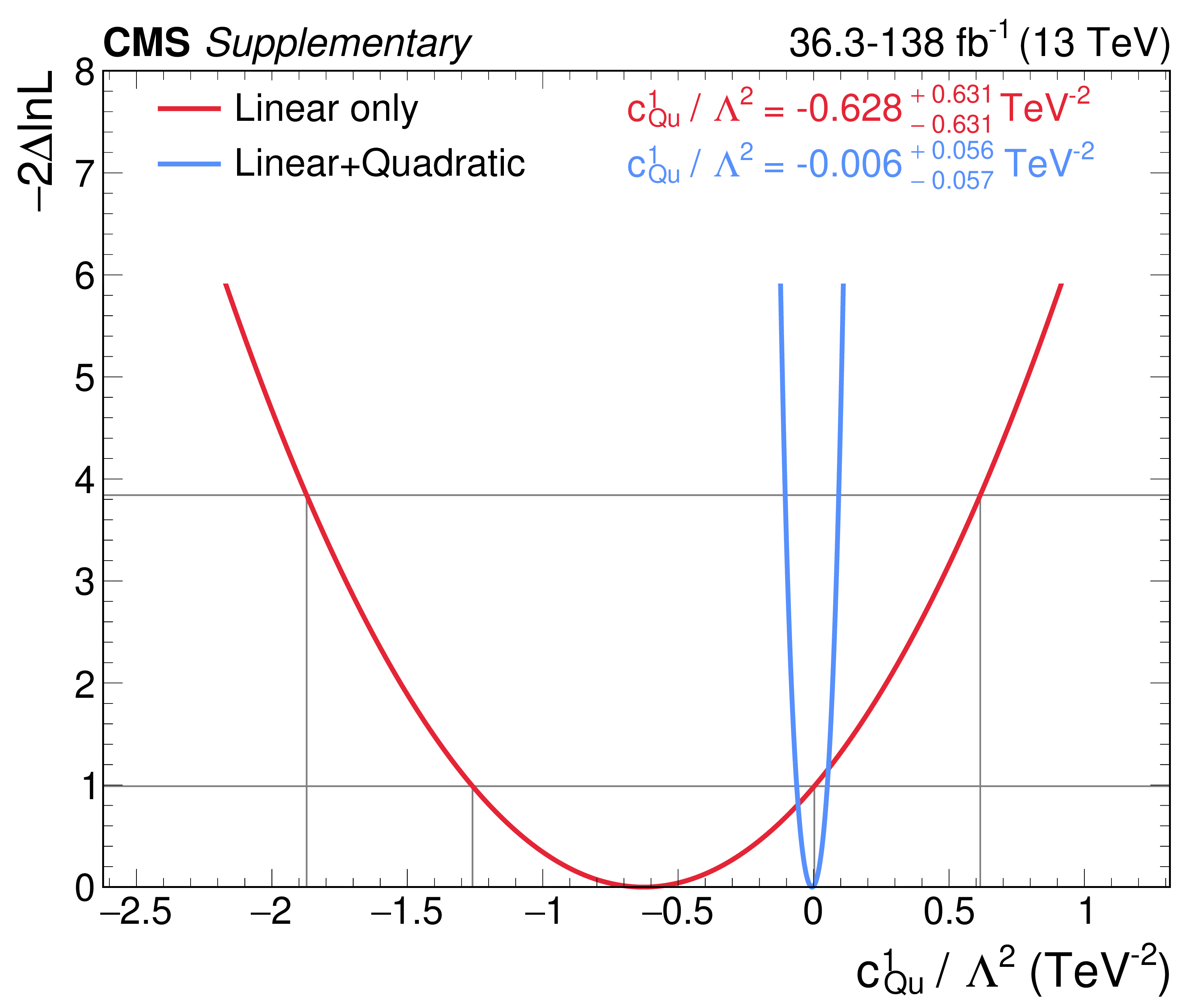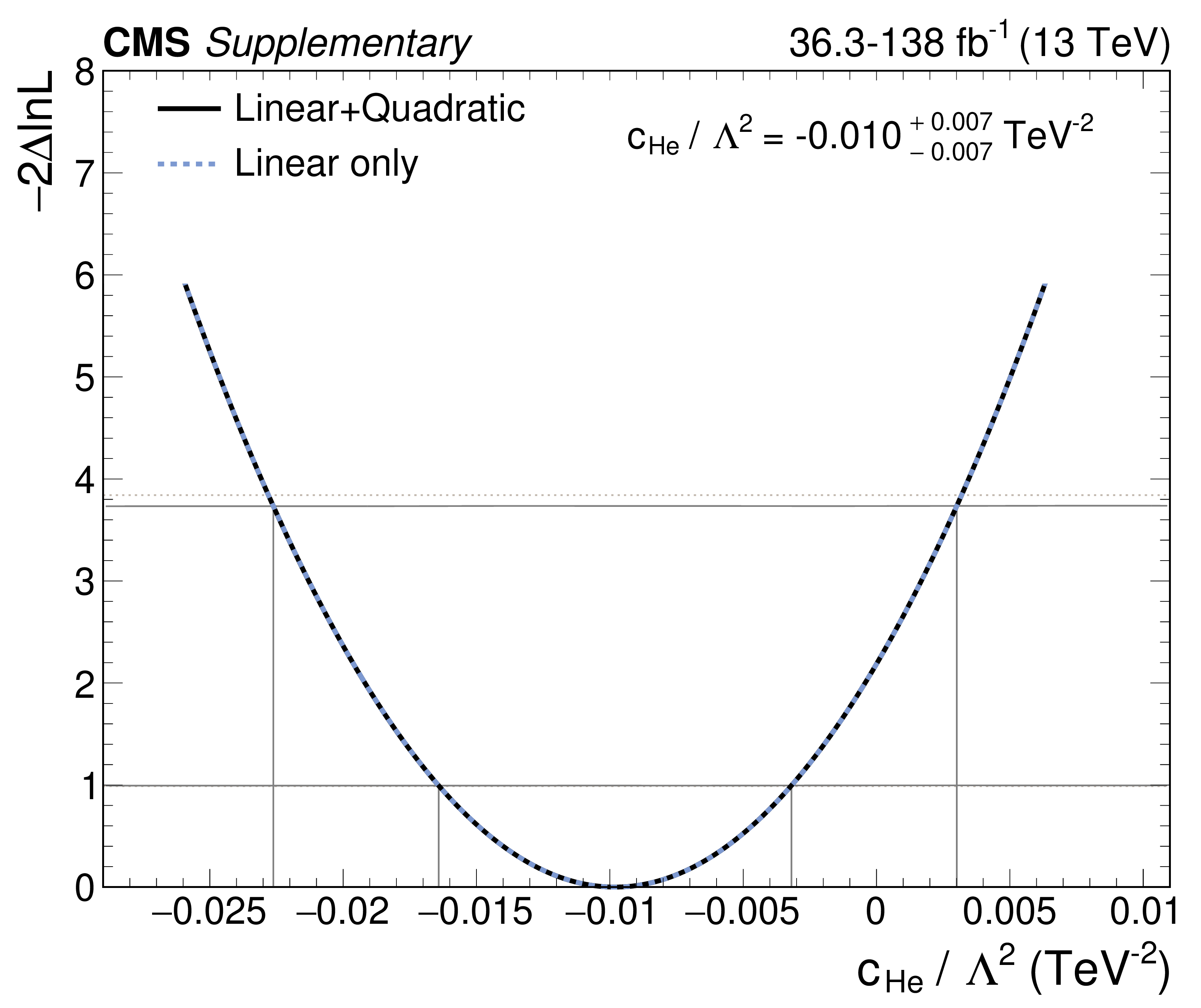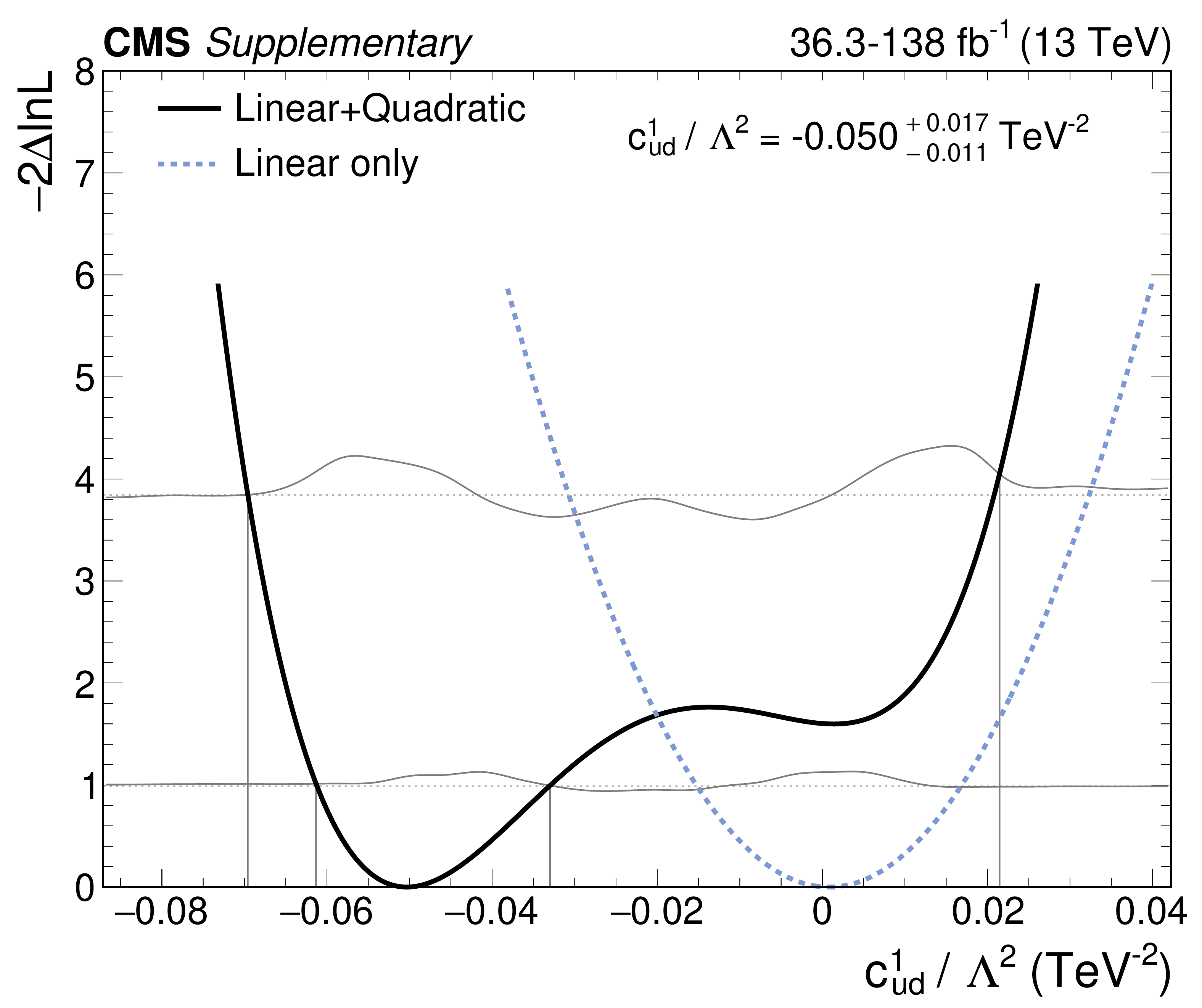 Observed likelihood scans for $ c^{(3)}_{\mathrm{HQ}} $, where linear terms dominate (upper left); $ c_{\mathrm{l}\mathrm{u}} $, where quadratic terms dominate (upper right); and $ c_{\mathrm{W}} $, where quadratic and linear terms both contribute (lower). The results with quadratic terms included in the parameterization (solid black line) and with linear terms only (dashed blue line) are shown. The solid grey lines indicate the sets of points $ q^{68\%} $ (lower line) and $ q^{95\%} $ (upper line), whereas the dashed grey lines denote the test statistic values used to determine the 68% and 95% confidence intervals in the asymptotic approximation. The confidence intervals shown on the figures are the 68% confidence intervals extracted from the intersection of the linear-plus-quadratic curve with the $ q^{68\%} $ line. |