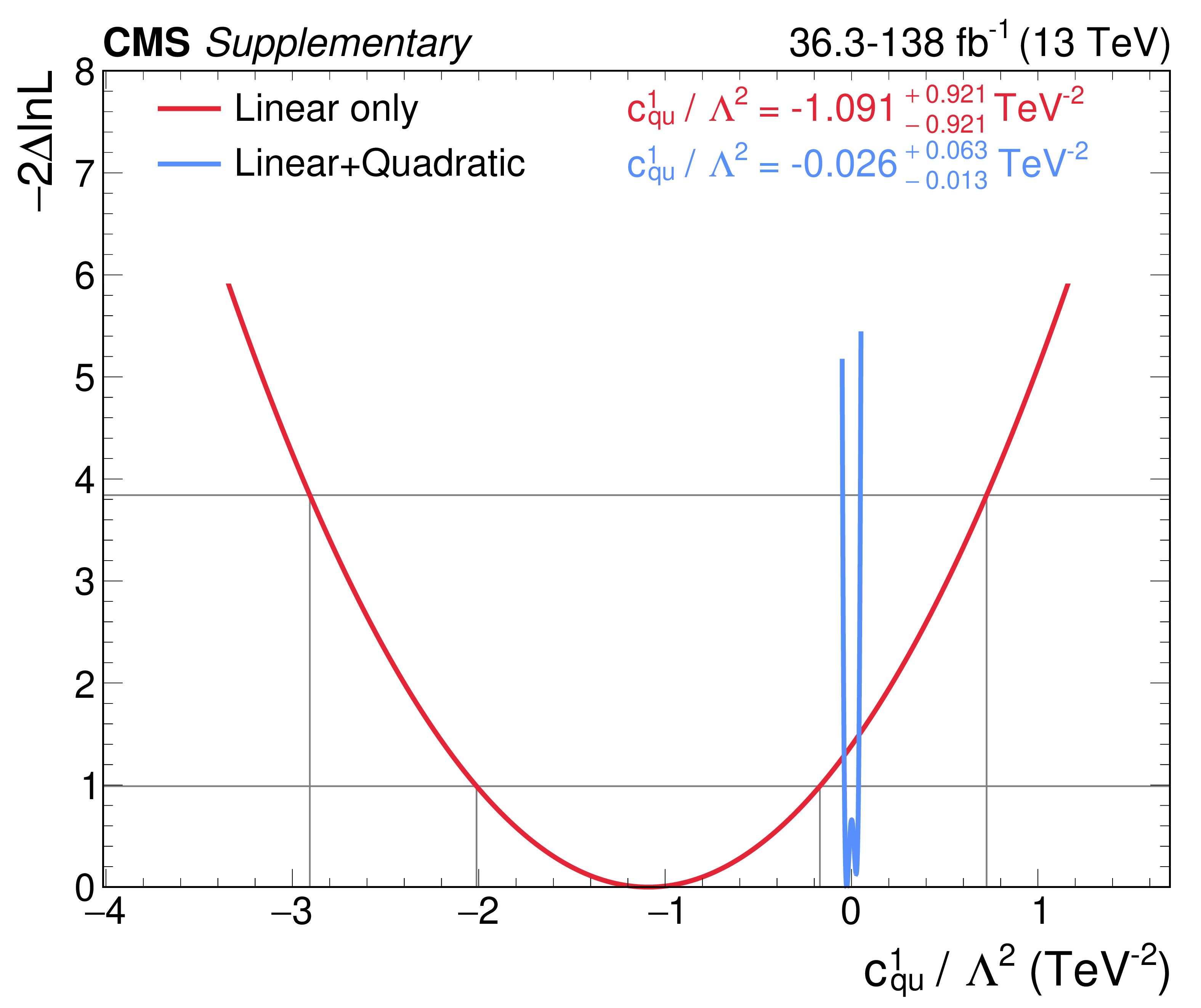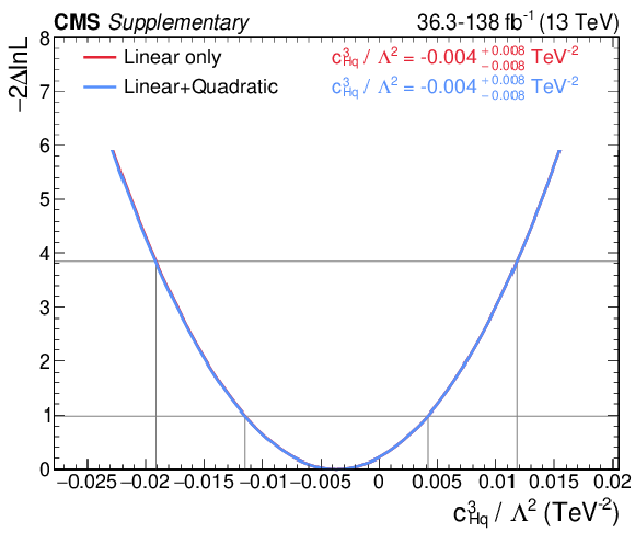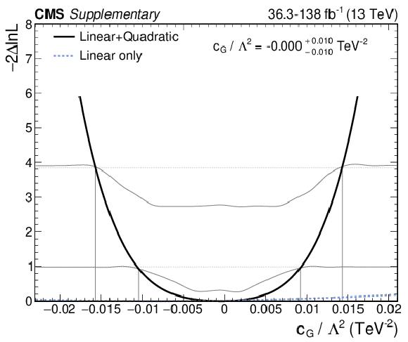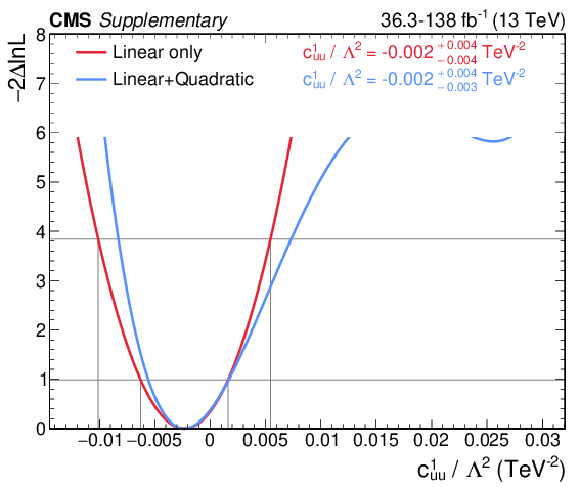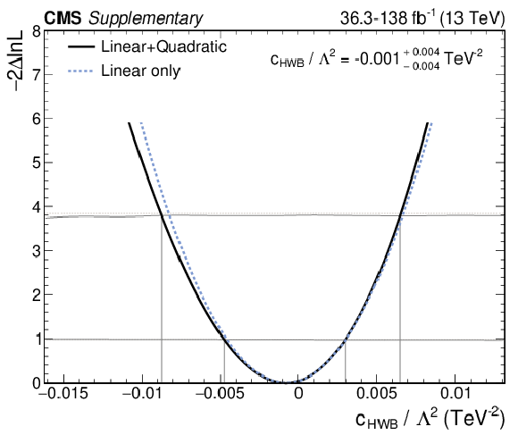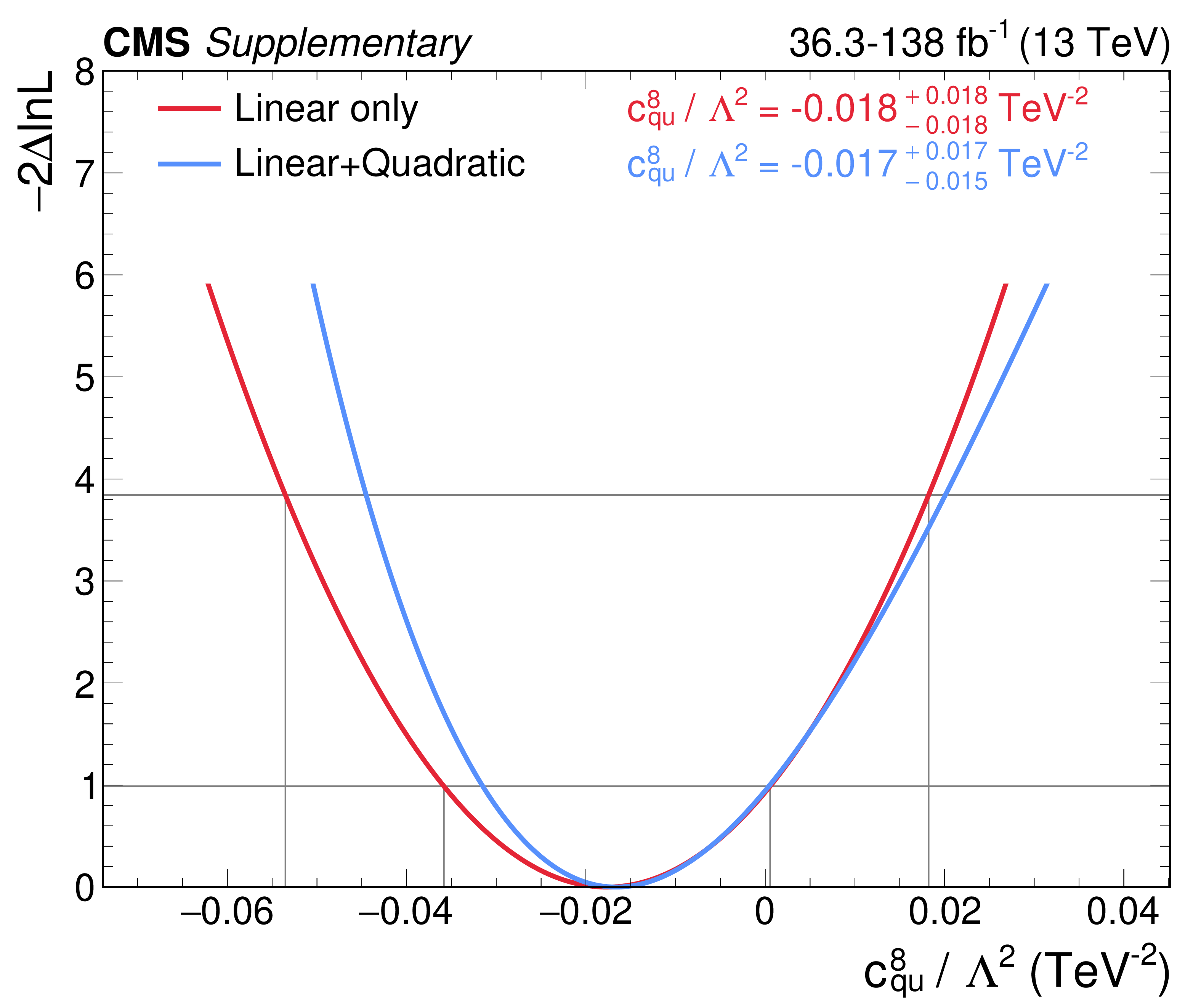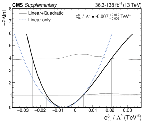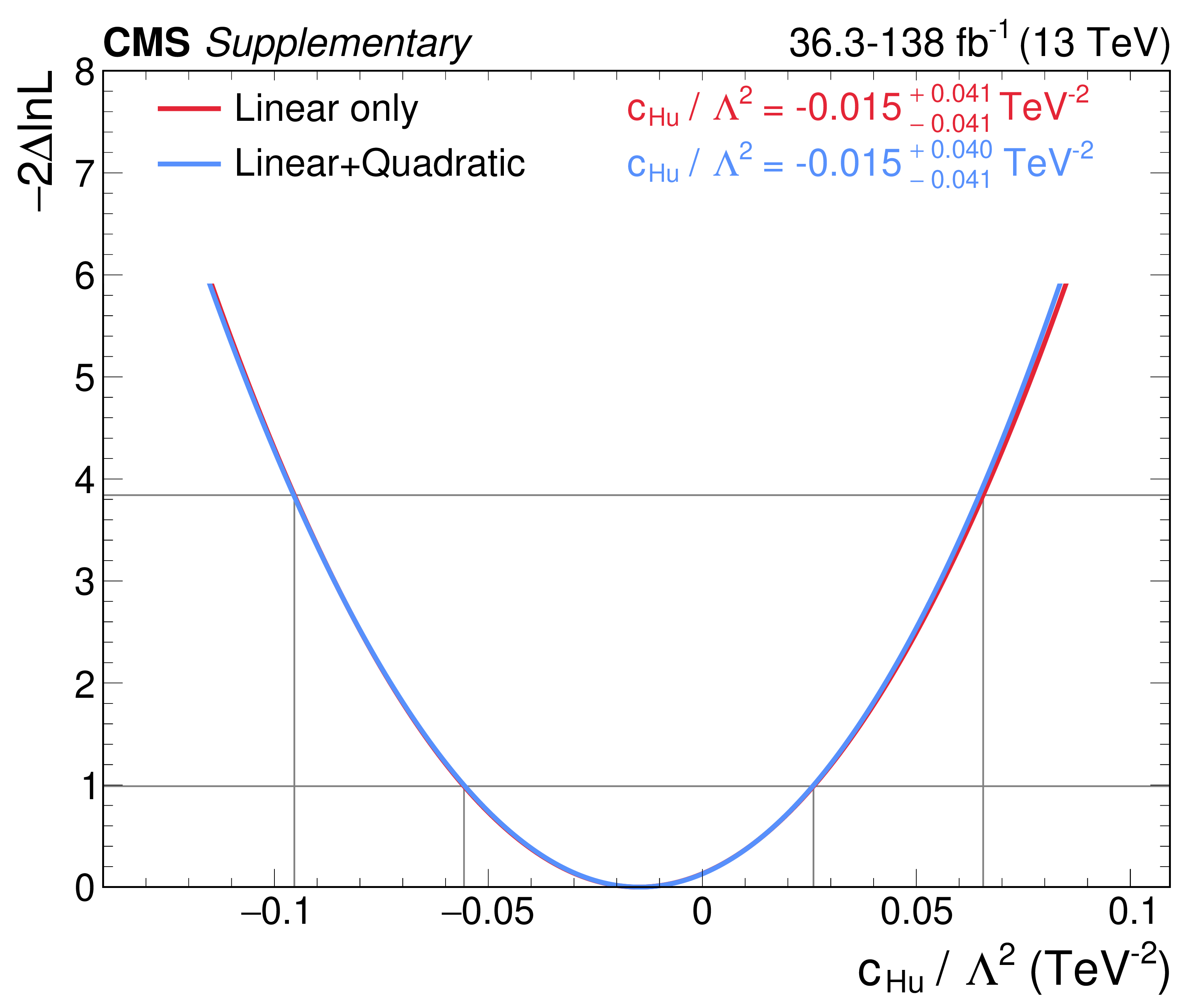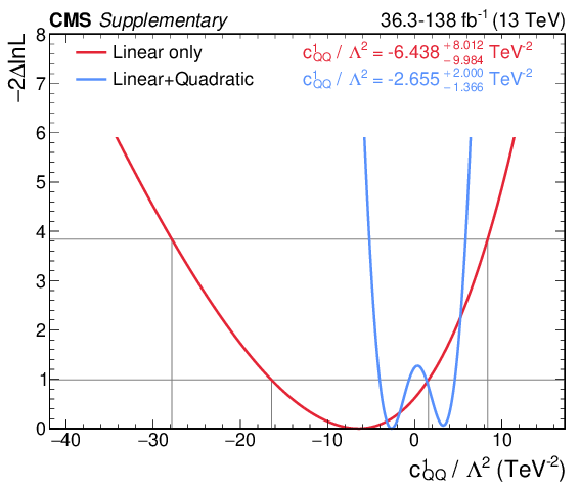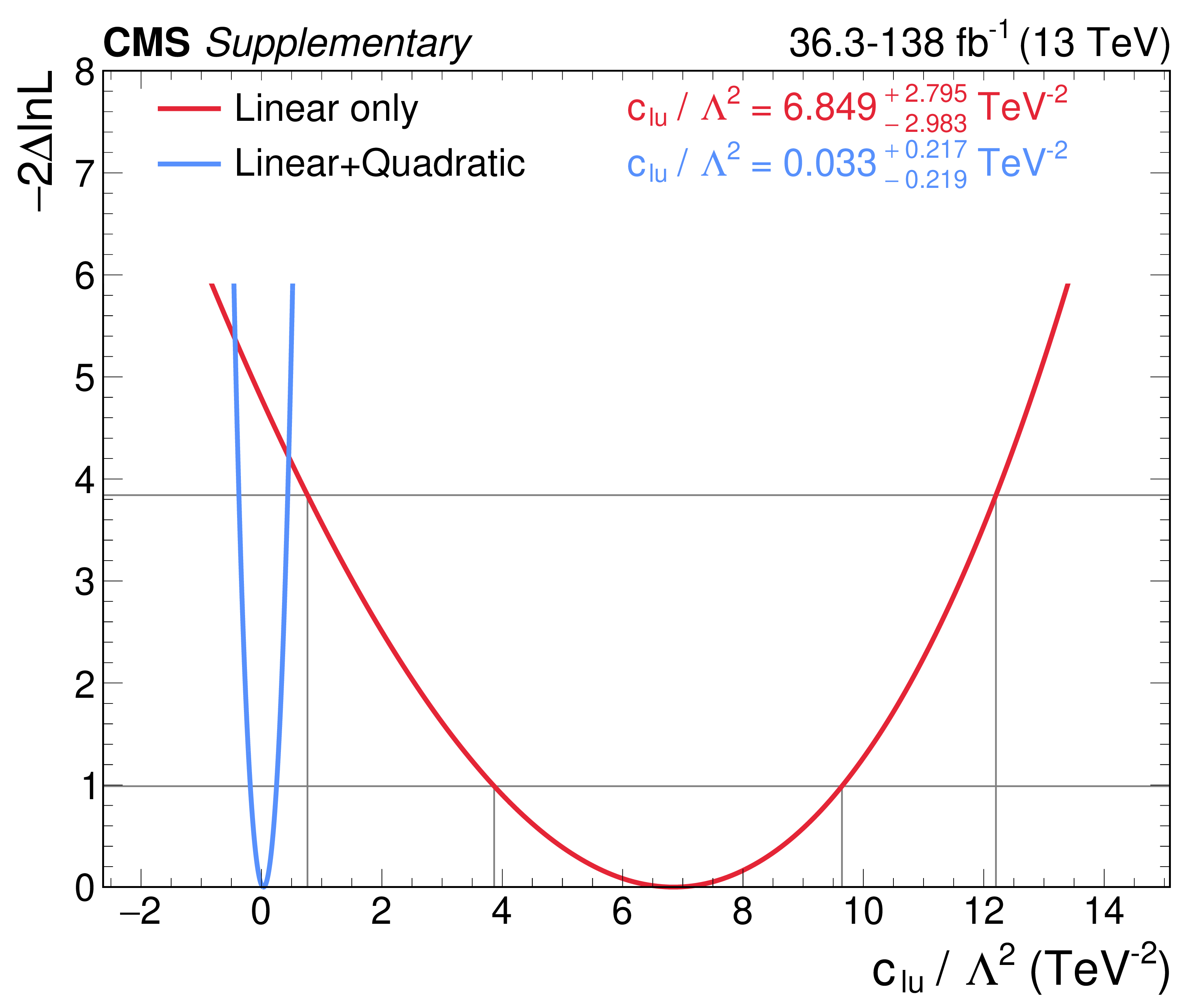 Observed likelihood scans for $ c^{(3)}_{\mathrm{HQ}} $, where linear terms dominate (upper left); $ c_{\mathrm{l}\mathrm{u}} $, where quadratic terms dominate (upper right); and $ c_{\mathrm{W}} $, where quadratic and linear terms both contribute (lower). The results with quadratic terms included in the parameterization (solid black line) and with linear terms only (dashed blue line) are shown. The solid grey lines indicate the sets of points $ q^{68\%} $ (lower line) and $ q^{95\%} $ (upper line), whereas the dashed grey lines denote the test statistic values used to determine the 68% and 95% confidence intervals in the asymptotic approximation. The confidence intervals shown on the figures are the 68% confidence intervals extracted from the intersection of the linear-plus-quadratic curve with the $ q^{68\%} $ line. |