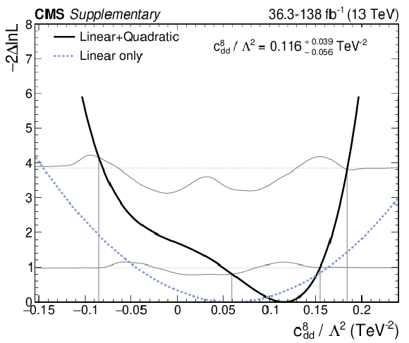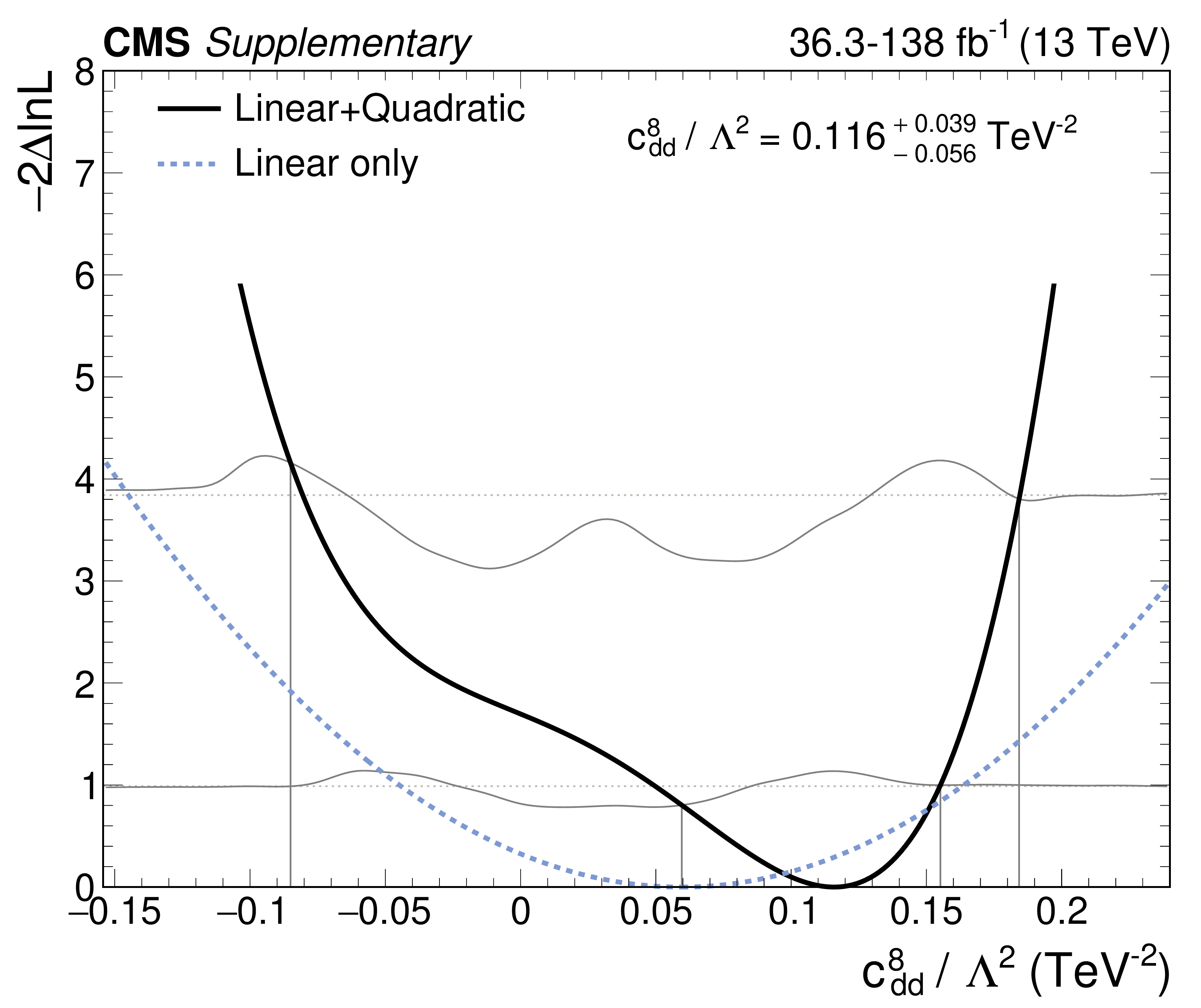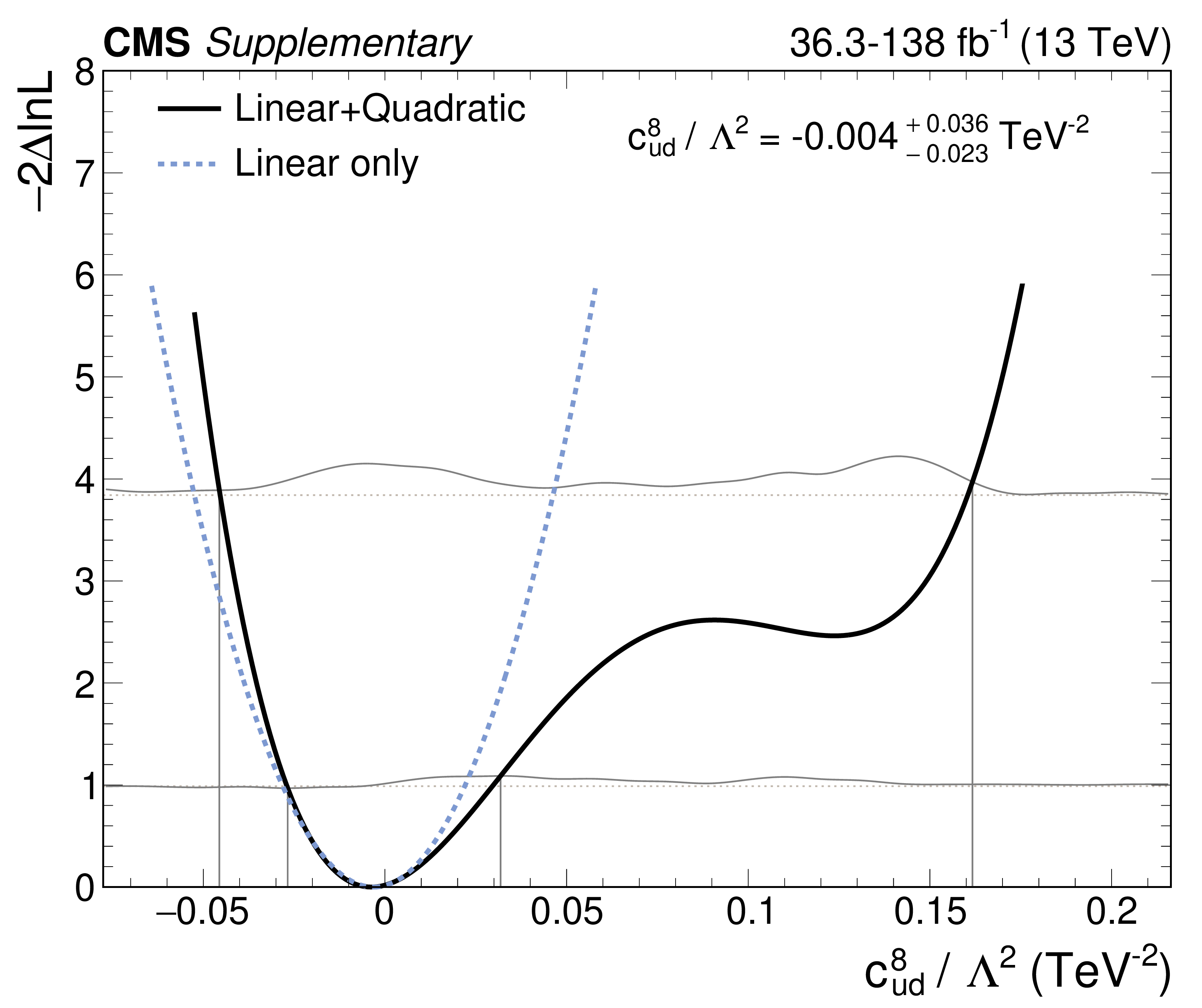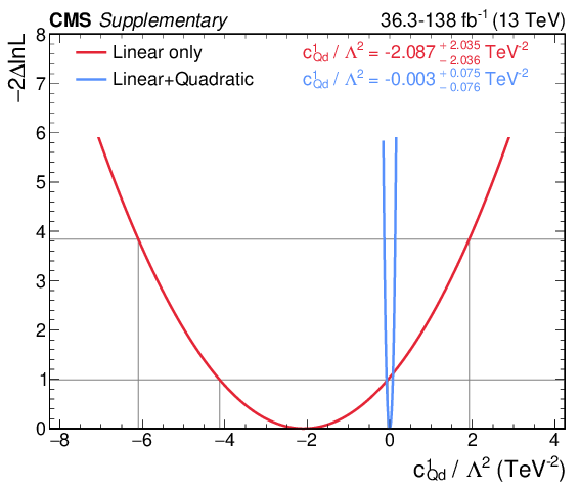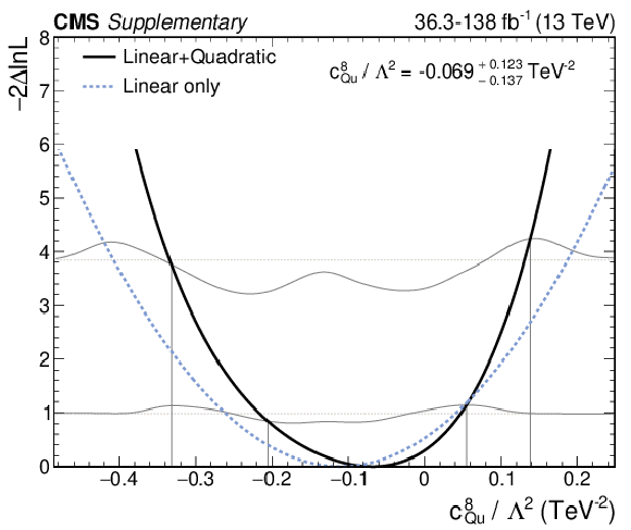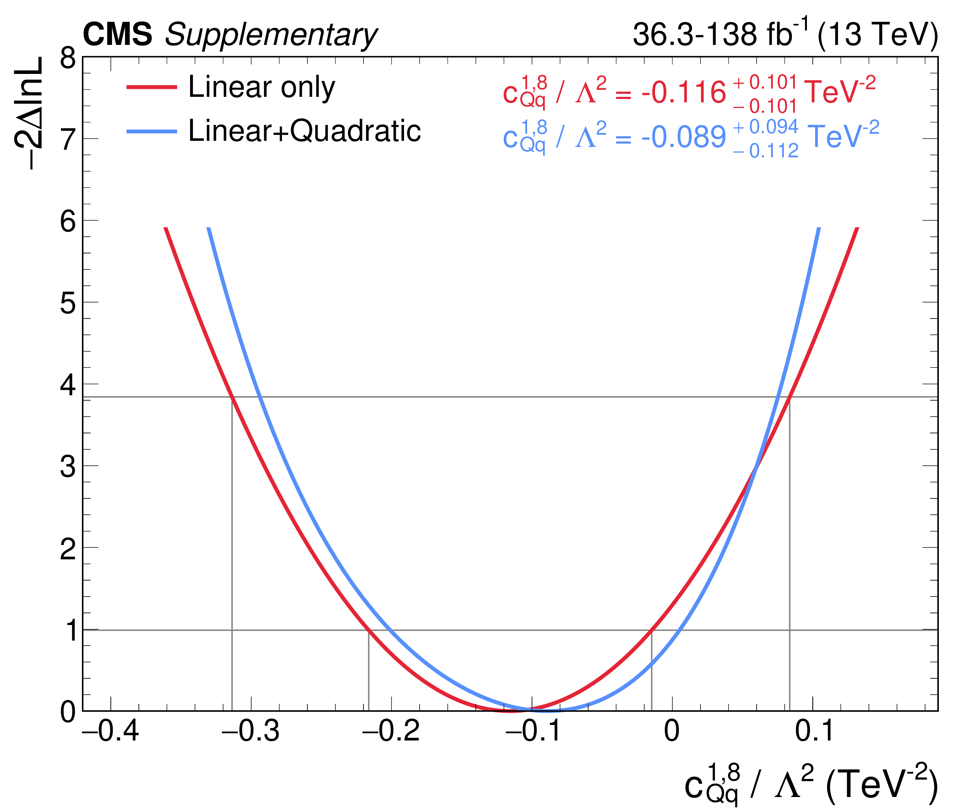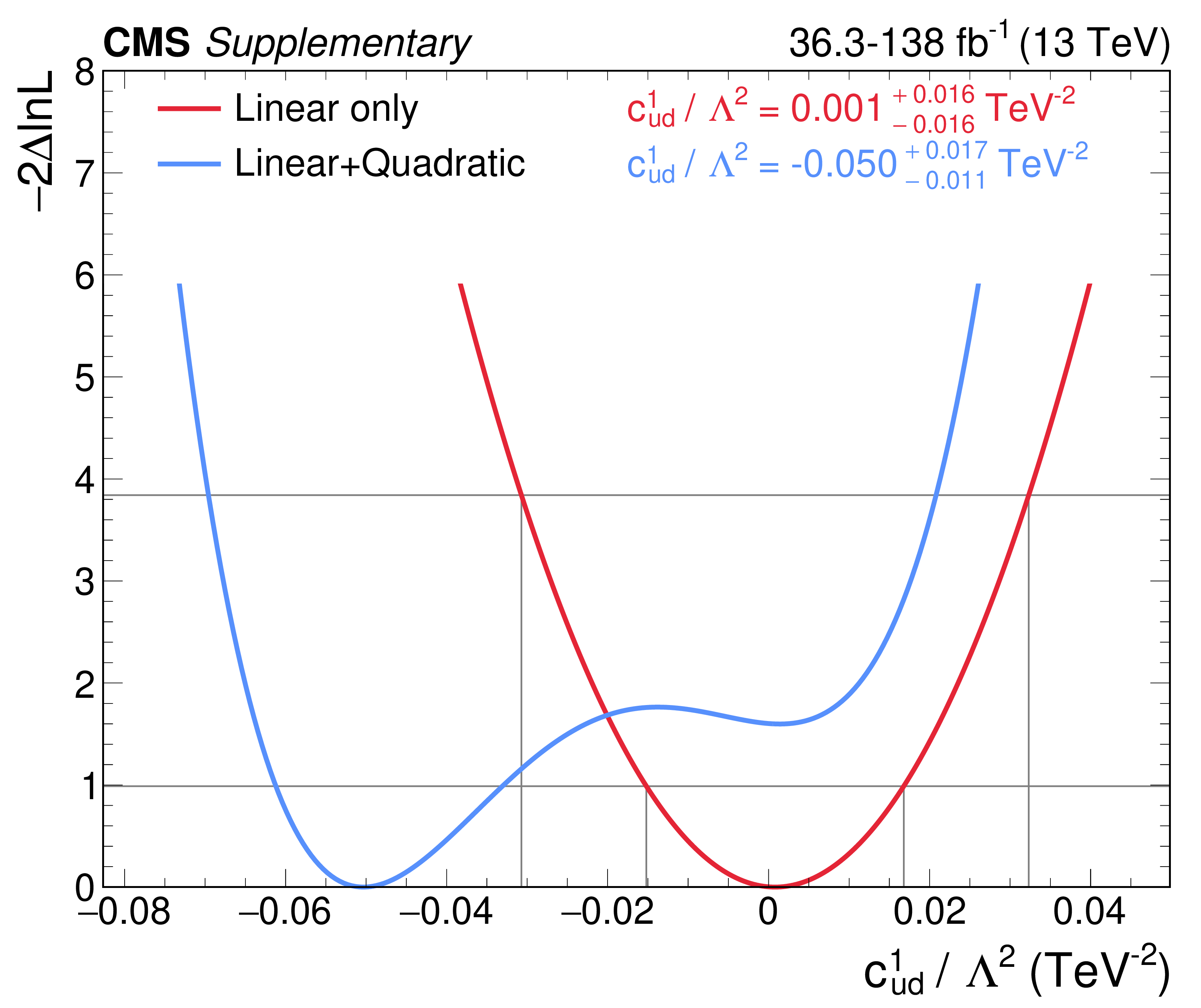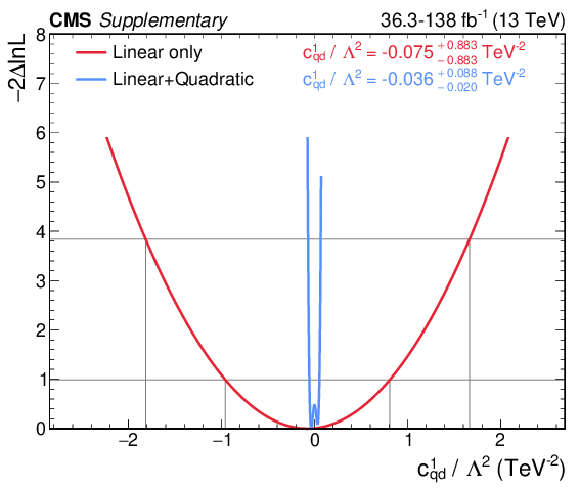 Observed likelihood scans for $ c^{(3)}_{\mathrm{HQ}} $, where linear terms dominate (upper left); $ c_{\mathrm{l}\mathrm{u}} $, where quadratic terms dominate (upper right); and $ c_{\mathrm{W}} $, where quadratic and linear terms both contribute (lower). The results with quadratic terms included in the parameterization (solid black line) and with linear terms only (dashed blue line) are shown. The solid grey lines indicate the sets of points $ q^{68\%} $ (lower line) and $ q^{95\%} $ (upper line), whereas the dashed grey lines denote the test statistic values used to determine the 68% and 95% confidence intervals in the asymptotic approximation. The confidence intervals shown on the figures are the 68% confidence intervals extracted from the intersection of the linear-plus-quadratic curve with the $ q^{68\%} $ line. |