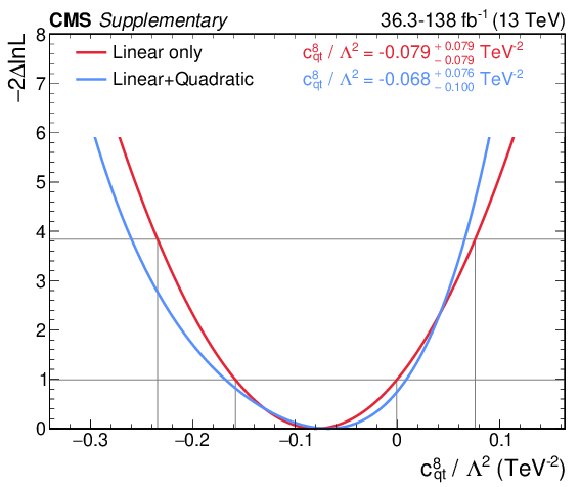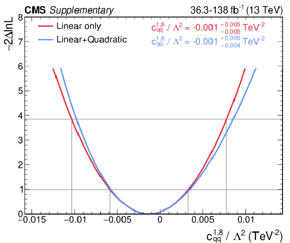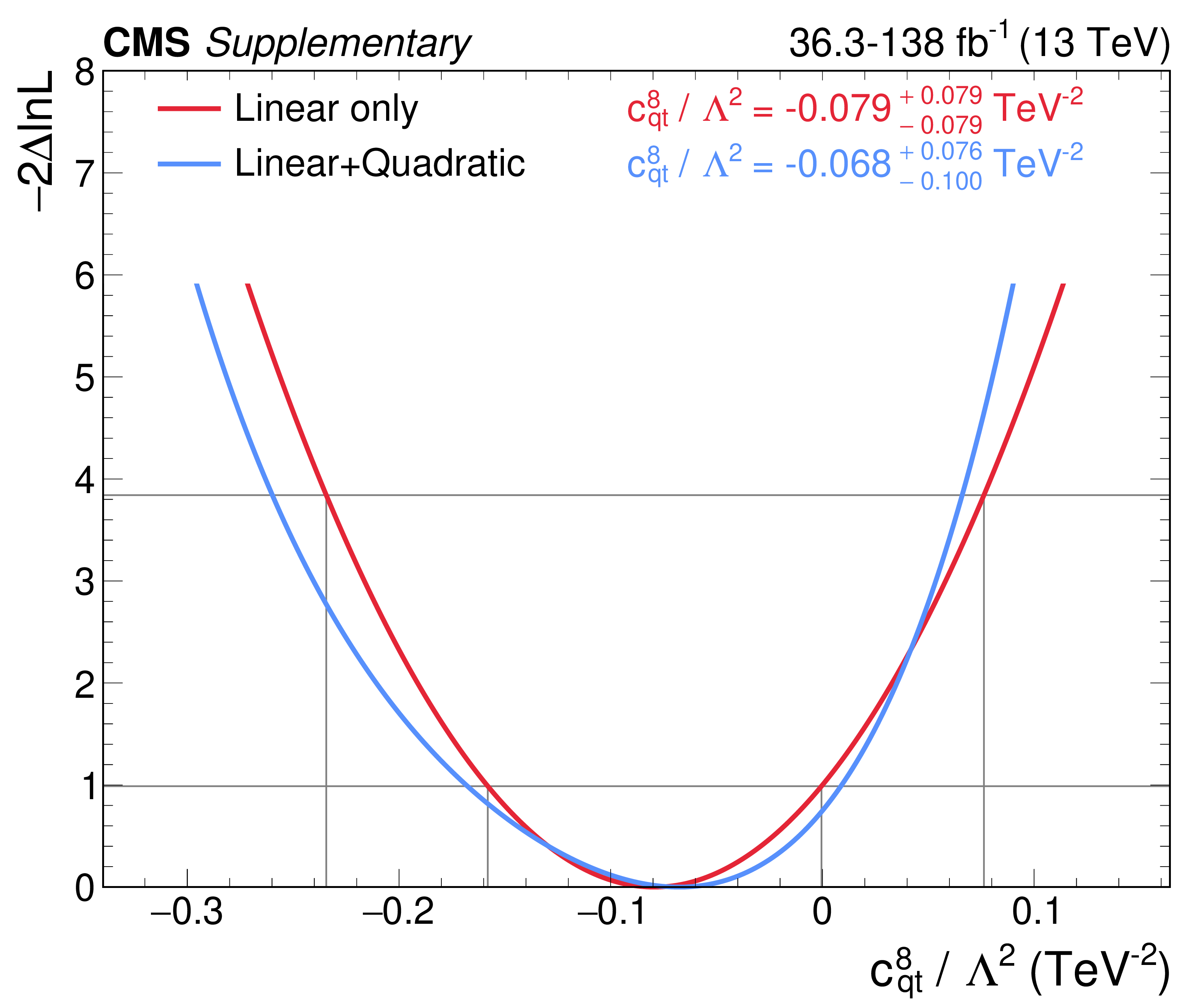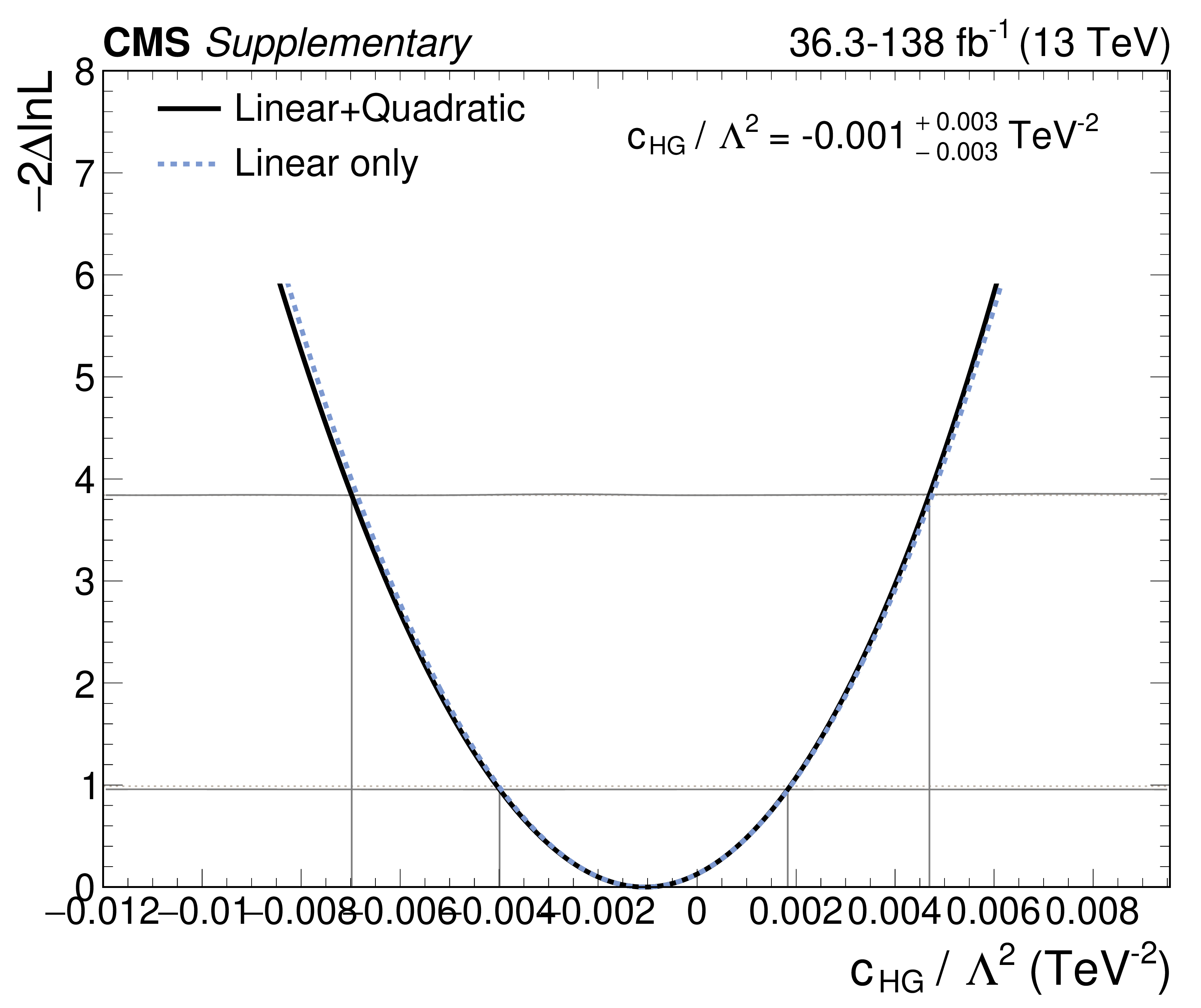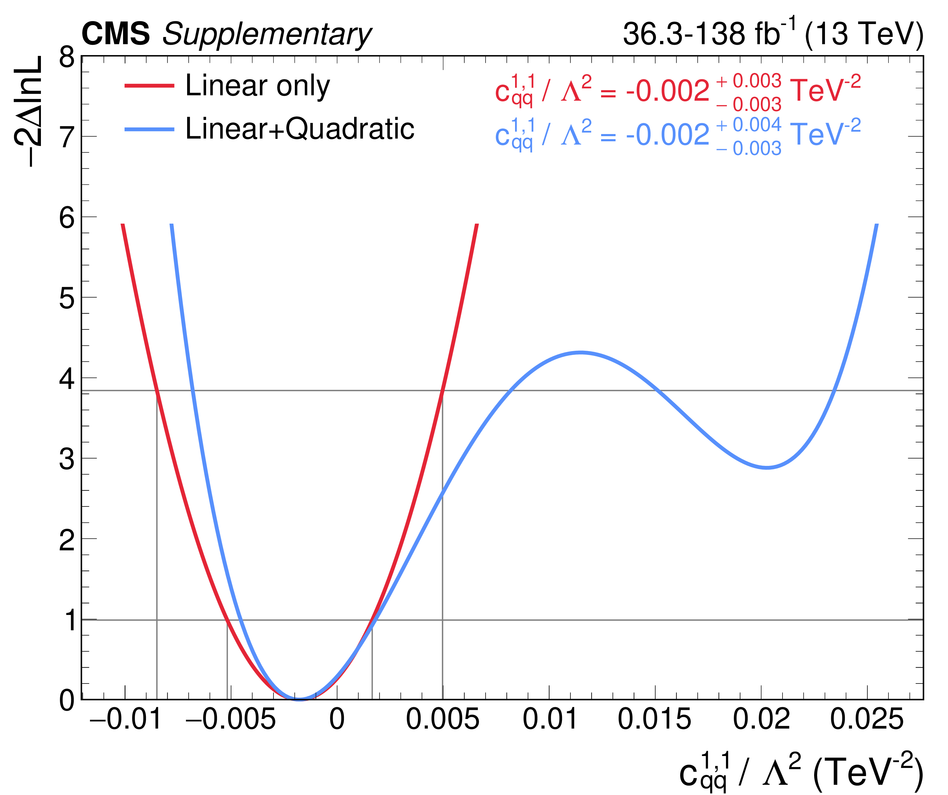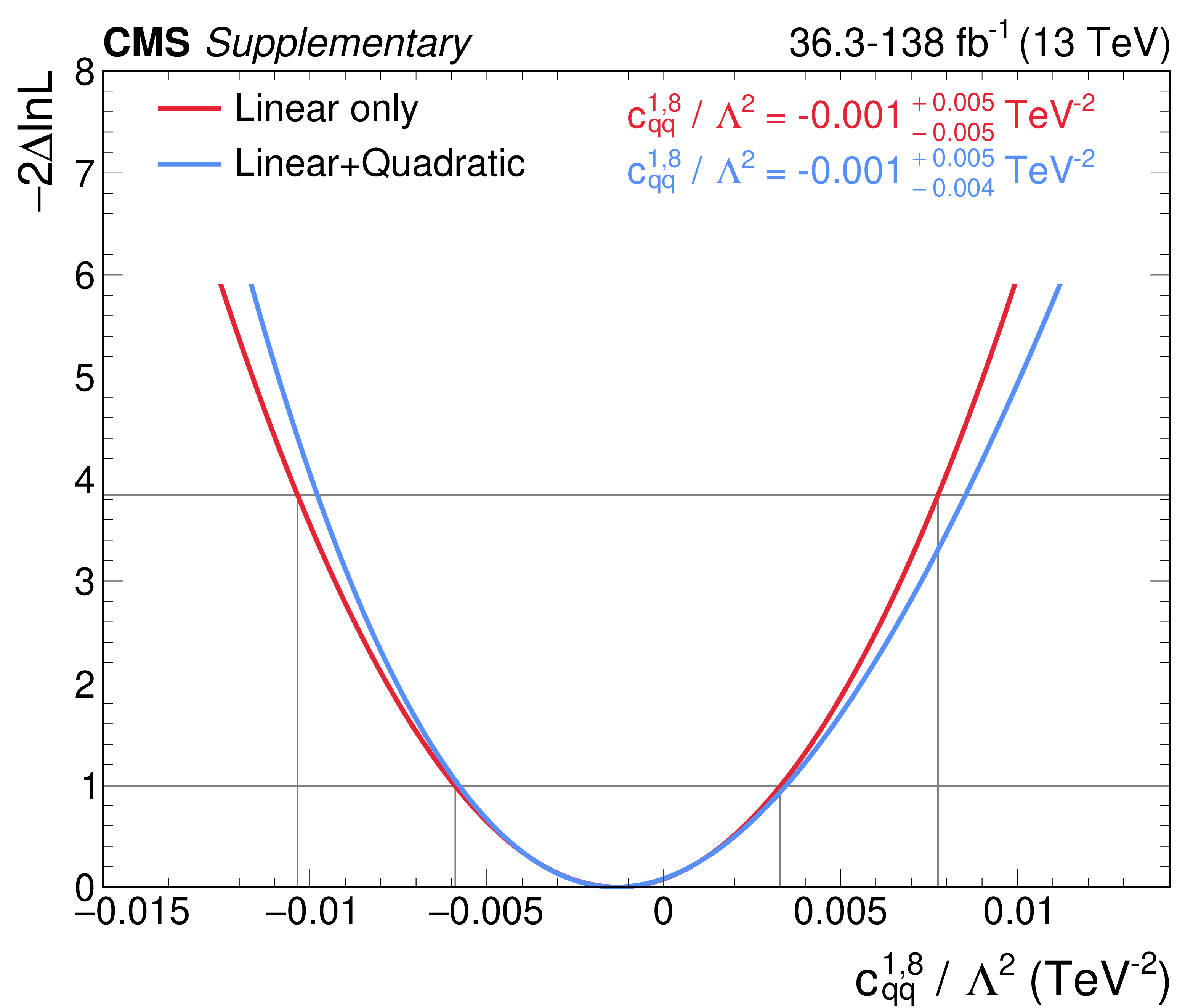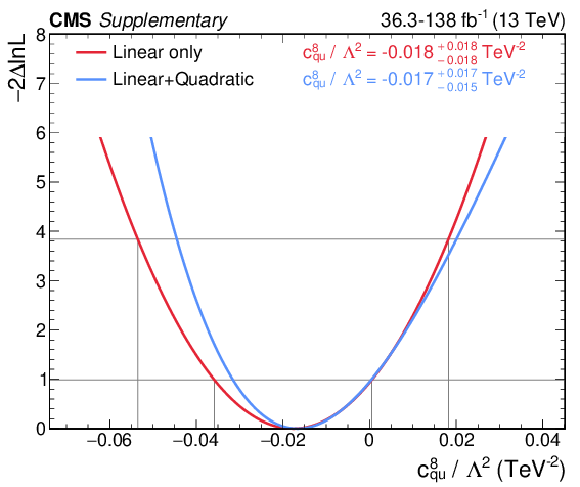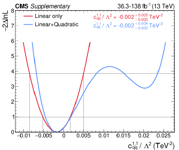 Observed likelihood scans for $ c^{(3)}_{\mathrm{HQ}} $, where linear terms dominate (upper left); $ c_{\mathrm{l}\mathrm{u}} $, where quadratic terms dominate (upper right); and $ c_{\mathrm{W}} $, where quadratic and linear terms both contribute (lower). The results with quadratic terms included in the parameterization (solid black line) and with linear terms only (dashed blue line) are shown. The solid grey lines indicate the sets of points $ q^{68\%} $ (lower line) and $ q^{95\%} $ (upper line), whereas the dashed grey lines denote the test statistic values used to determine the 68% and 95% confidence intervals in the asymptotic approximation. The confidence intervals shown on the figures are the 68% confidence intervals extracted from the intersection of the linear-plus-quadratic curve with the $ q^{68\%} $ line. |