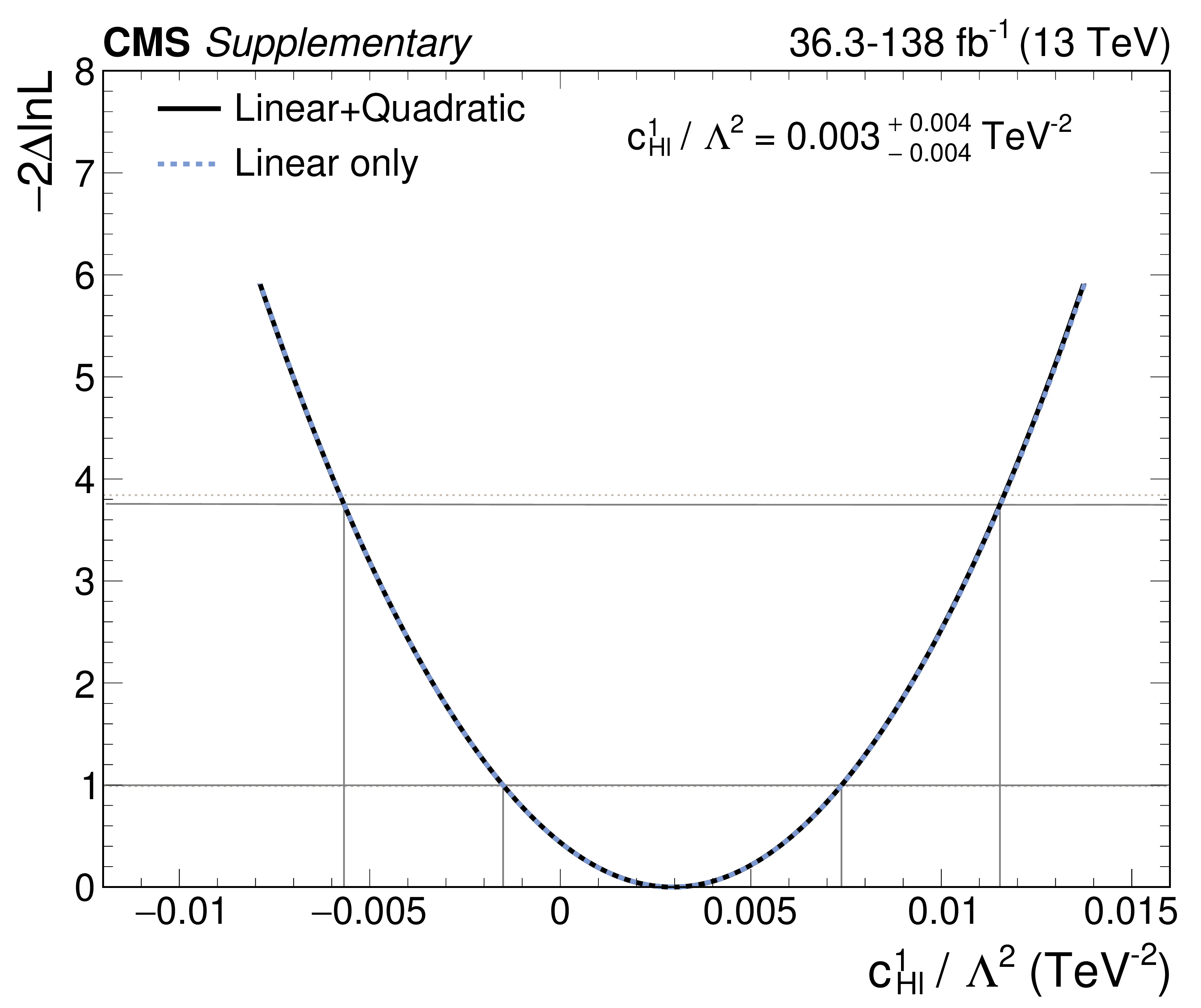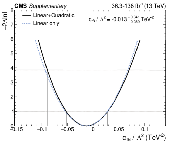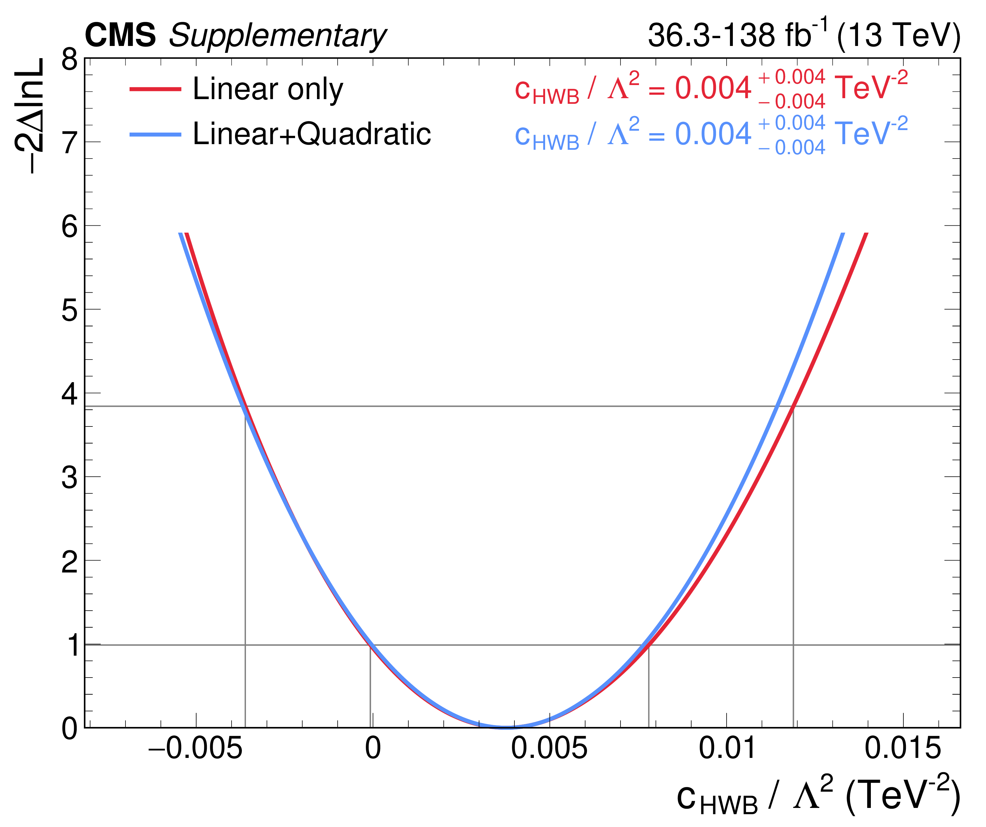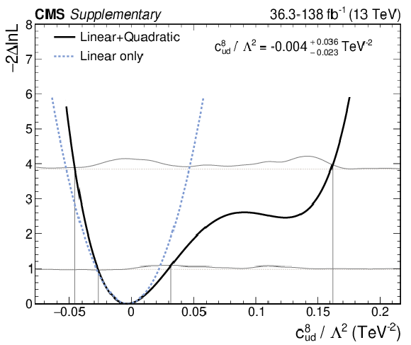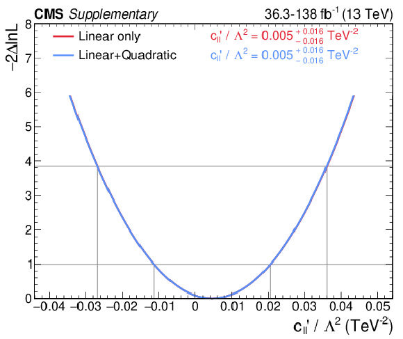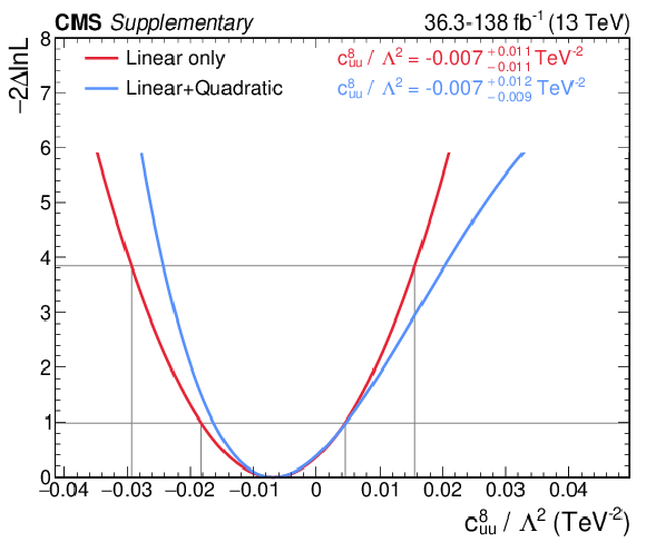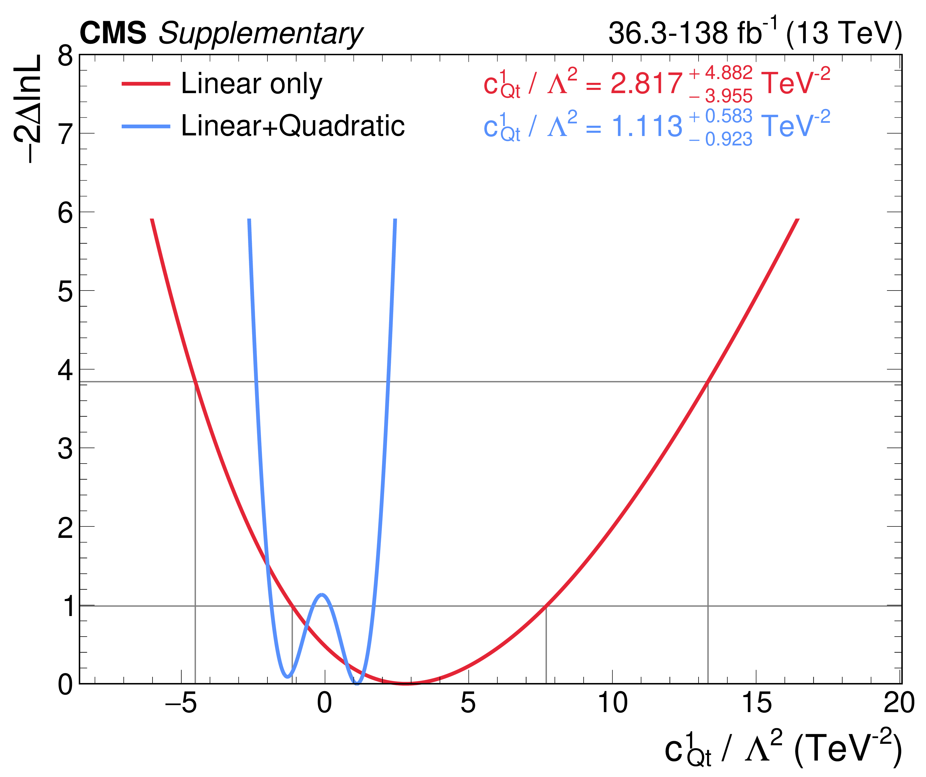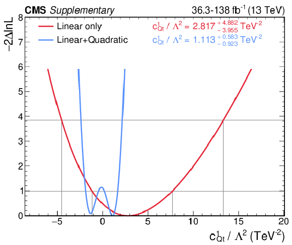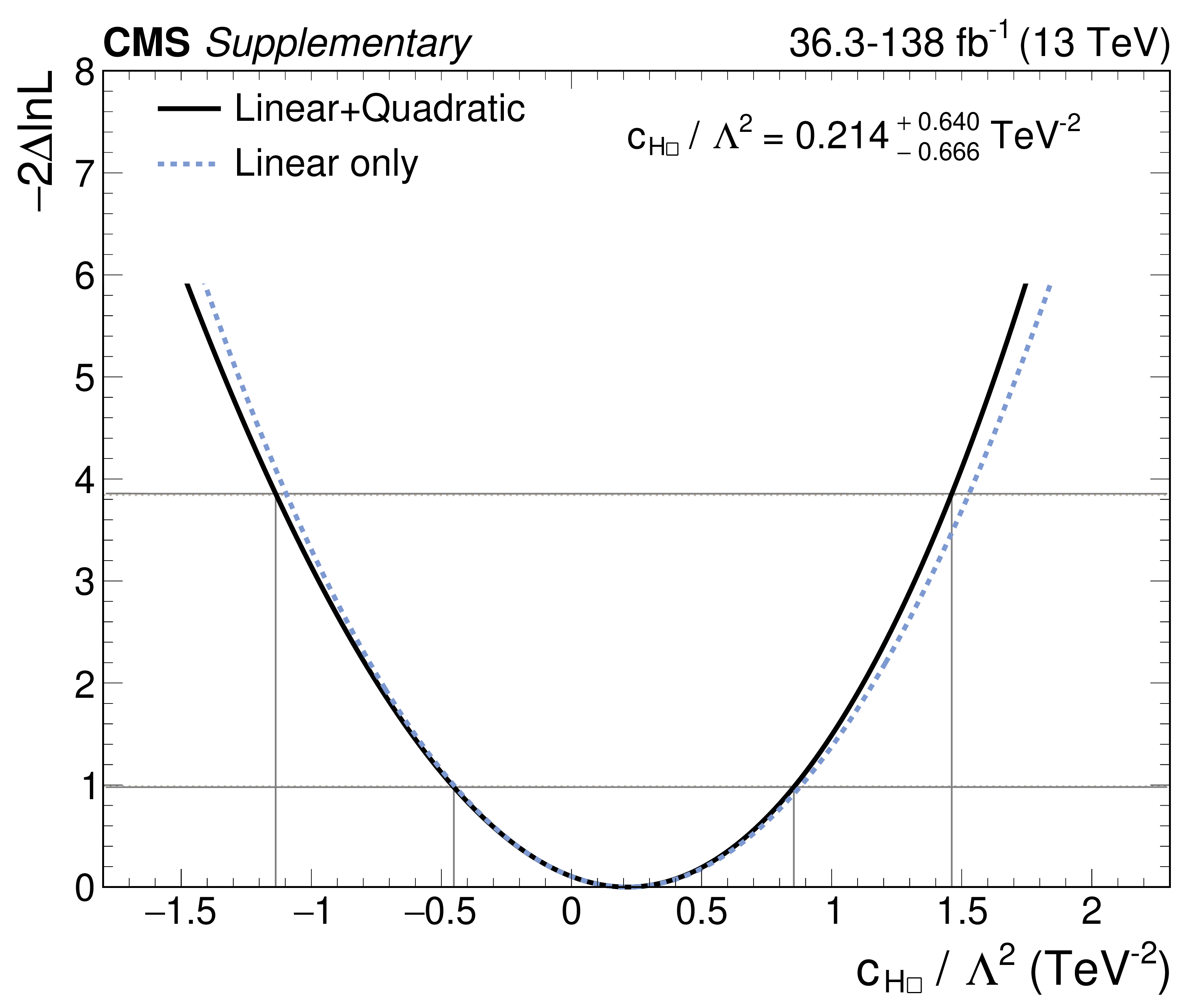 Observed likelihood scans for $ c^{(3)}_{\mathrm{HQ}} $, where linear terms dominate (upper left); $ c_{\mathrm{l}\mathrm{u}} $, where quadratic terms dominate (upper right); and $ c_{\mathrm{W}} $, where quadratic and linear terms both contribute (lower). The results with quadratic terms included in the parameterization (solid black line) and with linear terms only (dashed blue line) are shown. The solid grey lines indicate the sets of points $ q^{68\%} $ (lower line) and $ q^{95\%} $ (upper line), whereas the dashed grey lines denote the test statistic values used to determine the 68% and 95% confidence intervals in the asymptotic approximation. The confidence intervals shown on the figures are the 68% confidence intervals extracted from the intersection of the linear-plus-quadratic curve with the $ q^{68\%} $ line. |