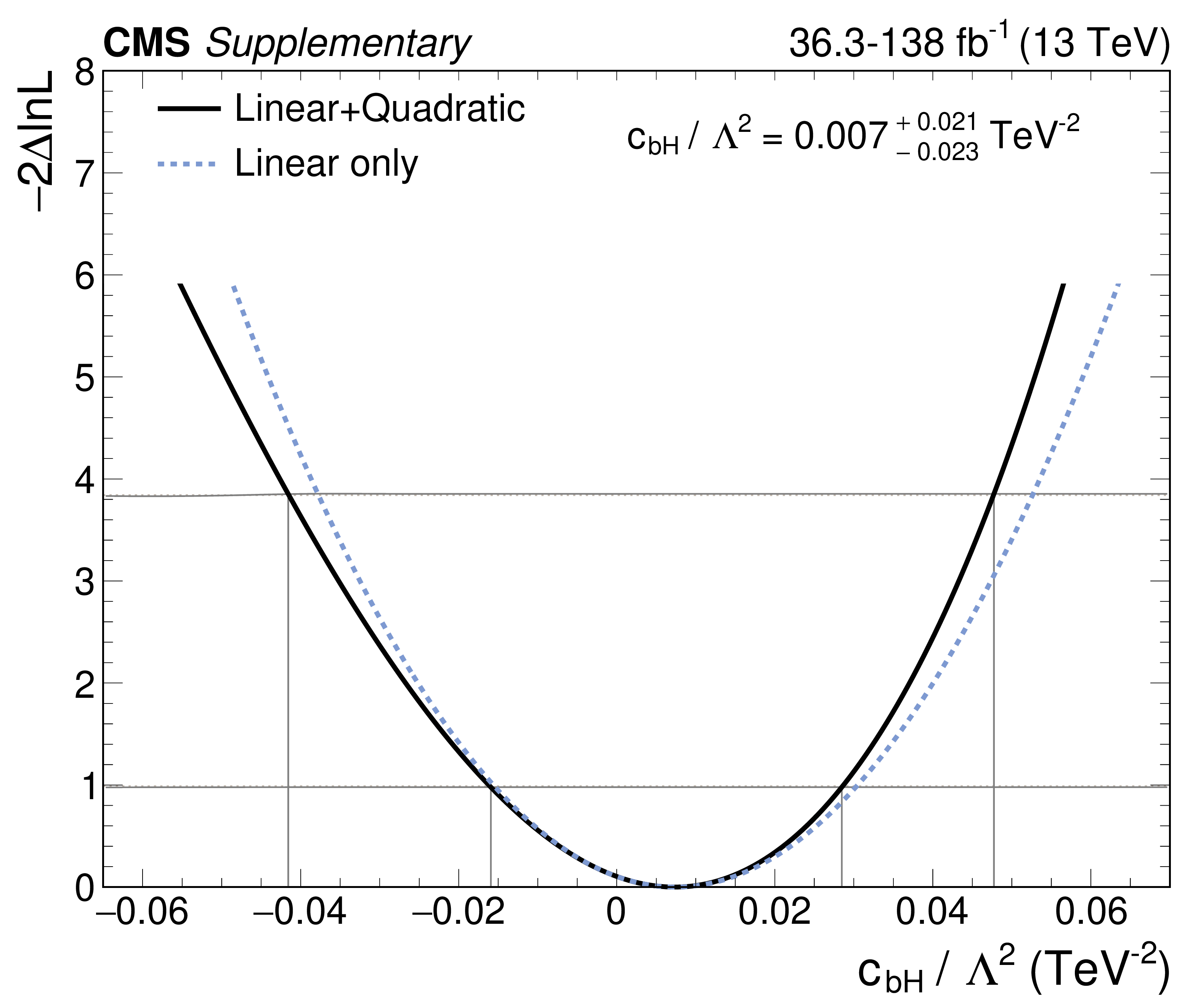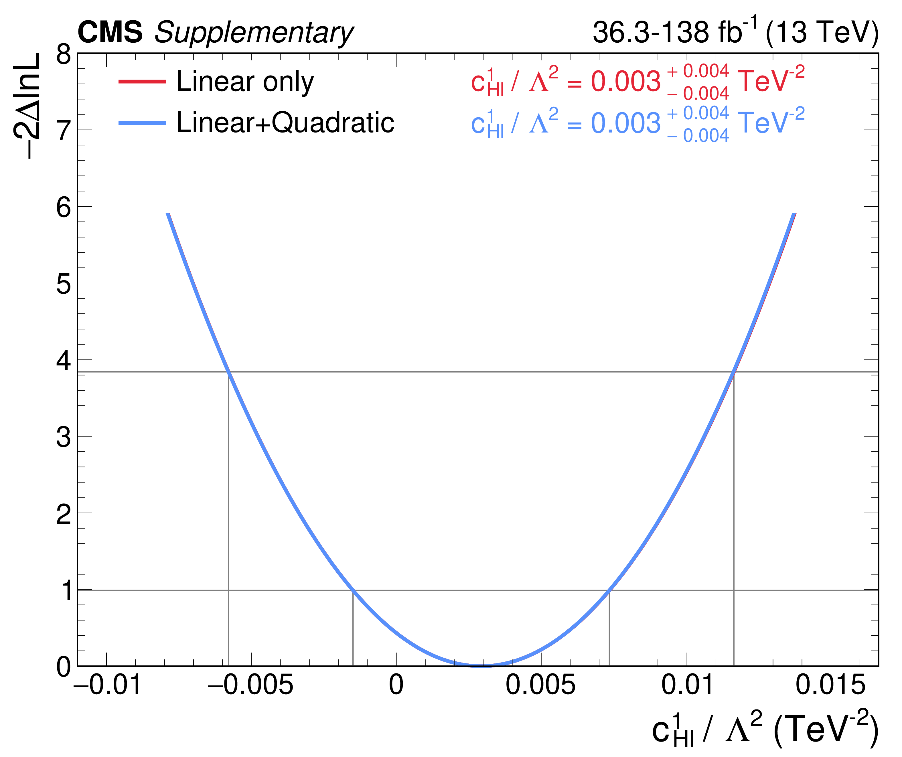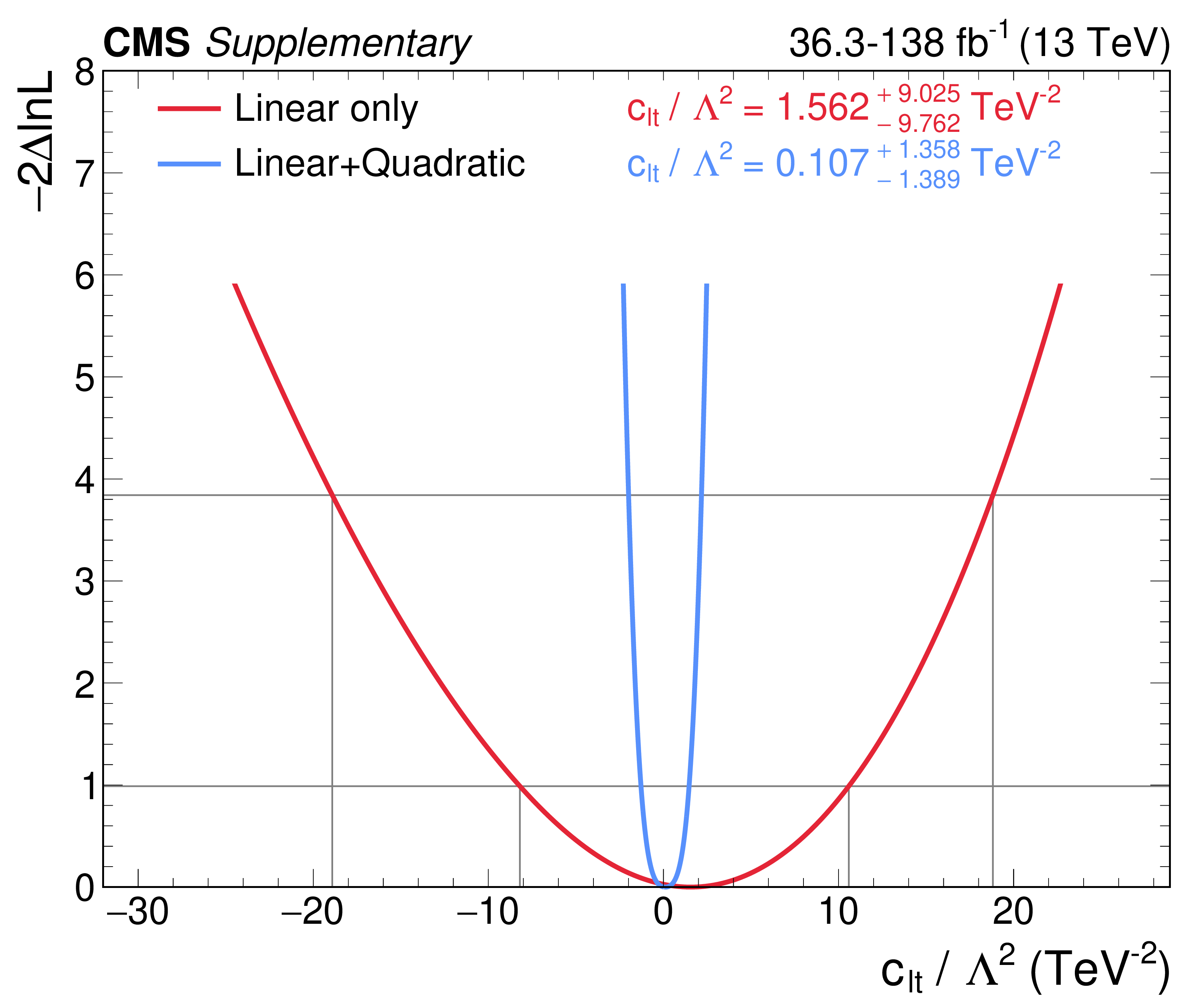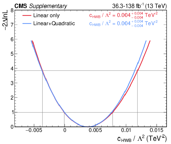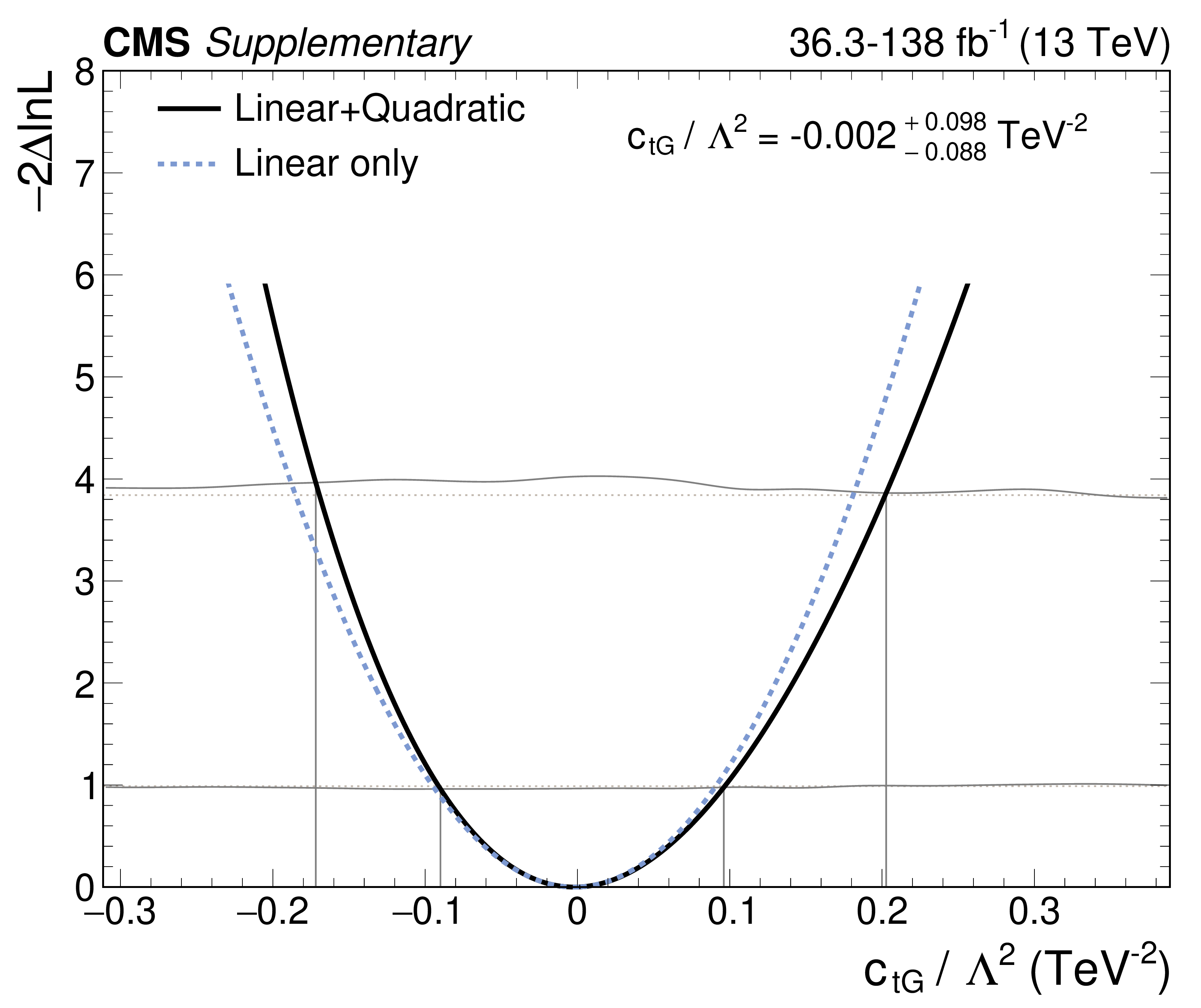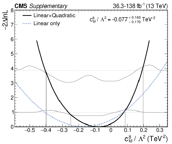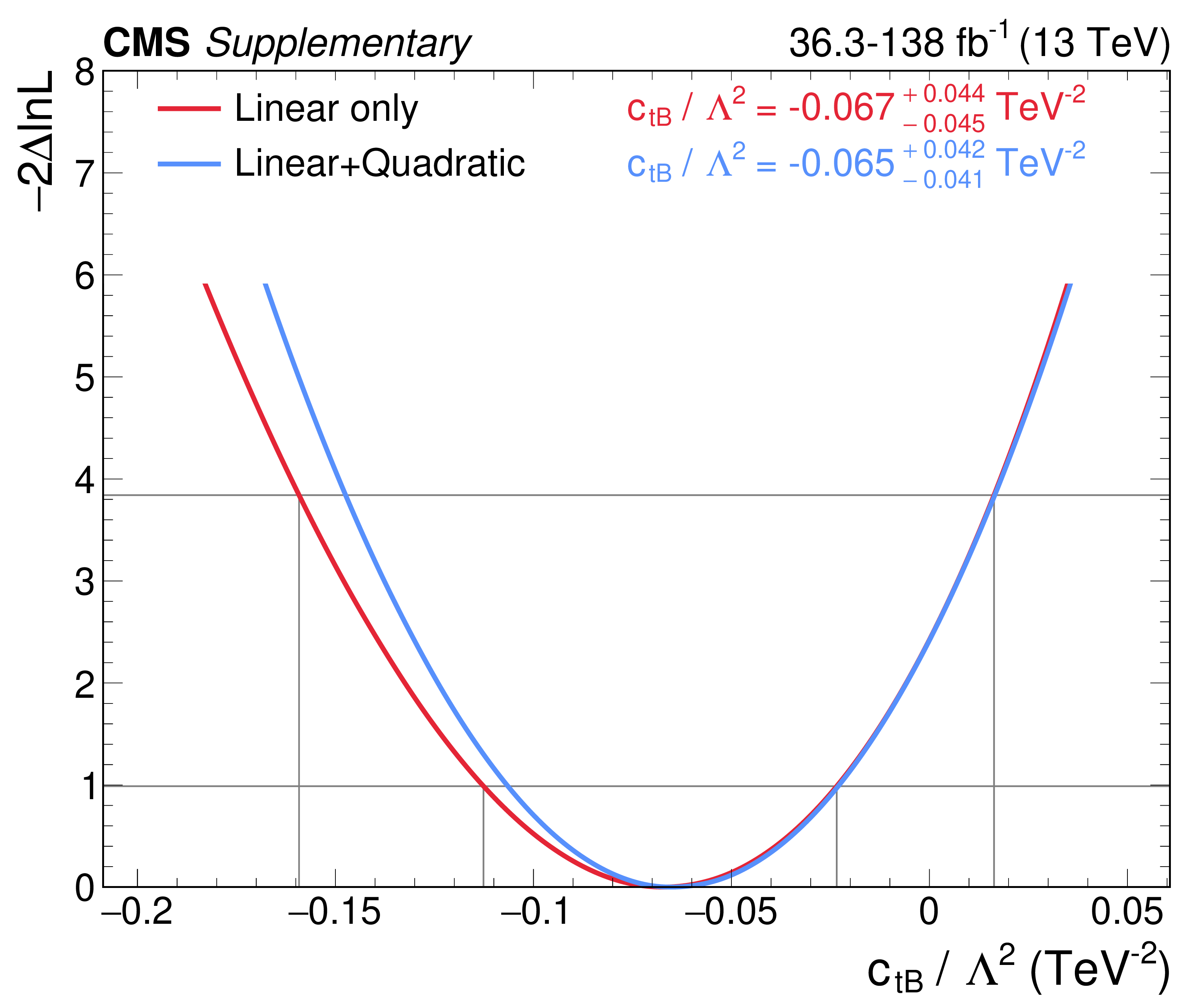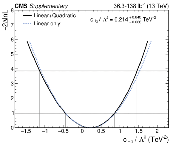 Observed likelihood scans for $ c^{(3)}_{\mathrm{HQ}} $, where linear terms dominate (upper left); $ c_{\mathrm{l}\mathrm{u}} $, where quadratic terms dominate (upper right); and $ c_{\mathrm{W}} $, where quadratic and linear terms both contribute (lower). The results with quadratic terms included in the parameterization (solid black line) and with linear terms only (dashed blue line) are shown. The solid grey lines indicate the sets of points $ q^{68\%} $ (lower line) and $ q^{95\%} $ (upper line), whereas the dashed grey lines denote the test statistic values used to determine the 68% and 95% confidence intervals in the asymptotic approximation. The confidence intervals shown on the figures are the 68% confidence intervals extracted from the intersection of the linear-plus-quadratic curve with the $ q^{68\%} $ line. |