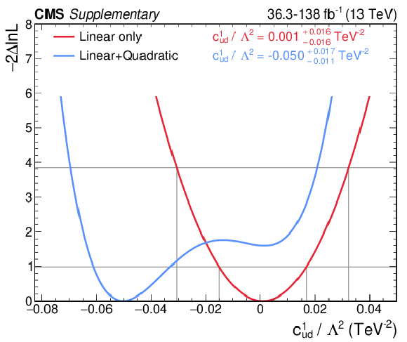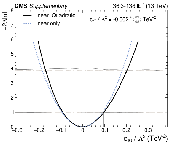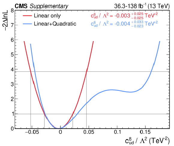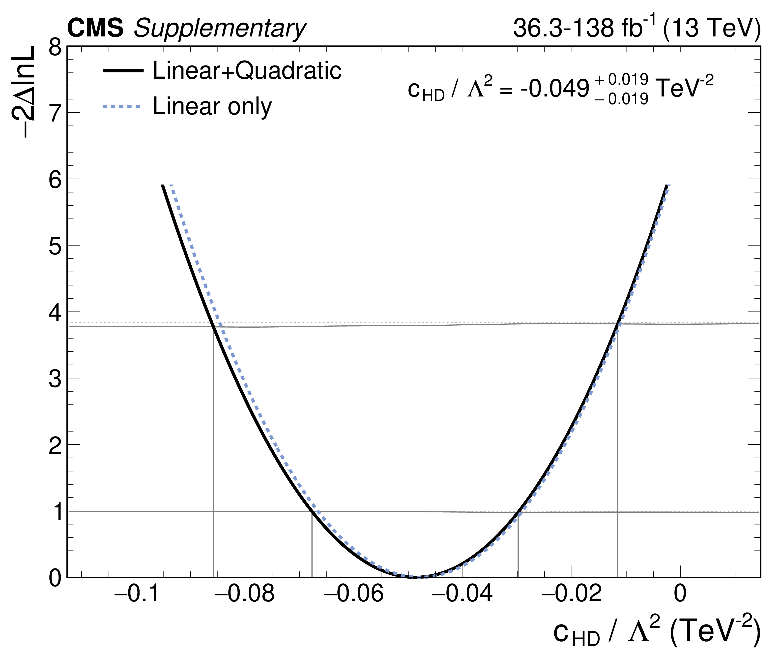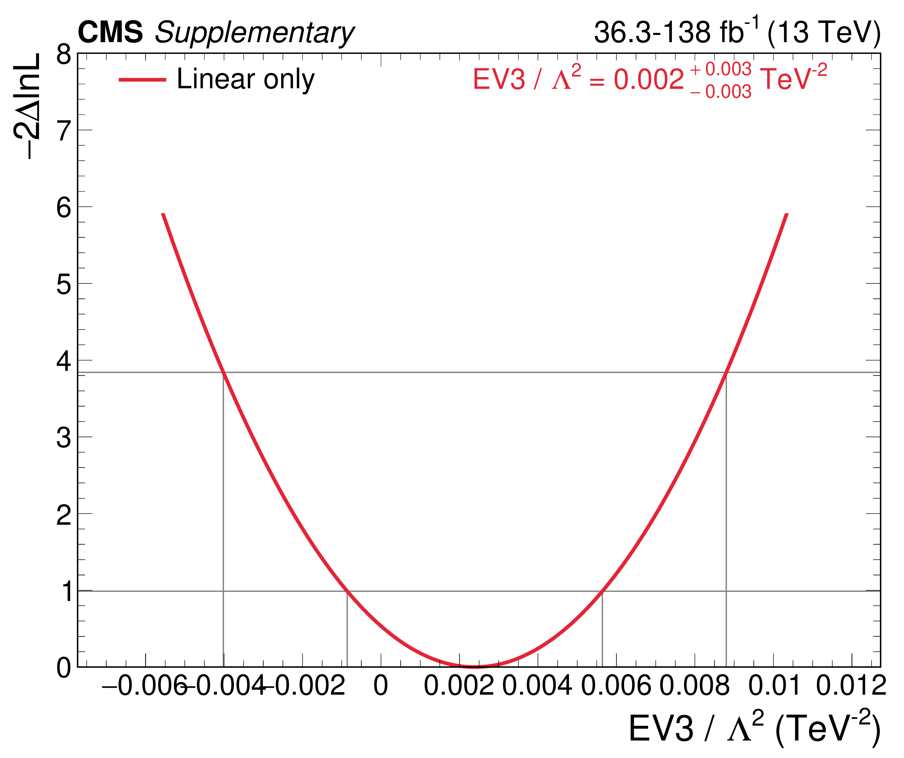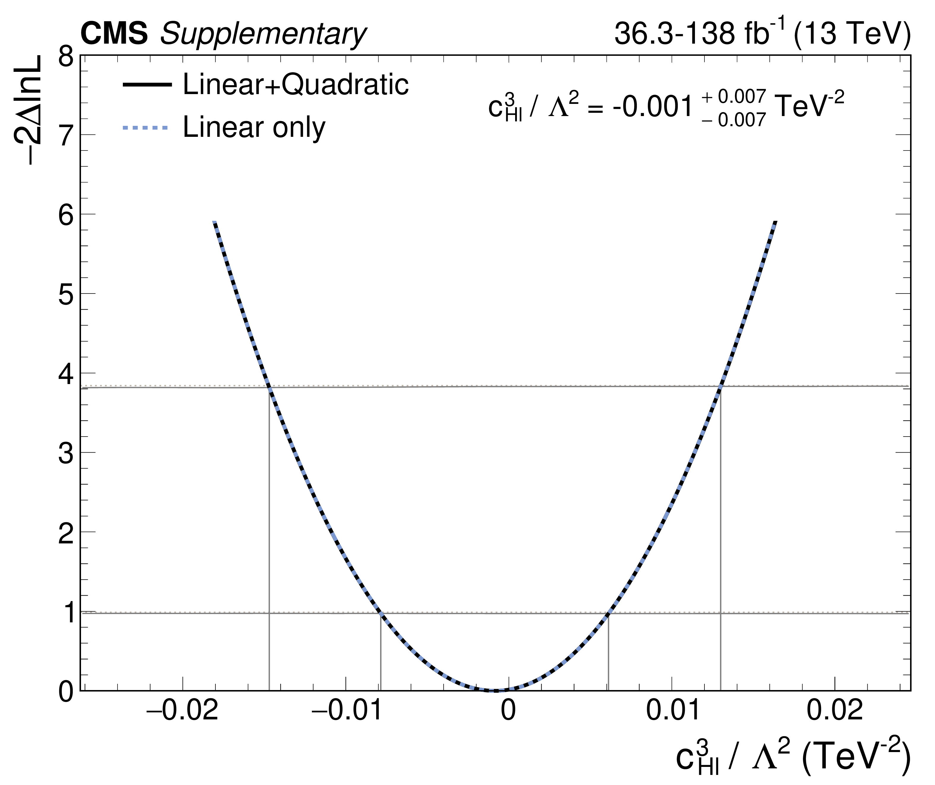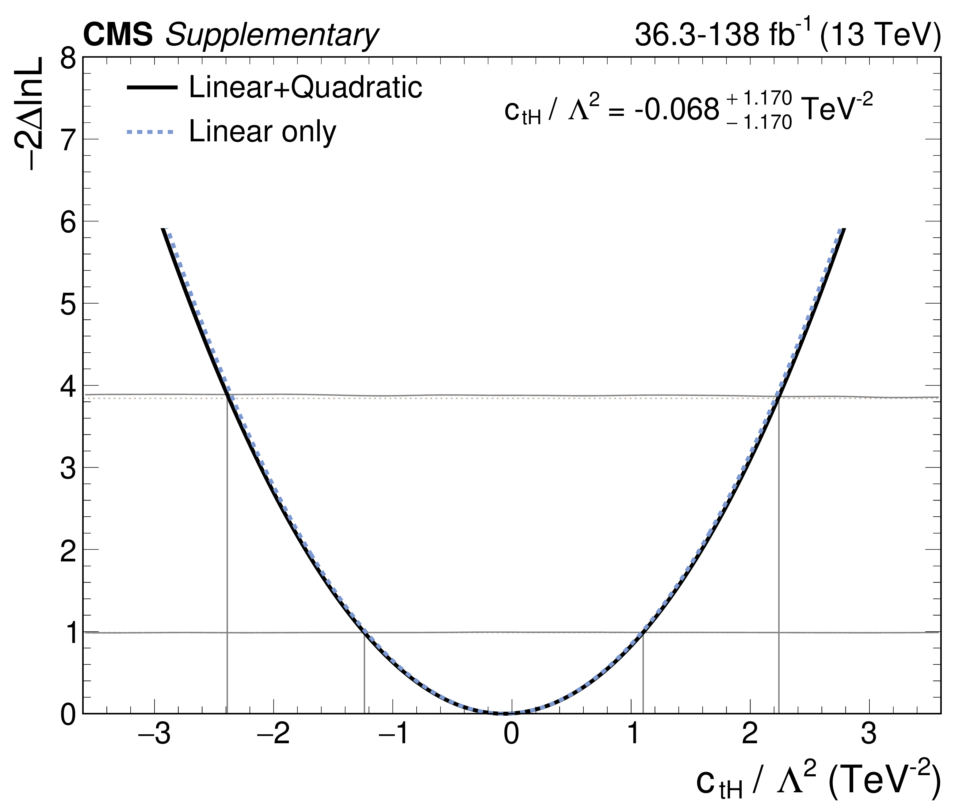 Observed likelihood scans for $ c^{(3)}_{\mathrm{HQ}} $, where linear terms dominate (upper left); $ c_{\mathrm{l}\mathrm{u}} $, where quadratic terms dominate (upper right); and $ c_{\mathrm{W}} $, where quadratic and linear terms both contribute (lower). The results with quadratic terms included in the parameterization (solid black line) and with linear terms only (dashed blue line) are shown. The solid grey lines indicate the sets of points $ q^{68\%} $ (lower line) and $ q^{95\%} $ (upper line), whereas the dashed grey lines denote the test statistic values used to determine the 68% and 95% confidence intervals in the asymptotic approximation. The confidence intervals shown on the figures are the 68% confidence intervals extracted from the intersection of the linear-plus-quadratic curve with the $ q^{68\%} $ line. |