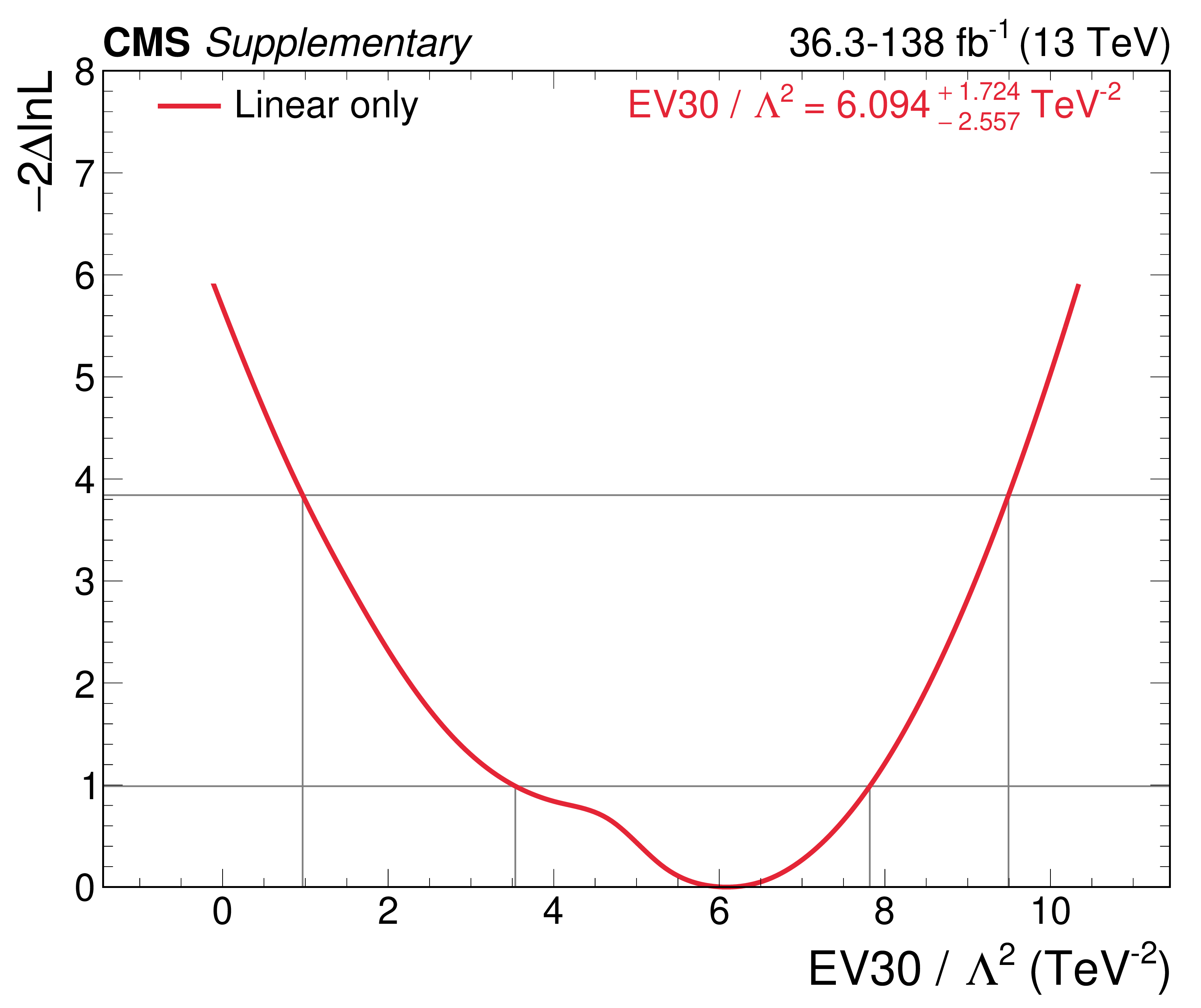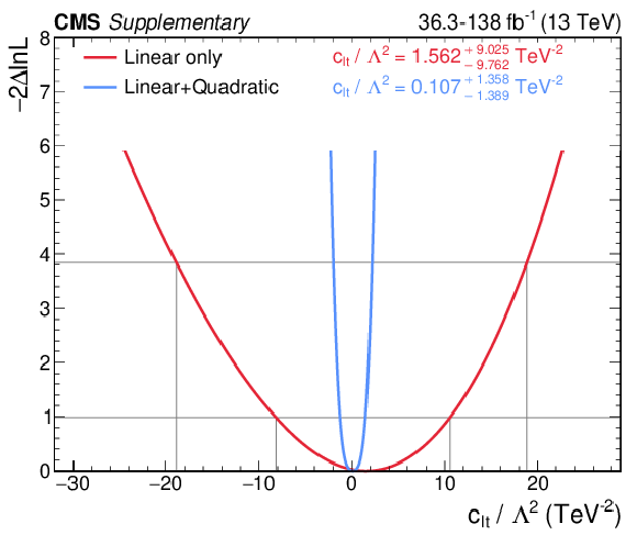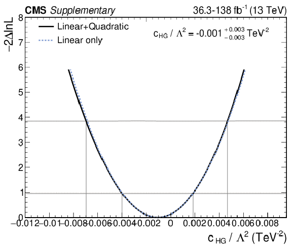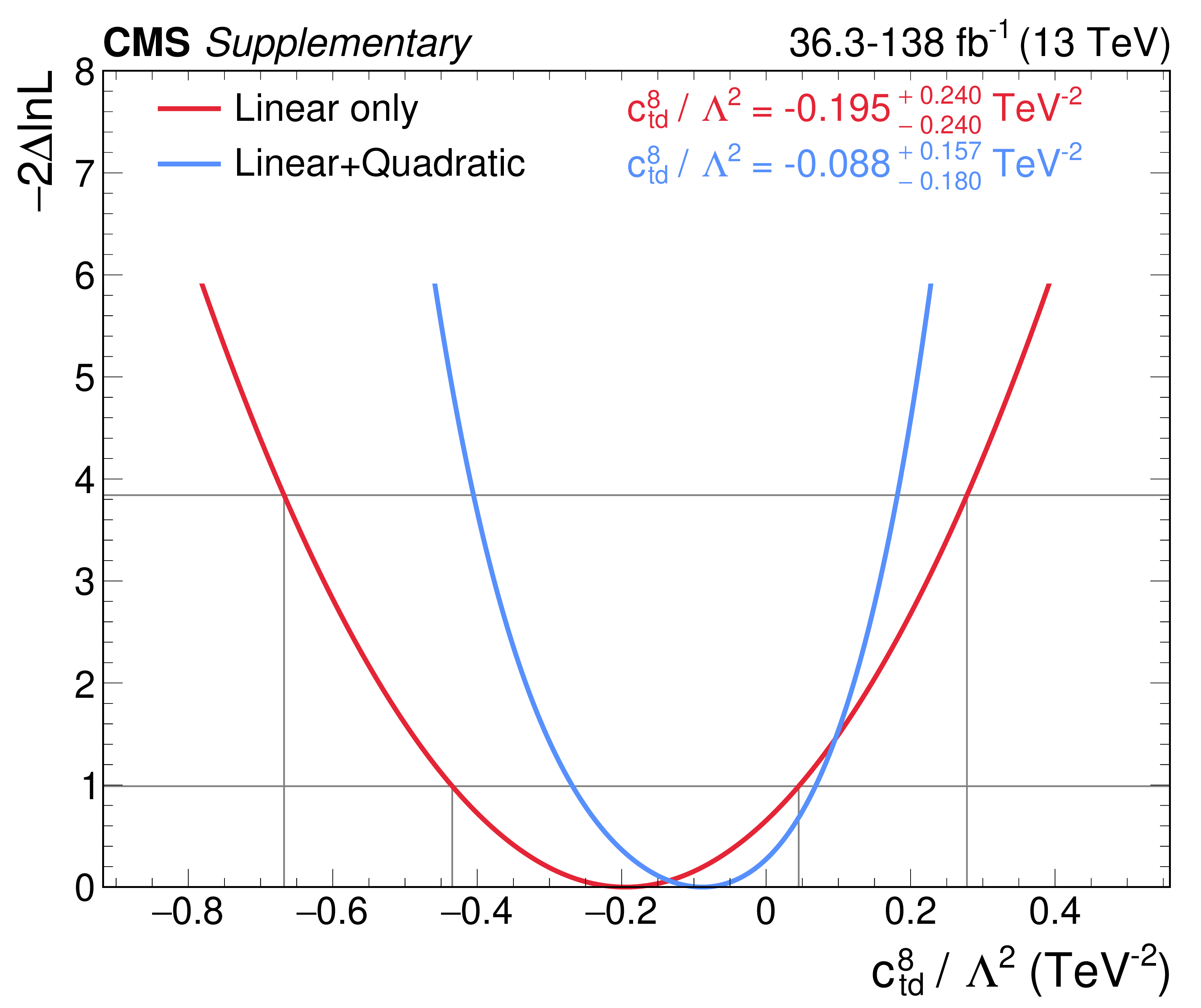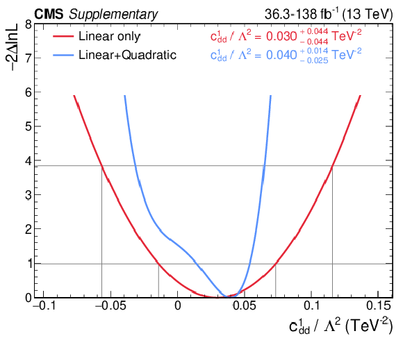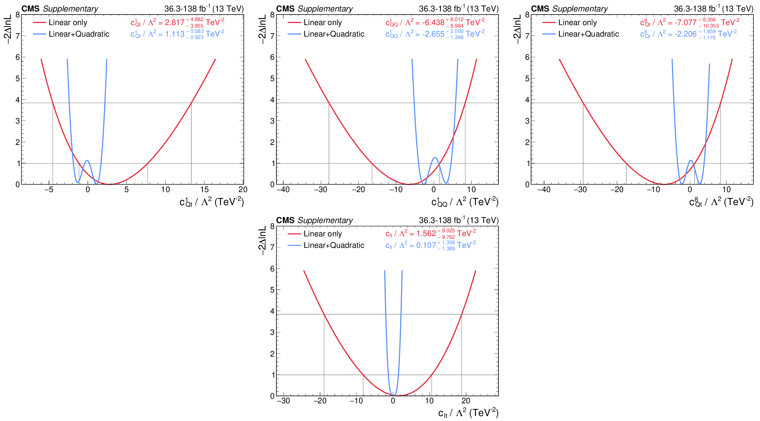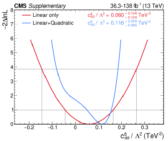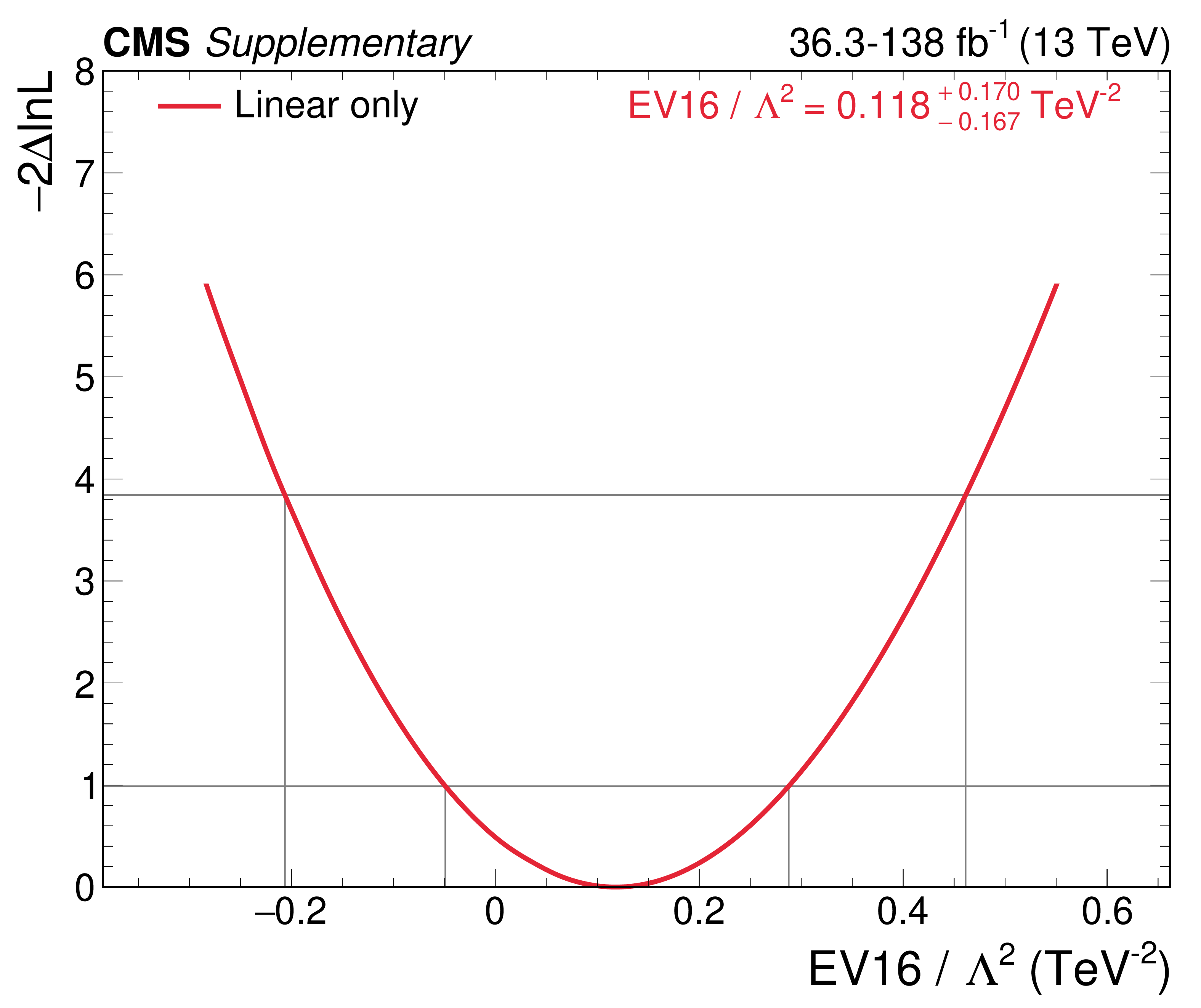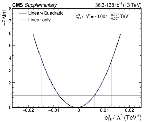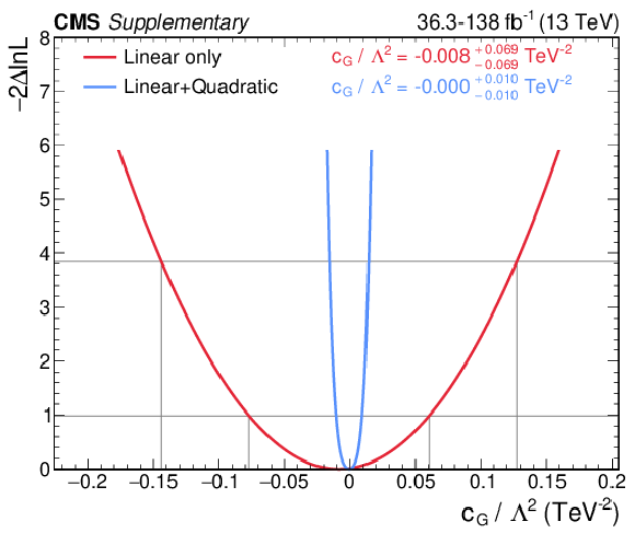 Observed likelihood scans for $ c^{(3)}_{\mathrm{HQ}} $, where linear terms dominate (upper left); $ c_{\mathrm{l}\mathrm{u}} $, where quadratic terms dominate (upper right); and $ c_{\mathrm{W}} $, where quadratic and linear terms both contribute (lower). The results with quadratic terms included in the parameterization (solid black line) and with linear terms only (dashed blue line) are shown. The solid grey lines indicate the sets of points $ q^{68\%} $ (lower line) and $ q^{95\%} $ (upper line), whereas the dashed grey lines denote the test statistic values used to determine the 68% and 95% confidence intervals in the asymptotic approximation. The confidence intervals shown on the figures are the 68% confidence intervals extracted from the intersection of the linear-plus-quadratic curve with the $ q^{68\%} $ line. |