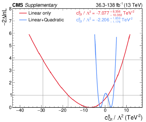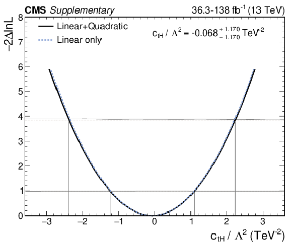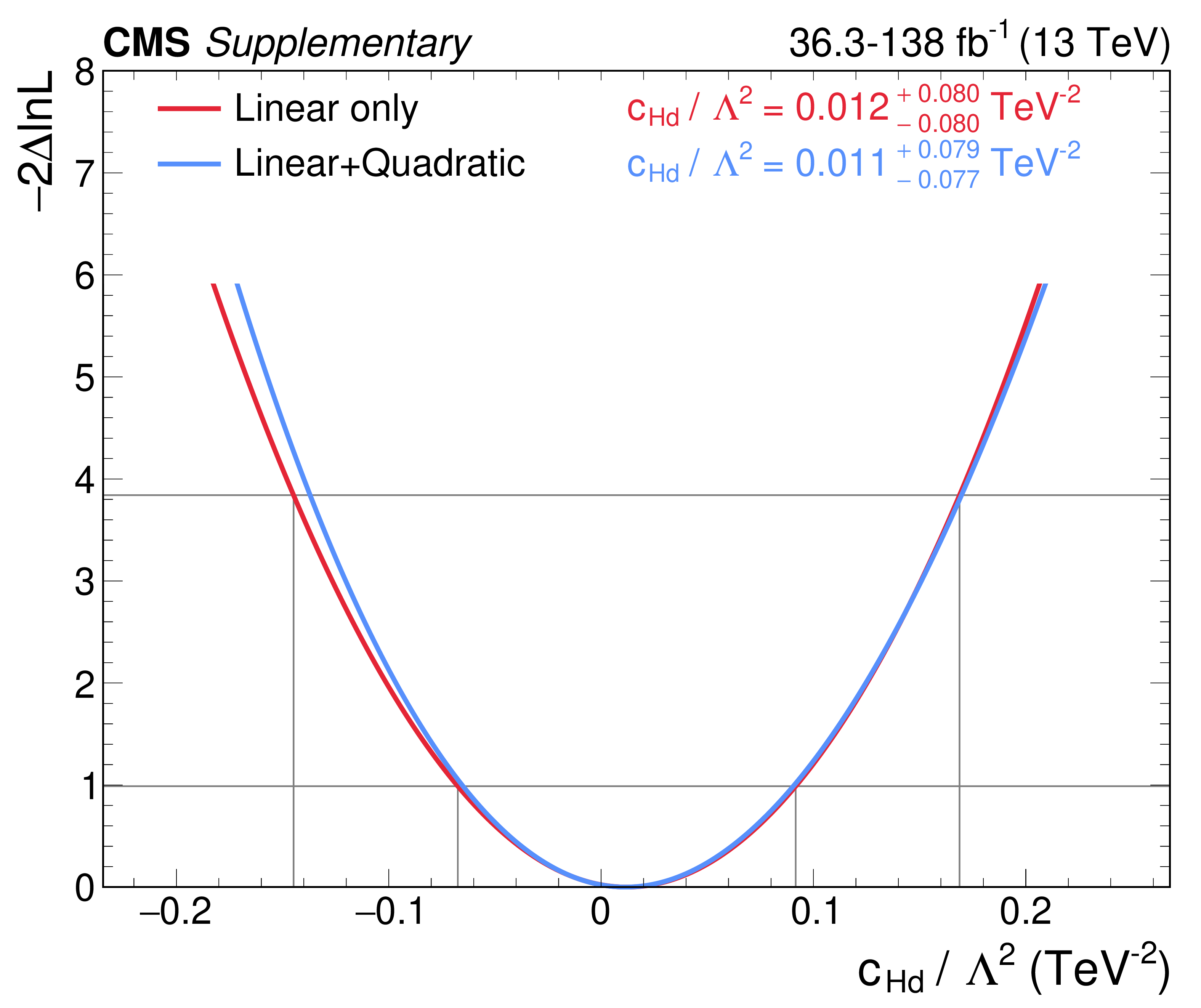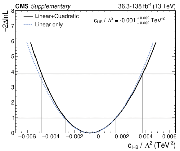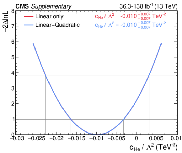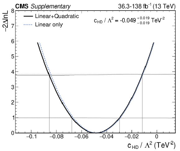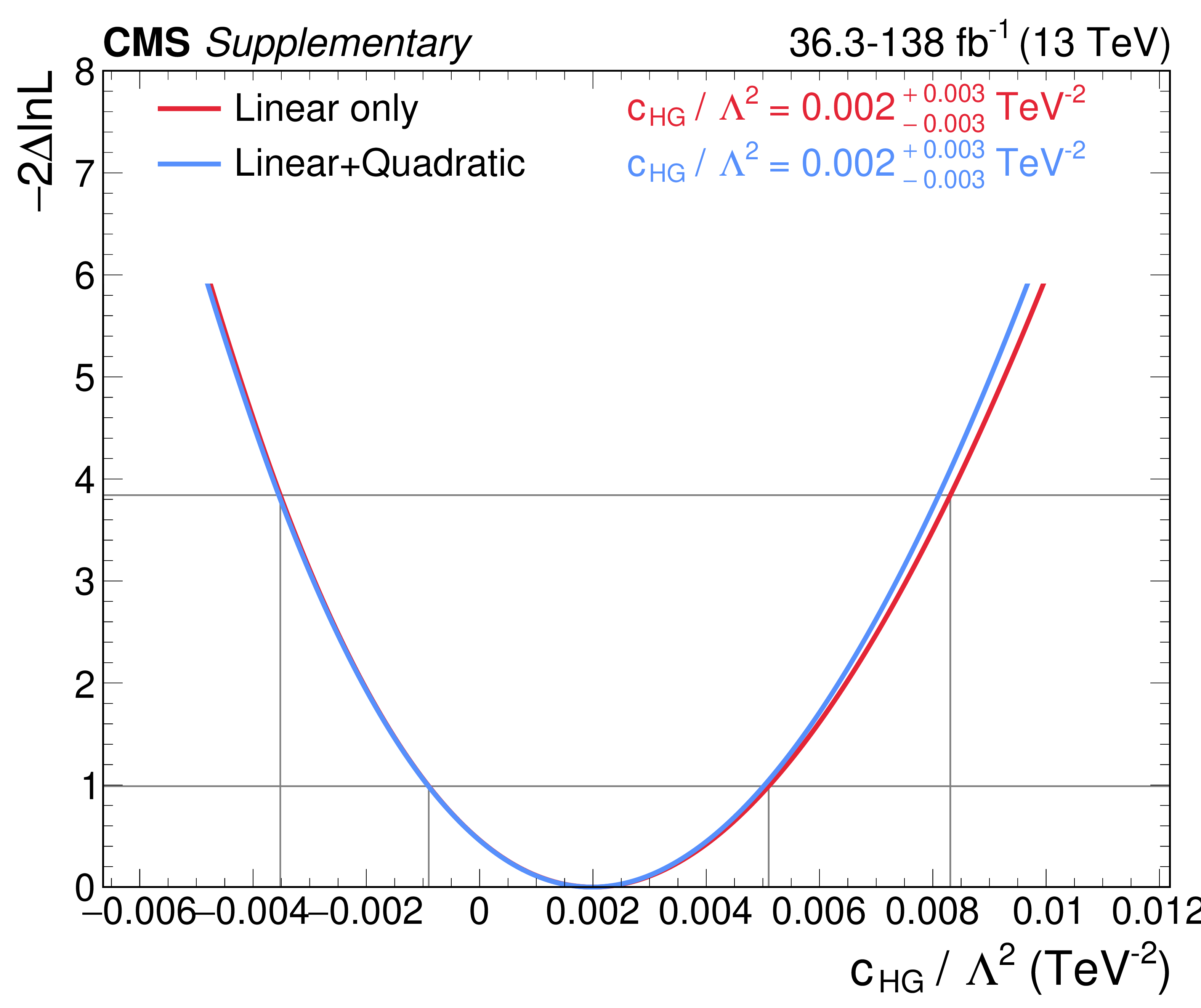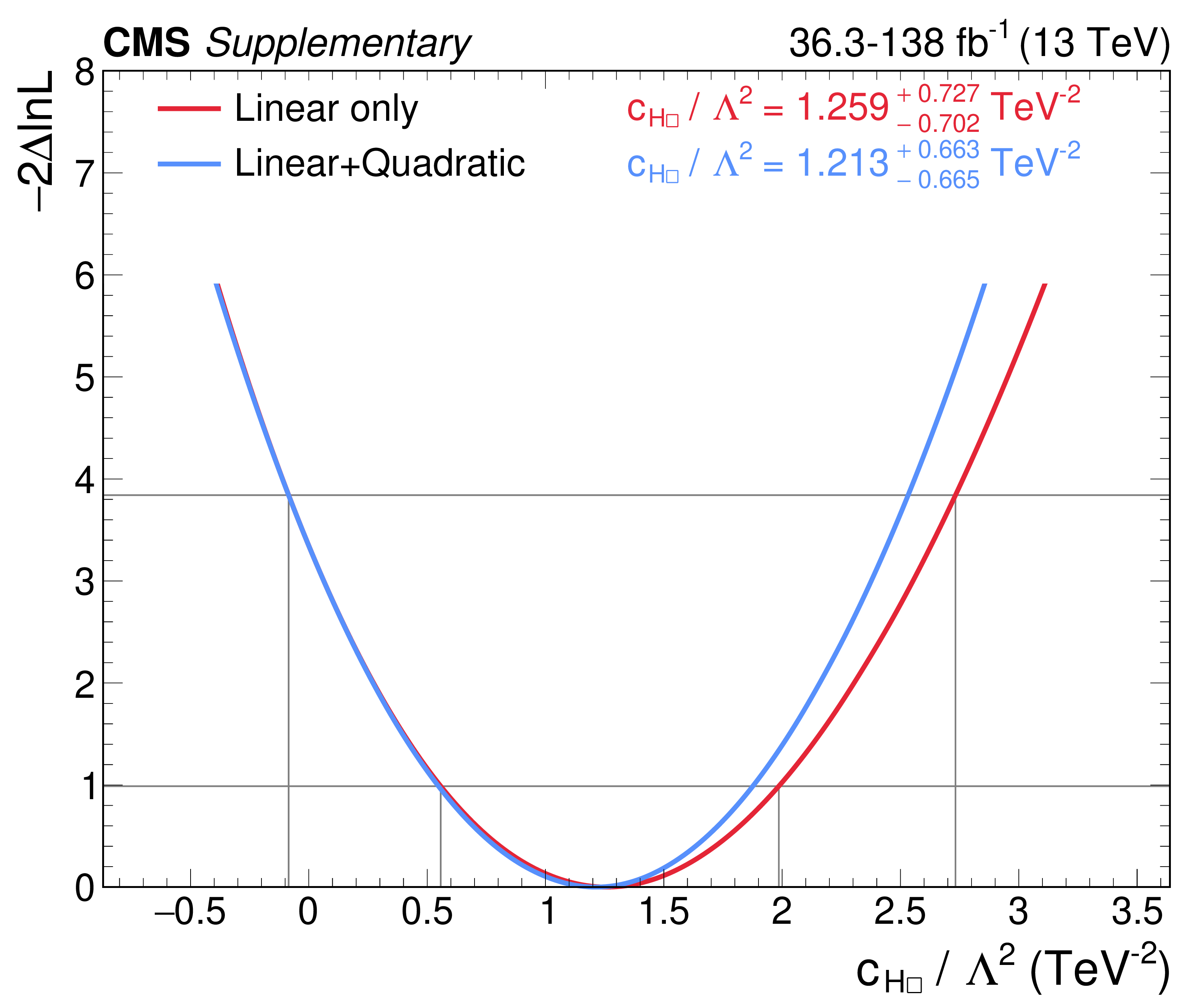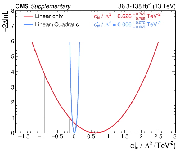 Observed likelihood scans for $ c^{(3)}_{\mathrm{HQ}} $, where linear terms dominate (upper left); $ c_{\mathrm{l}\mathrm{u}} $, where quadratic terms dominate (upper right); and $ c_{\mathrm{W}} $, where quadratic and linear terms both contribute (lower). The results with quadratic terms included in the parameterization (solid black line) and with linear terms only (dashed blue line) are shown. The solid grey lines indicate the sets of points $ q^{68\%} $ (lower line) and $ q^{95\%} $ (upper line), whereas the dashed grey lines denote the test statistic values used to determine the 68% and 95% confidence intervals in the asymptotic approximation. The confidence intervals shown on the figures are the 68% confidence intervals extracted from the intersection of the linear-plus-quadratic curve with the $ q^{68\%} $ line. |