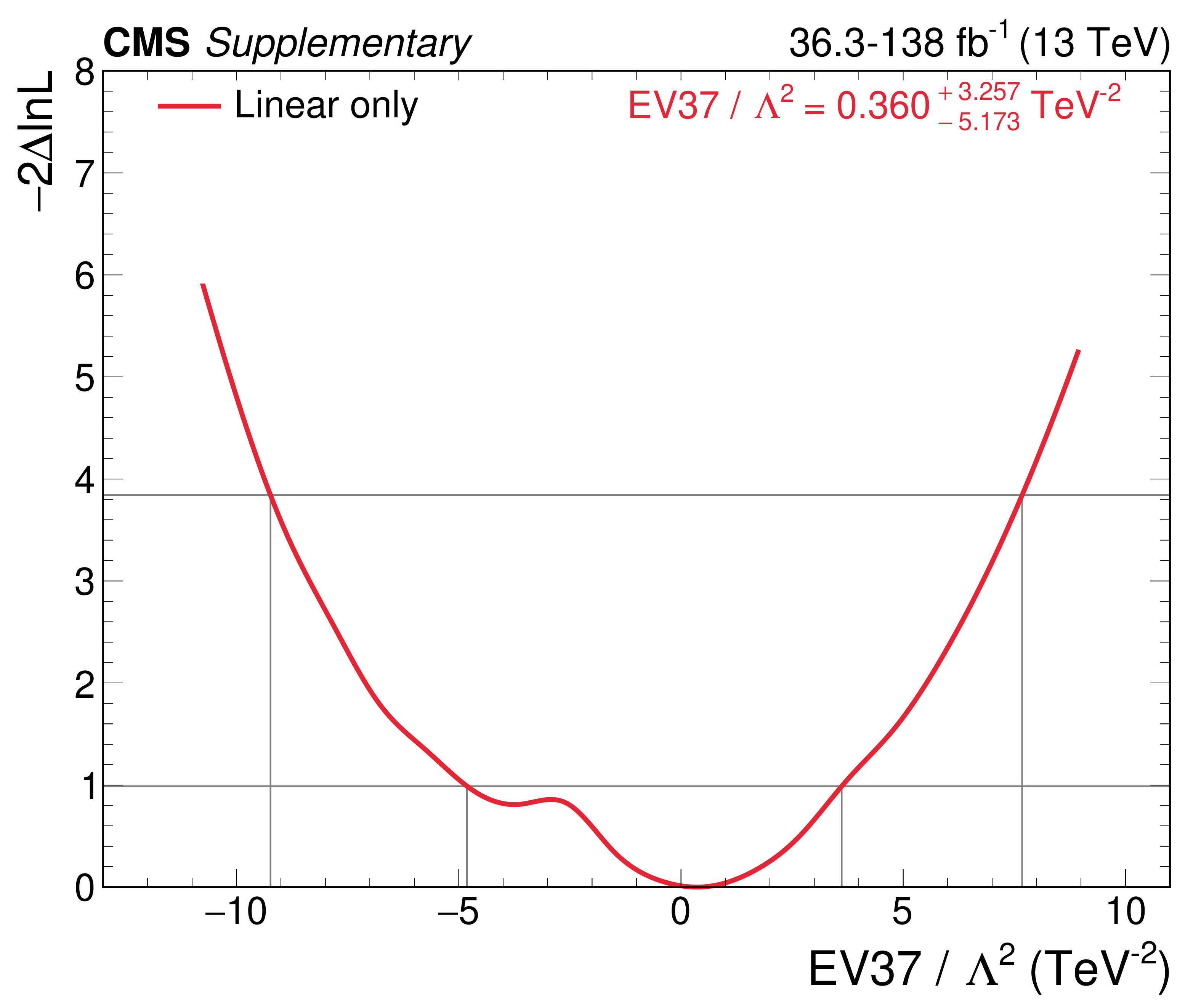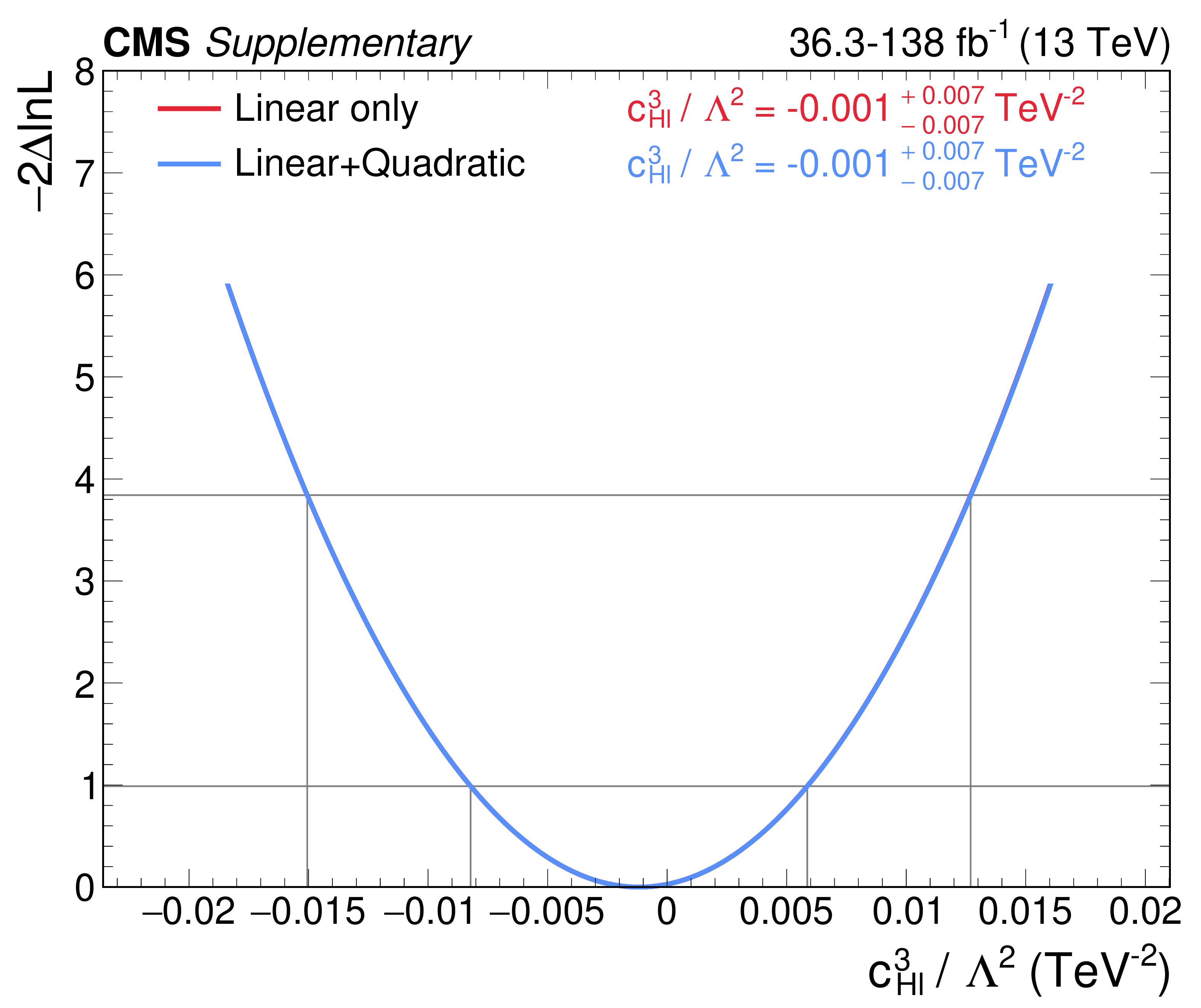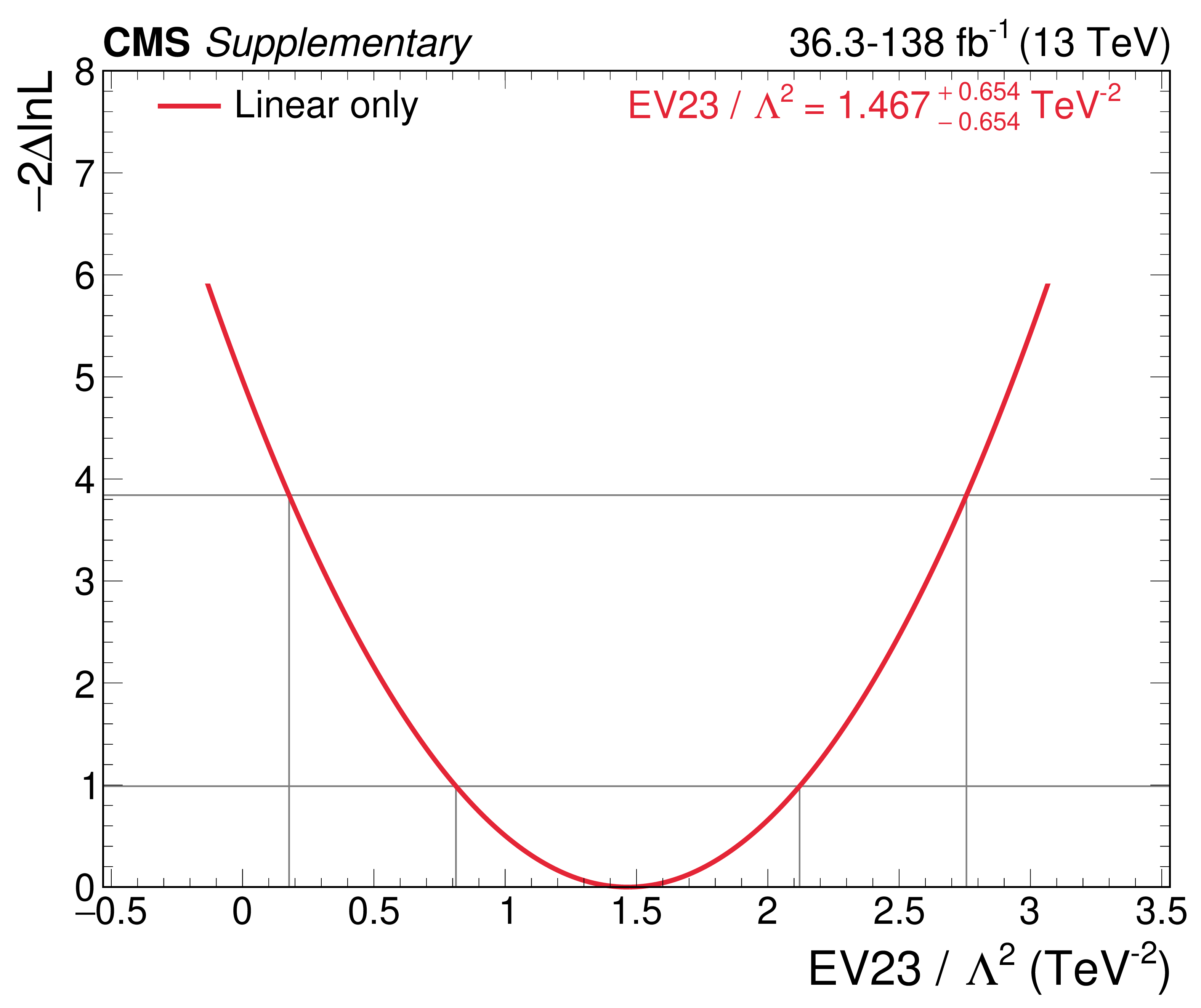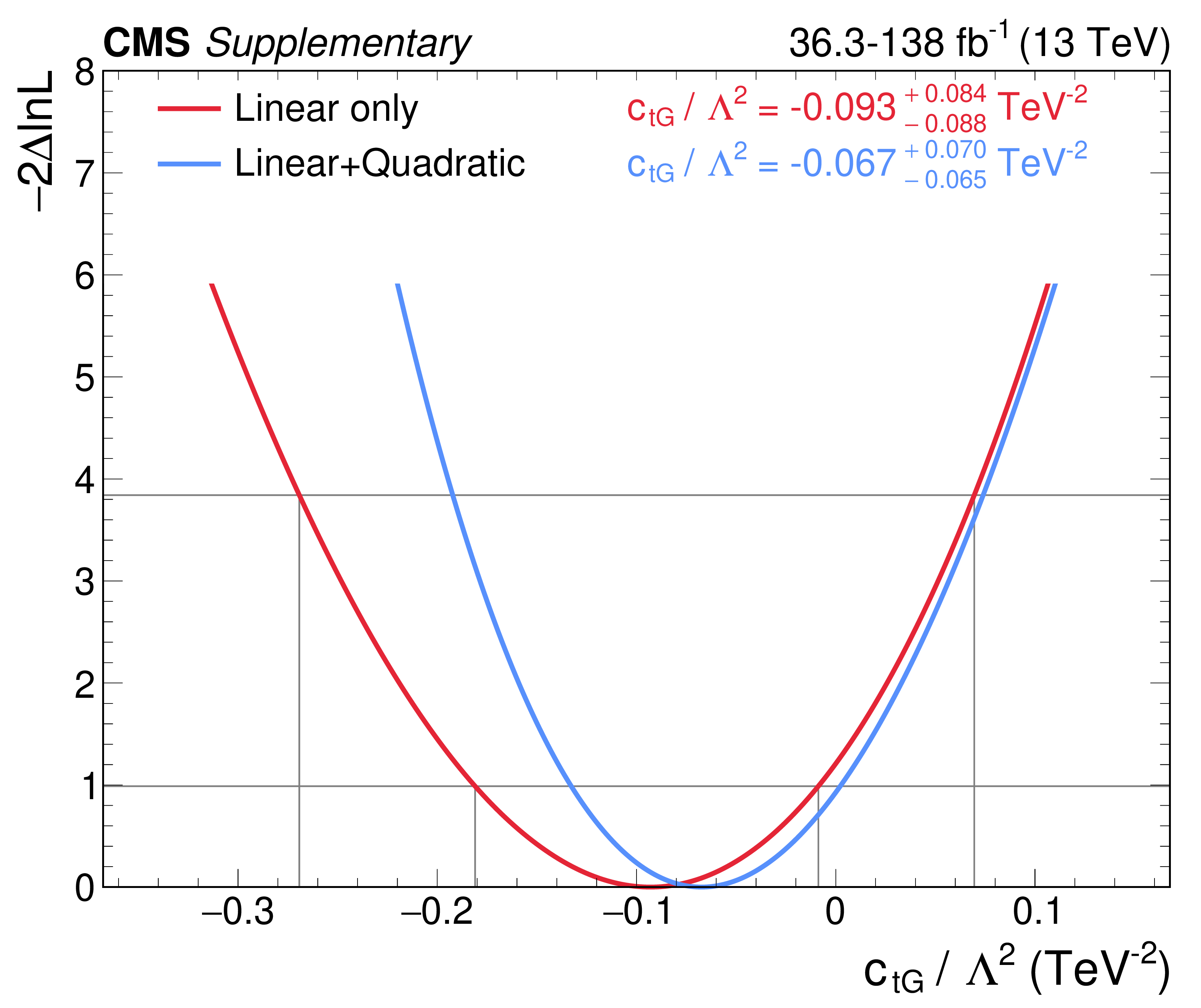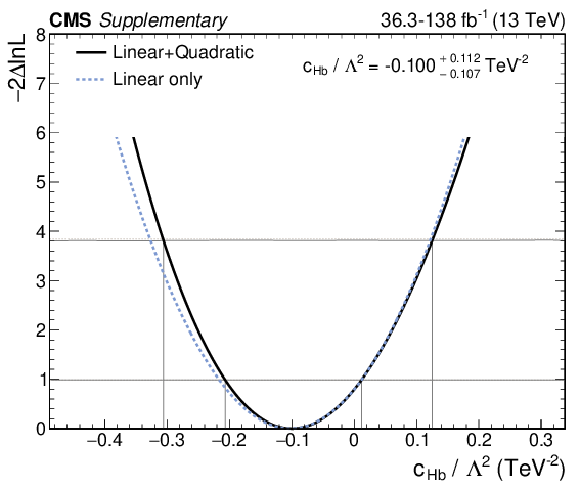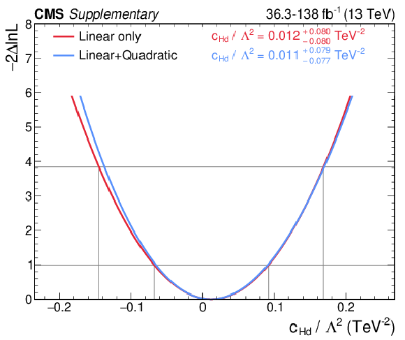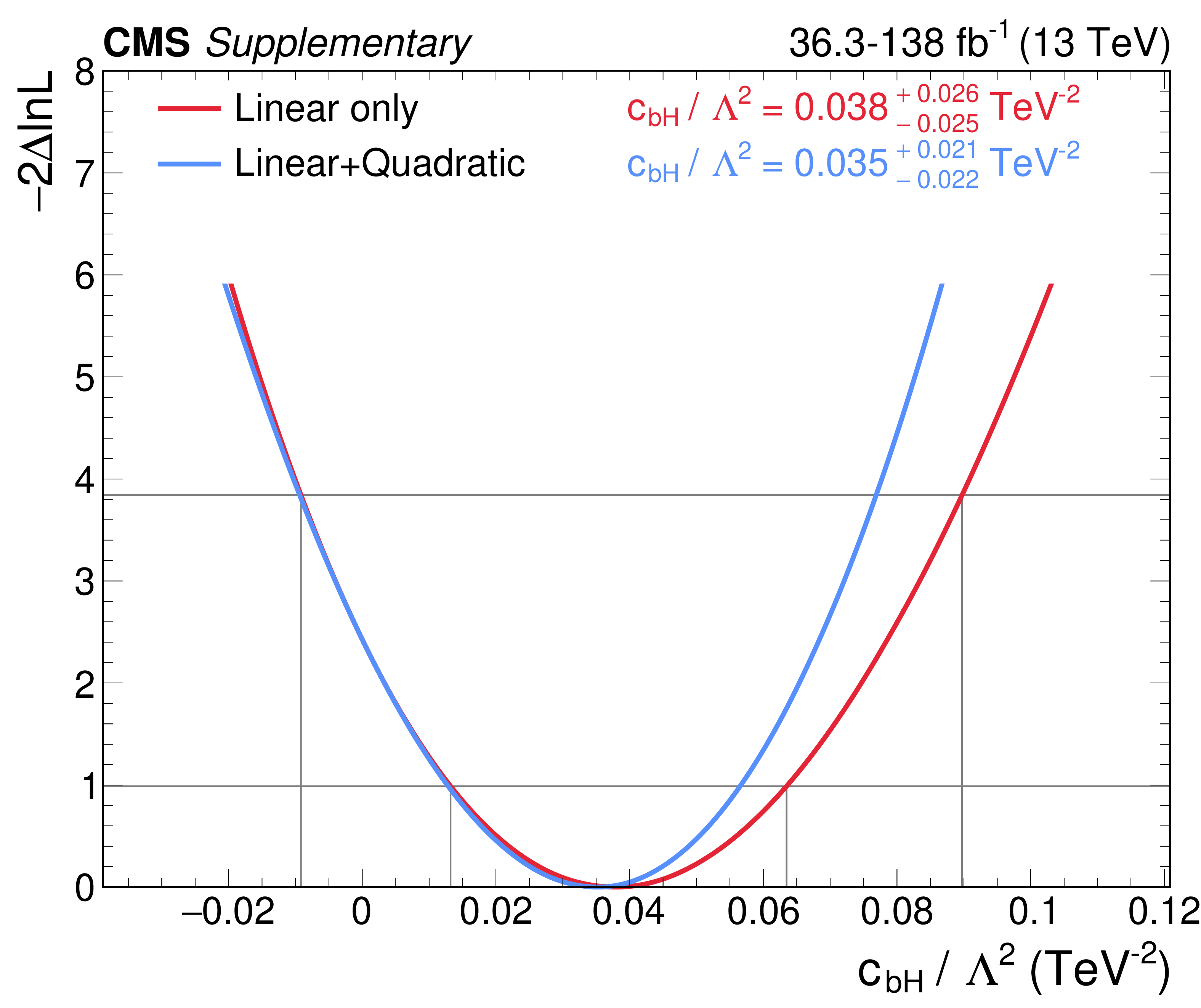 Observed likelihood scans for $ c^{(3)}_{\mathrm{HQ}} $, where linear terms dominate (upper left); $ c_{\mathrm{l}\mathrm{u}} $, where quadratic terms dominate (upper right); and $ c_{\mathrm{W}} $, where quadratic and linear terms both contribute (lower). The results with quadratic terms included in the parameterization (solid black line) and with linear terms only (dashed blue line) are shown. The solid grey lines indicate the sets of points $ q^{68\%} $ (lower line) and $ q^{95\%} $ (upper line), whereas the dashed grey lines denote the test statistic values used to determine the 68% and 95% confidence intervals in the asymptotic approximation. The confidence intervals shown on the figures are the 68% confidence intervals extracted from the intersection of the linear-plus-quadratic curve with the $ q^{68\%} $ line. |