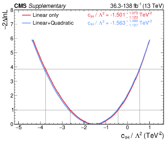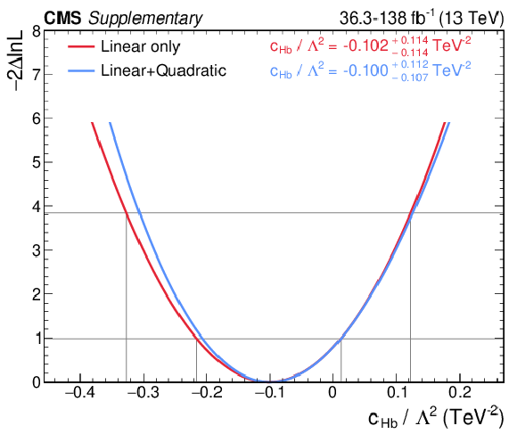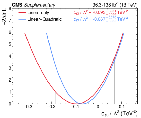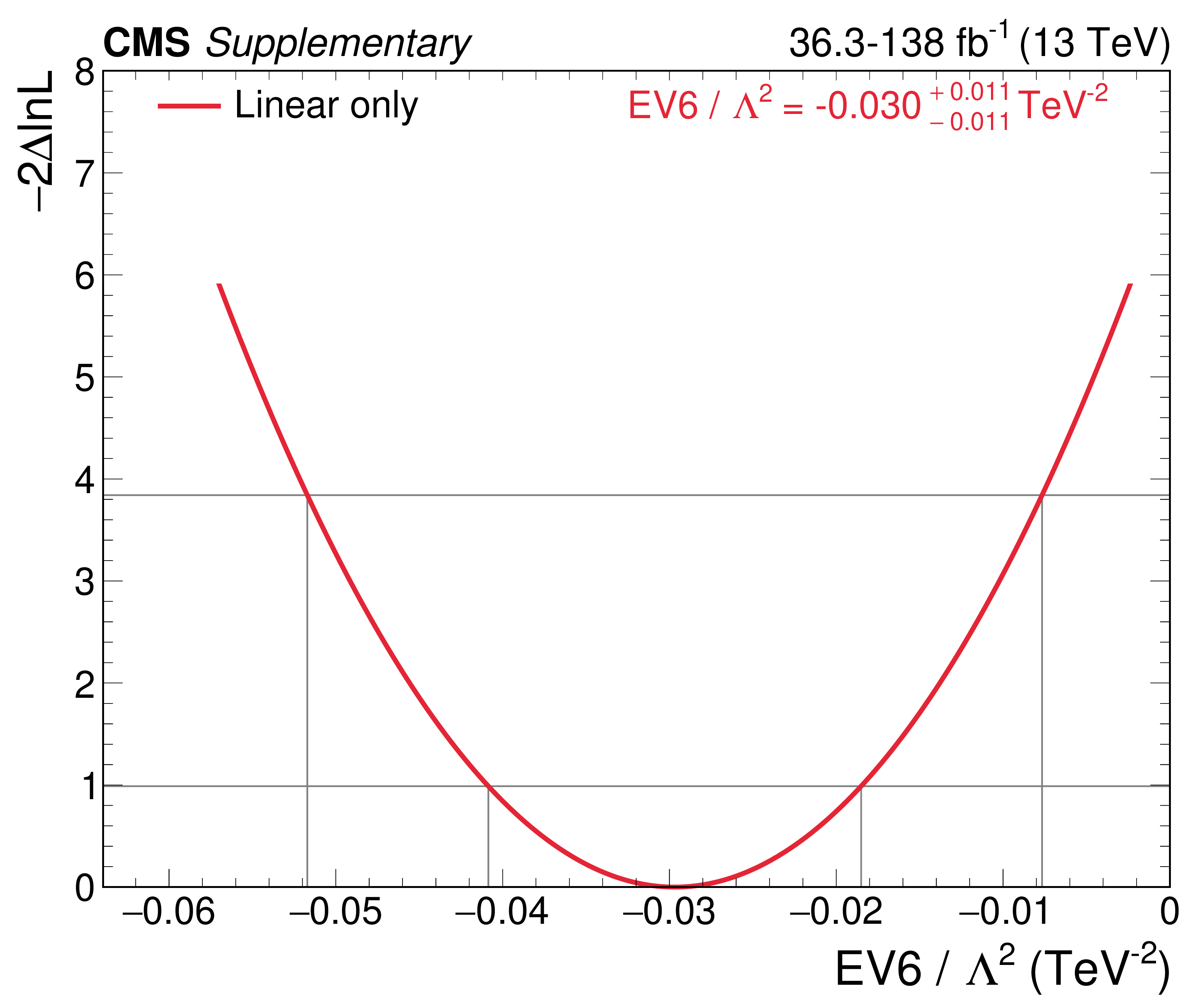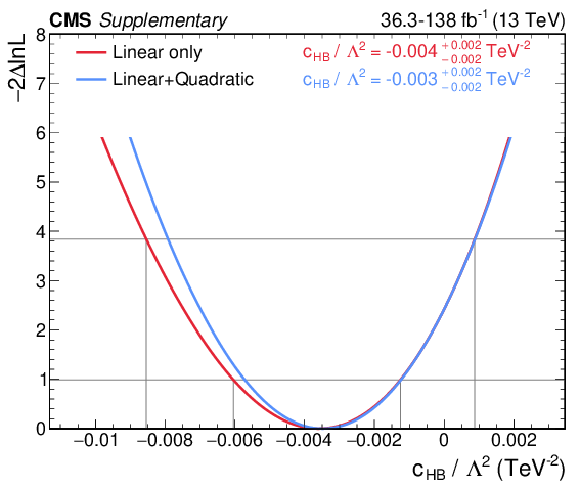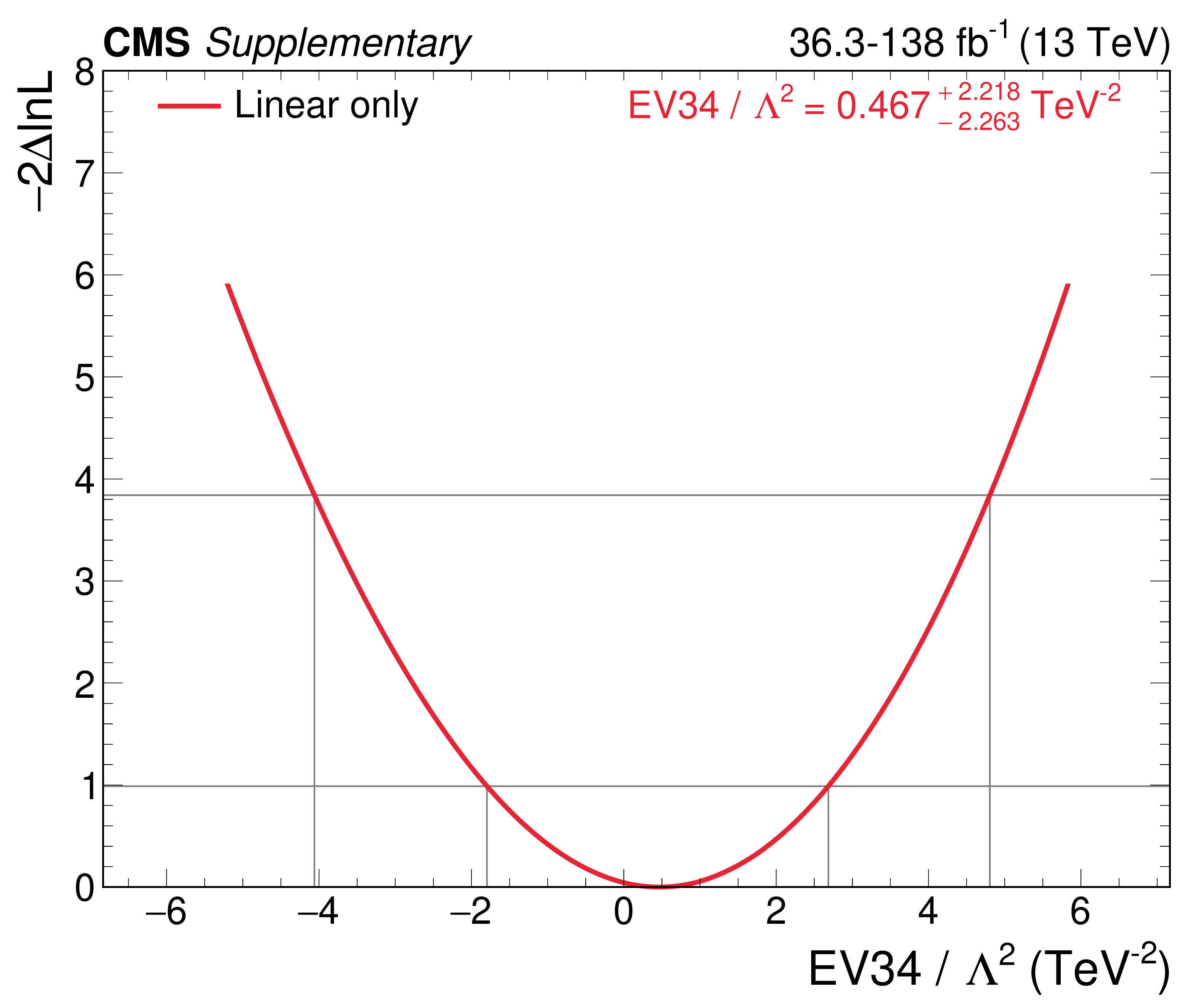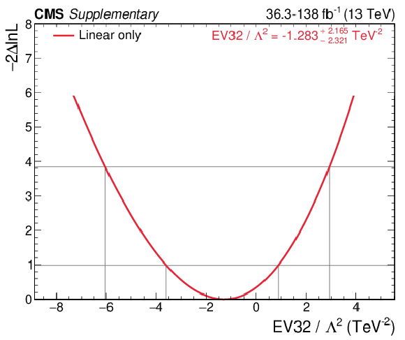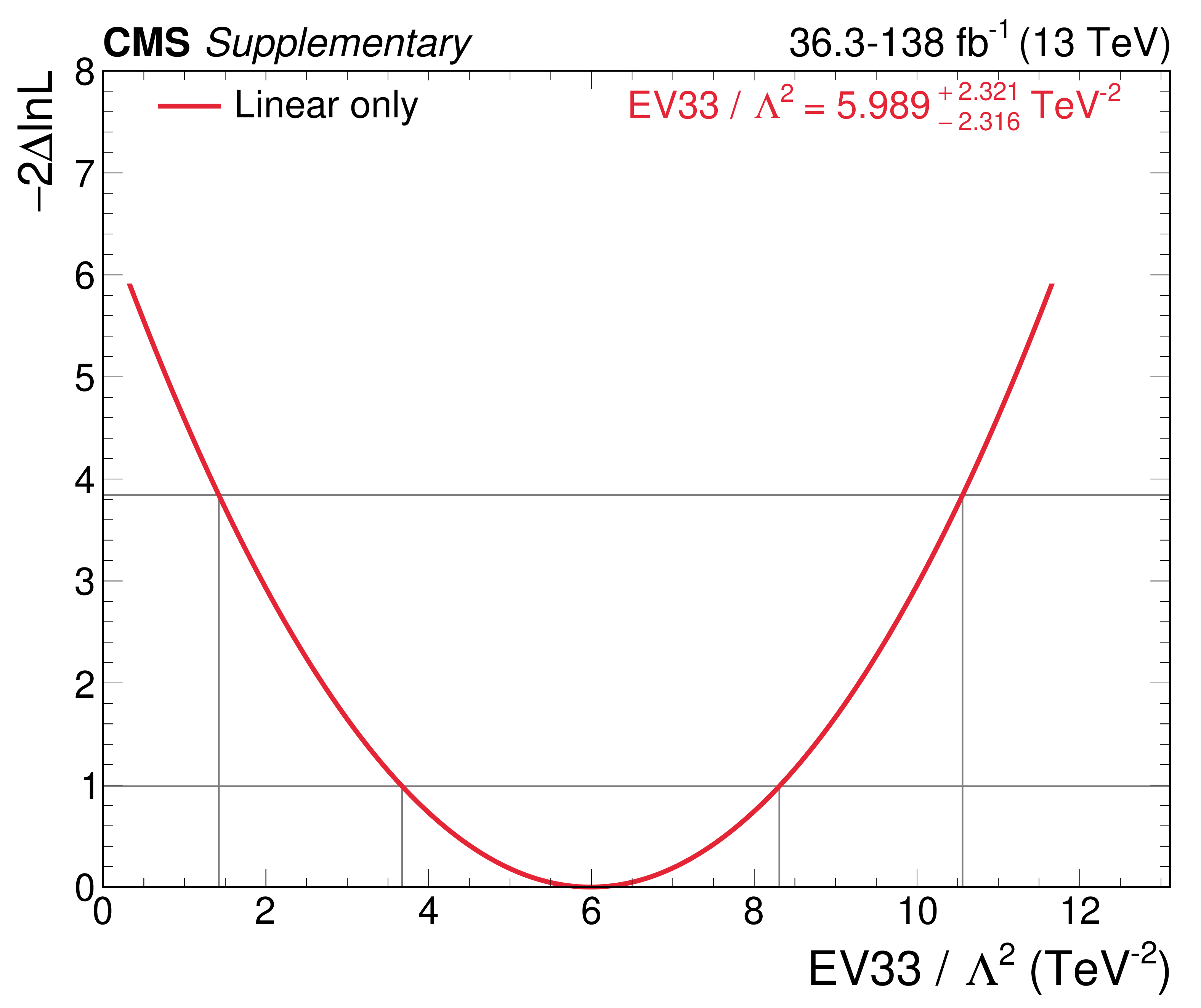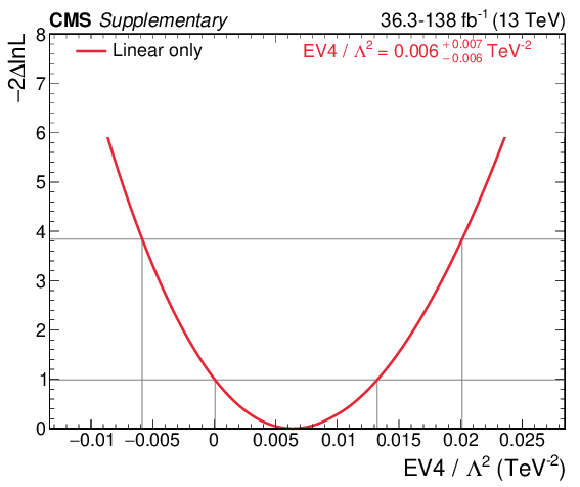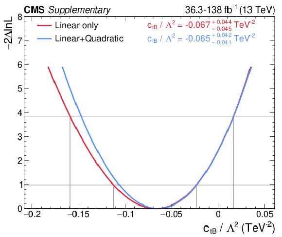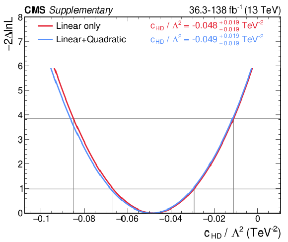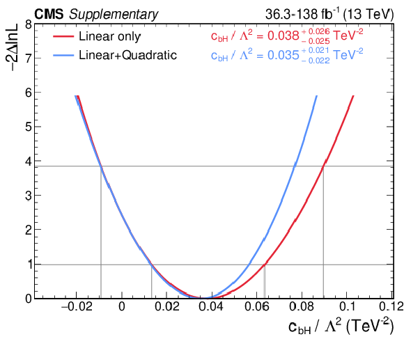 Observed likelihood scans for $ c^{(3)}_{\mathrm{HQ}} $, where linear terms dominate (upper left); $ c_{\mathrm{l}\mathrm{u}} $, where quadratic terms dominate (upper right); and $ c_{\mathrm{W}} $, where quadratic and linear terms both contribute (lower). The results with quadratic terms included in the parameterization (solid black line) and with linear terms only (dashed blue line) are shown. The solid grey lines indicate the sets of points $ q^{68\%} $ (lower line) and $ q^{95\%} $ (upper line), whereas the dashed grey lines denote the test statistic values used to determine the 68% and 95% confidence intervals in the asymptotic approximation. The confidence intervals shown on the figures are the 68% confidence intervals extracted from the intersection of the linear-plus-quadratic curve with the $ q^{68\%} $ line. |