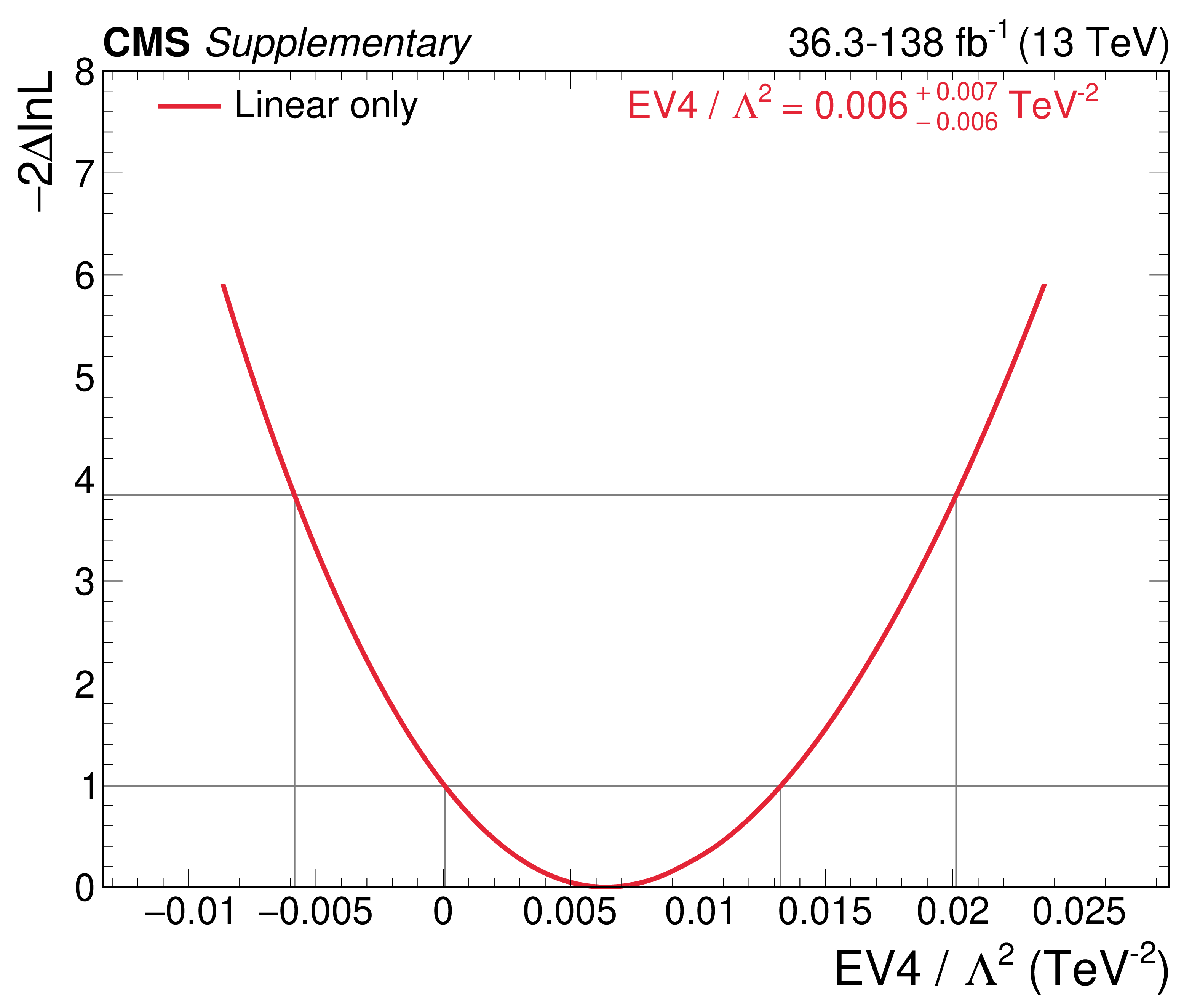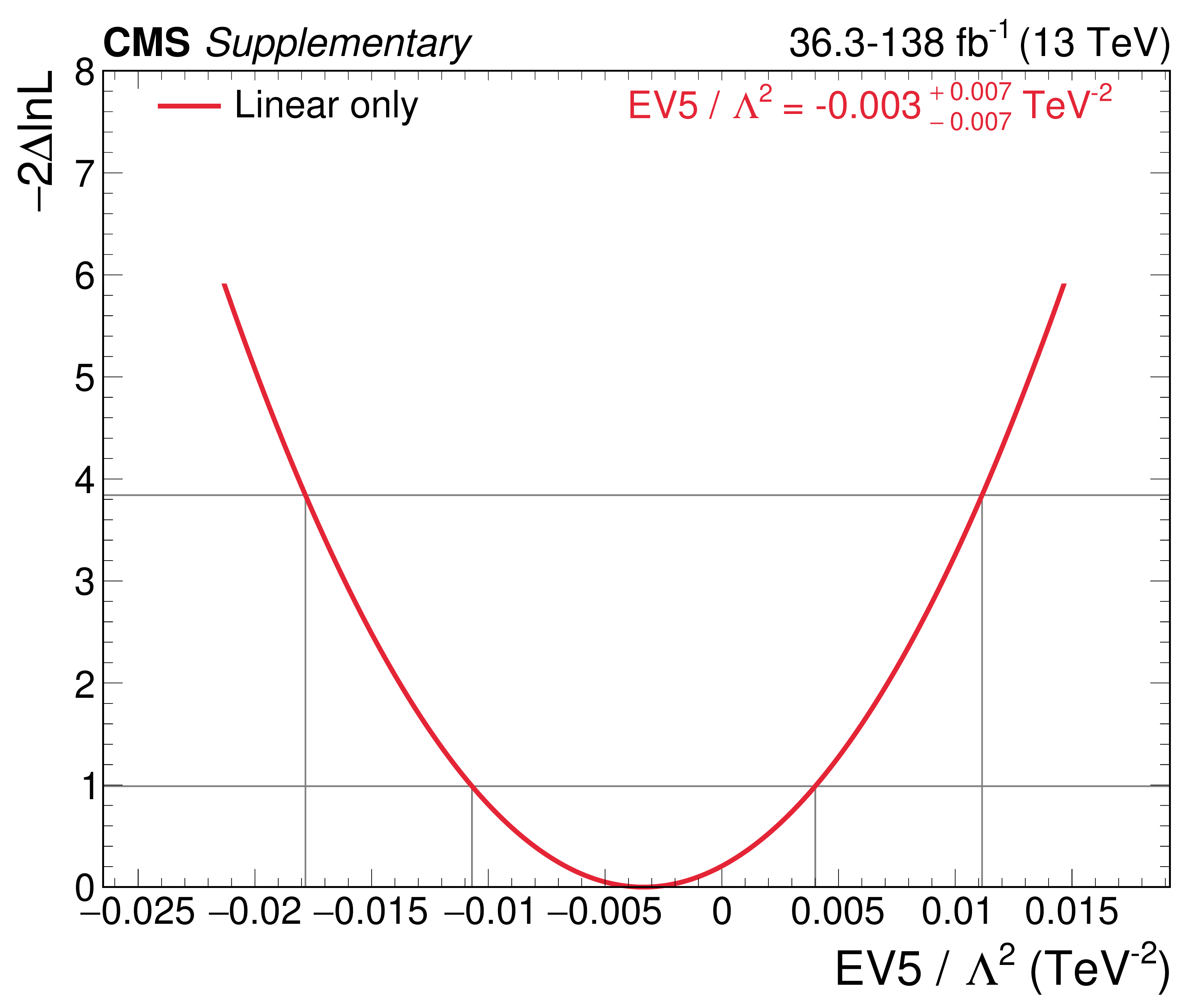 | Abstract: Constraints on Wilson coefficients (WCs) corresponding to dimension-6 operators of the standard model effective field theory (SMEFT) are determined from a simultaneous fit to seven sets of CMS measurements probing Higgs boson, electroweak vector boson, top quark, and multijet production. Measurements of electroweak precision observables at LEP and SLC are also included and provide complementary constraints to those from the CMS experiment. The CMS measurements, using LHC proton-proton collision data at $ \sqrt{s}= $ 13 TeV, corresponding to integrated luminosities of 36.3 or 138 fb$ ^{-1} $, are chosen to provide sensitivity to a broad set of operators, for which consistent SMEFT predictions can be derived. These are primarily measurements of differential cross sections which are parameterized as functions of the WCs. Measurements targeting $ \mathrm{t}(\overline{\mathrm{t}})\mathrm{X} $ production directly incorporate the SMEFT effects through event weights that are applied to the simulated signal samples, which enables detector-level predictions. Individual constraints on 64 WCs, and constraints on 42 linear combinations of WCs, are obtained. | ||