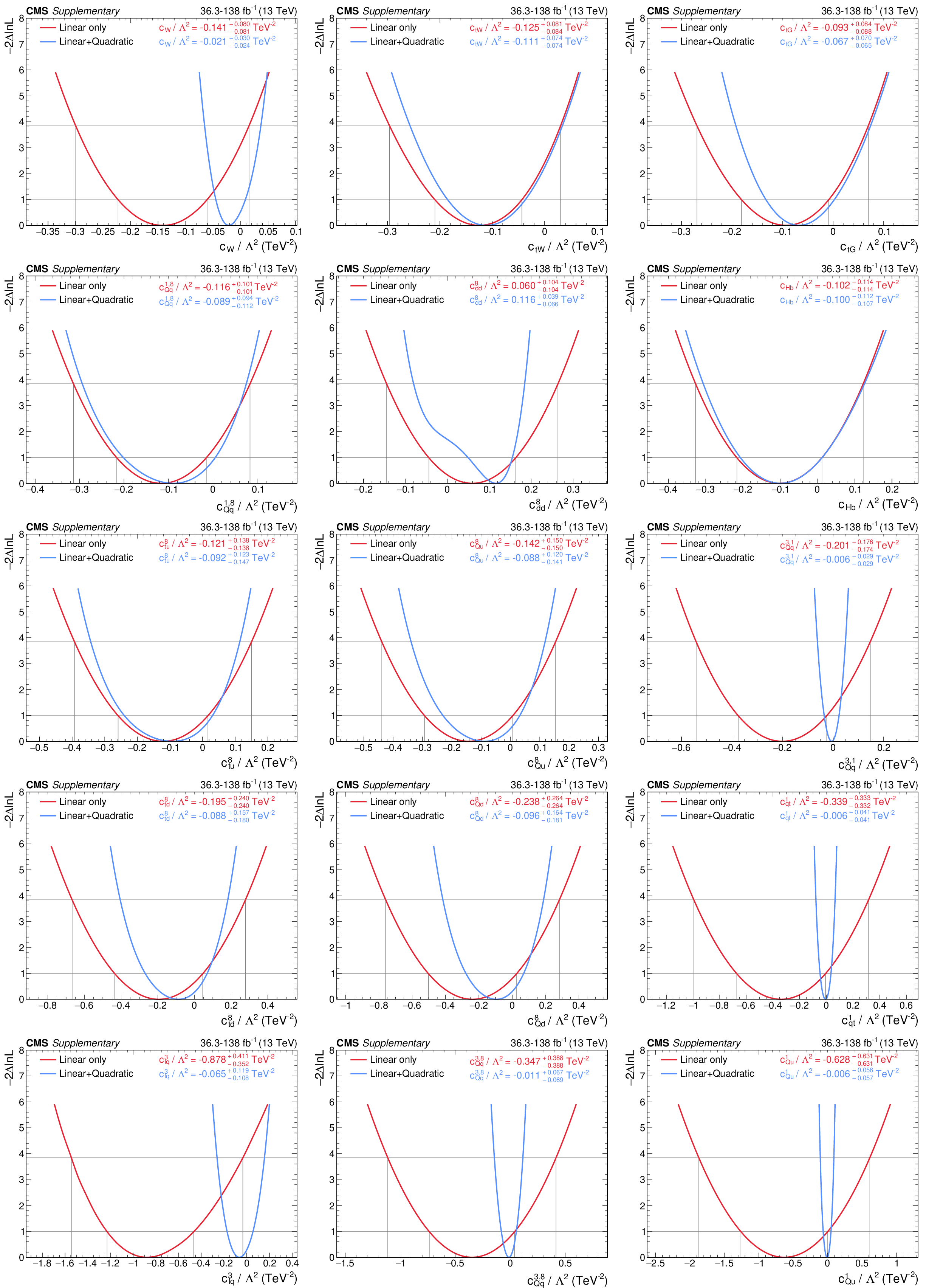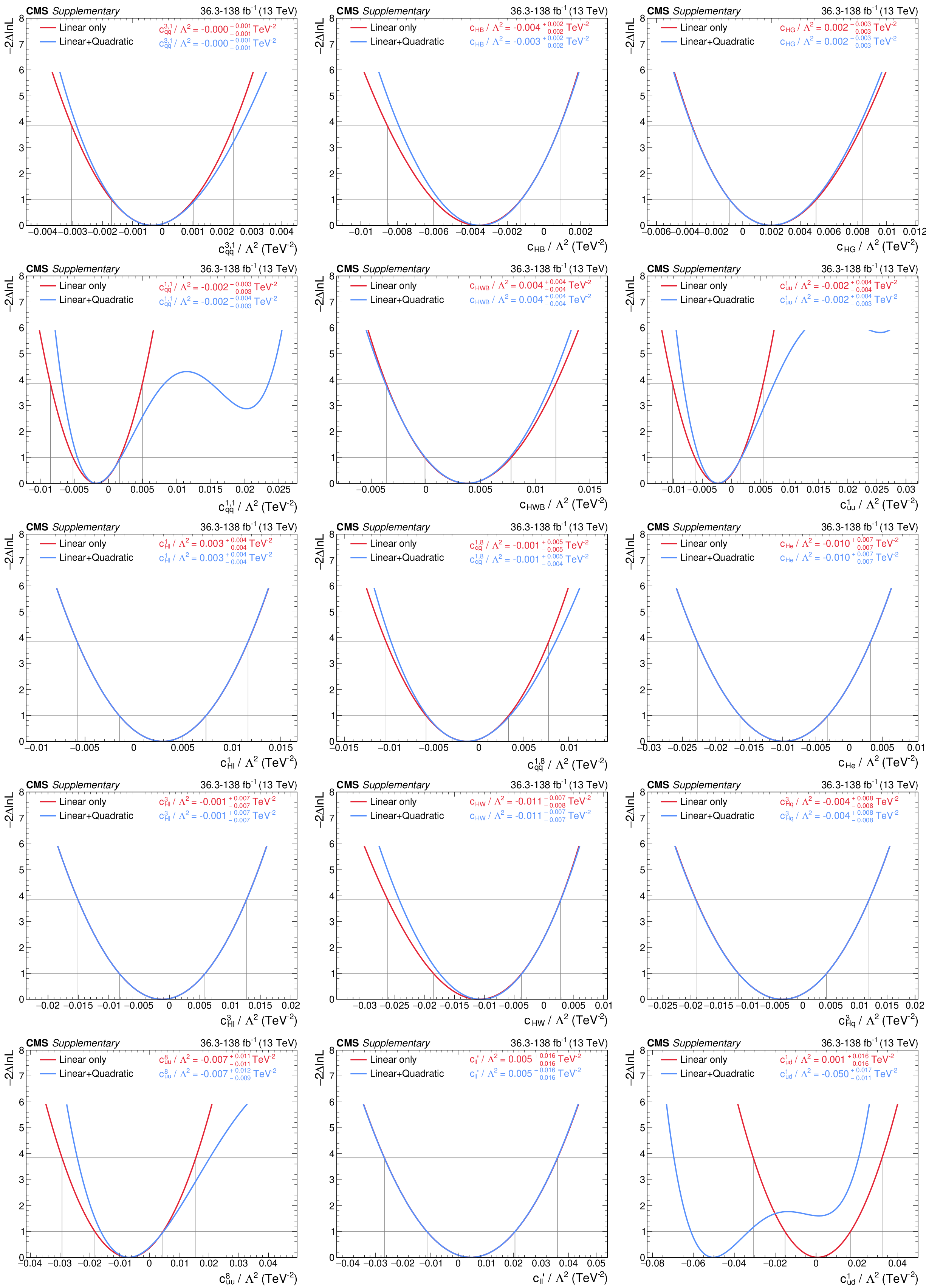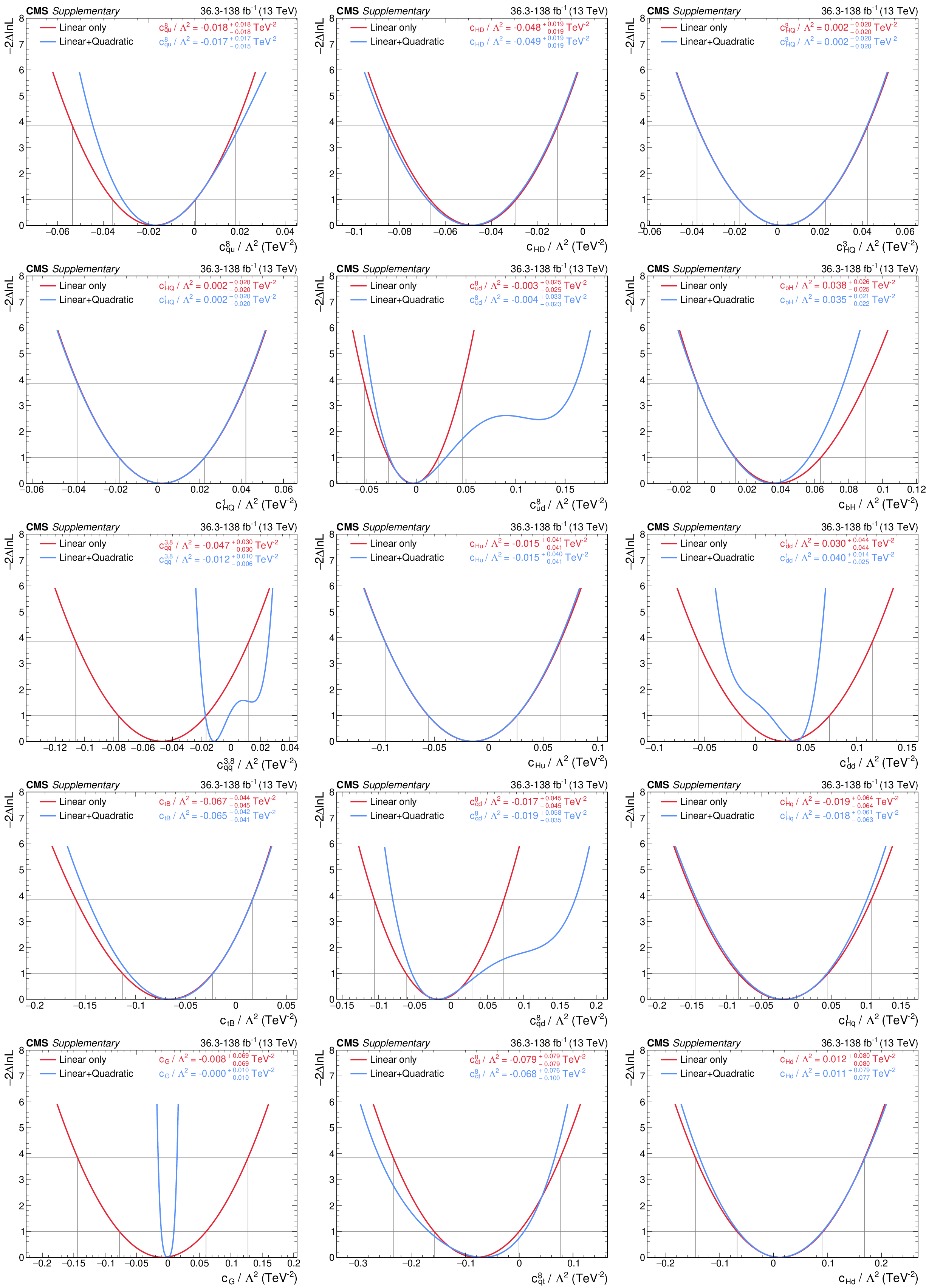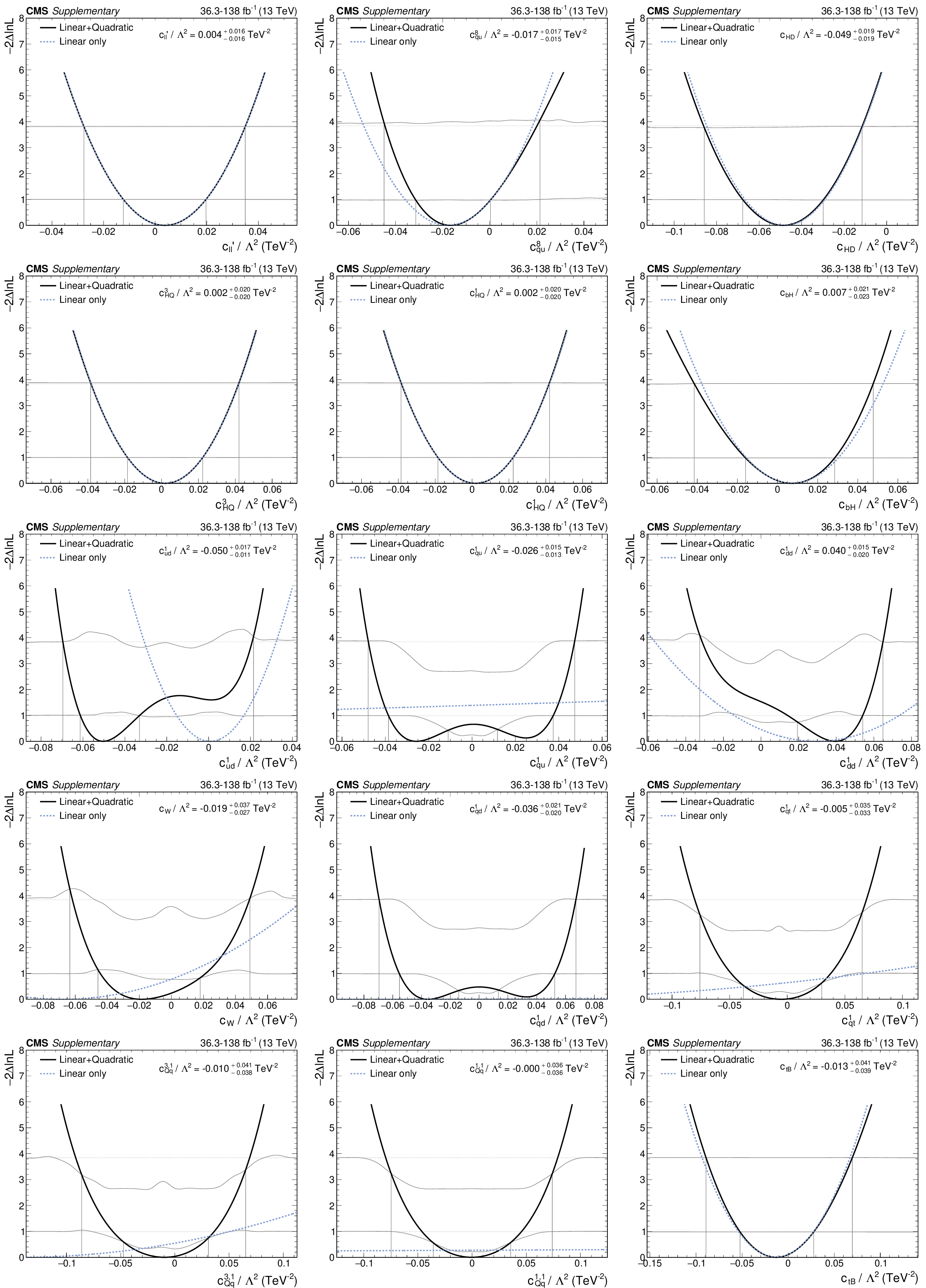 Constraints on individual WCs, showing both the constraints considering only linear terms in the SMEFT parameterization and those considering both linear and quadratic terms. The constraints for each WC are obtained keeping the other coefficients fixed to 0. The shaded areas correspond to the expected 95% confidence intervals, the thick and thin bars to the observed 68% and 95% confidence intervals, respectively. The constraints are scaled by powers of 10 to ensure the constraints on all 64 WCs can be visualized on the same $ y $ axis scale. |