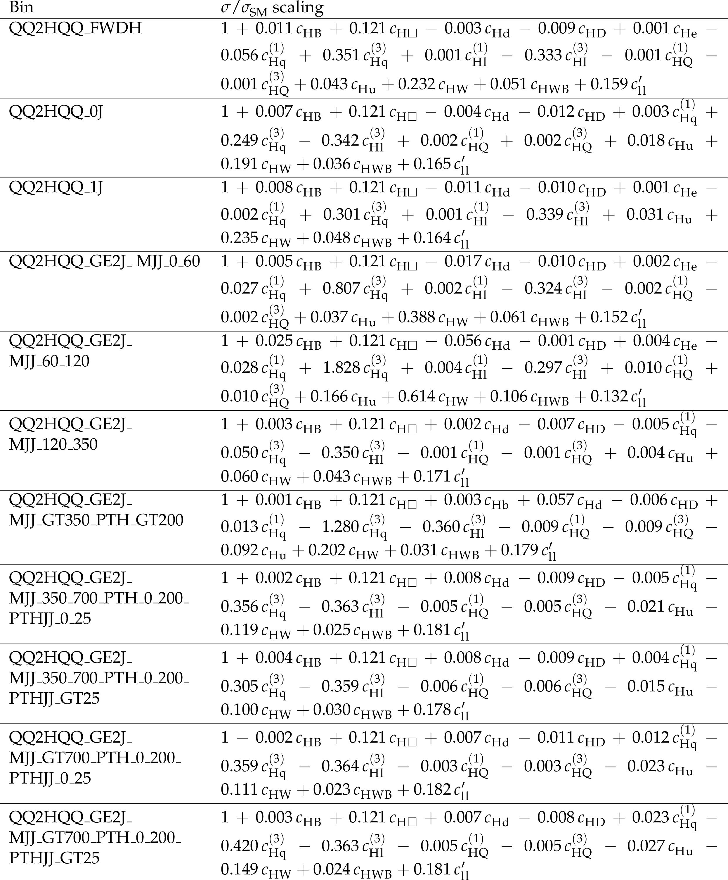 Summary of best fit values and confidence intervals extracted with the asymptotic approximation (grey lines) and with the pseudo-experiment-based method described in this appendix (black lines). The constraints are scaled by powers of 10 to ensure the constraints on all WCs can be visualized on the same $ y $ axis scale. The intervals are generally compatible with each other, with only some small differences visible. |