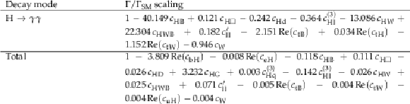 Rotation matrix obtained by performing the PCA on the Hessian matrix of a reduced set of input measurements, $ \mathrm{H}\to\gamma\gamma $, $ \mathrm{W}\gamma $, $ \mathrm{Z}\to\nu\nu $, and WW. Only matrix coefficients with absolute value $ \geq $0.05 are displayed. |