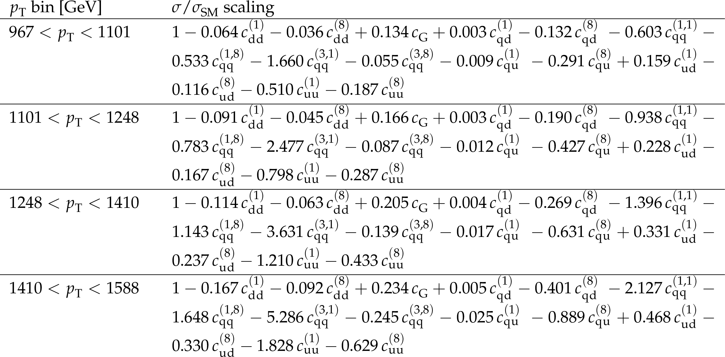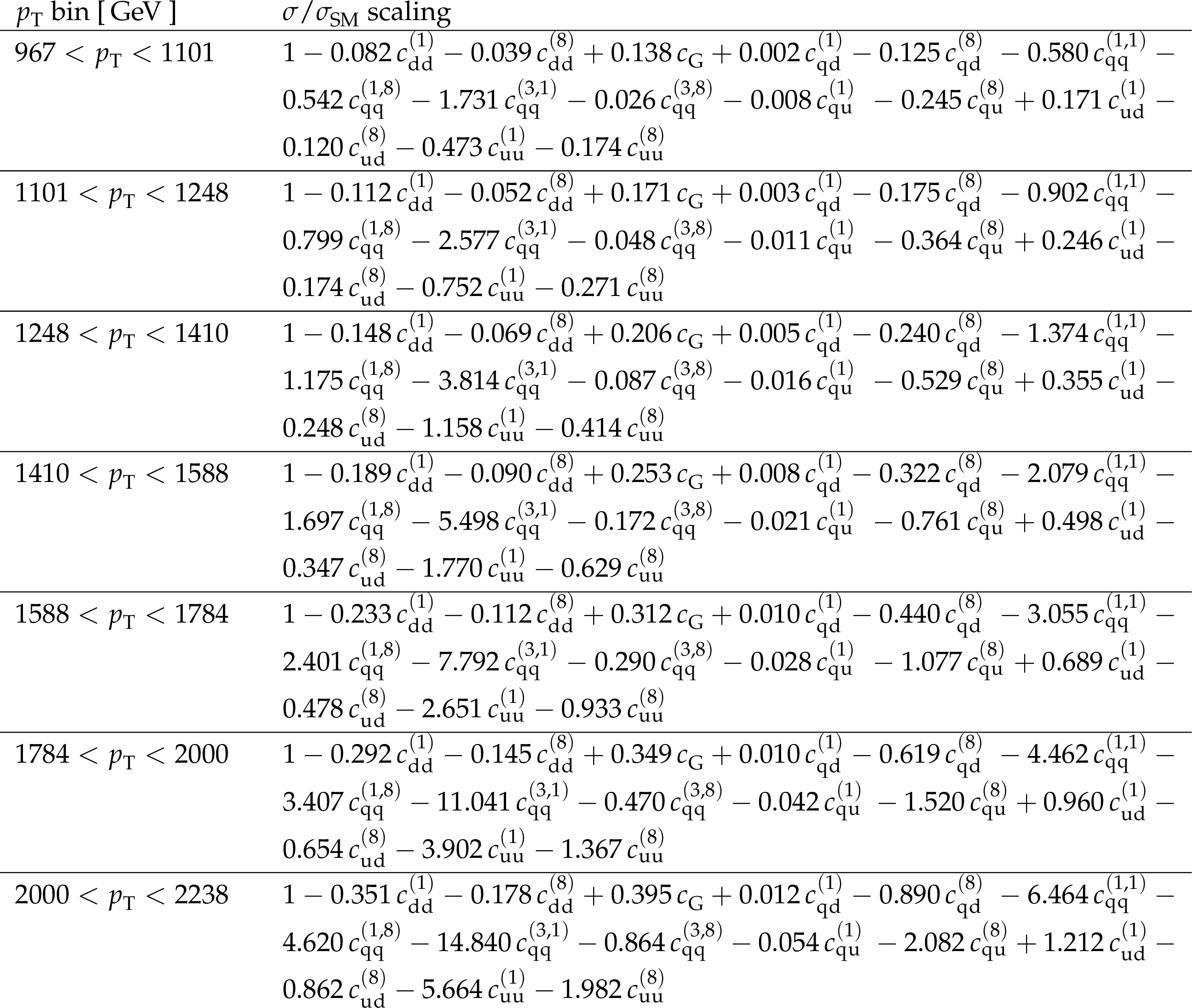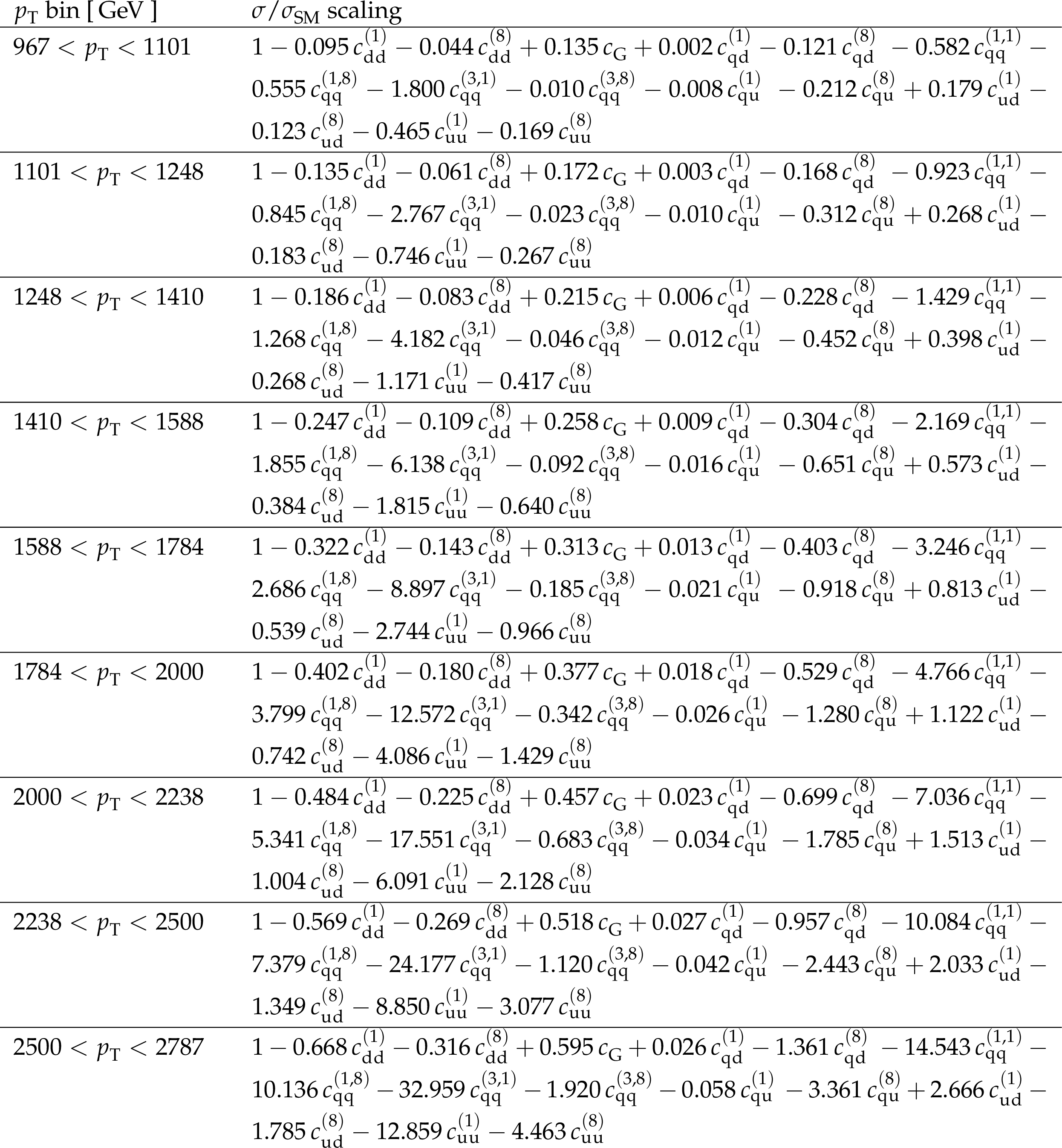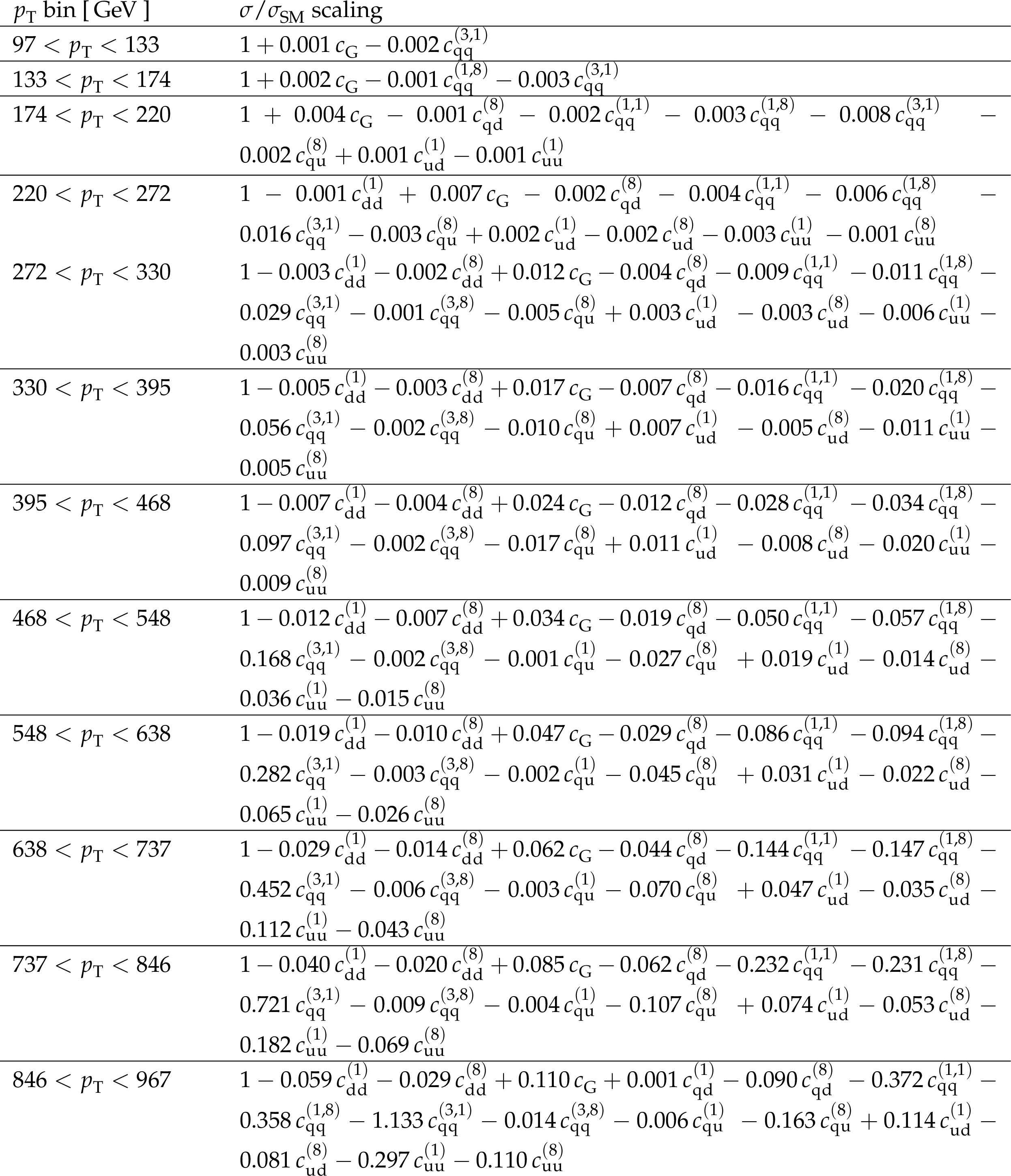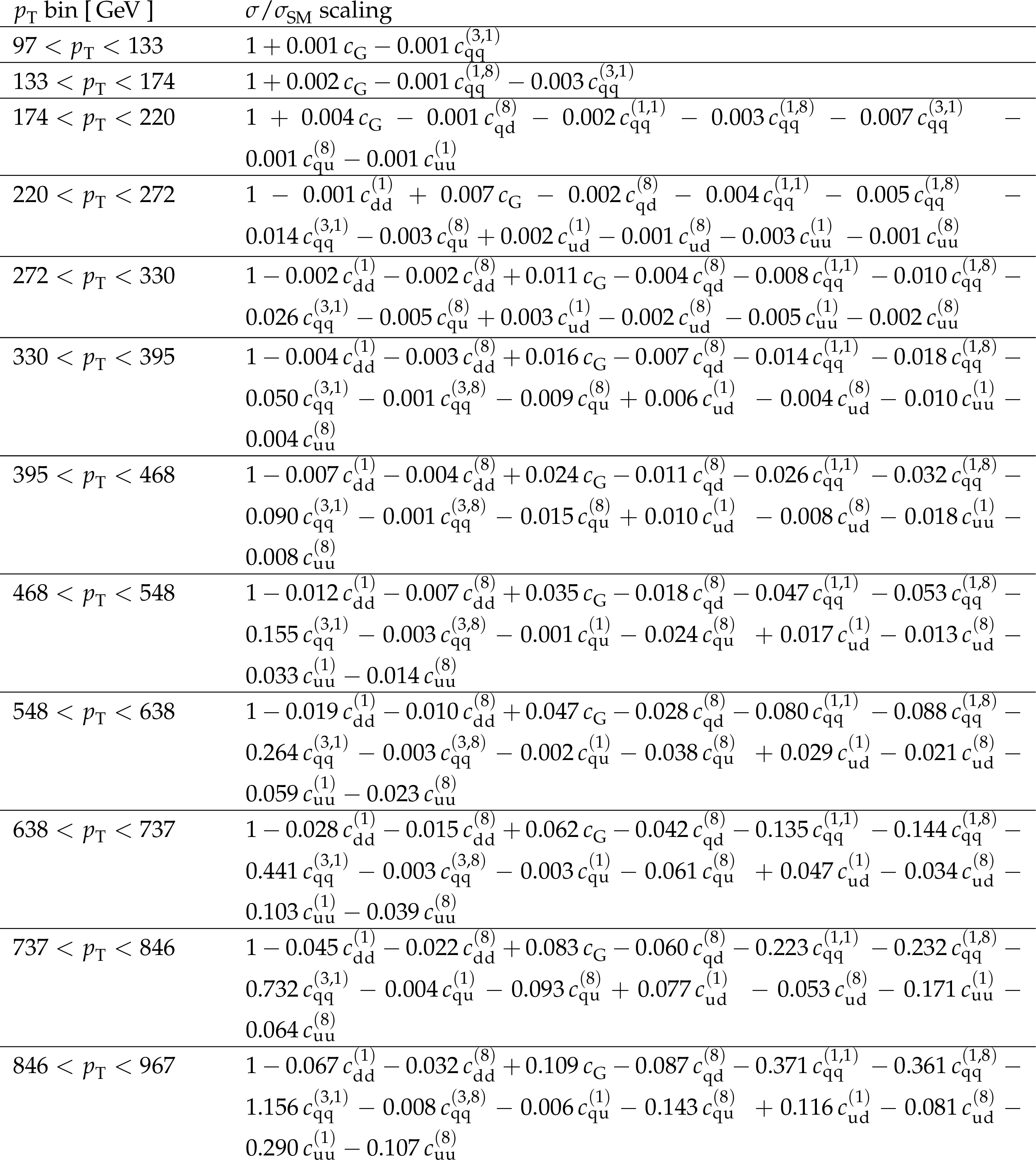 Relative effect of the linear SMEFT terms for the WCs that affect the inclusive jet differential cross sections in the rapidity bins $ (1, 1.5) $ and $ (1.5, 2) $. The parameters $ c_j/\Lambda^2 $ are set to different multiples of 1 TeV$^{-2}$ to ensure the effect of all WCs can be visualized on the same $ y $ axis scale. The upper panel shows the measured values and their uncertainties relative to the predictions in the SM. |