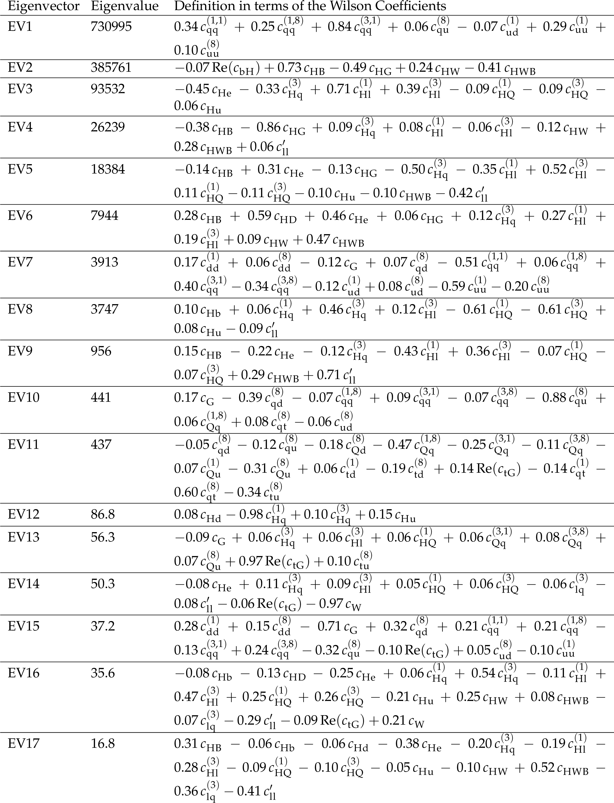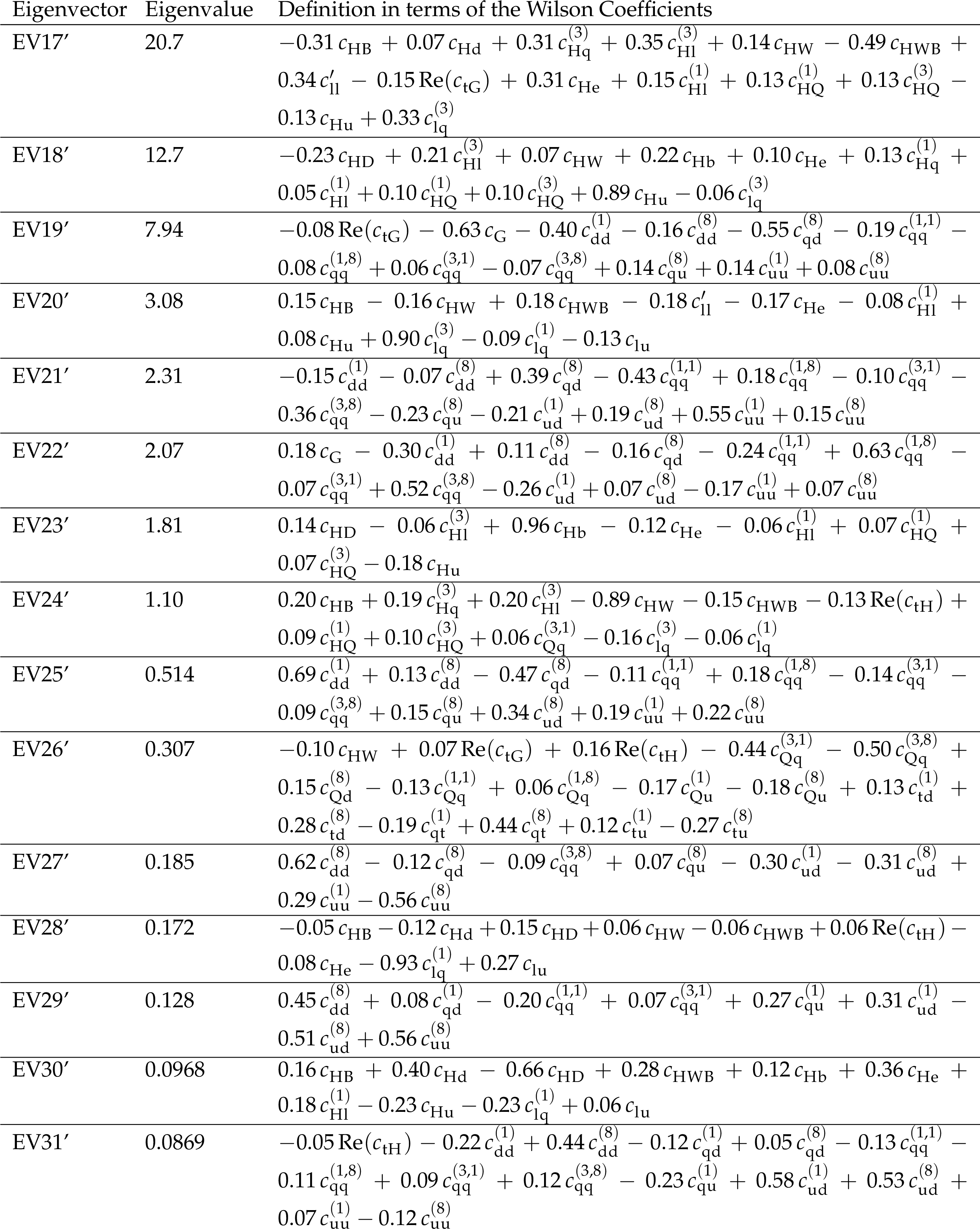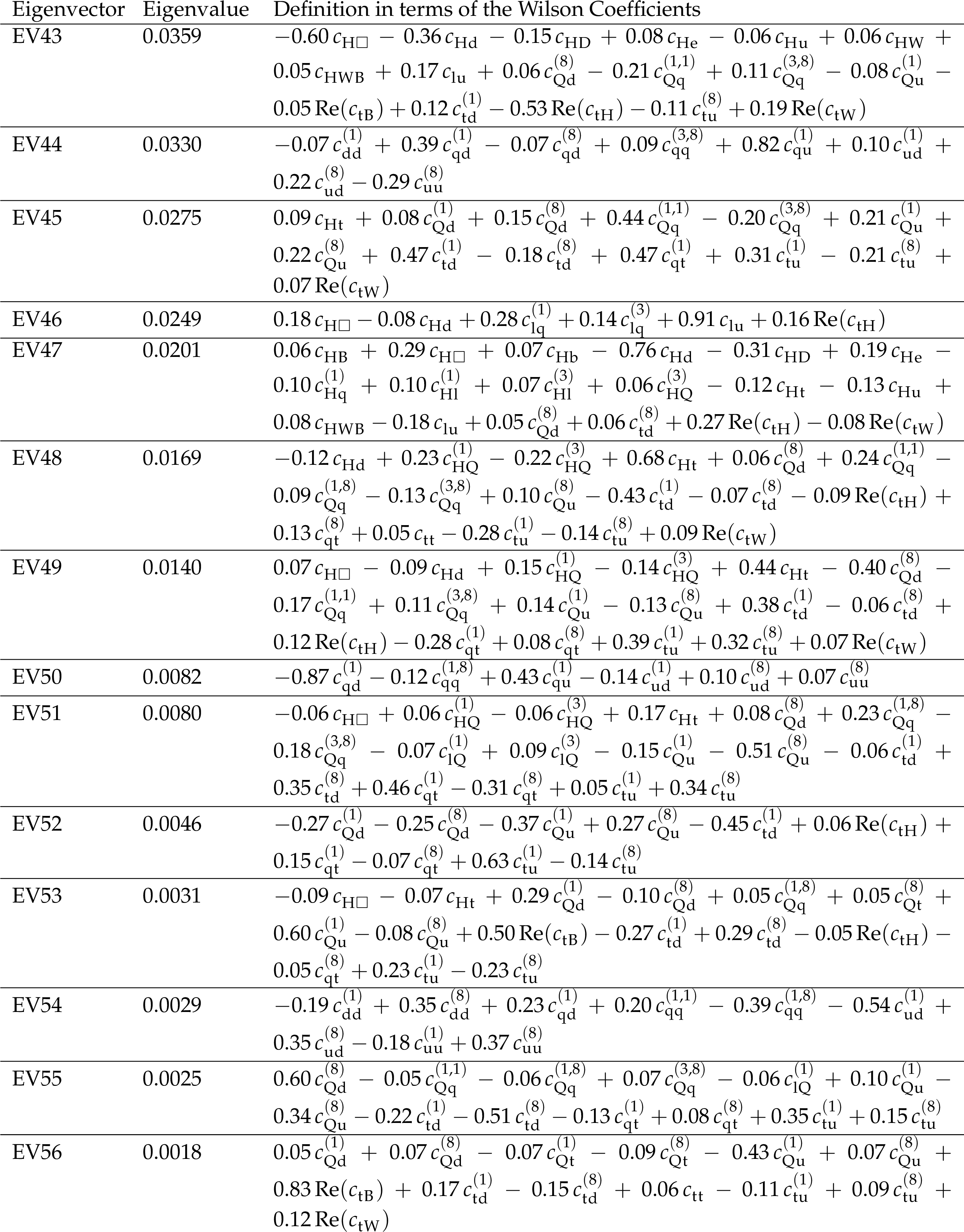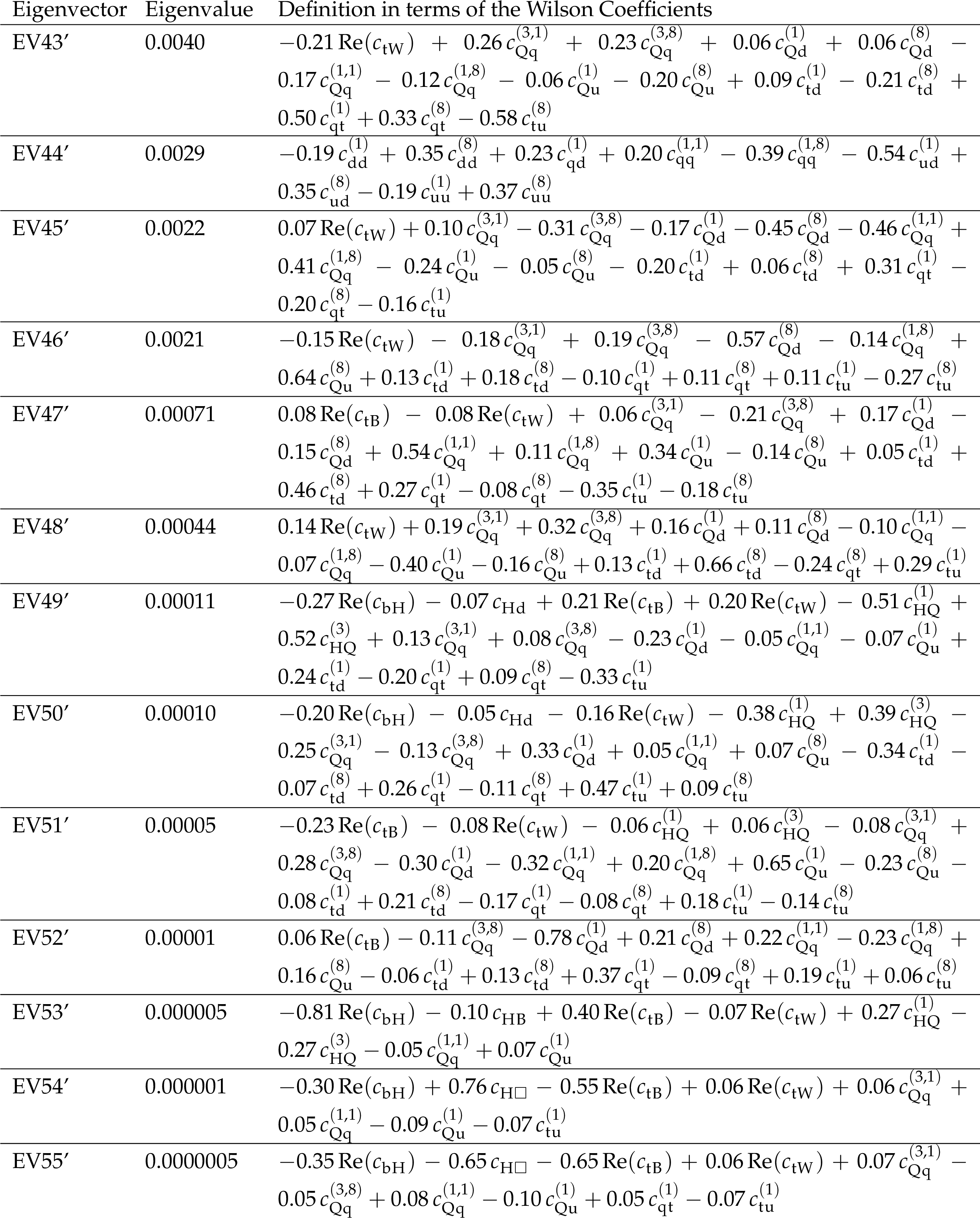 Eigenvectors constrained mostly by the EWPO. Part of the rotation matrix obtained by performing the PCA on the Hessian matrix of the full set of measurements, including the $ \mathrm{t}(\overline{\mathrm{t}})\mathrm{X} $ analysis. |