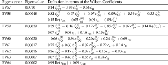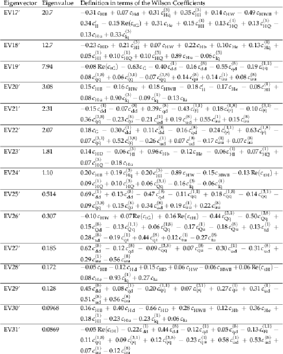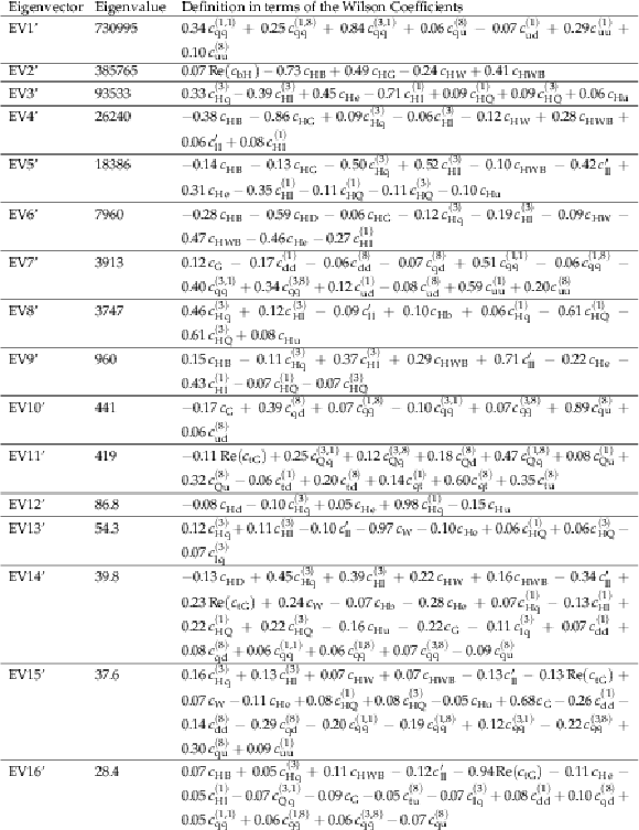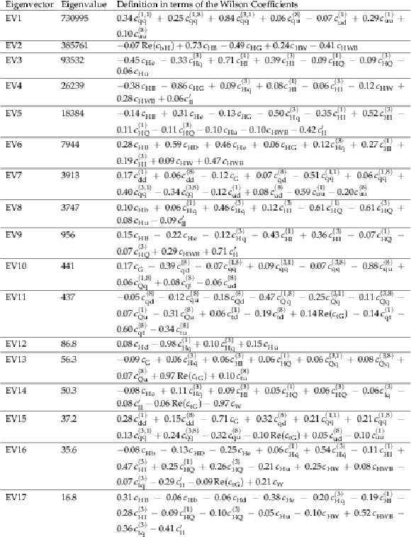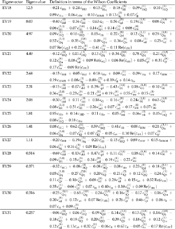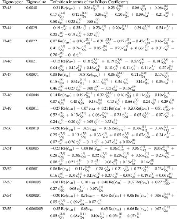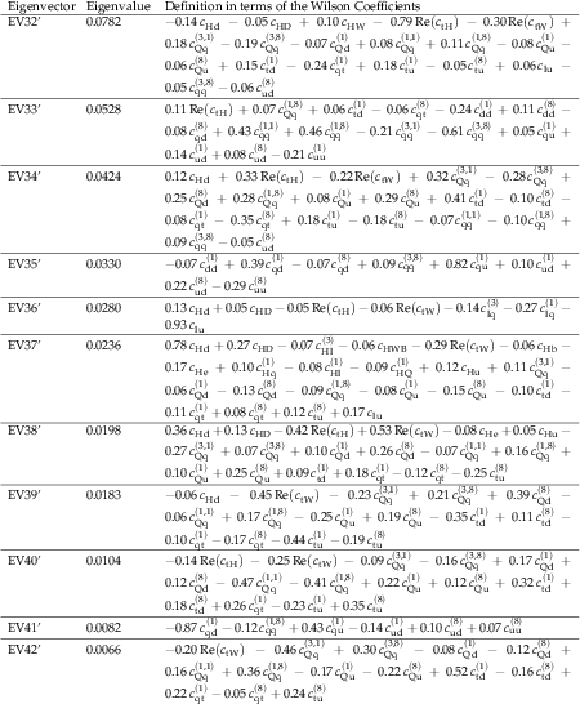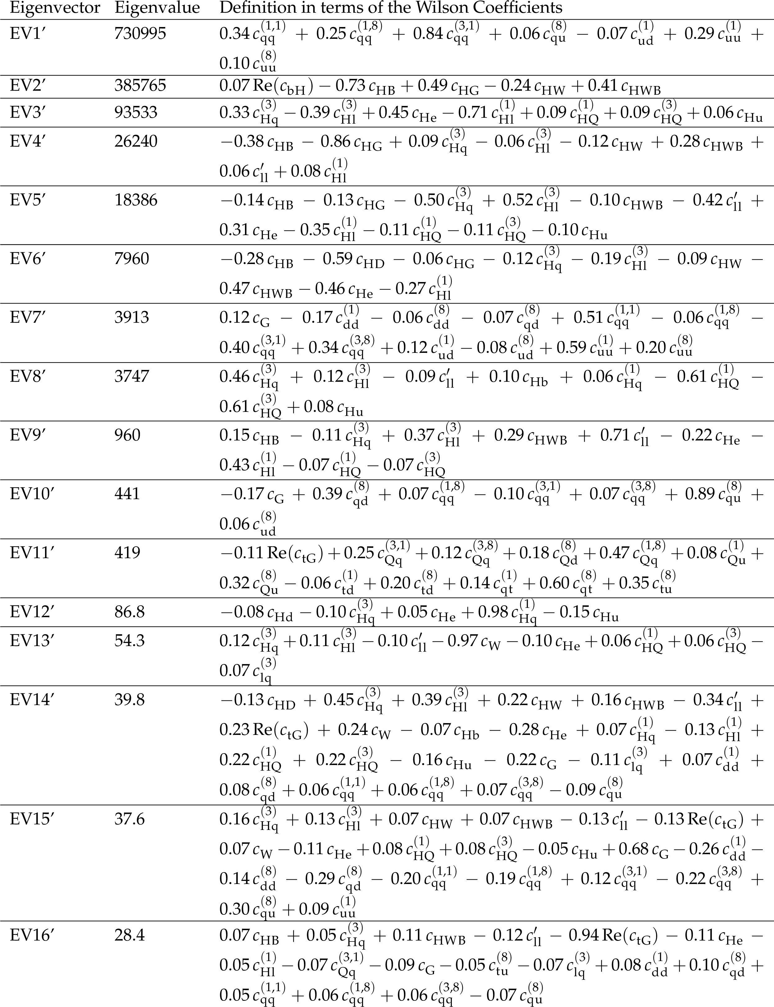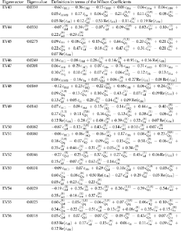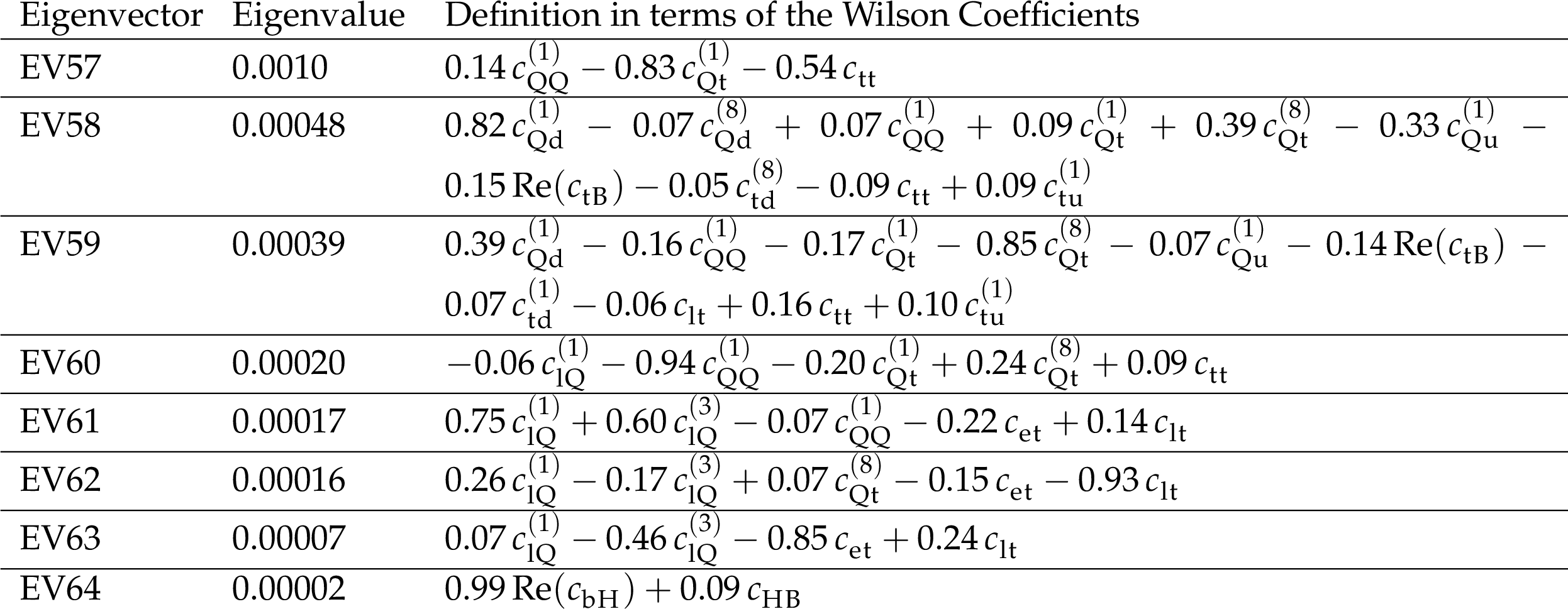 Eigenvectors constrained mostly by the EWPO. Part of the rotation matrix obtained by performing the PCA on the Hessian matrix of the full set of measurements, including the $ \mathrm{t}(\overline{\mathrm{t}})\mathrm{X} $ analysis. |