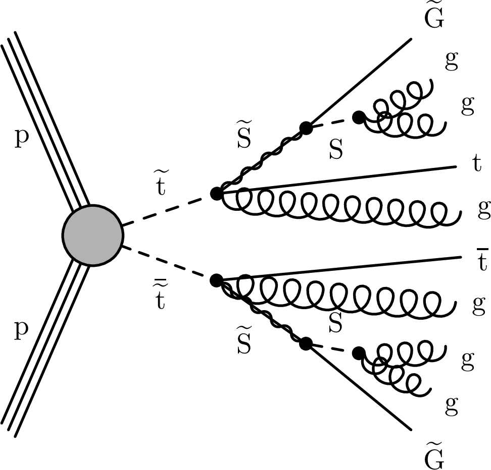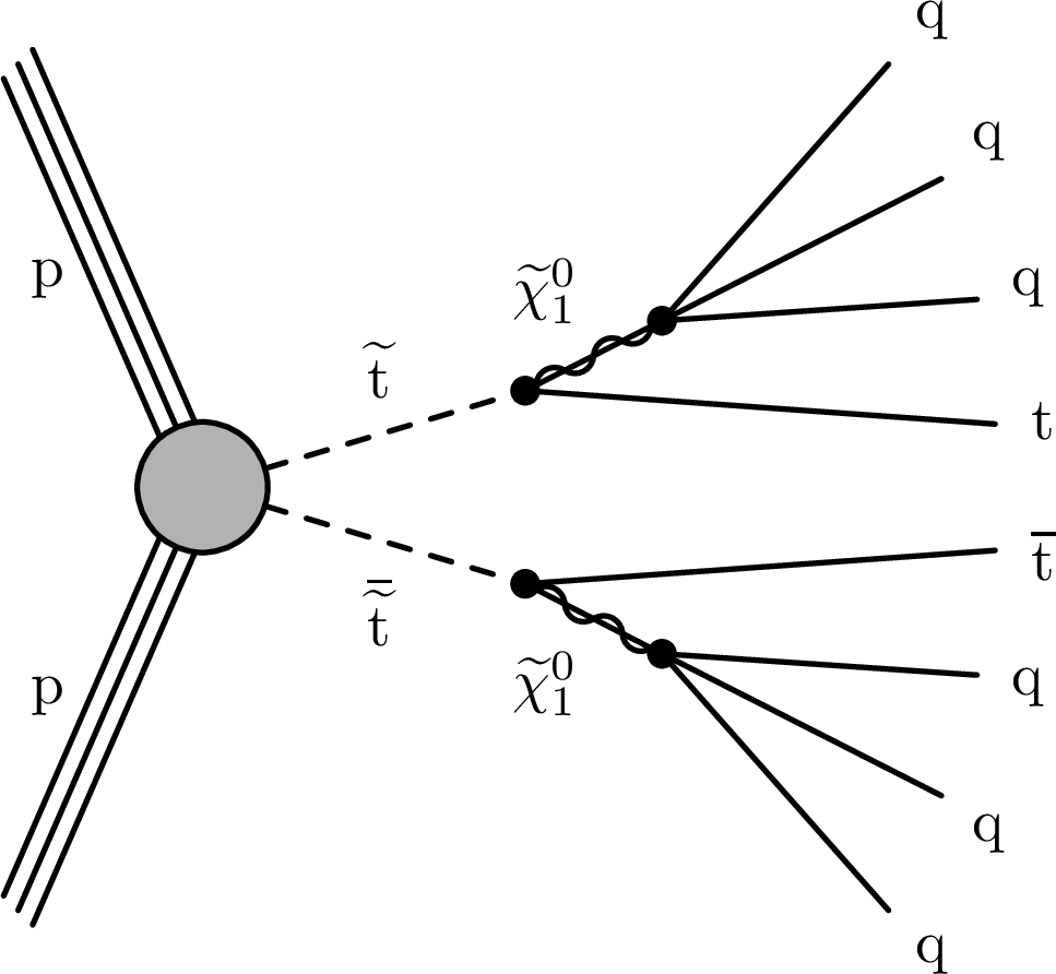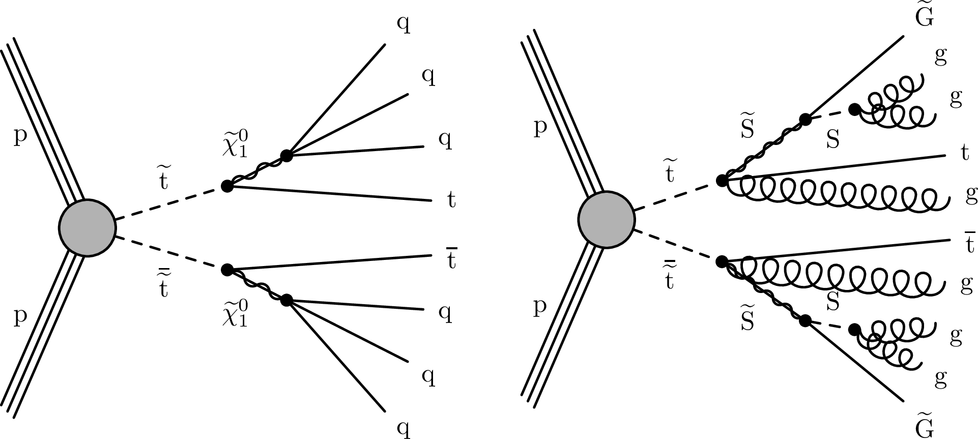 Diagrams of top squark pair production with each squark decaying to a top quark and additional light-flavor quarks for the RPV SUSY model (left) and with each squark decaying to a top quark, gluons, and a gravitino for the stealth $ \mathrm{S}\mathrm{Y} \overline{\mathrm{Y}} $ model (right). |