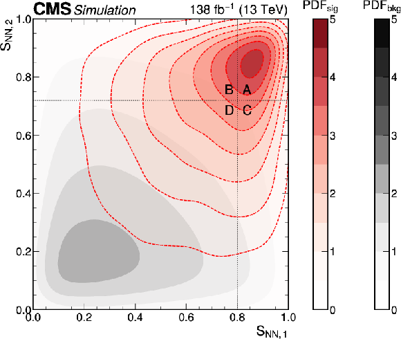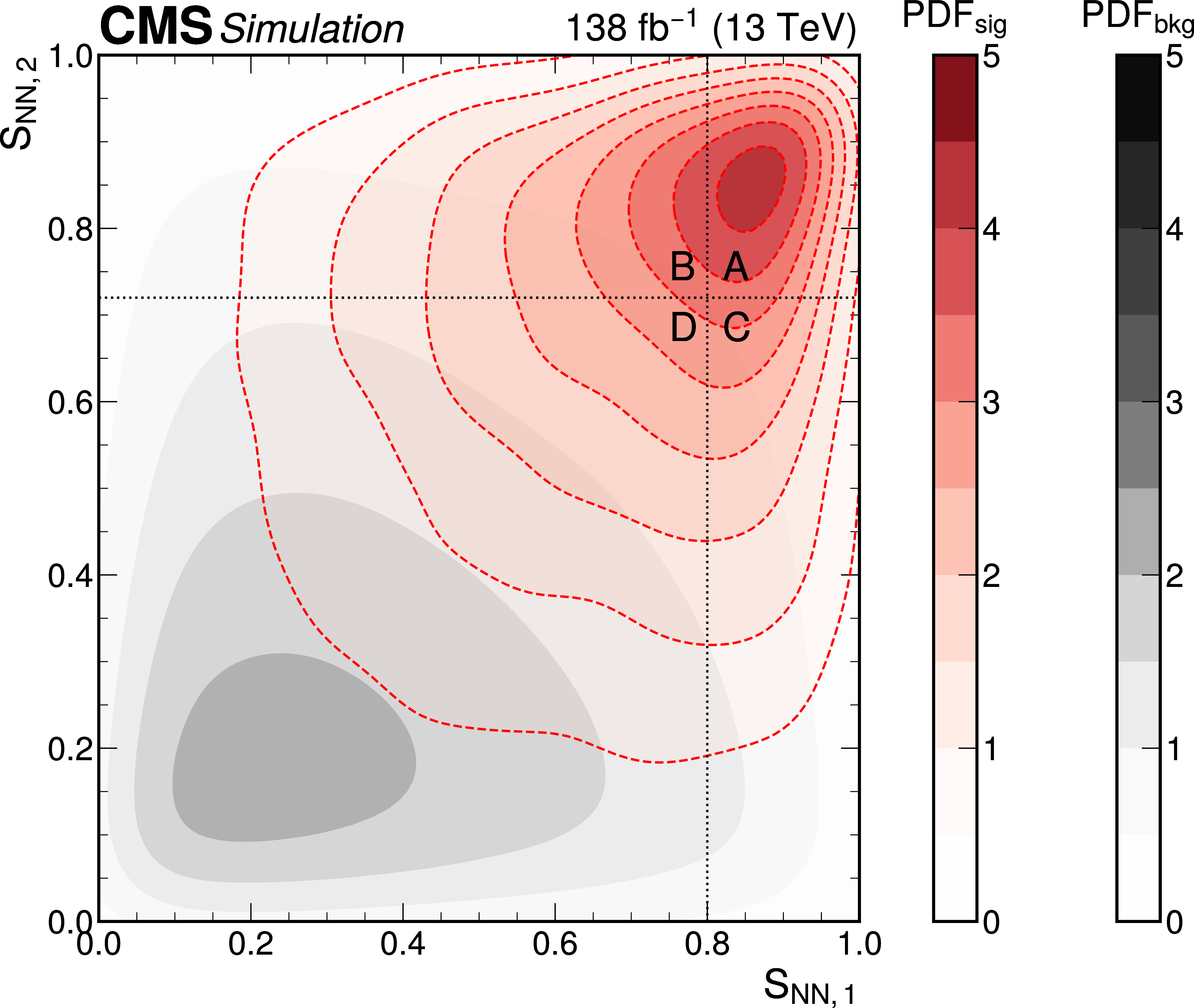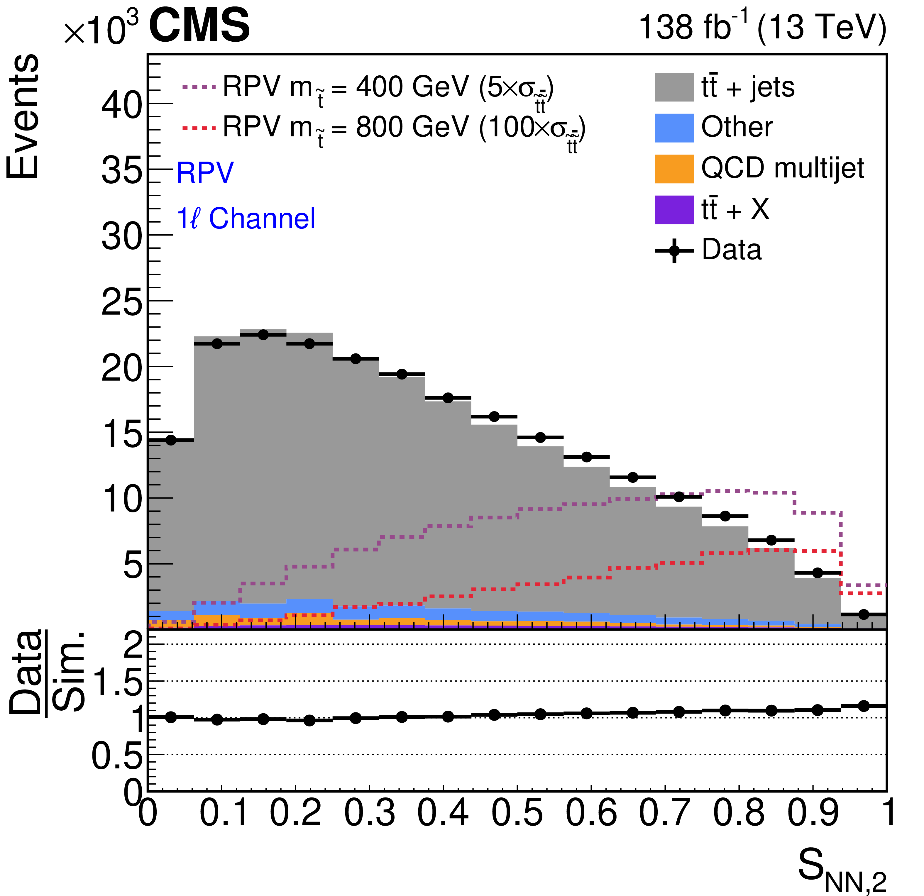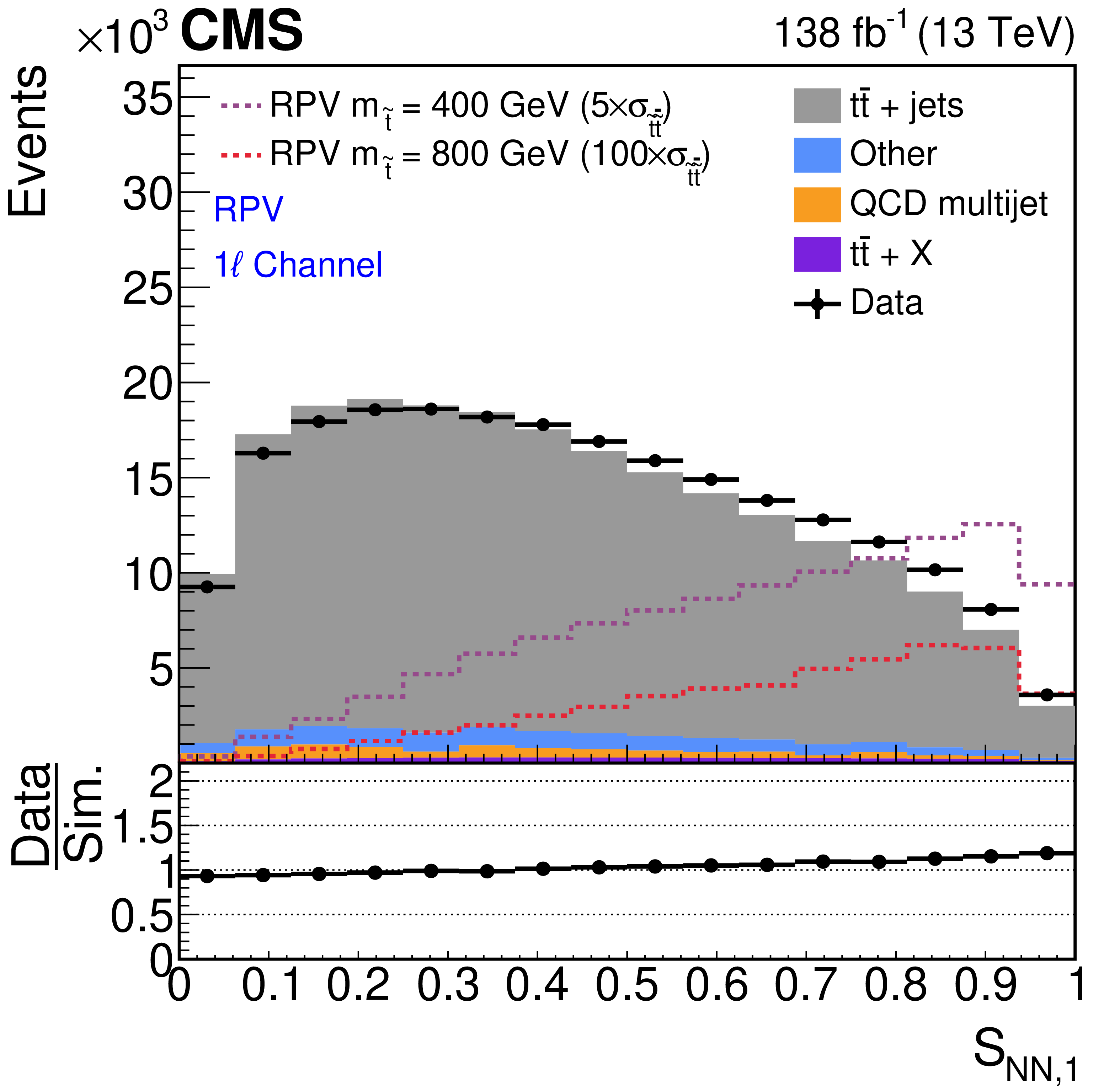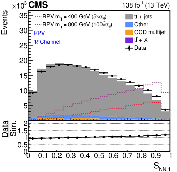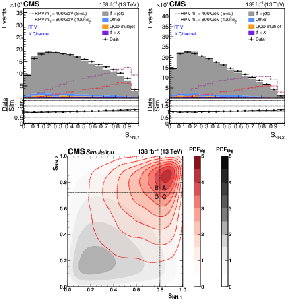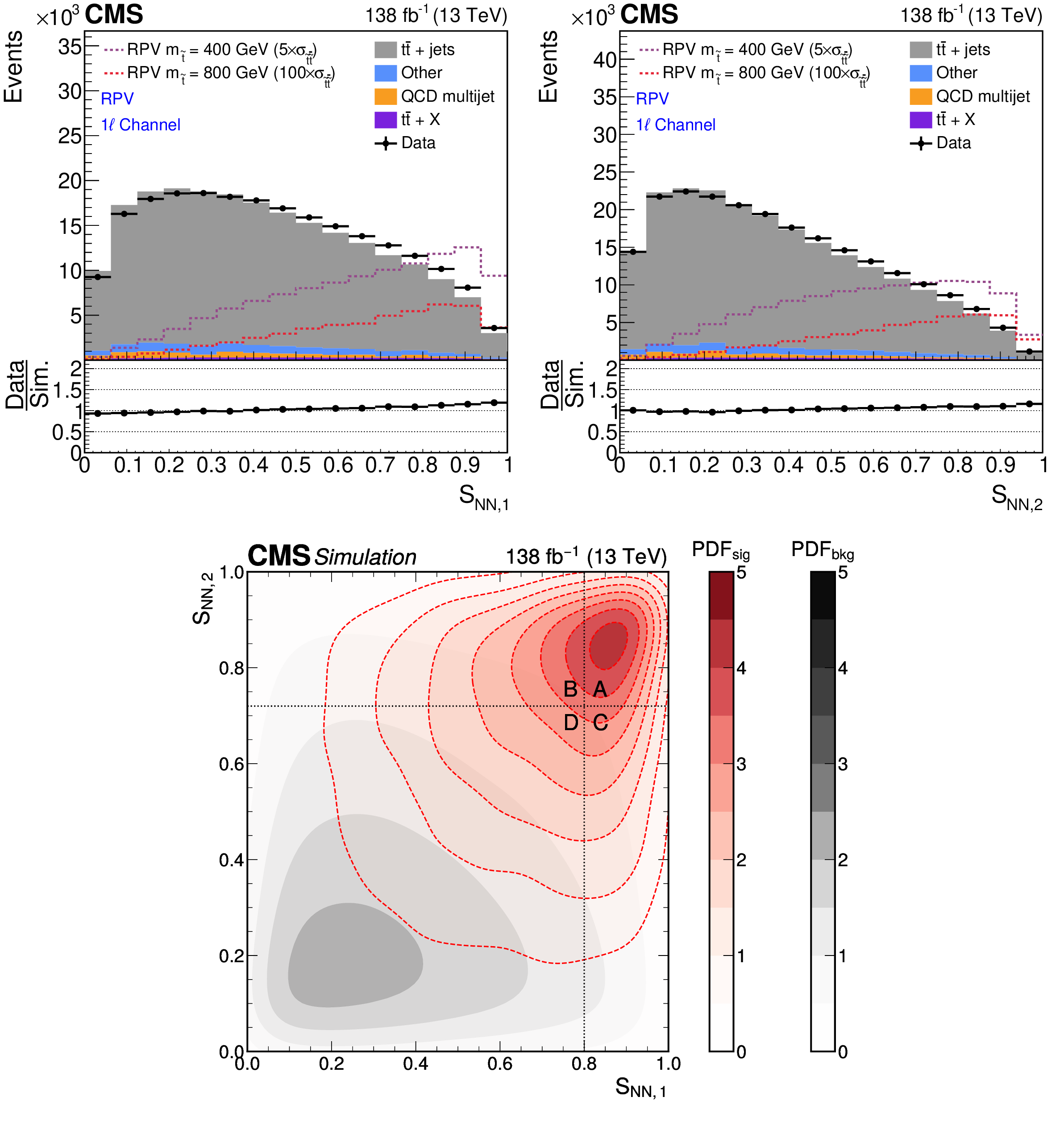 For the RPV signal model and all $ N_\text{jets} $ categories of the 1$ \ell $ channel, distributions of $S_{\mathrm{NN,1}}$ (upper left) and $S_{\mathrm{NN,2}}$ (upper right) for data (black solid line), pre-fit simulated SM backgrounds (stacked filled histograms), and two RPV signal models with $ m_{\tilde{\mathrm{t}}}= $ 400 and 800 GeV (dashed lines) are shown. The lower panel shows the two-dimensional probability density function distribution of $S_{\mathrm{NN,1}}$ and $S_{\mathrm{NN,2}}$ for simulated $ {\mathrm{t}\overline{\mathrm{t}}} + \text{jets} $ events (solid gray) and the RPV signal model with $ m_{\tilde{\mathrm{t}}}= $ 800 GeV (dashed red). The ABCD bin boundaries for this signal model in the 1$ \ell $ channel are shown with dashed vertical and horizontal lines. |