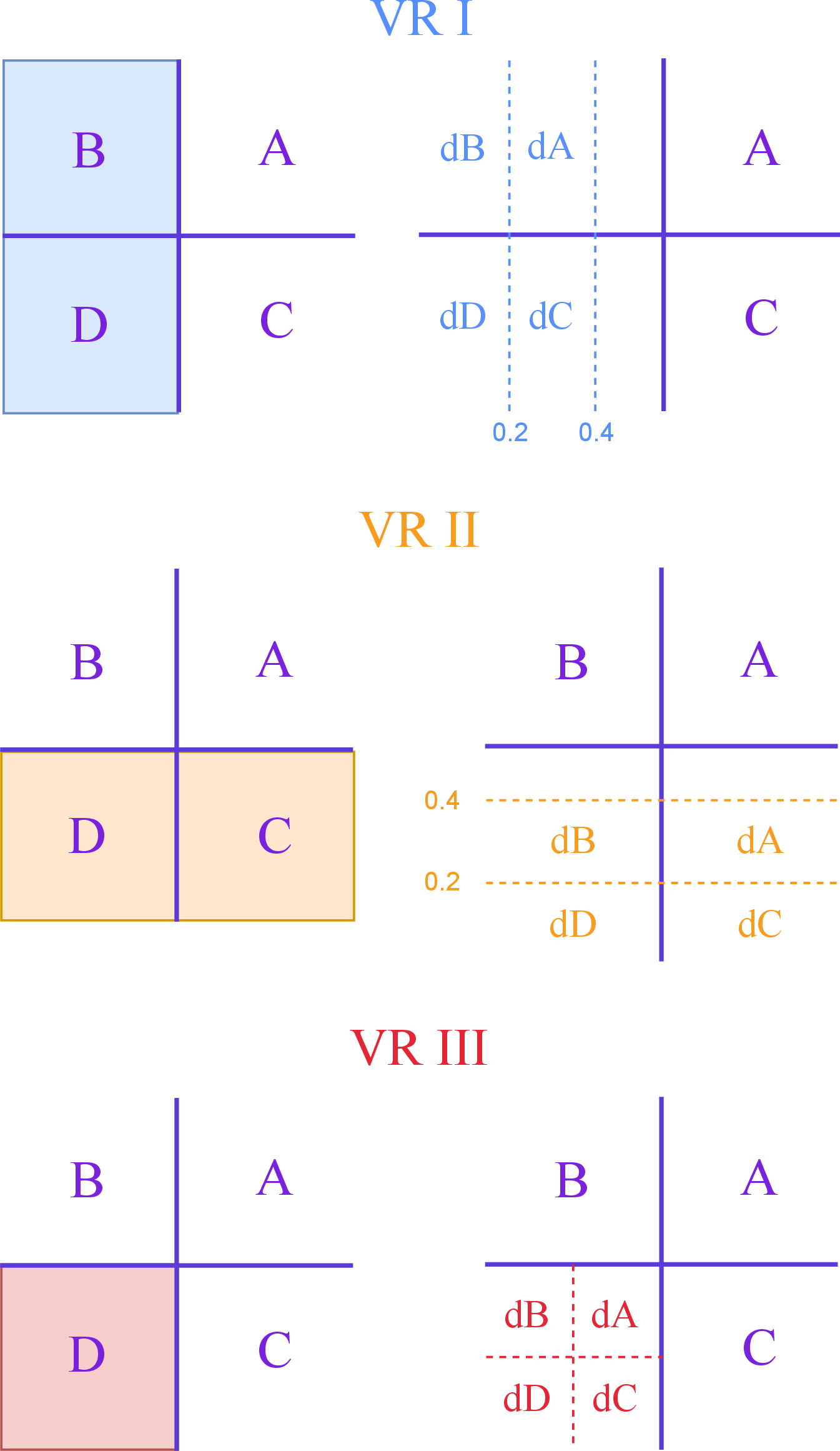 Illustrations of the three validation regions that are created by partitioning the $S_{\mathrm{NN,1}}$-$S_{\mathrm{NN,2}}$ plane. VR I (VR II), shown in the upper (middle) row, is a division of the $ B $ and $ D $ ($ C $ and $ D $) regions. VR III (lower row) is a division of the $ D $ region. Each VR is divided into four subregions (d$ A $, d$ B $, d$ C $, d$ D $) that are used to perform the validation of the nonclosure of the $S_{\mathrm{NN,1}}$-$S_{\mathrm{NN,2}}$ plane. The subregion boundaries shown in the figure are the starting points of the stepping procedure explained in the text. |