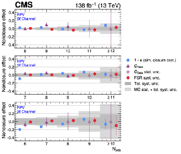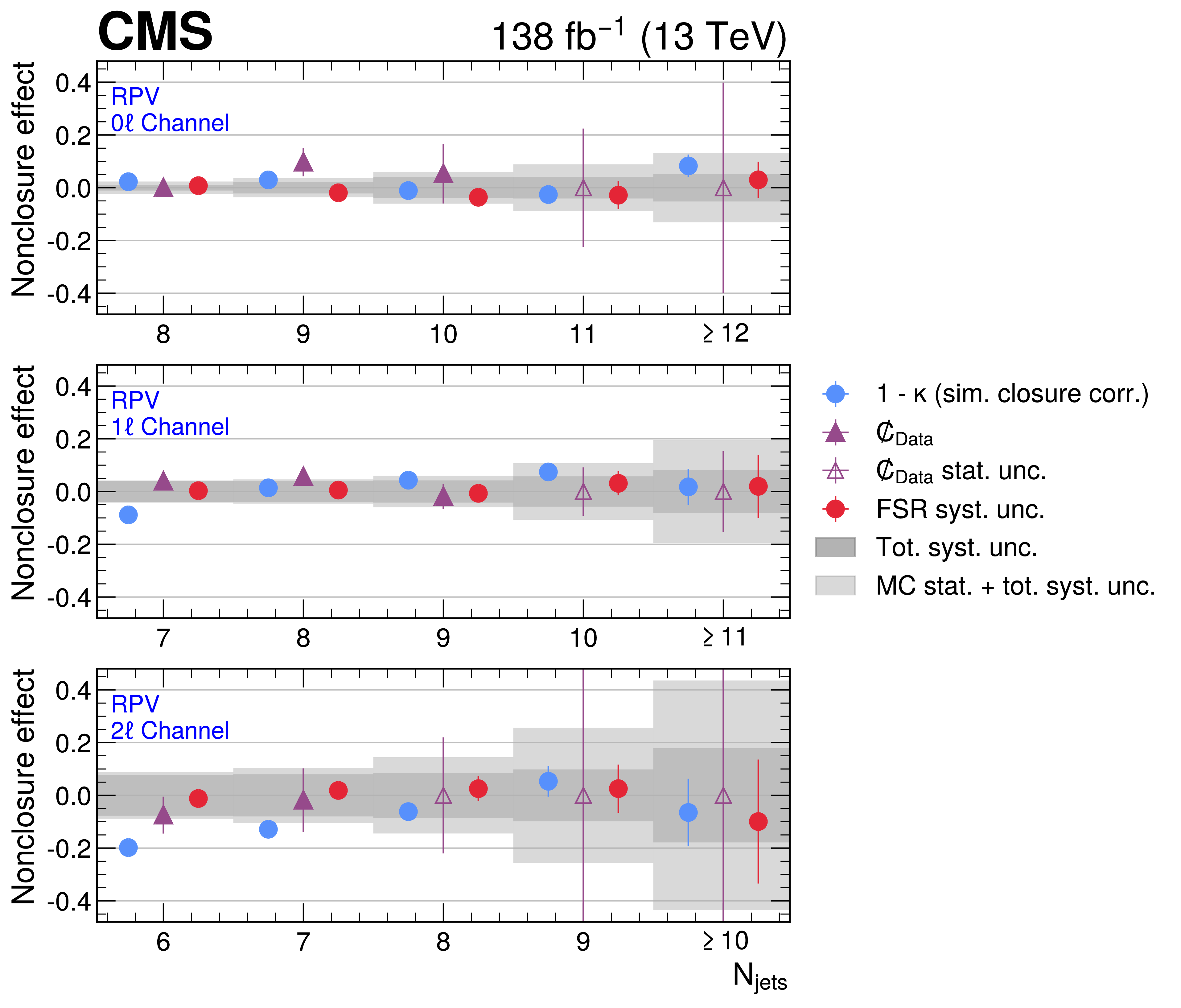 One minus the simulation-based closure correction $ \kappa $ (blue circle), the residual nonclosure $ {C}\hspace{-0.70em}/\kern 0.0em $ in data (solid purple triangle), and the FSR systematic uncertainty (red circle) are shown for each $ N_\text{jets} $ category for the 0$ \ell $ (upper), 1$ \ell $ (middle), and 2$ \ell $ (lower panel) channels. All values correspond to the low-mass optimization for the RPV signal model. The value of $ {C}\hspace{-0.70em}/\kern 0.0em $ shown is the maximum value of the stepping procedure described in the text. Note the data-based nonclosure systematic uncertainty is defined to be the nonclosure in the lowest $ N_\text{jets} $ bin for each of the channels. Open purple triangles show the statistical uncertainty in $ {C}\hspace{-0.70em}/\kern 0.0em $ in data for categories in which all VR and ABCD boundaries have a signal fraction exceeding 5%. All data-based nonclosure values are calculated after applying the simulation-based closure correction, such that an observed nonclosure of zero signifies identical modeling of the $S_{\mathrm{NN,1}}$-$S_{\mathrm{NN,2}}$ correlation in simulation and data. |