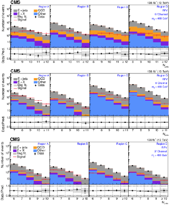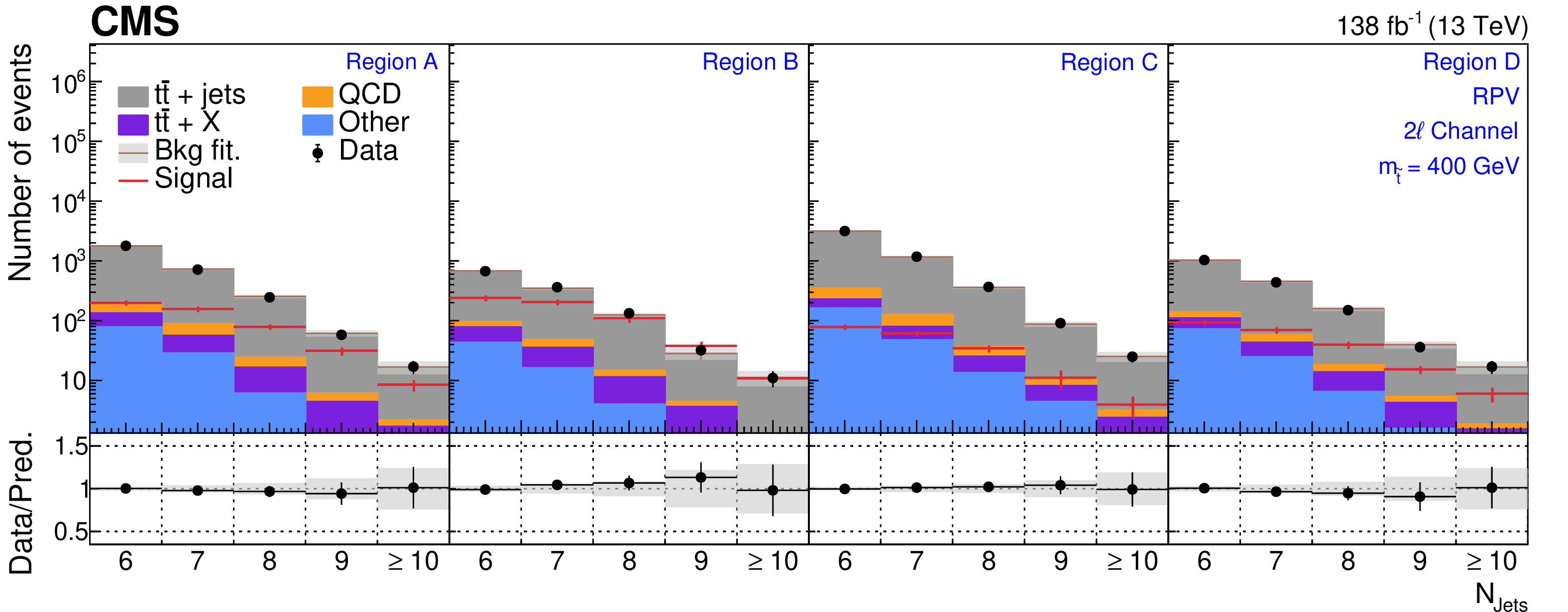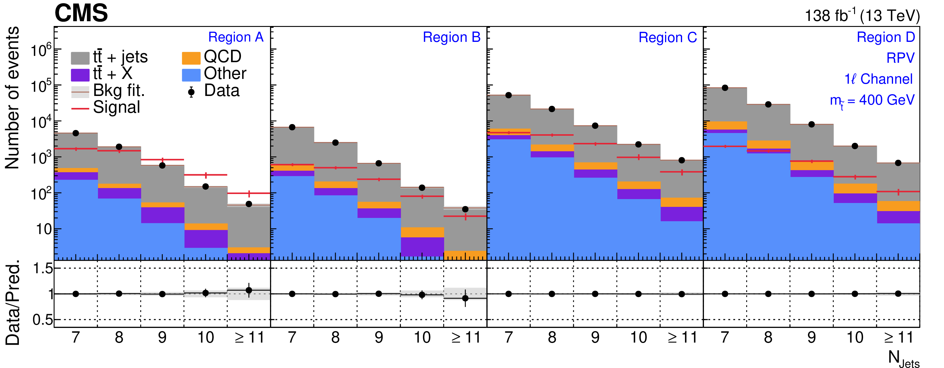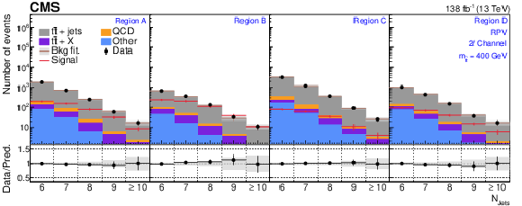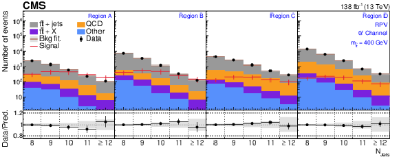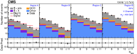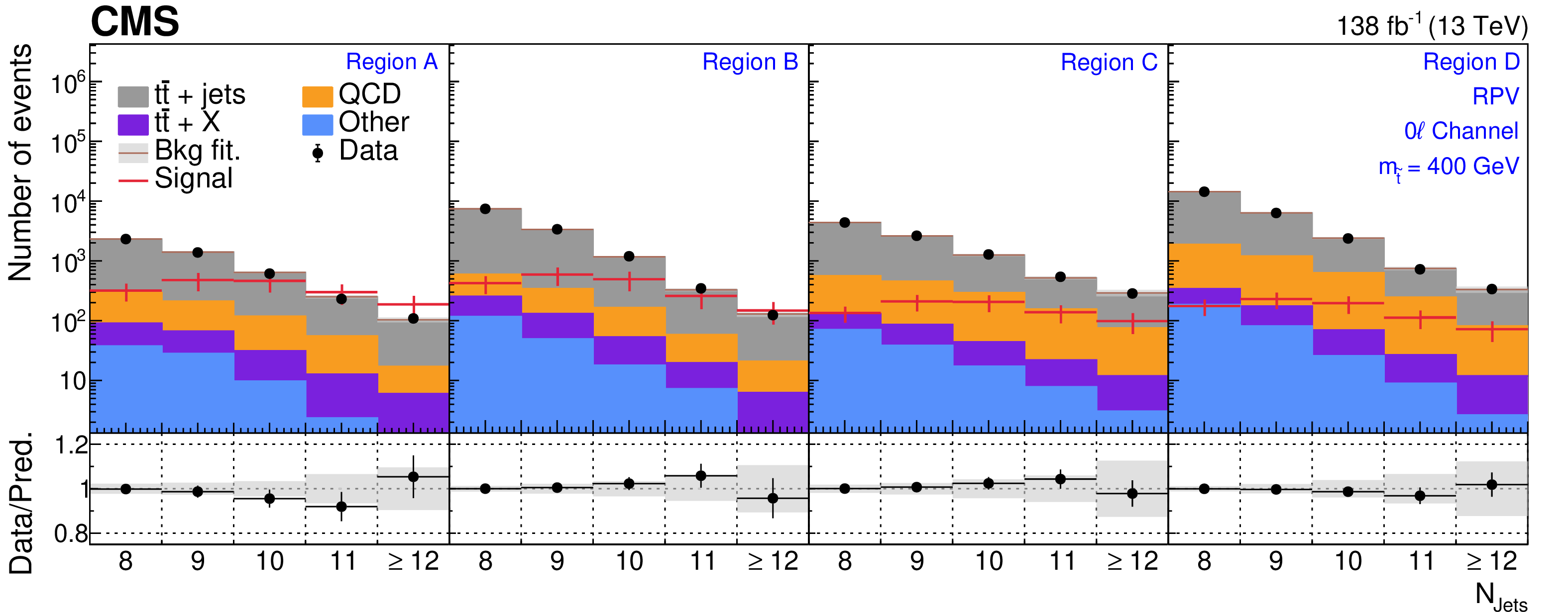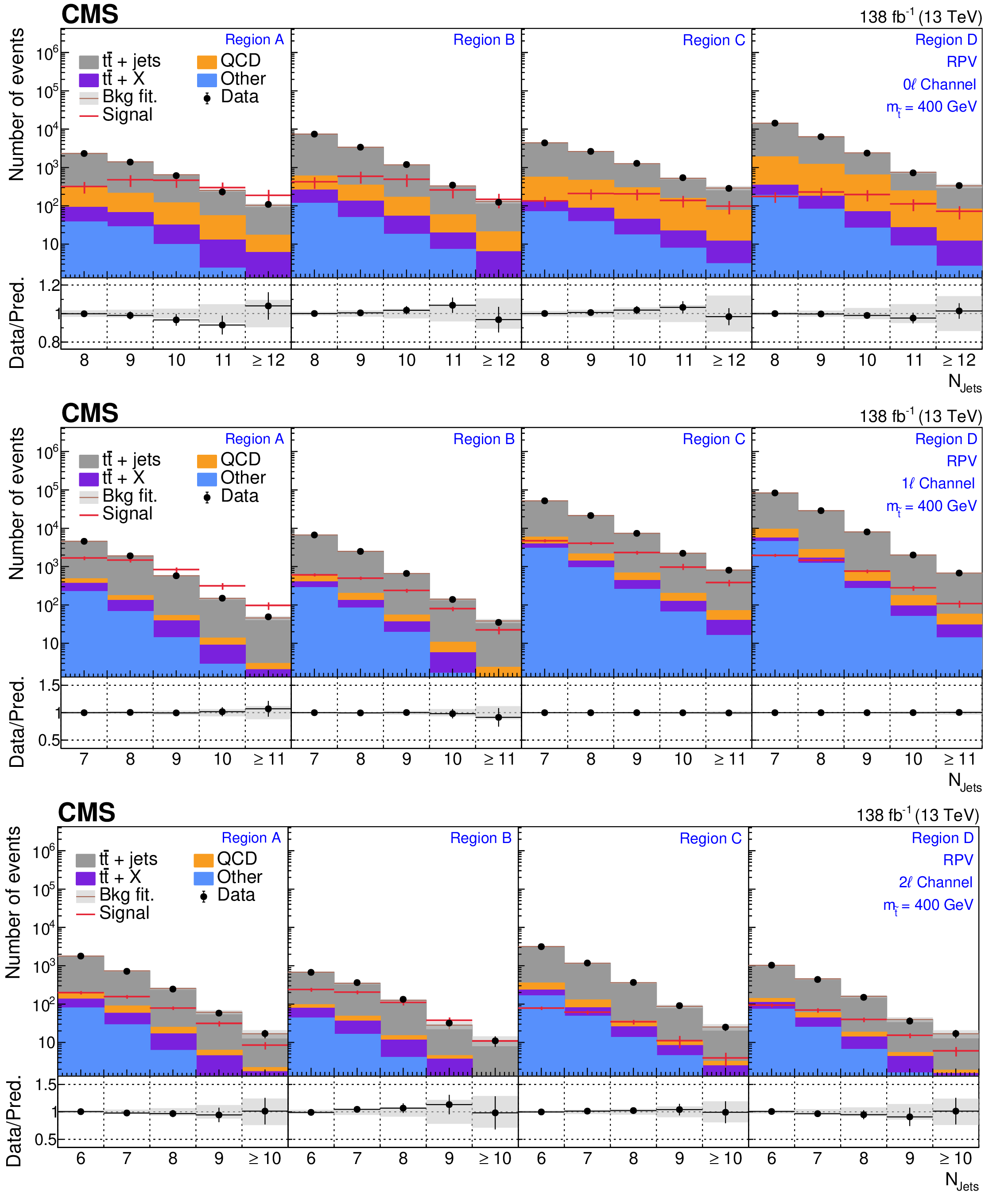 The $ N_\text{jets} $ distributions from the background-only fits to data. Fits are run with the signal strength fixed to zero and all background process event yields are obtained from their fit predictions. The signal distribution overlaid corresponds to the RPV model with $ m_{\tilde{\mathrm{t}}} = $ 400 GeV. The graphs in the upper, middle, and lower rows correspond to the 0$ \ell $, 1$ \ell $, and 2$ \ell $ channels, respectively. The four panels in each row show the $ N_\text{jets} $ distributions for the $ A $, $ B $, $ C $, and $ D $ regions (left to right). The gray error band shows the combined statistical and systematic uncertainty from the background-only fit distributions. |