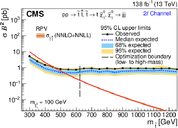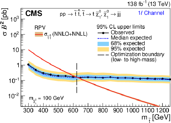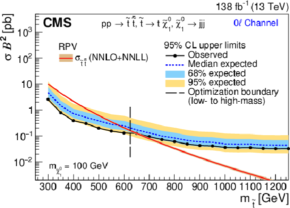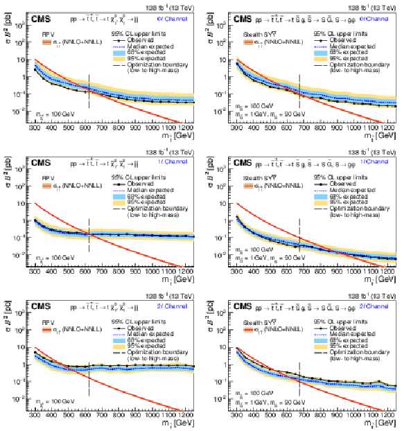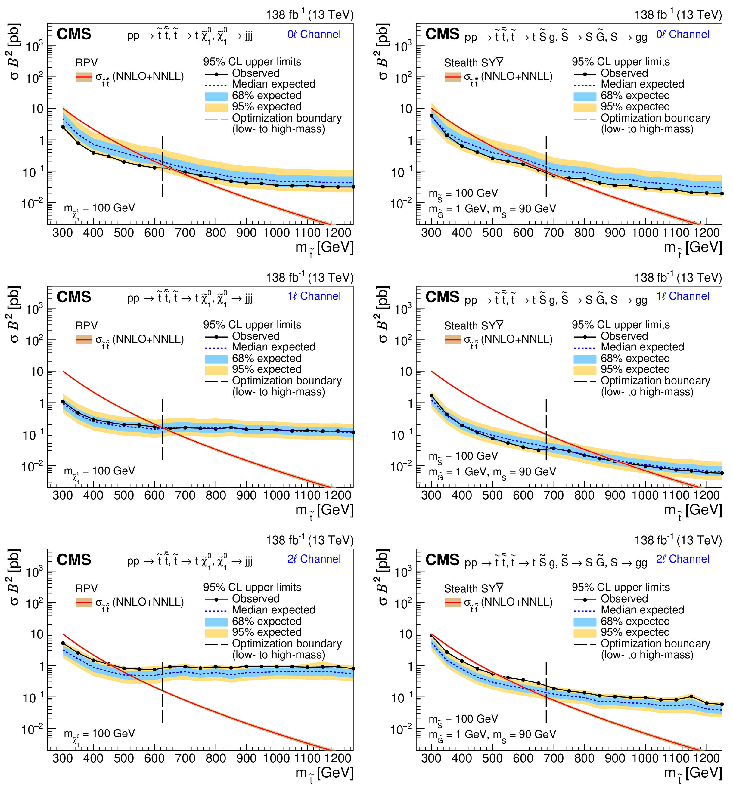 The 95% CL upper limit on $ \sigma_{\tilde{\mathrm{t}}\overline{\tilde{\mathrm{t}}}} $ for the RPV (left) and stealth $ \mathrm{S}\mathrm{Y} \overline{\mathrm{Y}} $ (right) SUSY signal models as a function of $ m_{\tilde{\mathrm{t}}} $ for the 0$ \ell $ channel (upper), 1$ \ell $ channel (middle), and 2$ \ell $ channel (lower), assuming 100% branching fraction to the considered $ \tilde{\mathrm{t}} $ squark decay. The median expected limit is shown in the dashed blue line, with the 68 and 95% intervals shown in light-blue and yellow, respectively. The observed limit is shown in black. The vertical dashed line denotes the transition from the low- to high-mass optimization ABCD boundaries. Additionally, the theoretical cross section is shown in red with its uncertainty in light brown. |