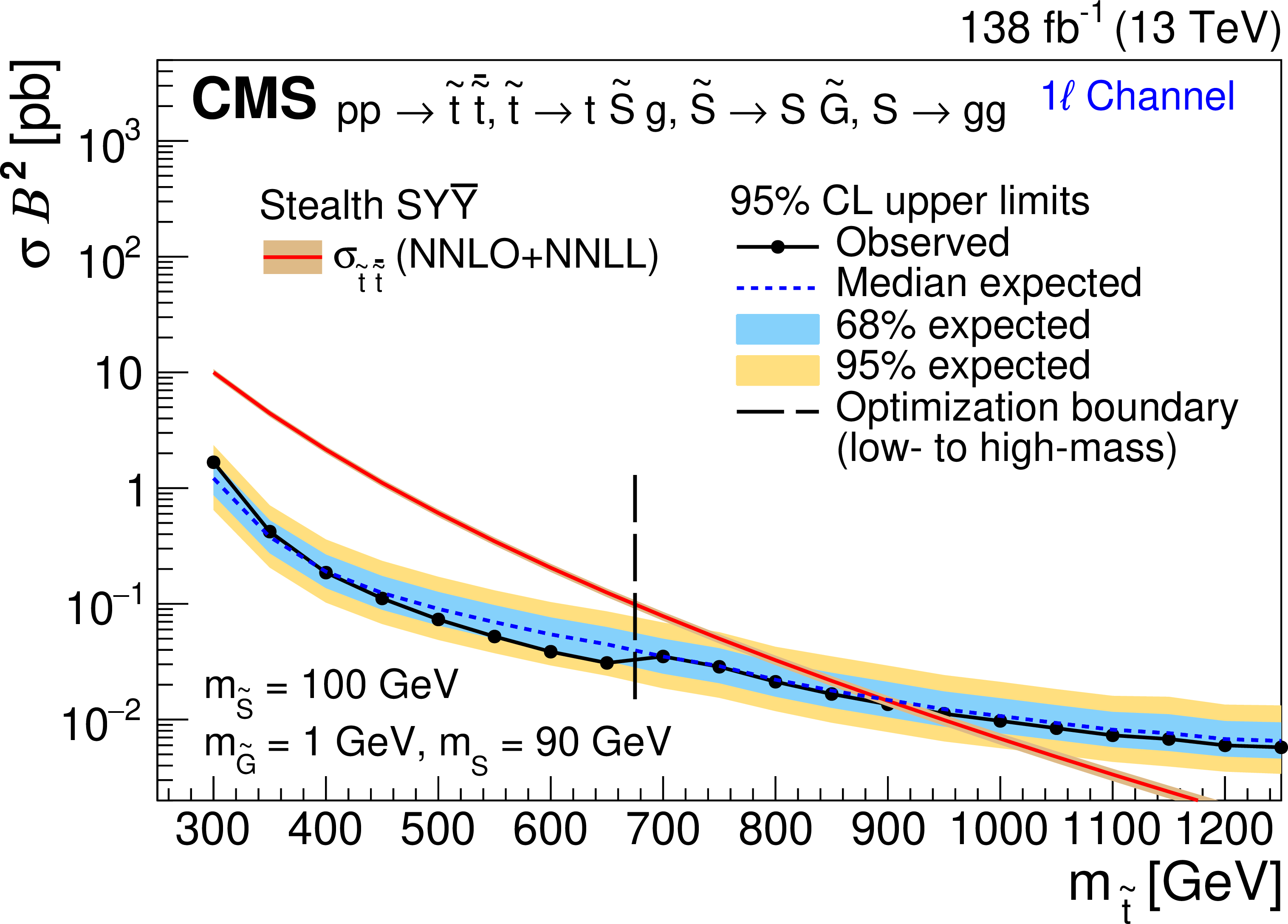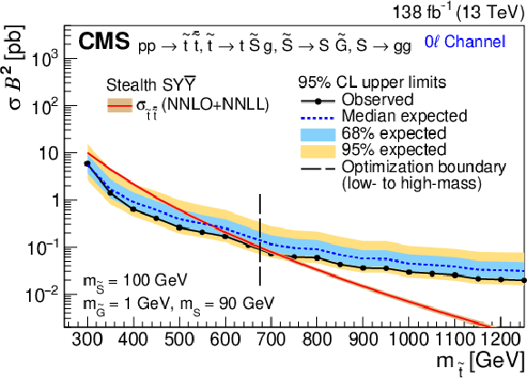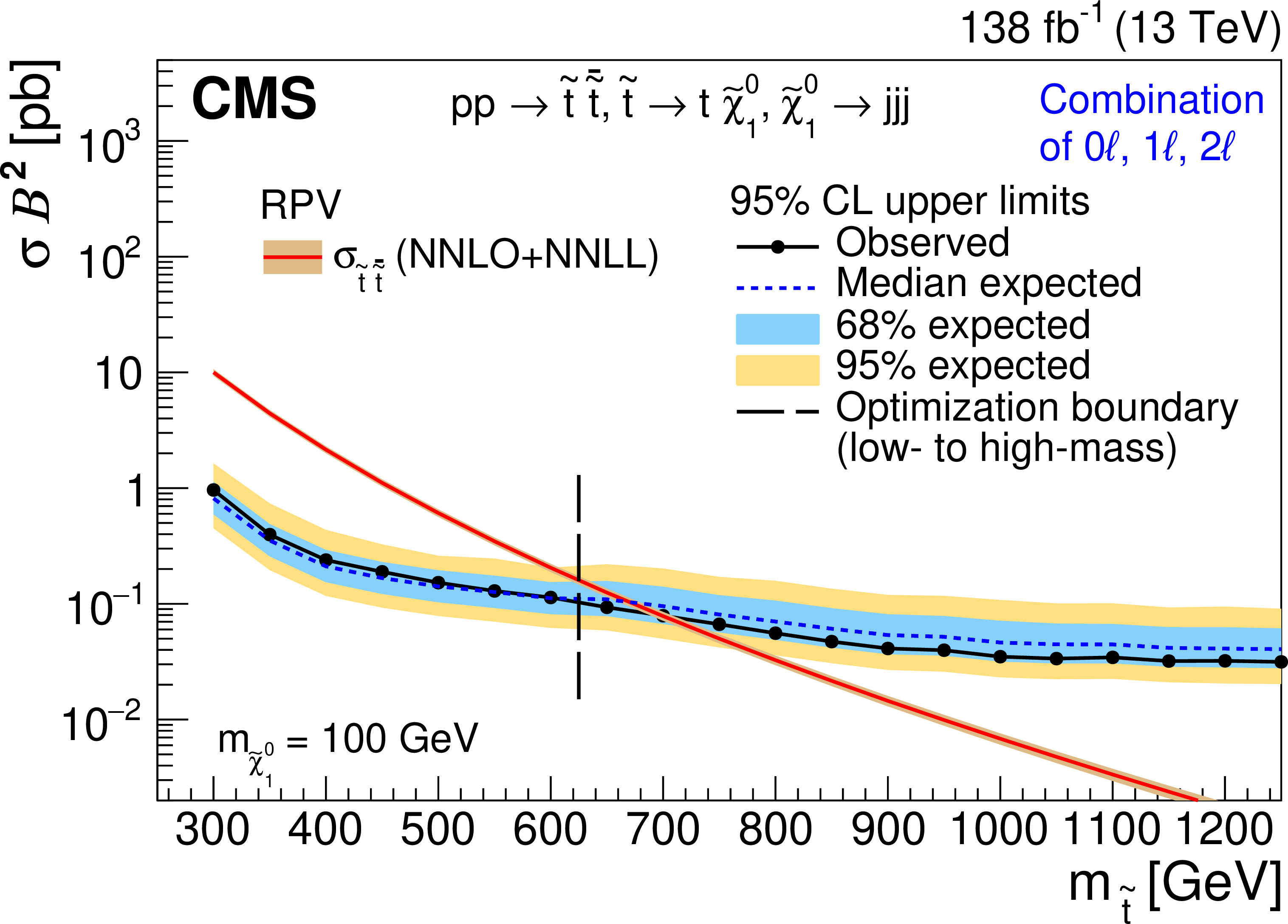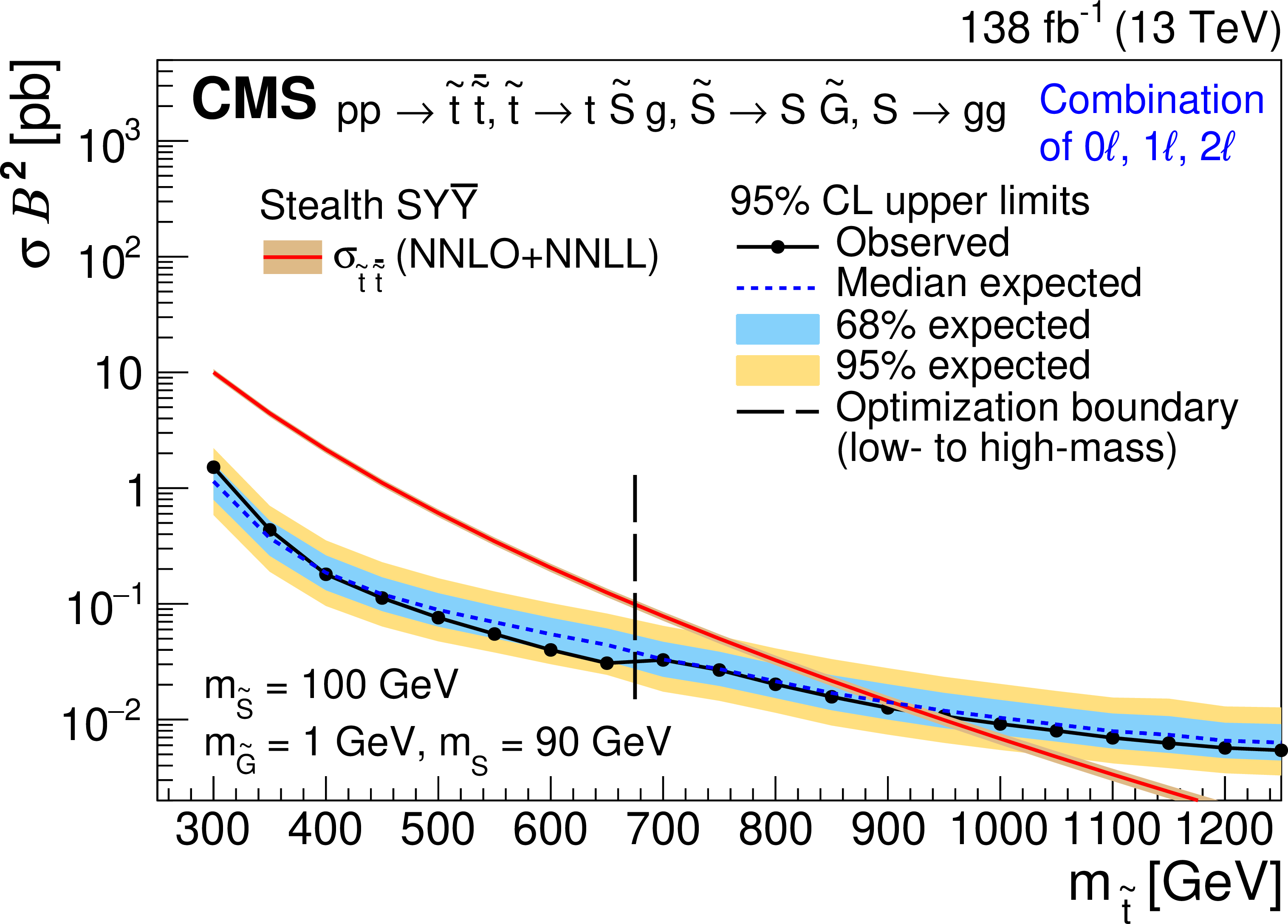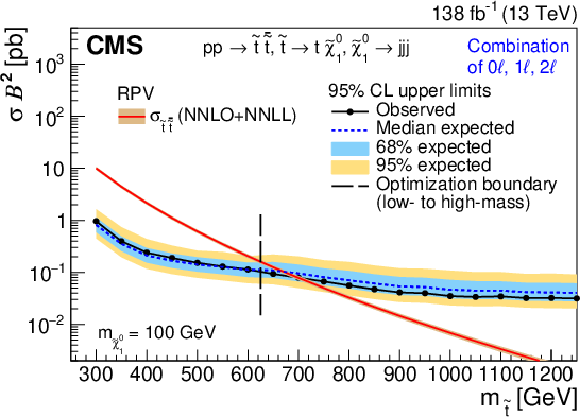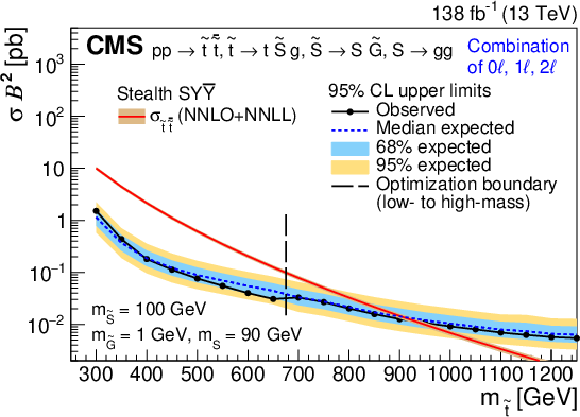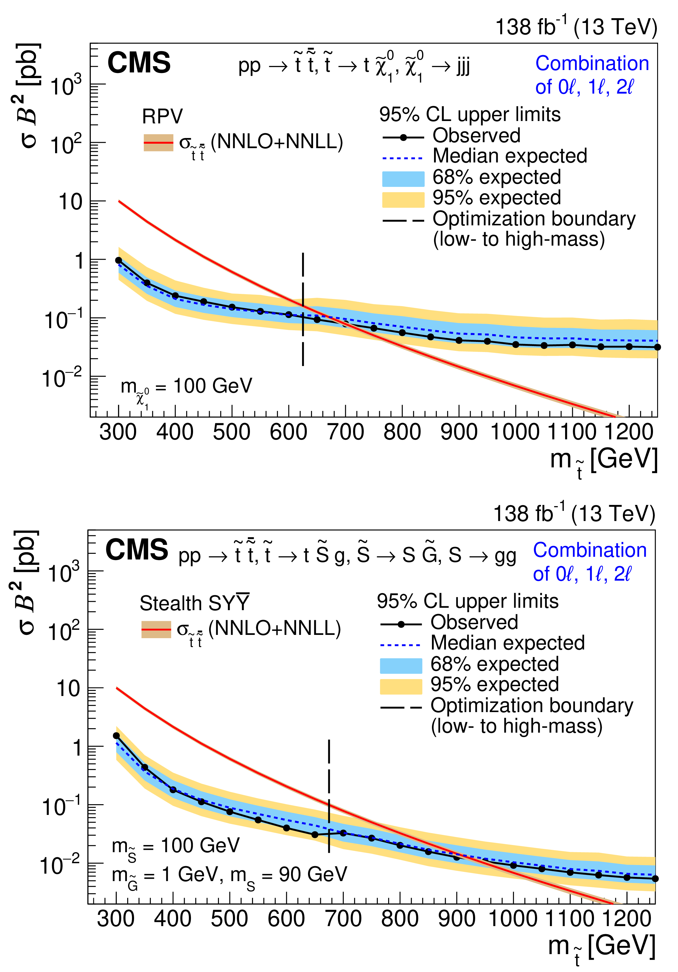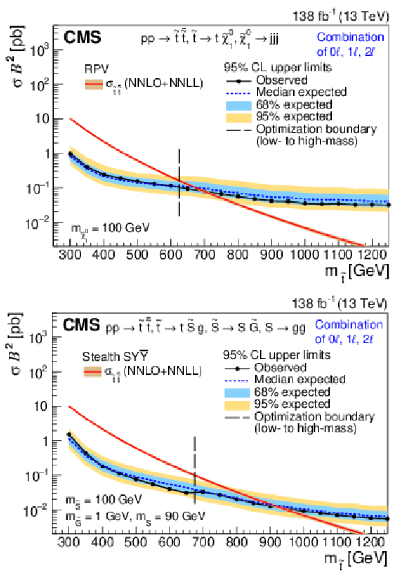 Observed and expected upper limits at 95% CL on $ \sigma_{\tilde{\mathrm{t}}\overline{\tilde{\mathrm{t}}}} $ for the RPV (upper) and stealth $ \mathrm{S}\mathrm{Y} \overline{\mathrm{Y}} $ (lower) SUSY signal models as functions of $ m_{\tilde{\mathrm{t}}} $ for the combination of all three channels, assuming 100% branching fraction to the considered $ \tilde{\mathrm{t}} $ squark decay. The median expected limit is shown in the dashed blue line, with the 68 and 95% intervals shown in light blue and yellow, respectively. The observed limit is shown in black. The vertical dashed line denotes the transition from the low- to high-mass optimization ABCD boundaries. Additionally, the theoretical cross section is shown in red with its uncertainty in light brown. |