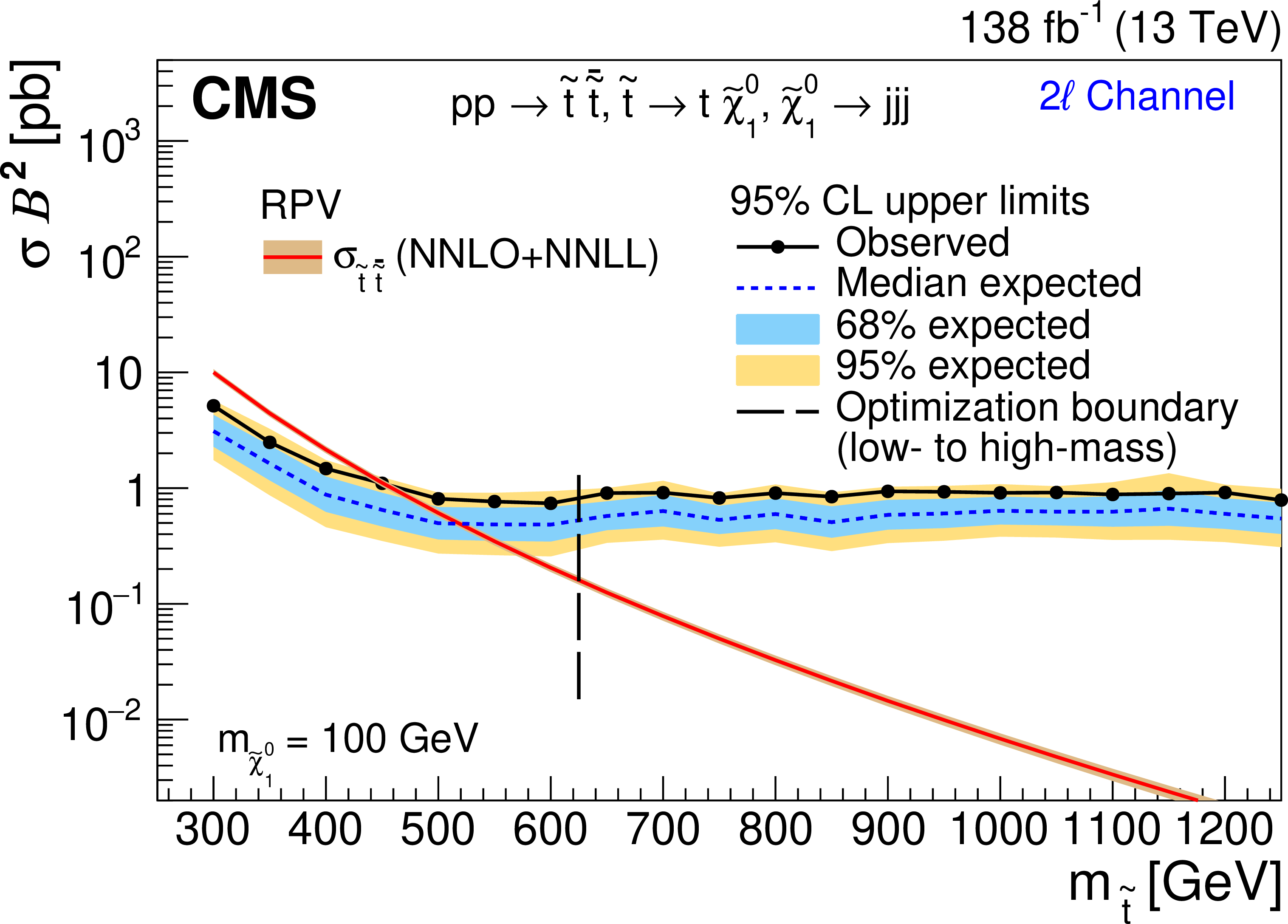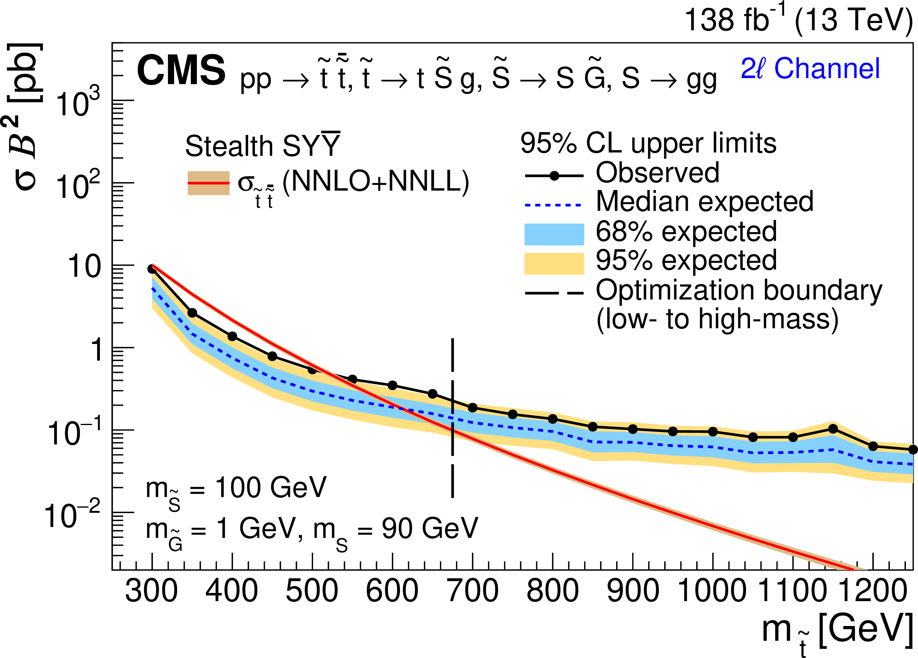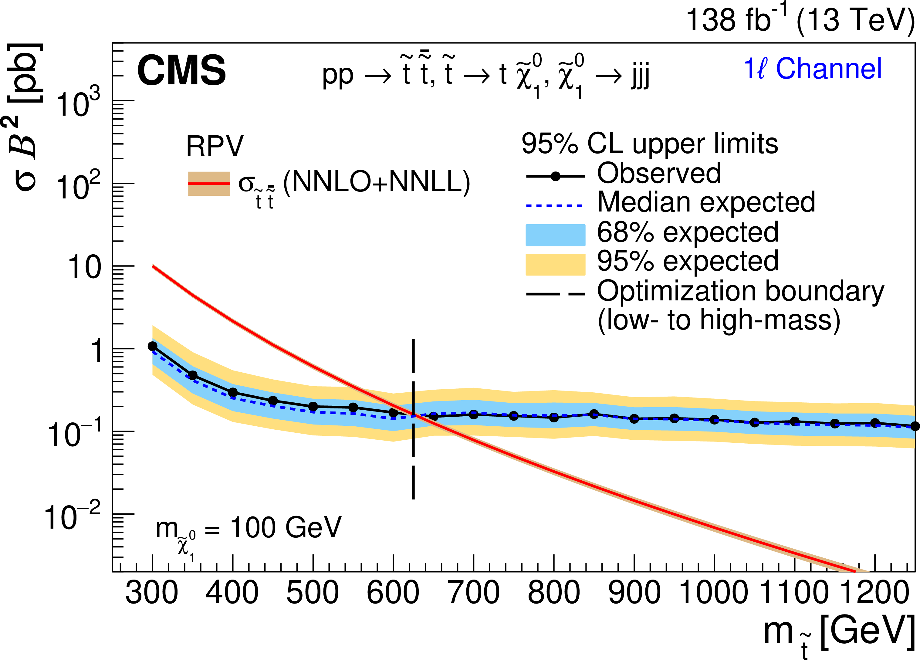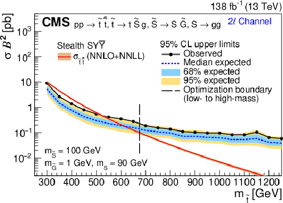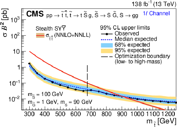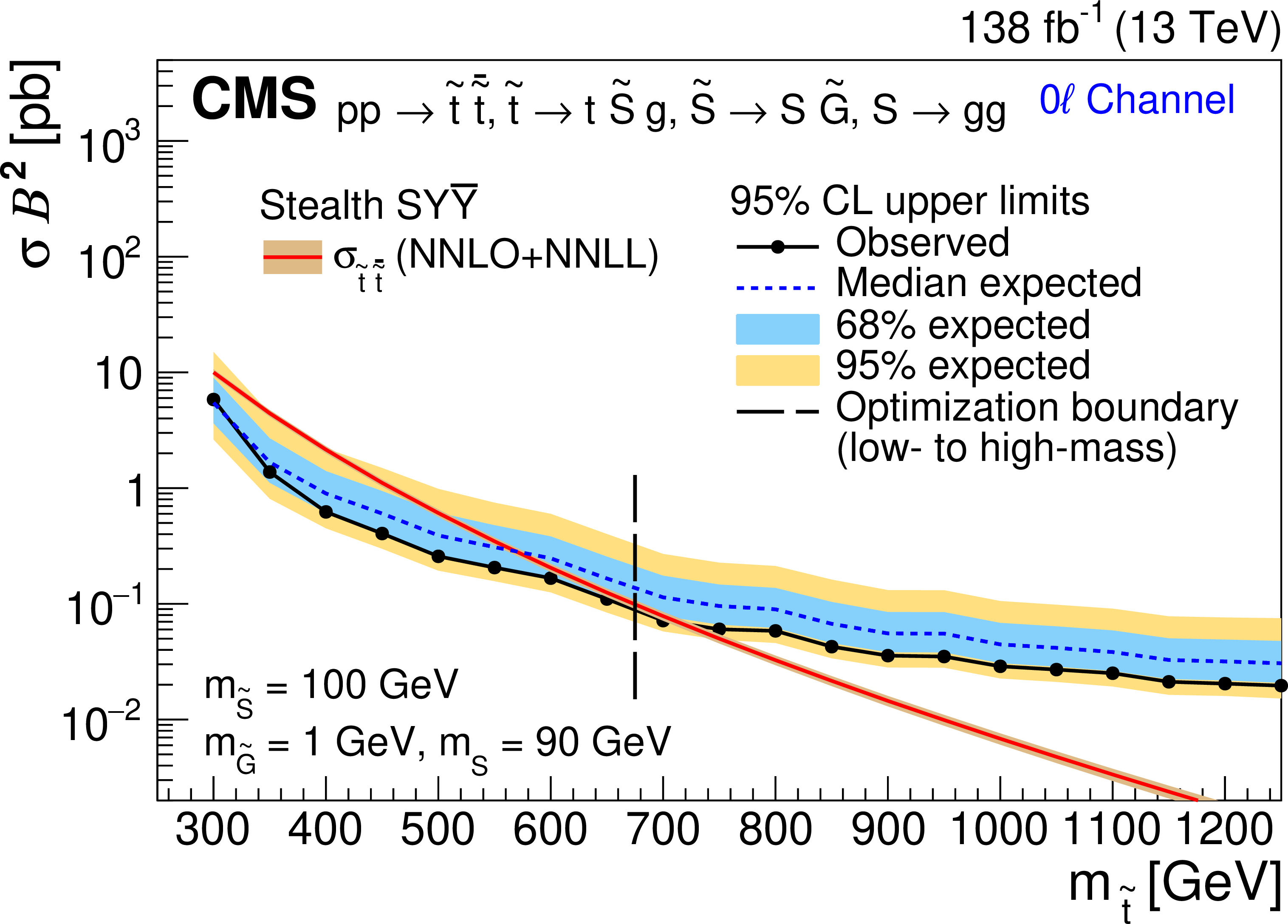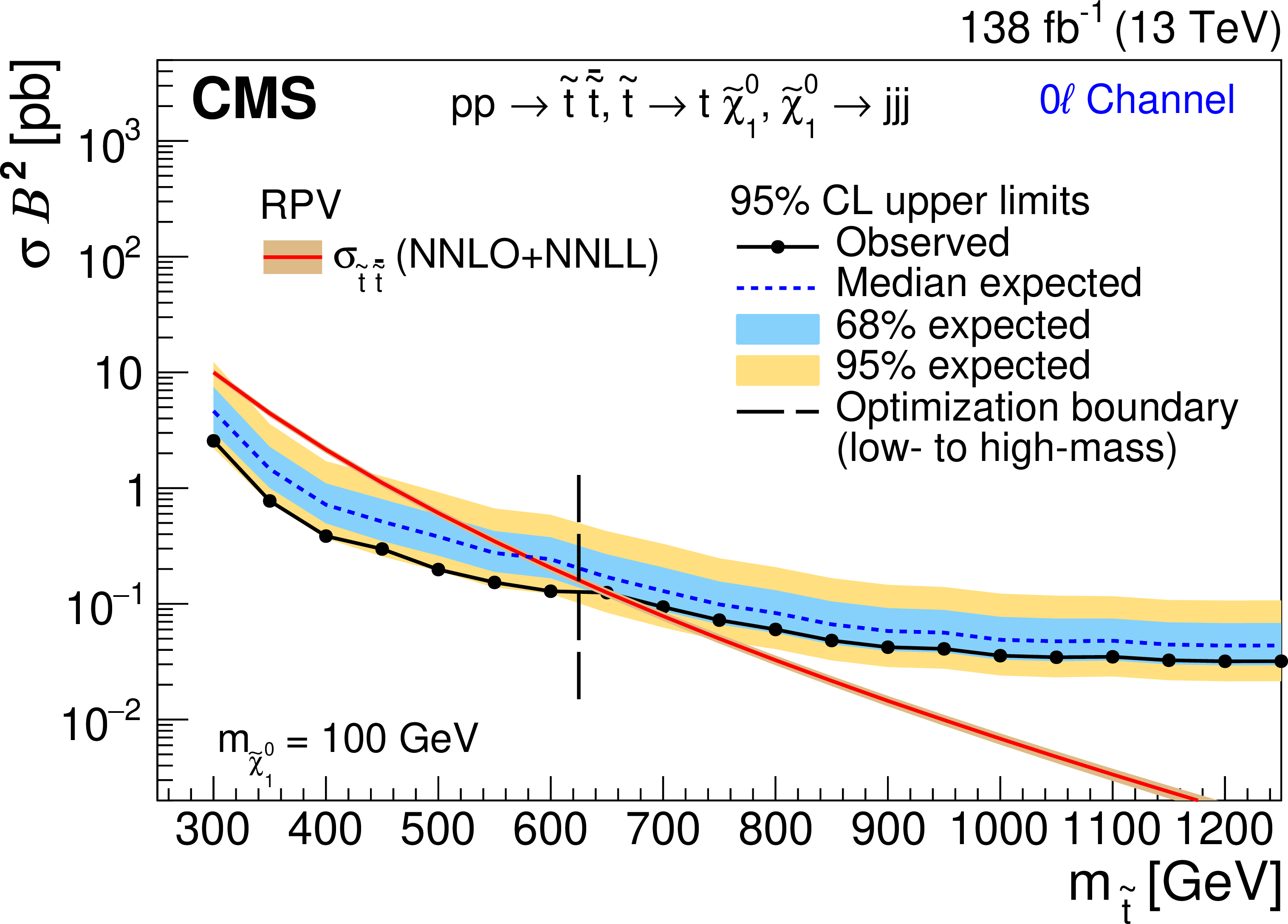Observed and expected upper limits at 95% CL on $ \sigma_{\tilde{\mathrm{t}}\overline{\tilde{\mathrm{t}}}} $ for the RPV (upper) and stealth $ \mathrm{S}\mathrm{Y} \overline{\mathrm{Y}} $ (lower) SUSY signal models as functions of $ m_{\tilde{\mathrm{t}}} $ for the combination of all three channels, assuming 100% branching fraction to the considered $ \tilde{\mathrm{t}} $ squark decay. The median expected limit is shown in the dashed blue line, with the 68 and 95% intervals shown in light blue and yellow, respectively. The observed limit is shown in black. The vertical dashed line denotes the transition from the low- to high-mass optimization ABCD boundaries. Additionally, the theoretical cross section is shown in red with its uncertainty in light brown. |