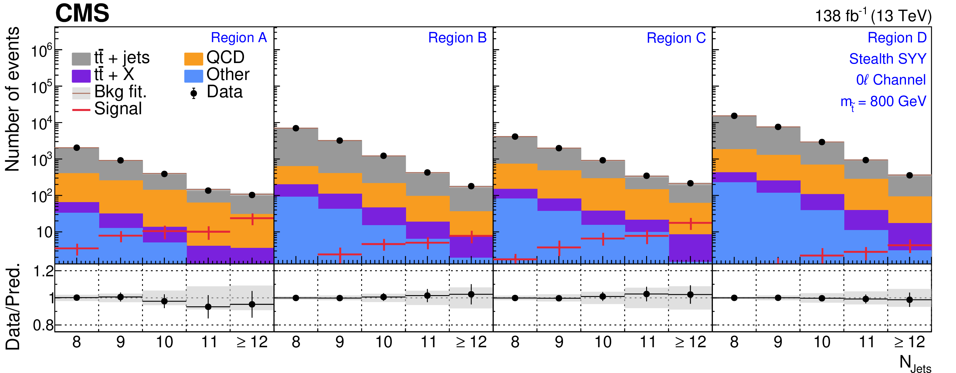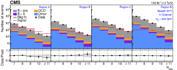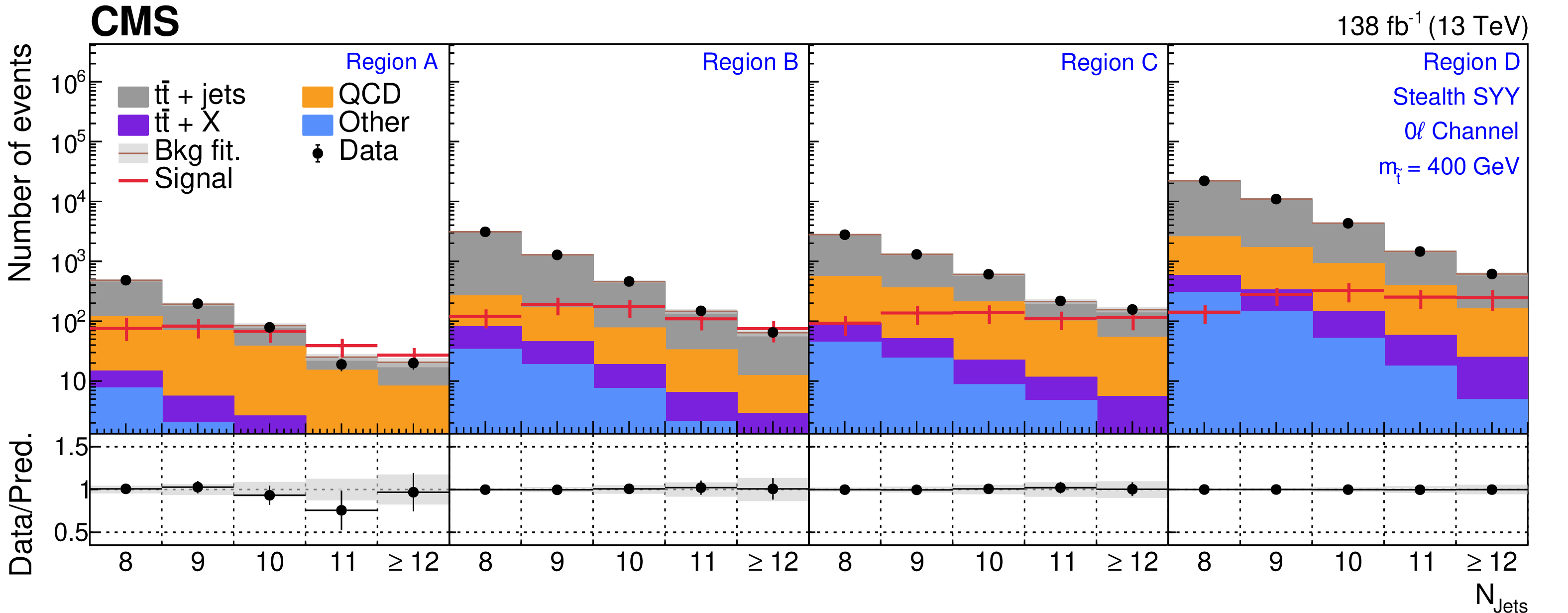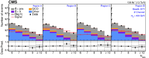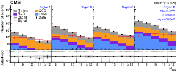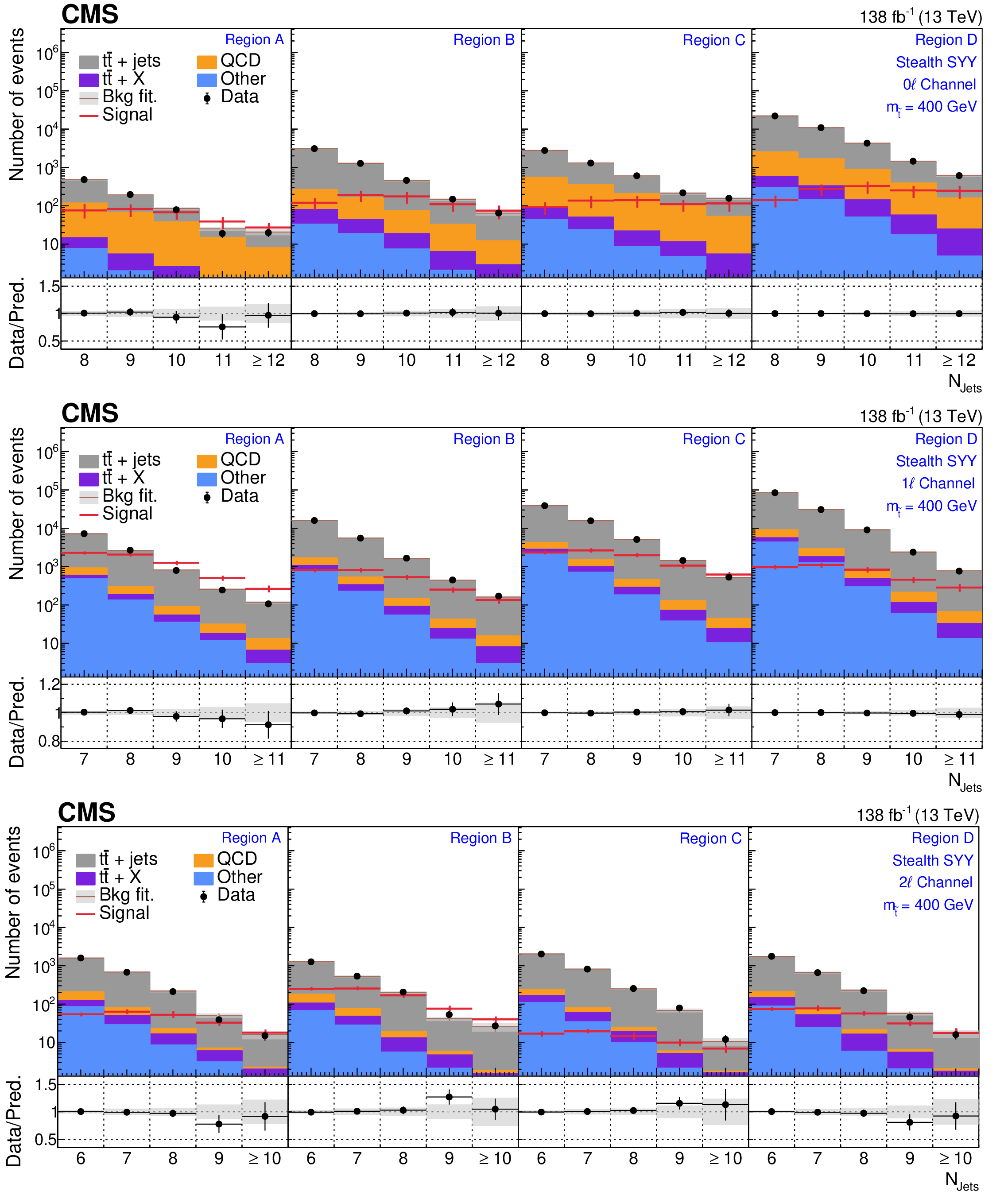 The $ N_\text{jets} $ distributions from the background-only fits to data. Fits are run with the signal strength fixed to zero and all background process event yields are obtained from their fit predictions. The signal distribution overlaid corresponds to the stealth $ \mathrm{S}\mathrm{Y} \overline{\mathrm{Y}} $ model with $ m_{\tilde{\mathrm{t}}} = $ 400 GeV. The graphs in the upper, middle, and lower rows correspond to the 0$ \ell $, 1$ \ell $, and 2$ \ell $ channels, respectively. The four panels in each row show the $ N_\text{jets} $ distributions for the $ A $, $ B $, $ C $, and $ D $ regions (left to right). The gray error band shows the combined statistical and systematic uncertainty from the background-only fit distributions. |