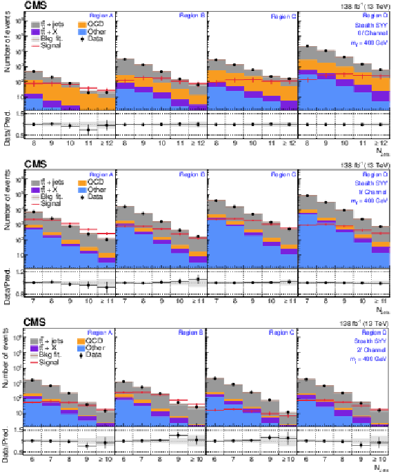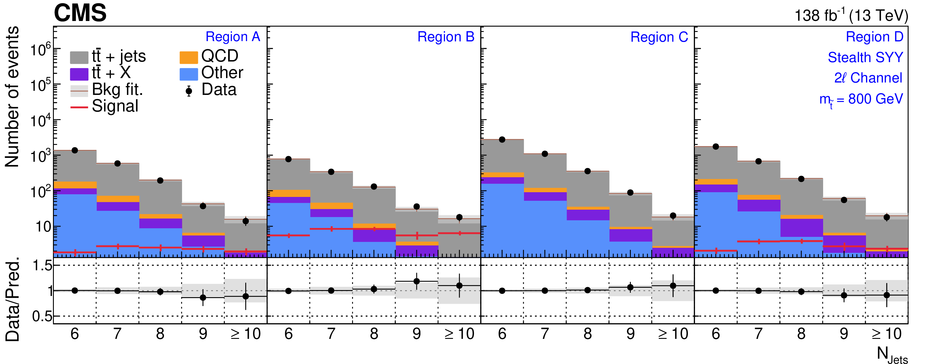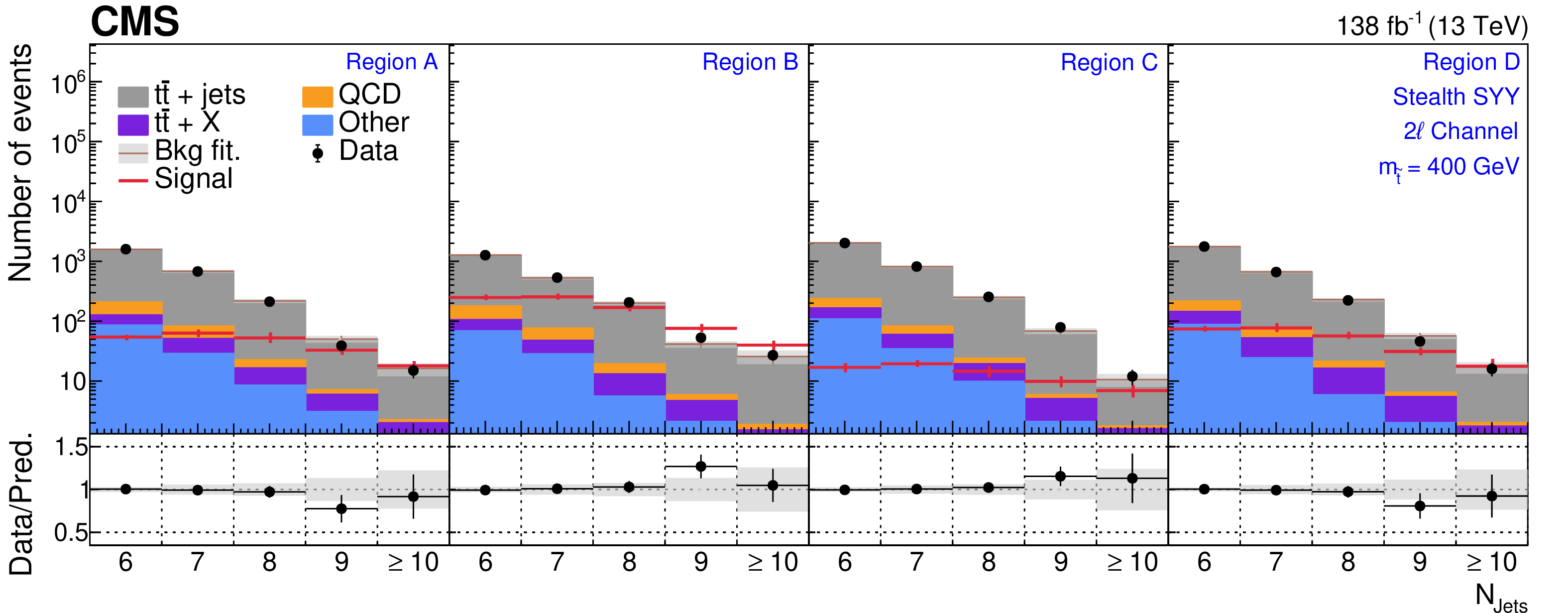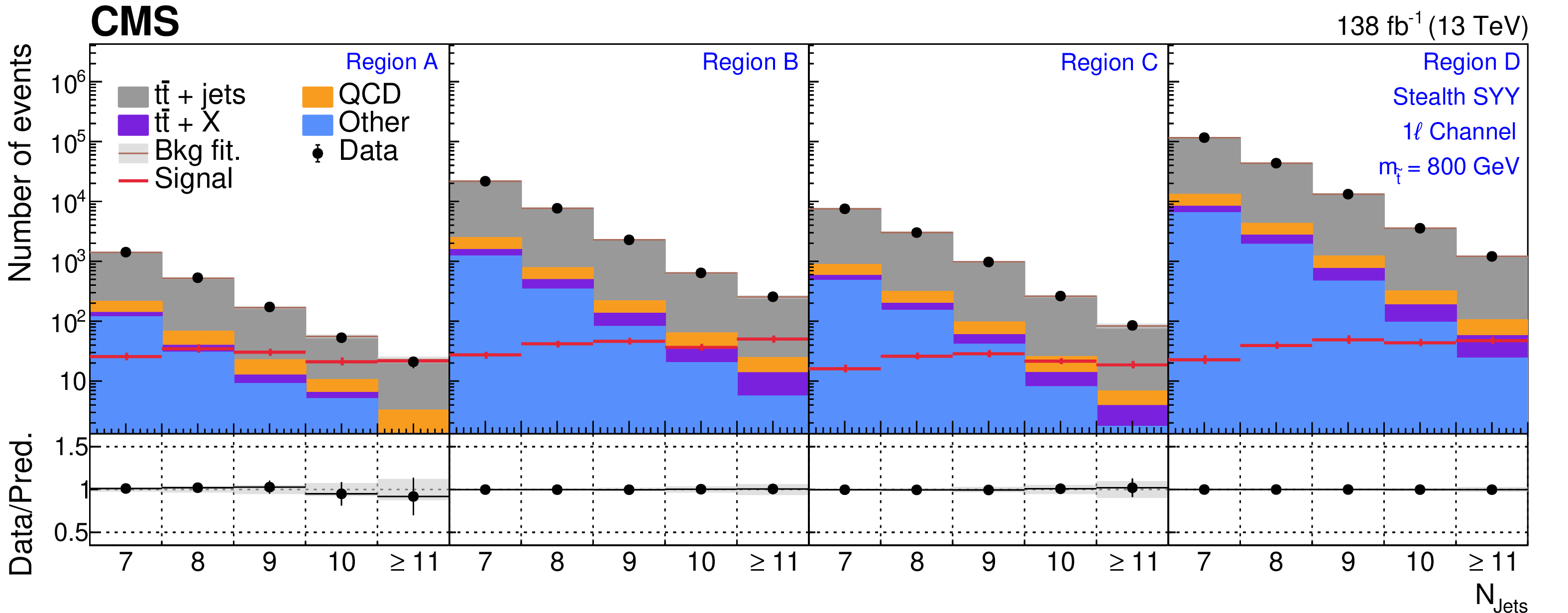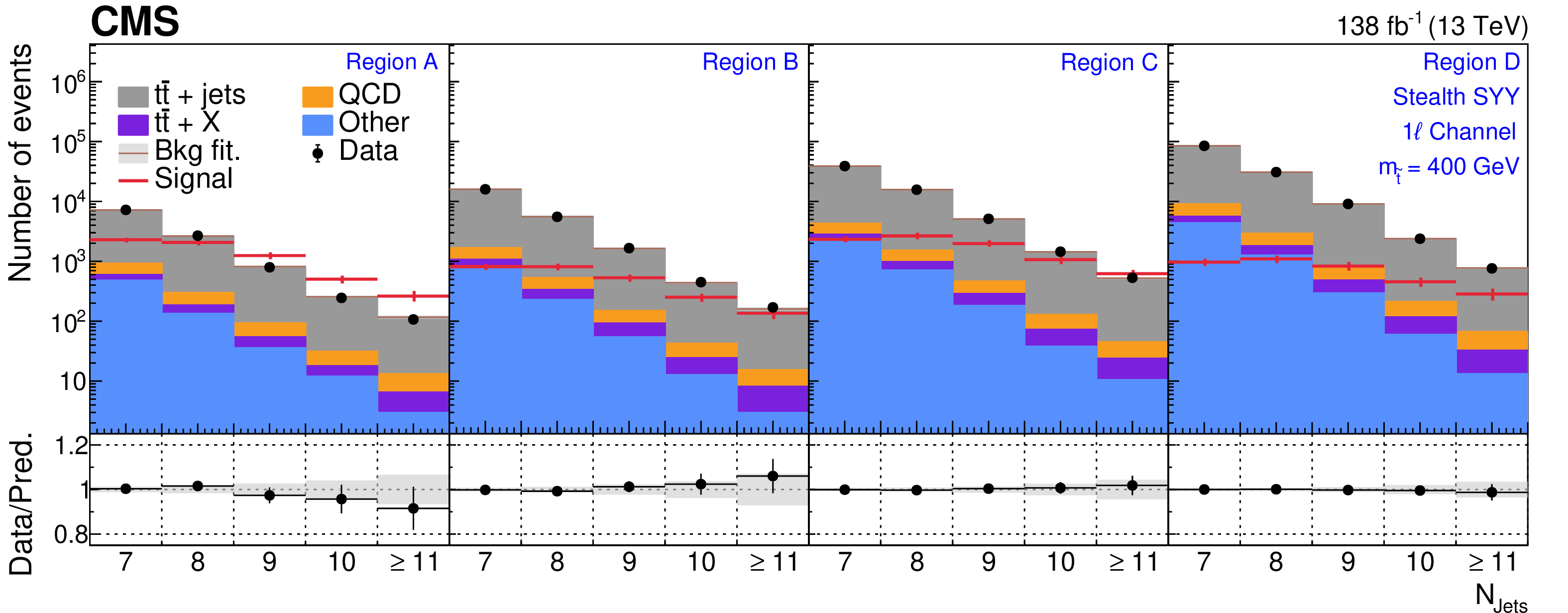 The $ N_\text{jets} $ distributions from the background-only fits to data. Fits are run with the signal strength fixed to zero and all background process event yields are obtained from their fit predictions. The signal distribution overlaid corresponds to the stealth $ \mathrm{S}\mathrm{Y} \overline{\mathrm{Y}} $ model with $ m_{\tilde{\mathrm{t}}} = $ 400 GeV. The graphs in the upper, middle, and lower rows correspond to the 0$ \ell $, 1$ \ell $, and 2$ \ell $ channels, respectively. The four panels in each row show the $ N_\text{jets} $ distributions for the $ A $, $ B $, $ C $, and $ D $ regions (left to right). The gray error band shows the combined statistical and systematic uncertainty from the background-only fit distributions. |