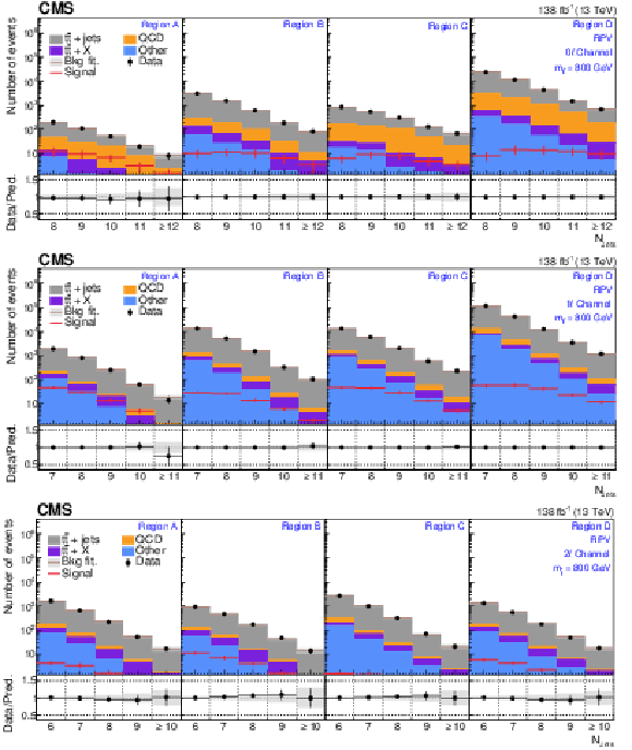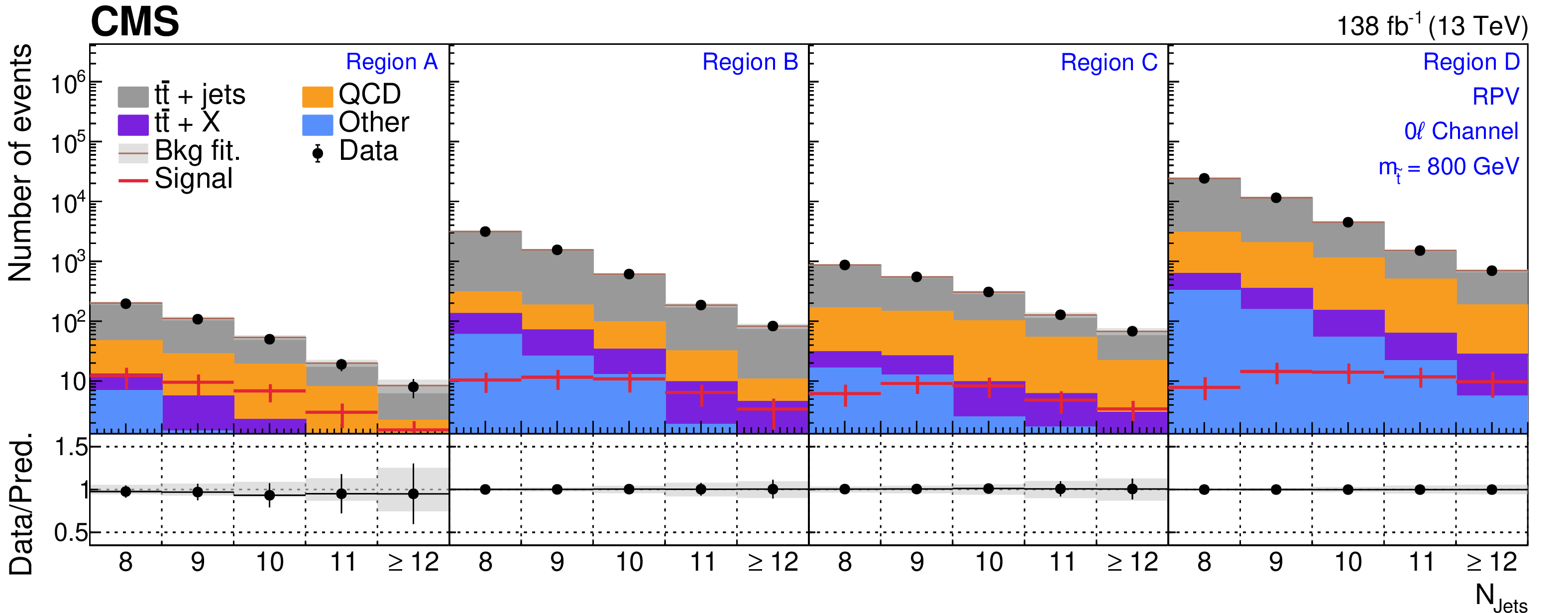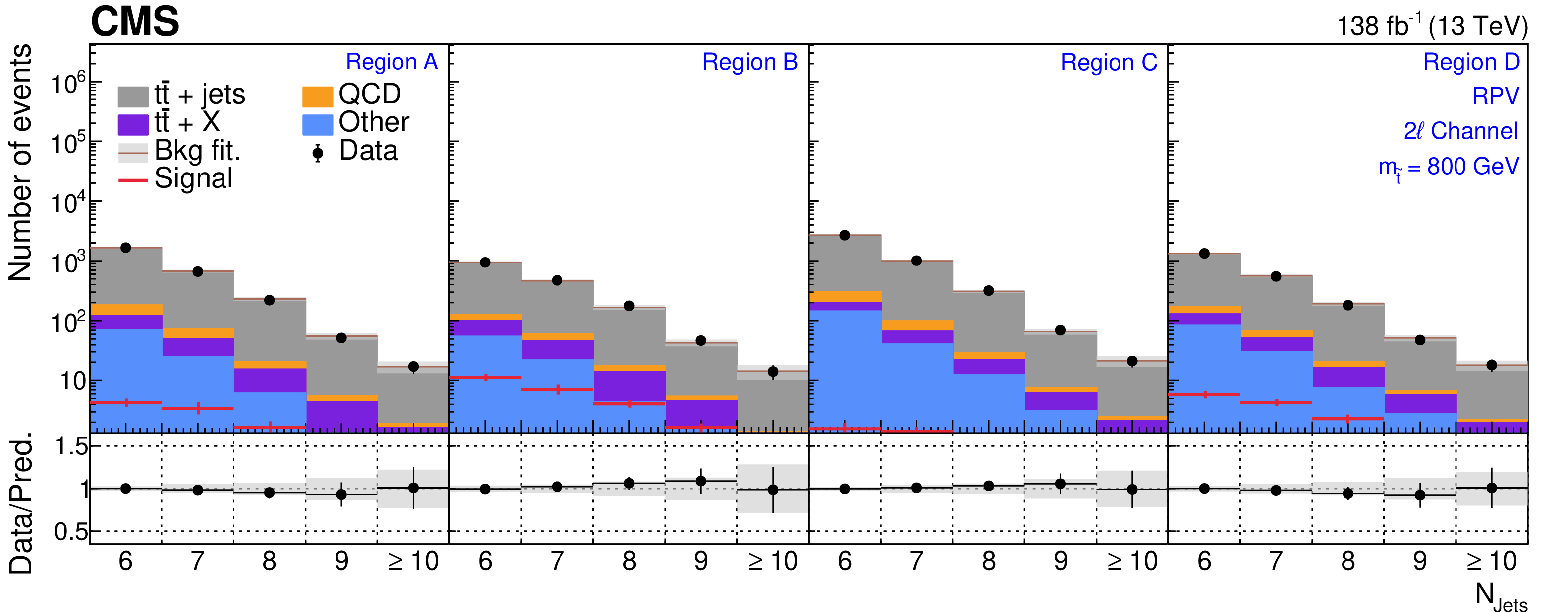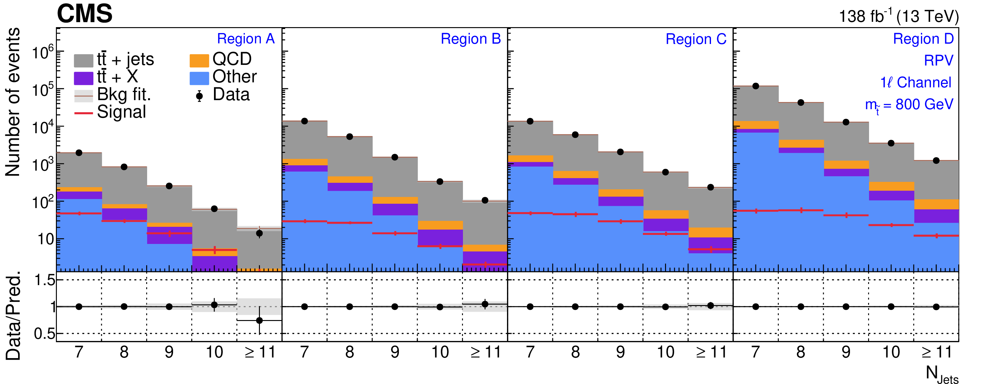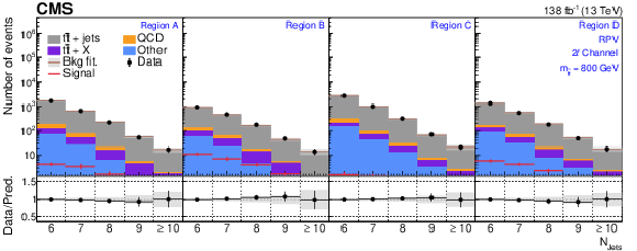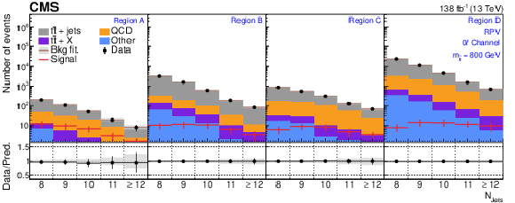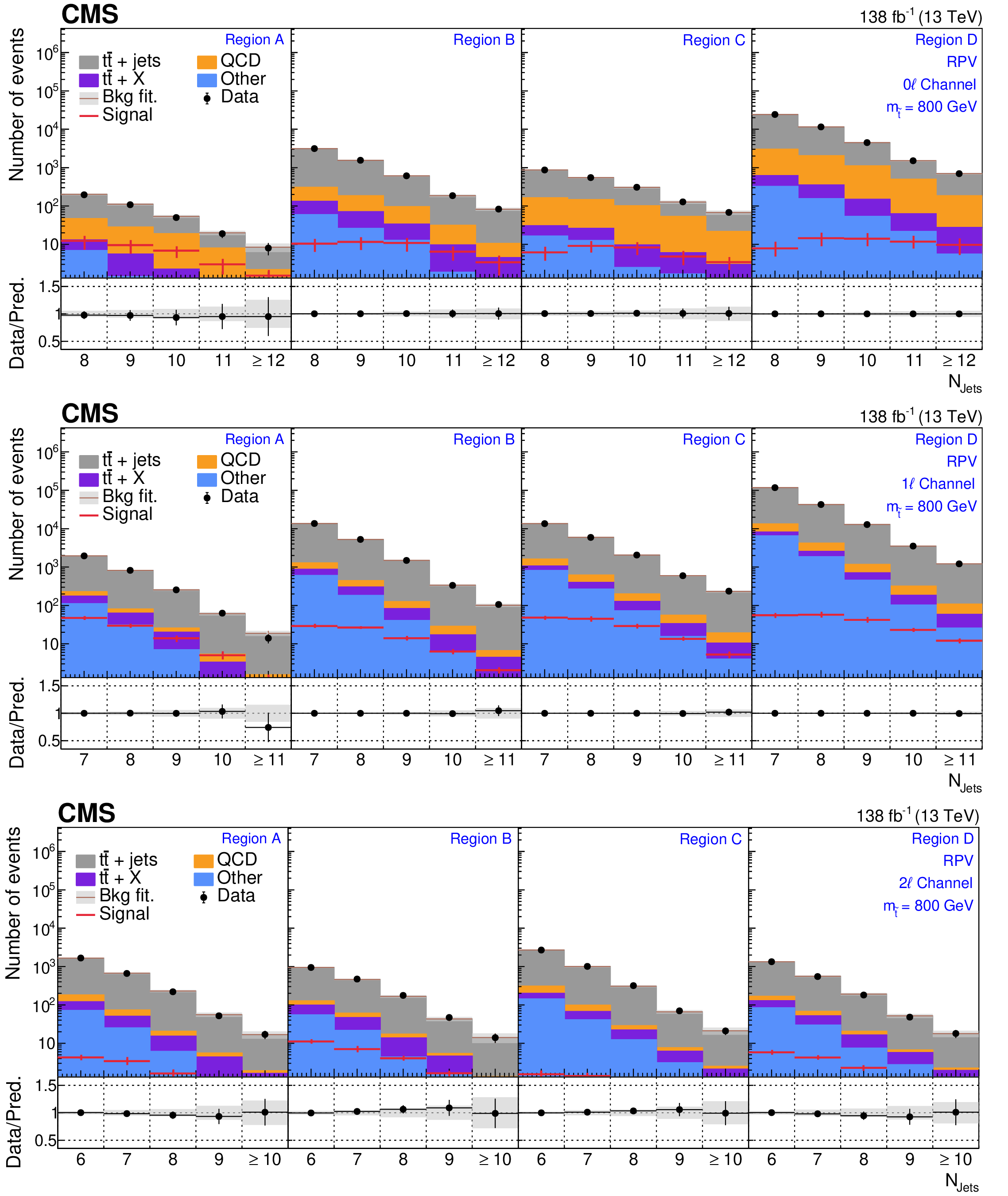 The $ N_\text{jets} $ distributions from the background-only fits to data. Fits are run with the signal strength fixed to zero and all background process event yields are obtained from their fit predictions. The signal distribution overlaid corresponds to the RPV model with $ m_{\tilde{\mathrm{t}}} = $ 800 GeV. The graphs in the upper, middle, and lower rows correspond to the 0$ \ell $, 1$ \ell $, and 2$ \ell $ channels, respectively. The four panels in each row show the $ N_\text{jets} $ distributions for the $ A $, $ B $, $ C $, and $ D $ regions (left to right). The gray error band shows the combined statistical and systematic uncertainty from the background-only fit distributions. |