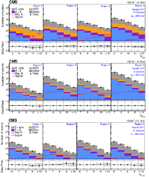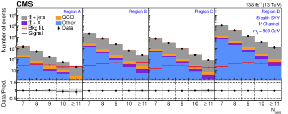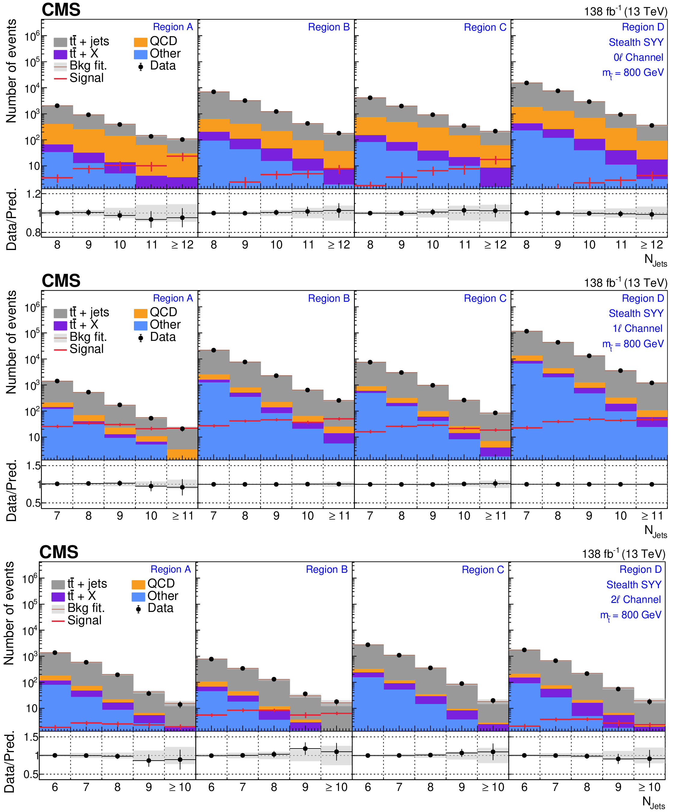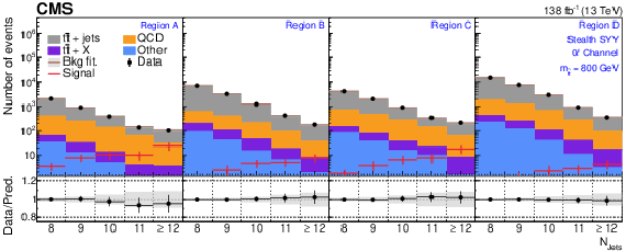 The $ N_\text{jets} $ distributions from the background-only fits to data. Fits are run with the signal strength fixed to zero and all background process event yields are obtained from their fit predictions. The signal distribution overlaid corresponds to the stealth $ \mathrm{S}\mathrm{Y} \overline{\mathrm{Y}} $ model with $ m_{\tilde{\mathrm{t}}} = $ 800 GeV. The graphs in the upper, middle, and lower rows correspond to the 0$ \ell $, 1$ \ell $, and 2$ \ell $ channels, respectively. The four panels in each row show the $ N_\text{jets} $ distributions for the $ A $, $ B $, $ C $, and $ D $ regions (left to right). The gray error band shows the combined statistical and systematic uncertainty from the background-only fit distributions. |