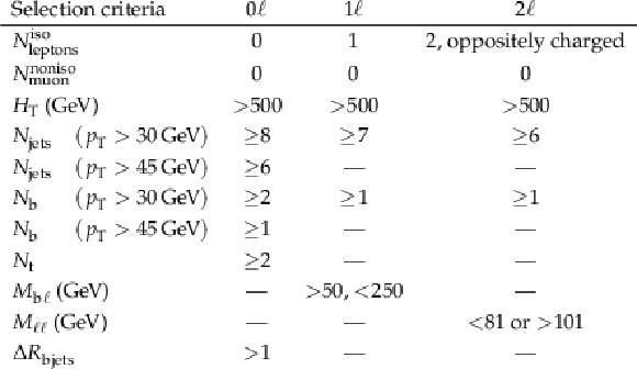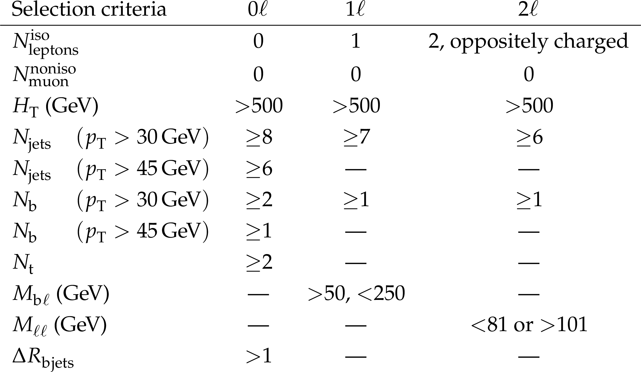 Search region selections for the 0$ \ell $, 1$ \ell $, and 2$ \ell $ channels. The term $ N_{\text{muon}}^{\text{noniso}} $ denotes the number of nonisolated muons. |