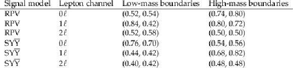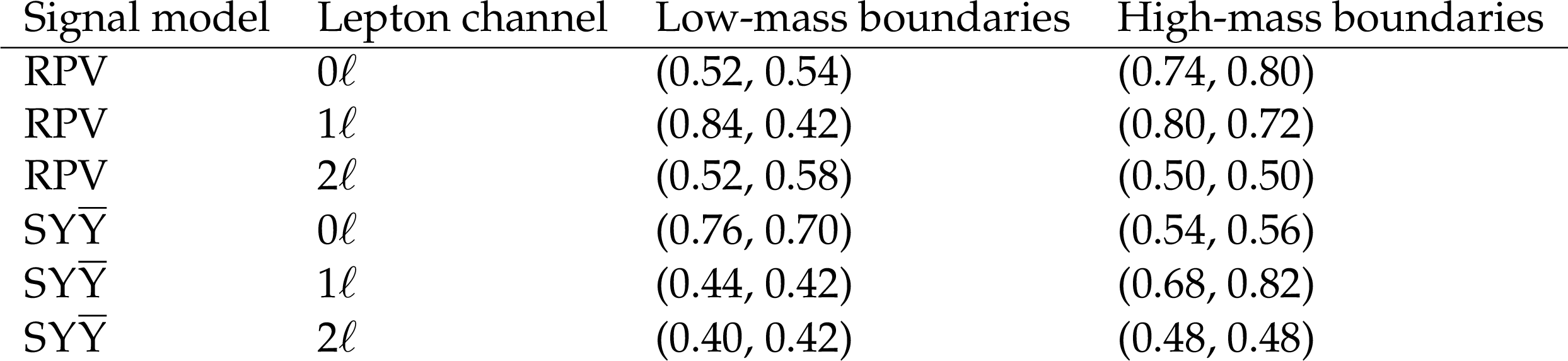 Values of $ (S_{\mathrm{NN,1}},S_{\mathrm{NN,2}}) $ defining the ABCD bin boundaries for the low- and high-mass optimizations for each lepton channel and signal model. |