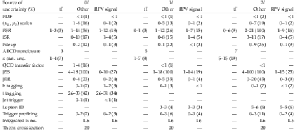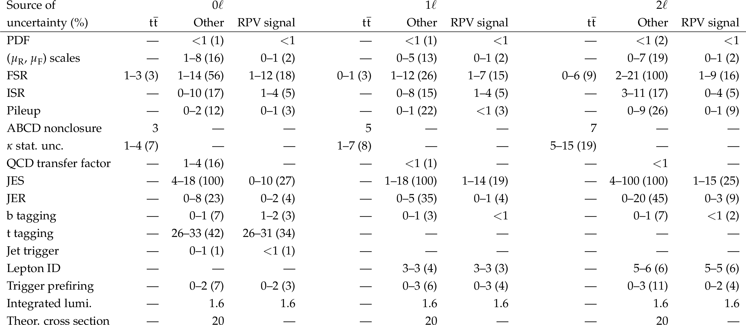 Magnitude of systematic uncertainties for the 0$ \ell $, 1$ \ell $, and 2$ \ell $ channels based on the RPV-trained NN and ABCD bin boundaries optimized for low $ m_{\tilde{\mathrm{t}}} $. Reported values are in units of % and ranges correspond to the 16th and 84th percentile for the value of a systematic uncertainty across all applicable analysis regions (ABCD regions and $ N_\text{jets} $ categories). The maximum value for a given systematic uncertainty across these regions is shown in parentheses. Other backgrounds include the $ \text{QCD multijet} $ and minor background processes. The RPV signal model used assumes $ m_{\tilde{\mathrm{t}}} = $ 550 GeV. The systematic uncertainties based on the RPV-trained model are representative of the values obtained for the stealth $ \mathrm{S}\mathrm{Y} \overline{\mathrm{Y}} $-trained model. |