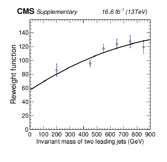 Ratio of $ M_{12} $ distributions in SR and CR of the 2017 analysis in the SL category, for data (filled circles), fitted with a sum of Chebyshev polynomials up to the second degree (solid line). The ratio is shown in the $ M_{12} $ ranges of 120-300 GeV (upper left), 180-460 GeV (upper right), and 240-800 GeV (lower). The p value resulting from each fit is also quoted. The result of a similar fit based on QCD multijet simulation is superimposed (dashed line) with $ \pm 1\sigma $ and $ \pm 2\sigma $ bands of statistical uncertainty extracted from the fit. |