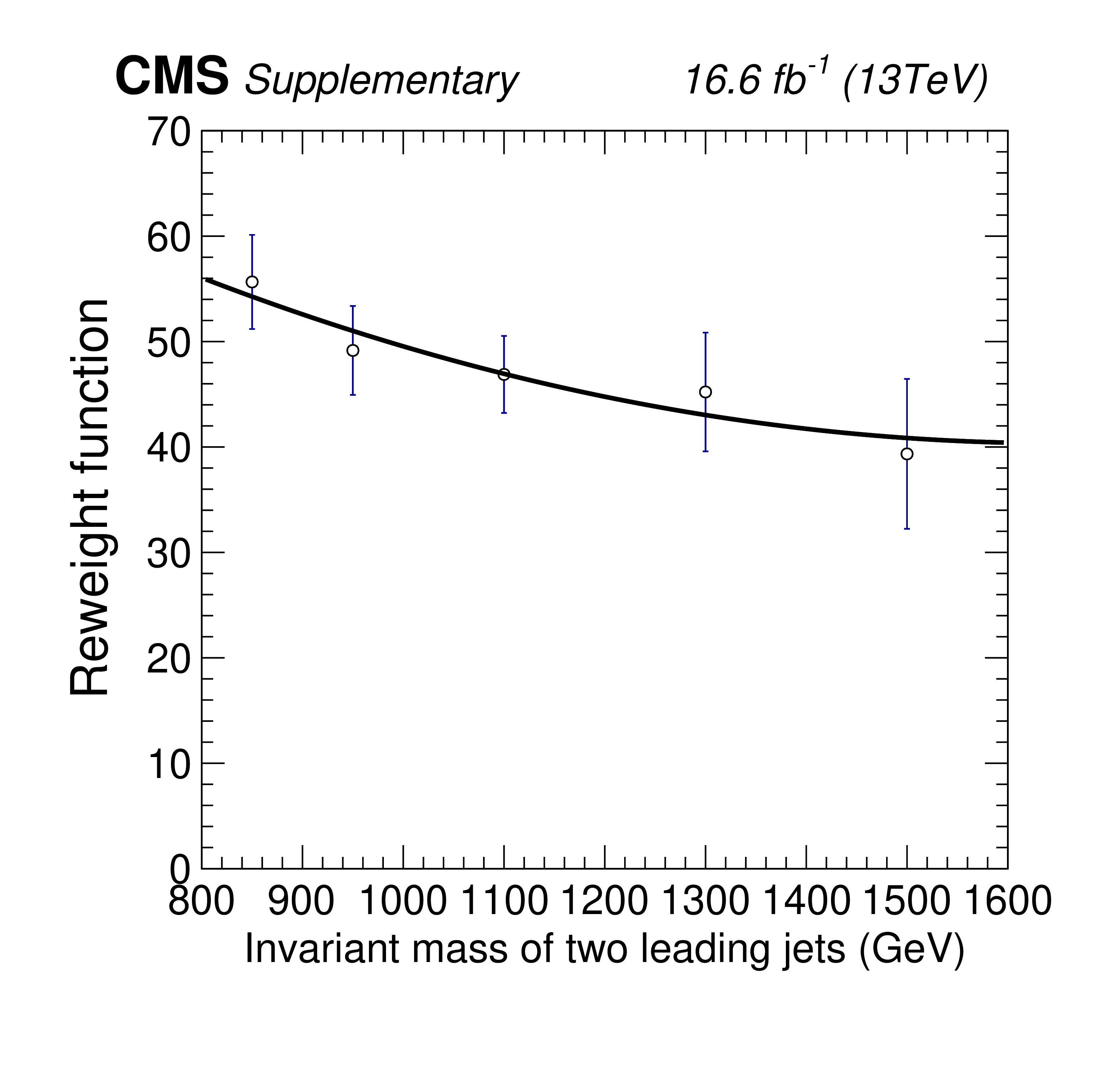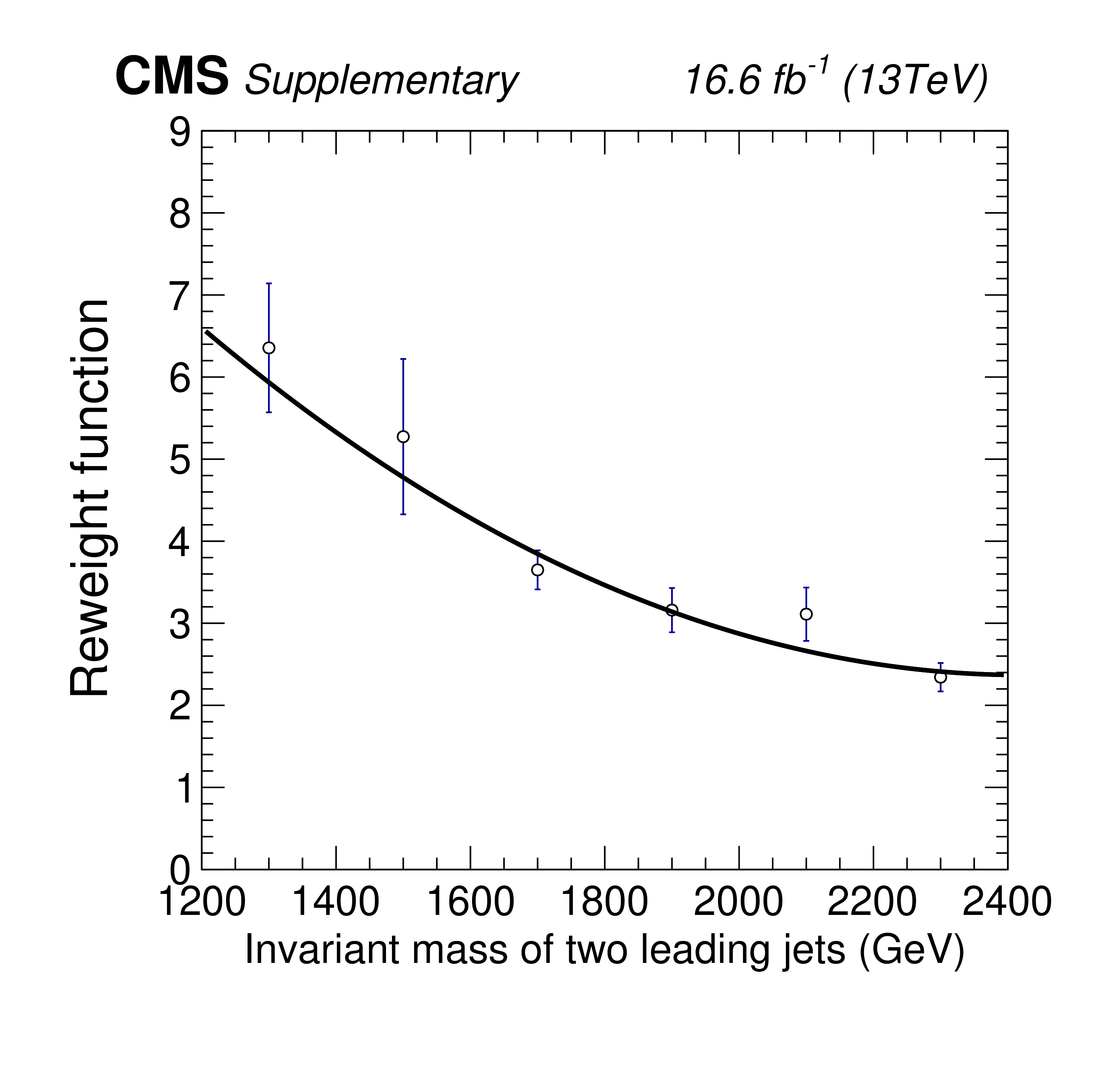 Invariant mass distributions of the four fit ranges in the b tag veto CR for the 2017 FH channel, overlaid with the fitted functions. The distributions are fitted in the $ M_{12} $ ranges of 240-560 GeV (upper left), 280-800 GeV (upper right), 400-1300 GeV (lower left), and 600-2000 GeV (lower right). The $ \chi^2 $ goodness-of-fit test and corresponding p-value are indicated in each plot. The lower panels show the difference between the data and the fitted function, divided by the estimated statistical uncertainty for each bin. Good agreement between the fitted functions and the data is achieved. |